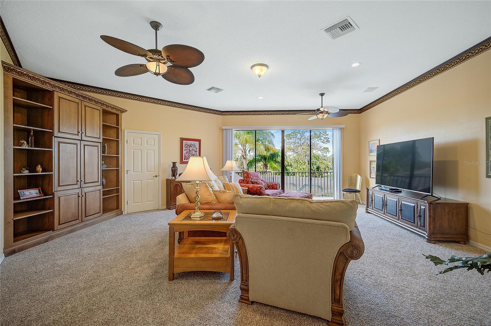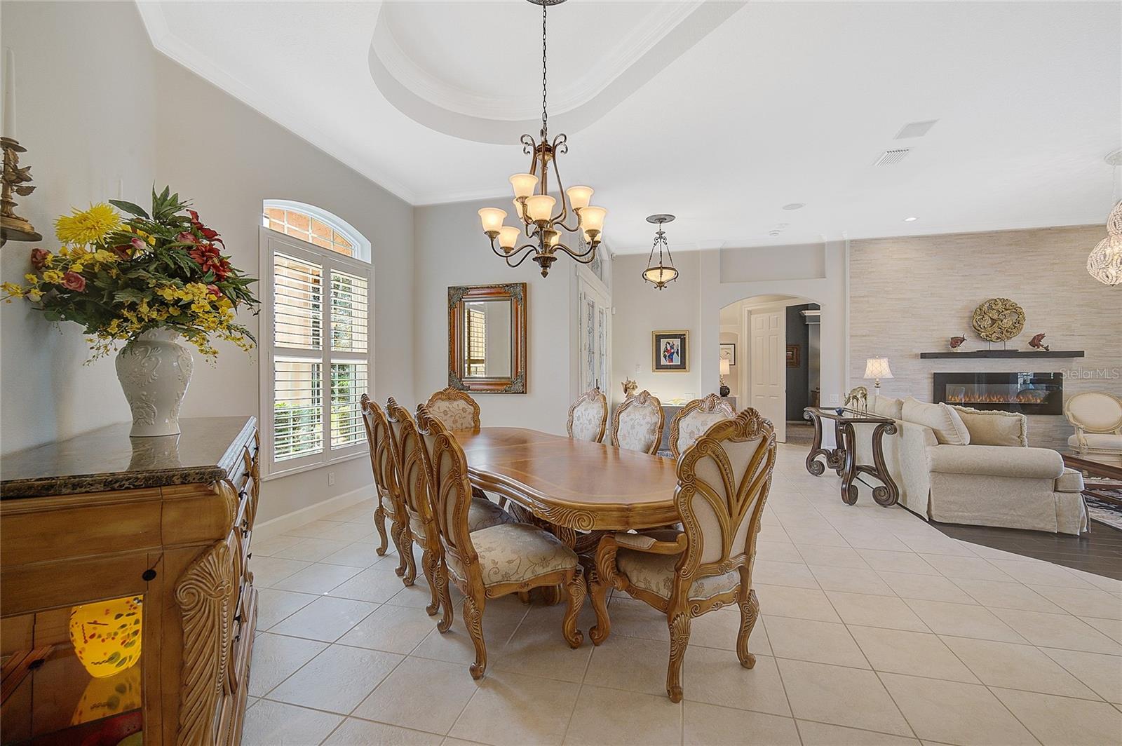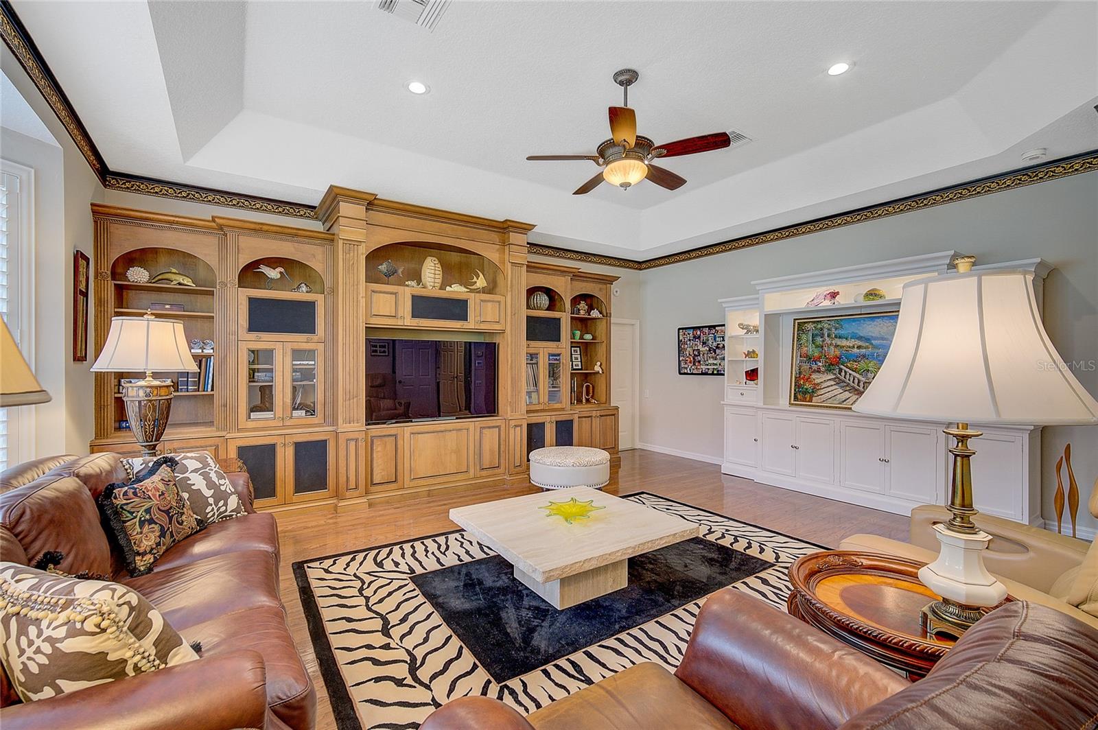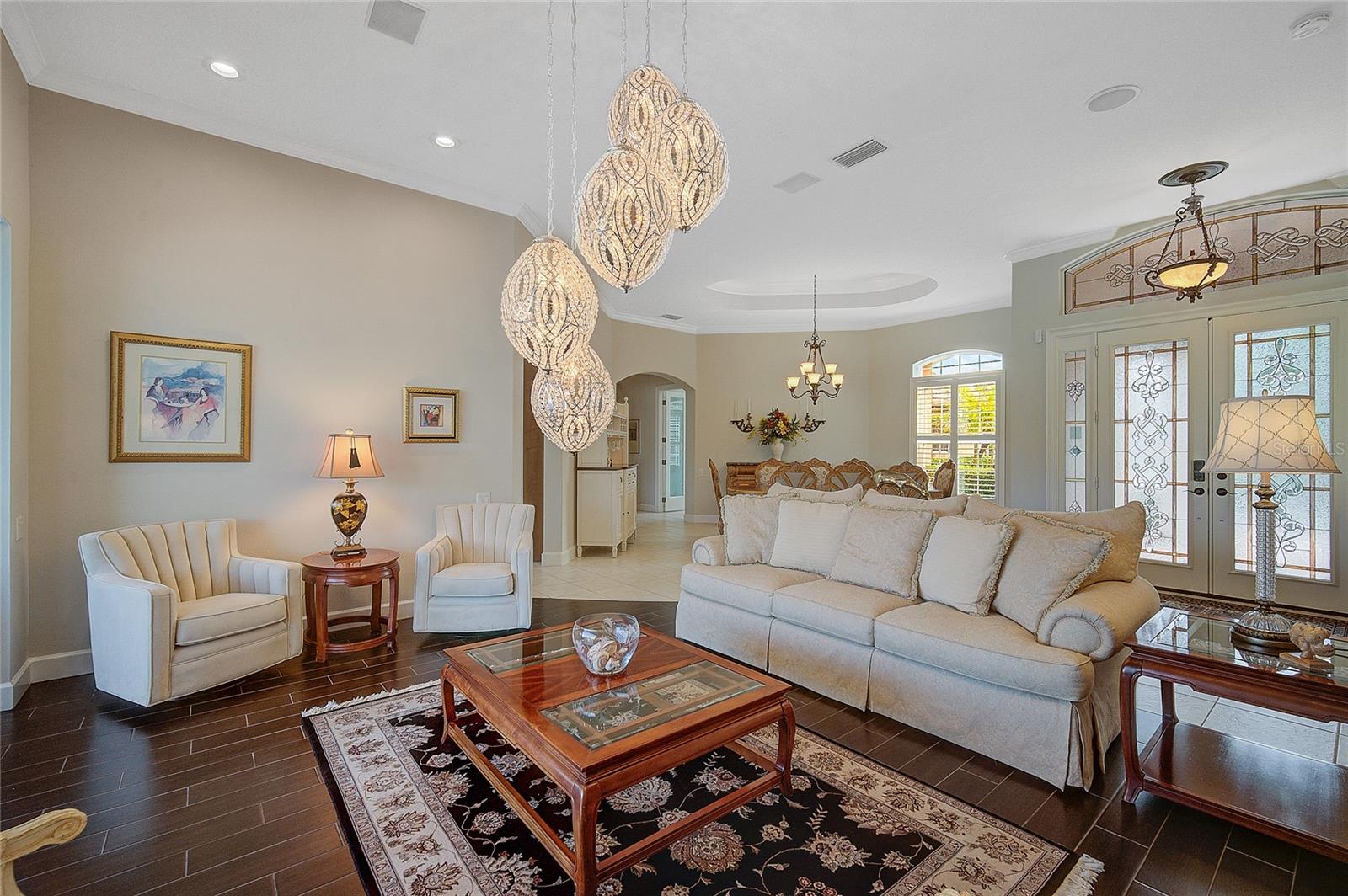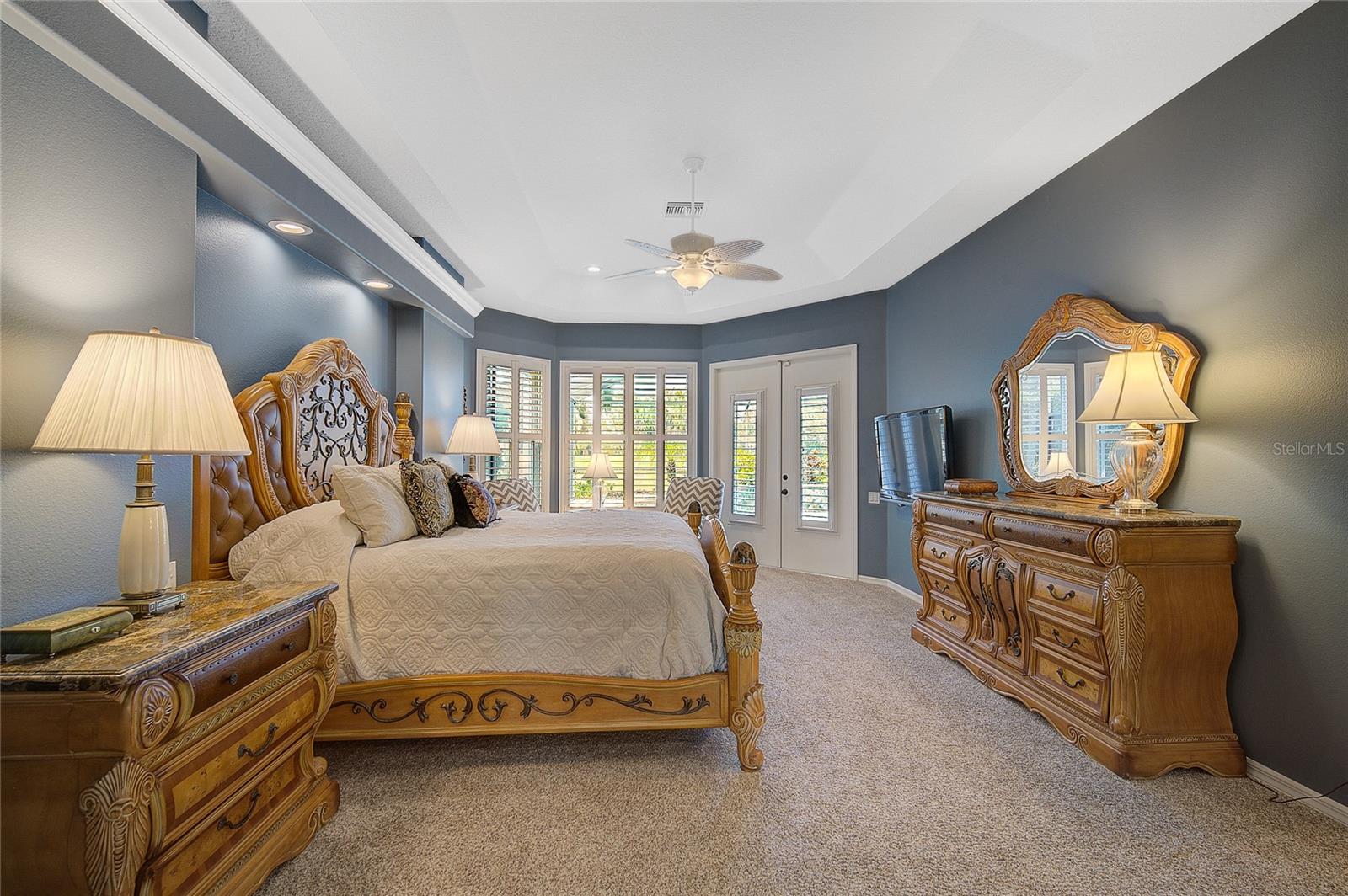 Luxury, comfort and views converge! This captivating LAKEFRONT VIEW home with 3-CAR GARAGE has an expansive floor plan of 4,255 sq ft overlooking the highly desirable golf community of Calusa Lakes. The two-story residence opens to a grand foyer, living room with dazzling stone designed fireplace and open formal dining area. This property offers exquisite finishes throughout including crown molding, built-in wall units, recessed lighting, wood cabinetry and plantation shutters. The gourmet kitchen is a chef’s delight hosting a gas cooktop, built-in ovens, granite counter tops coupled with an oversized island with microwave and beverage cooler. The grand kitchen with aquarium window overflows into the spacious trey ceiling family room where natural sunlight cascades throughout the rooms. There are 4 total bedrooms, 3 are ensuite, one which is located on the second floor or could be ideal for family entertainment, a media room or potential in-law set up. The second floor presents a private balcony with a picturesque view of the meticulous grounds, tranquil pond and the 16th green. The main level hosts a private office ideal for working at home, a comfortable media room which could also be an additional office or perfect workout space. There is a gracious primary suite with 2 walk-in closets and the en-suite is designed with elegance in mind with jetted tub, dual sinks, marble finishes and walk in shower. Step out directly from the primary suite onto the impressive lanai and you will think you entered a 5-star resort. You will appreciate floating in the newly resurfaced 2021 heated pool or relaxing in the spa with your favorite cold beverage. The sound of cascading water as you host friends and relatives on the expansive brick paved lanai with built-in kitchen and granite bar sitting area, will have people never wanting to leave. The freshly painted interior is extremely tasteful with neutral palettes and the 4 air conditioners allow for controlled cooling throughout the home. No CDD fee , low $300 a quarter HOA fee and NO mandatory golf membership makes this the ideal community. Close proximity to world renowned beaches, unique boutique shops, numerous restaurants and cultural activities. The back private residence only gate allows quick access to I-75, international airports both north and south as well as the new Sarasota Memorial Hospital. Welcome to your palatial paradise! BE SURE TO VIEW THE 3-D & AERIAL TOURS.