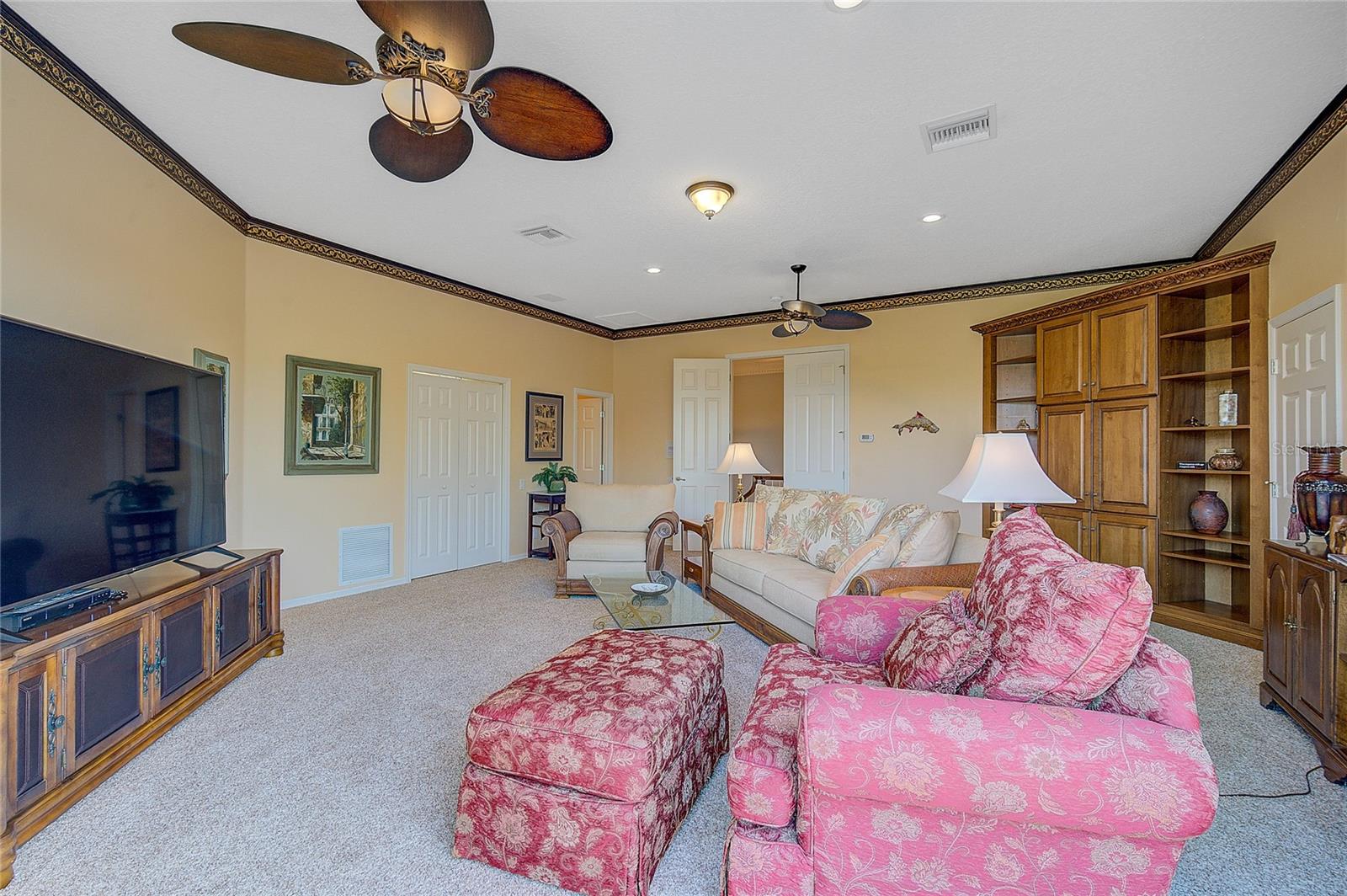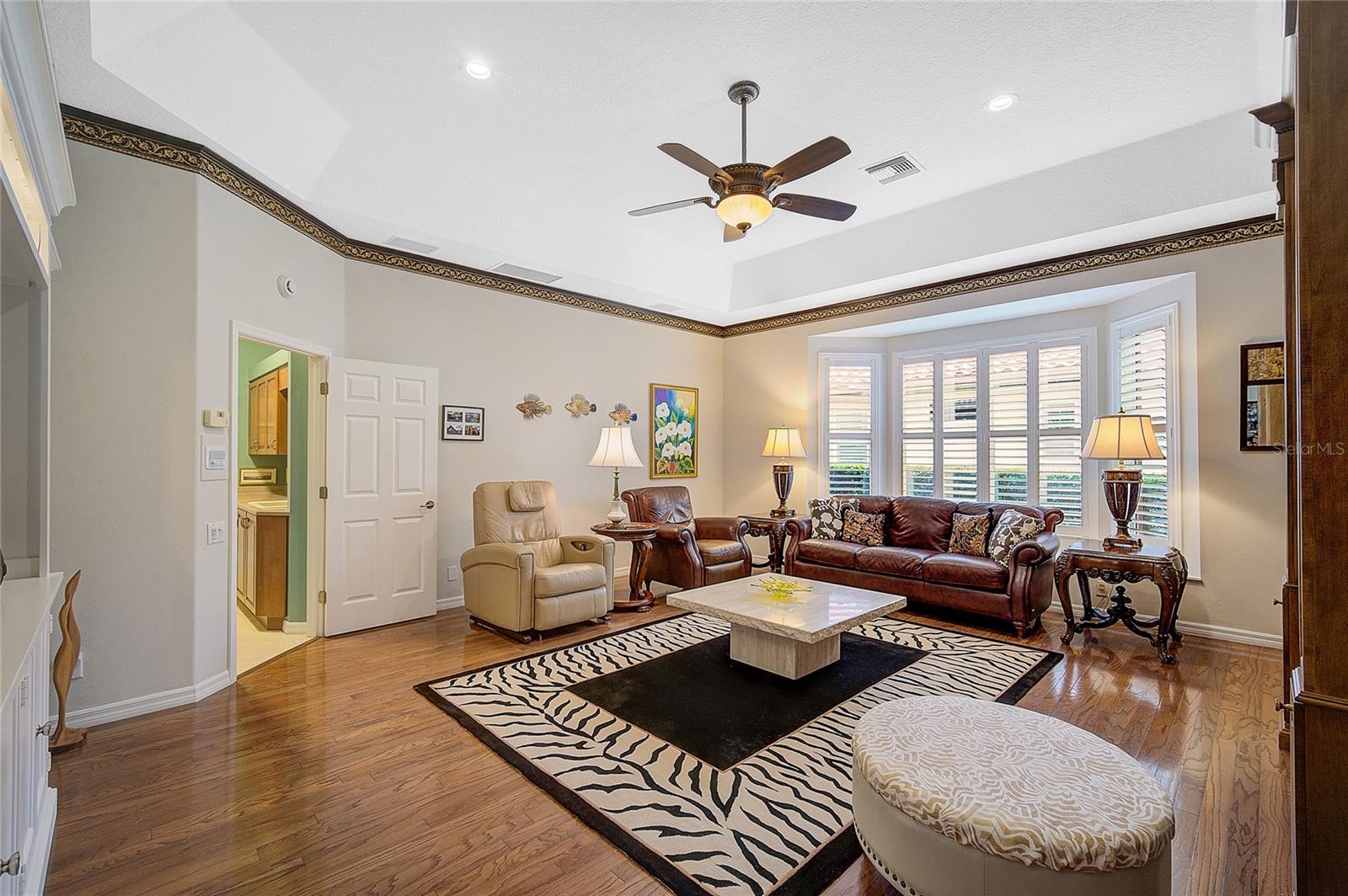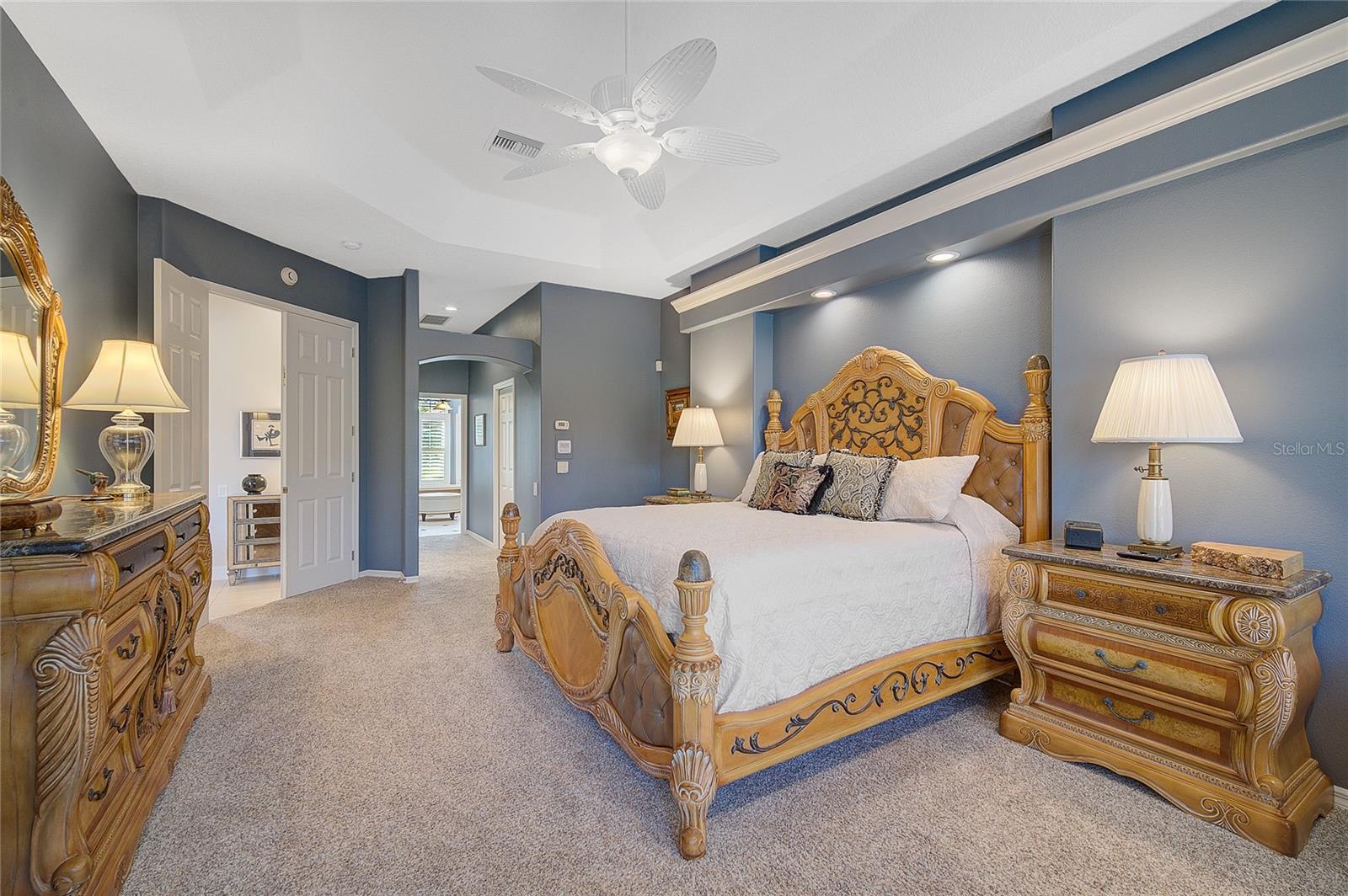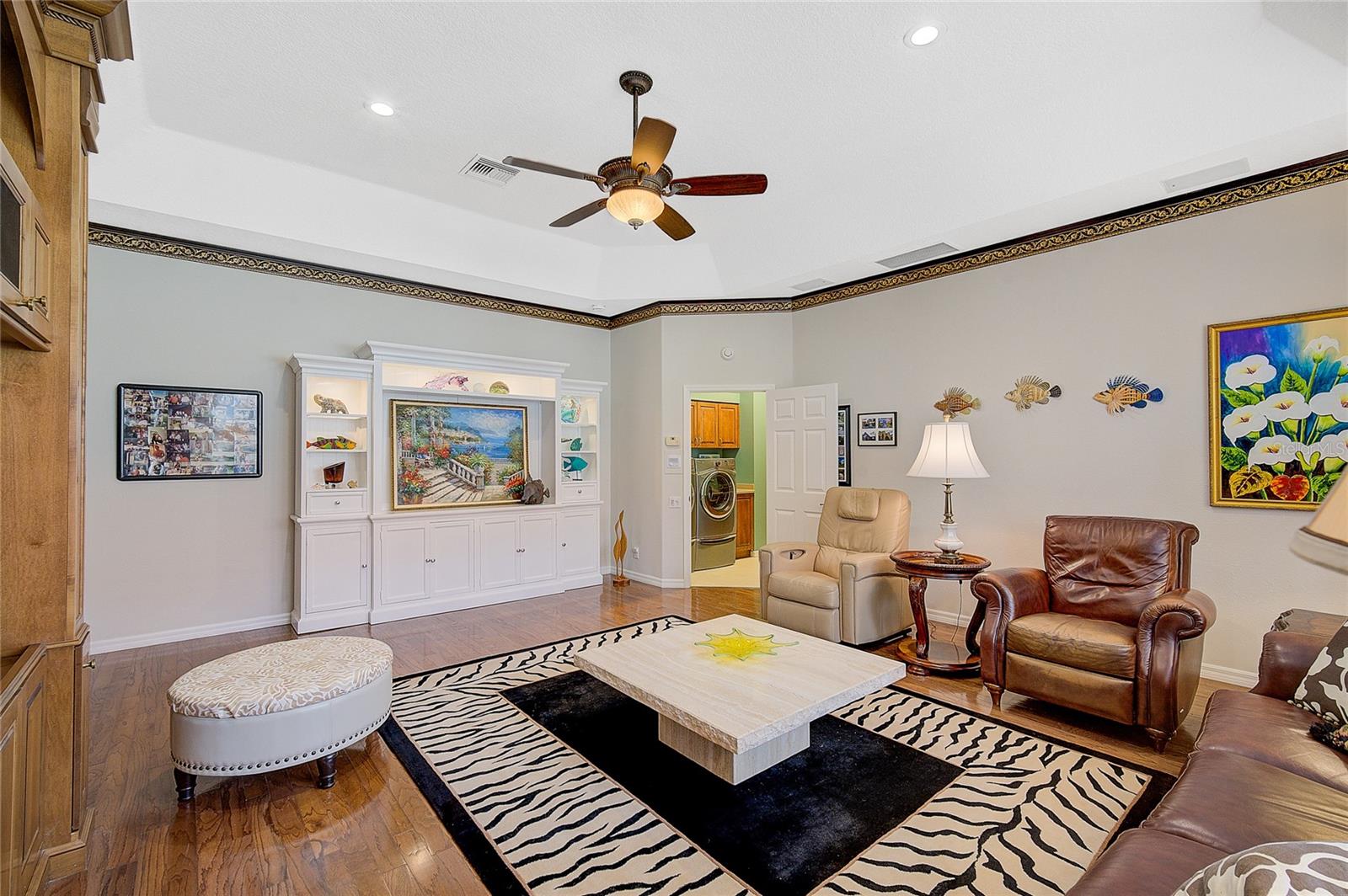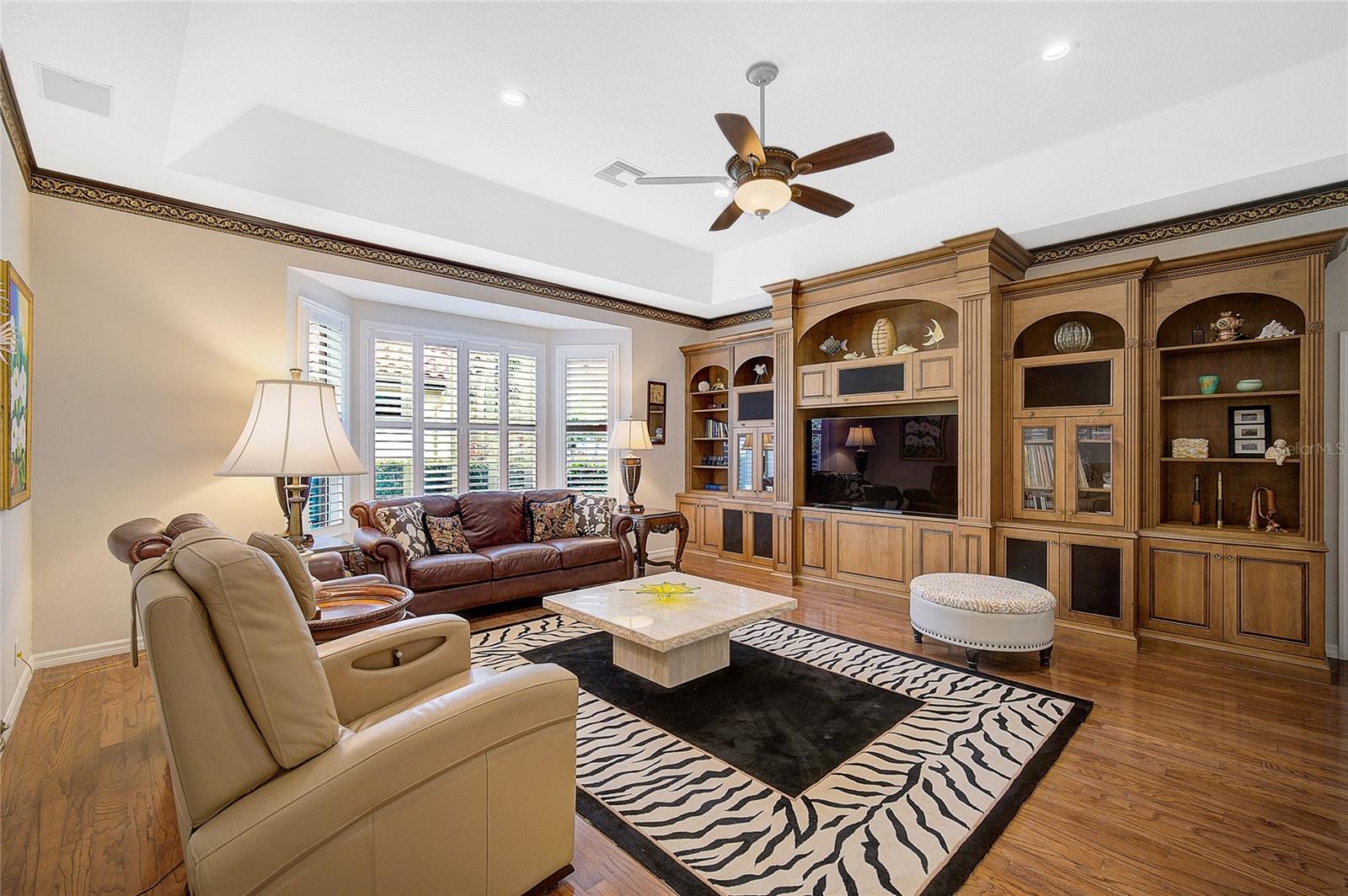 Luxury, comfort and views converge! This captivating LAKEFRONT VIEW home with 3-CAR GARAGE has an expansive floor plan of 4,255 sq ft overlooking the highly desirable golf community of Calusa Lakes. The two-story residence opens to a grand foyer, living room with dazzling stone designed fireplace and open formal dining area. This property offers exquisite finishes throughout including crown molding, built-in wall units, recessed lighting, wood cabinetry and plantation shutters. The gourmet kitchen is a chef’s delight hosting a gas cooktop, built-in ovens, granite counter tops coupled with an oversized island with microwave and beverage cooler. The grand kitchen with aquarium window overflows into the spacious trey ceiling family room where natural sunlight cascades throughout the rooms. There are 4 total bedrooms, 3 are ensuite, one which is located on the second floor or could be ideal for family entertainment, a media room or potential in-law set up. The second floor presents a private balcony with a picturesque view of the meticulous grounds, tranquil pond and the 16th green. The main level hosts a private office ideal for working at home, a comfortable media room which could also be an additional office or perfect workout space. There is a gracious primary suite with 2 walk-in closets and the en-suite is designed with elegance in mind with jetted tub, dual sinks, marble finishes and walk in shower. Step out directly from the primary suite onto the impressive lanai and you will think you entered a 5-star resort. You will appreciate floating in the newly resurfaced 2021 heated pool or relaxing in the spa with your favorite cold beverage. The sound of cascading water as you host friends and relatives on the expansive brick paved lanai with built-in kitchen and granite bar sitting area, will have people never wanting to leave. The freshly painted interior is extremely tasteful with neutral palettes and the 4 air conditioners allow for controlled cooling throughout the home. No CDD fee , low $300 a quarter HOA fee and NO mandatory golf membership makes this the ideal community. Close proximity to world renowned beaches, unique boutique shops, numerous restaurants and cultural activities. The back private residence only gate allows quick access to I-75, international airports both north and south as well as the new Sarasota Memorial Hospital. Welcome to your palatial paradise! BE SURE TO VIEW THE 3-D & AERIAL TOURS.