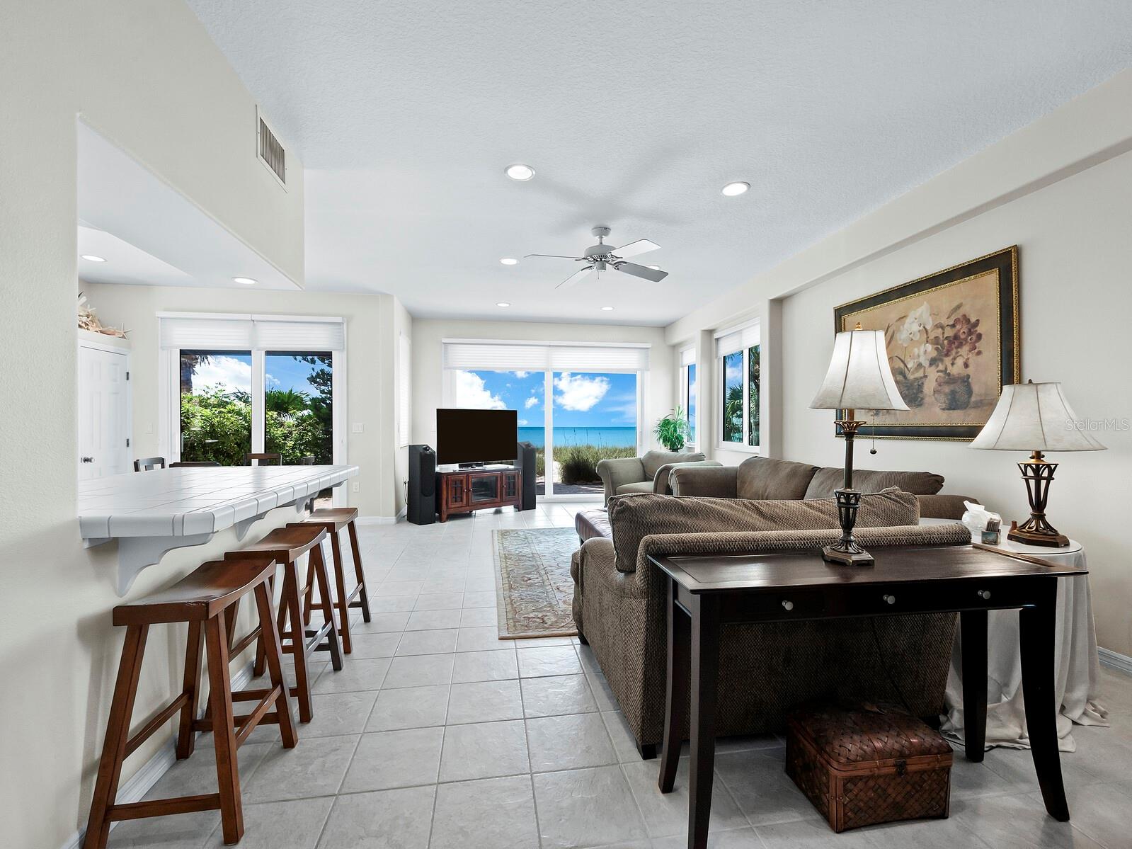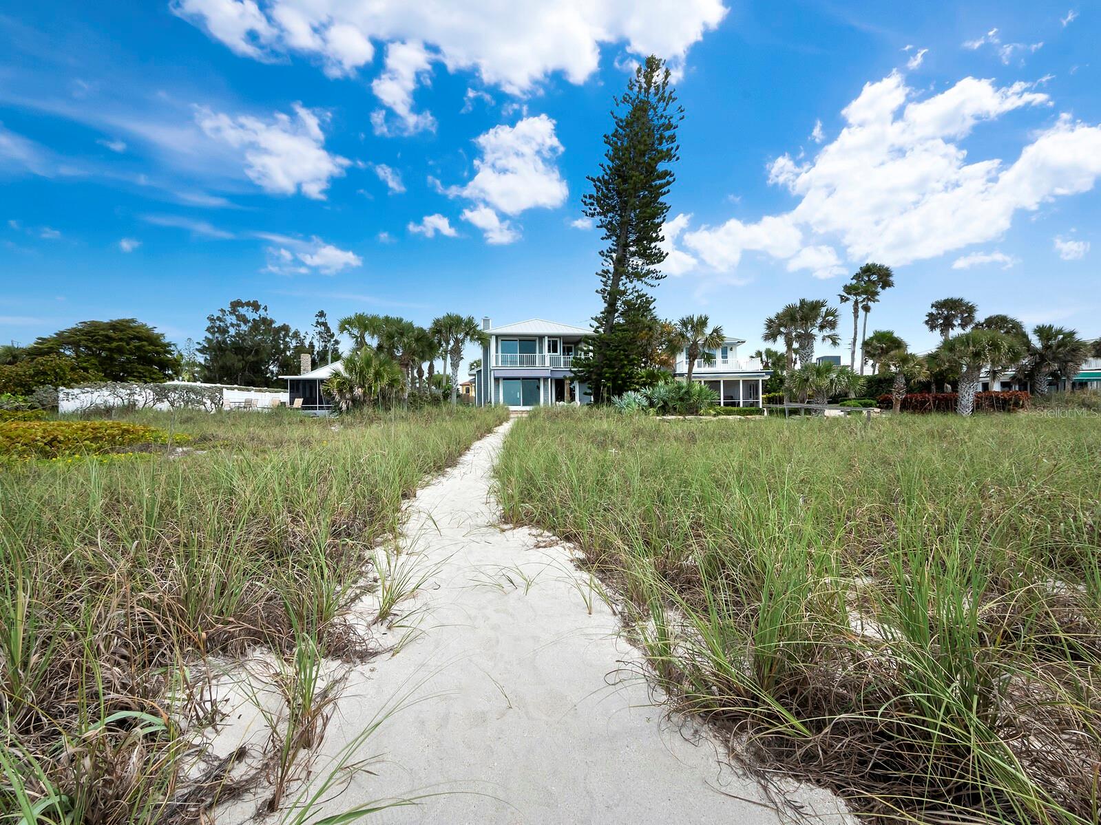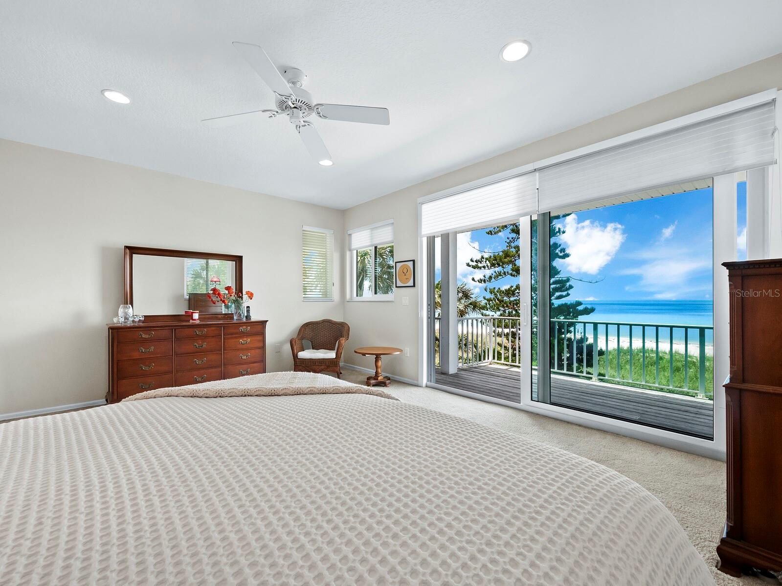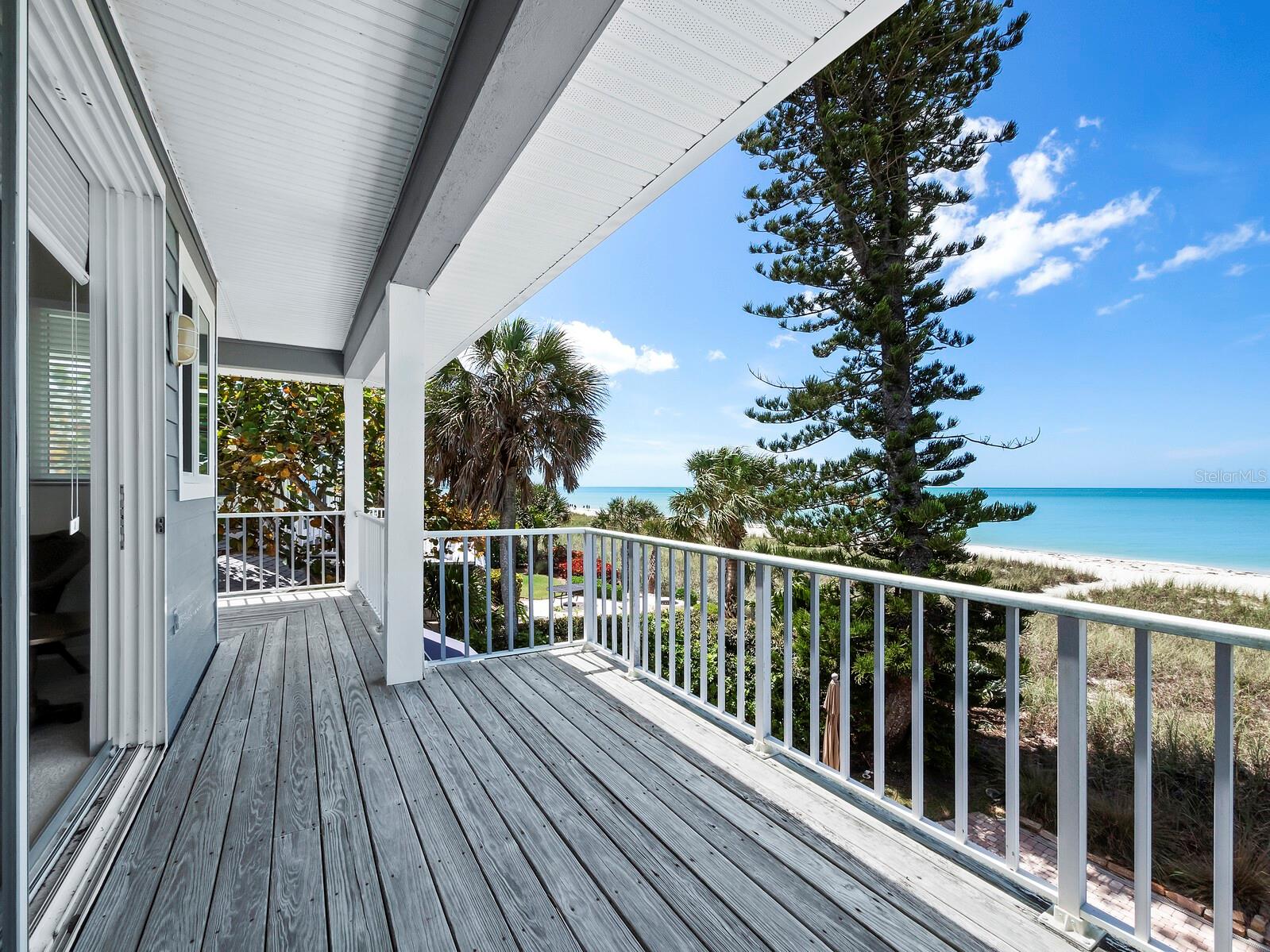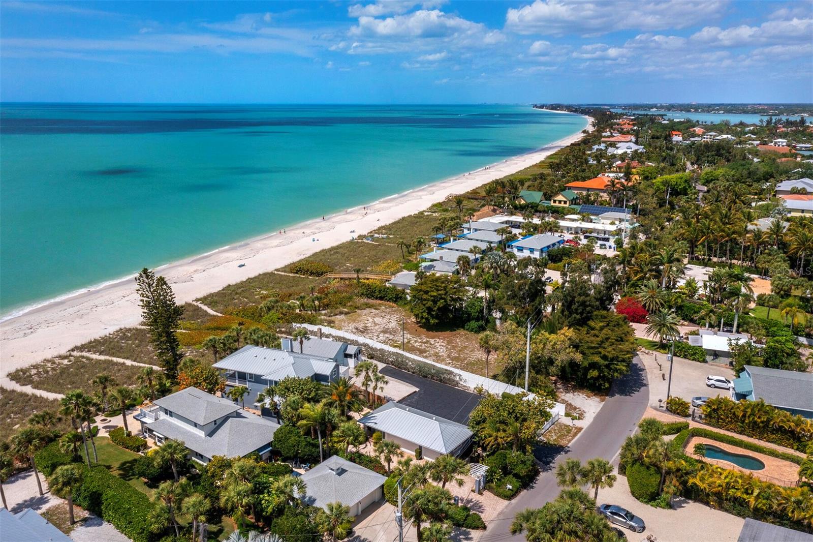 Indulge in the epitome of coastal luxury at this remarkable Casey Key beachfront residence, boasting unparalleled panoramic gulf front views. Step onto the expansive rear paver patio and witness dolphins playfully frolicking in the surf. Soak in the breathtaking unobstructed sunsets visible from numerous rooms within this thoughtfully designed open floor plan home. Seamlessly connecting the living room, family room, dining room and kitchen, this home creates an inviting space for entertaining and relaxation. Tile flooring throughout the first floor, 9-foot ceilings and large impact sliding glass doors frame the picturesque views of the gulf, evoking a sense of tranquility and awe. The kitchen, a chef's delight, features white cabinets with pullout shelves, stainless steel appliances, tile backsplash and an abundance of countertops, including a gas cooktop. Adjacent to the kitchen, a breakfast nook with sliding glass doors offers easy access to the patio, ideal for enjoying morning coffee while taking in the scenic surroundings. For those seeking a quiet retreat or a dedicated workspace, the office features double-entry glass pane French doors, ceiling fan and recessed built-in shelving. The primary owner’s suite exudes comfort and luxury, with sliding glass doors leading to a spacious private balcony overlooking the beach and sparkling gulf waters. A large walk-in closet and en-suite bath with dual vanities, soaking garden tub and walk-in tile shower ensure a serene retreat. Guests will feel pampered in the generously sized bedrooms, each offering private access to a Jack-and-Jill bath. The fourth bedroom, on the ground floor and distinct from the communal spaces, features direct bath access and its own private exterior entry, making it an ideal in-law or guest suite, or even a media room. Updates include new HVAC units in 2024, impact windows, doors and exterior siding in 2020, a metal roof in 2015, and a tankless water heater in 2017 to offer convenience and peace of mind. Being on the water is not complete without boat access, and the captain in you will relish the convenience of the deeded boat dock just steps away on the intracoastal. The voluminous three-car garage includes an additional climate-controlled room, ideal for a workshop, art studio, workout room or just extra storage. Appreciate the convenience of having the nationally acclaimed Pine View school, ranked #18 in the country, just a short 15-minute drive away. In an ideal location with convenient bridge access to shopping, dining and amenities, this gulf front property epitomizes the ultimate coastal lifestyle. Don’t miss your chance to own this extraordinary coastal retreat. Schedule your showing today!