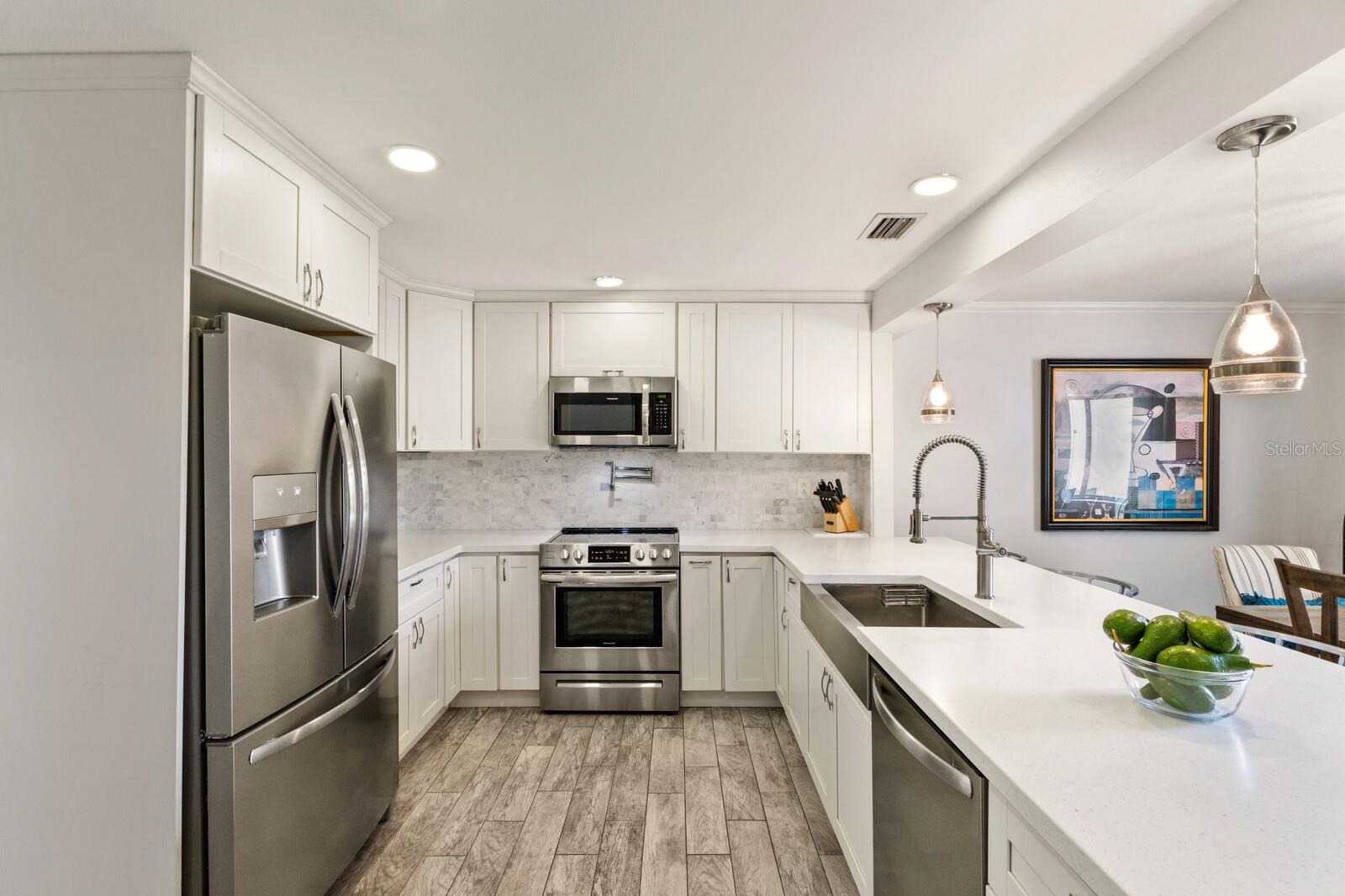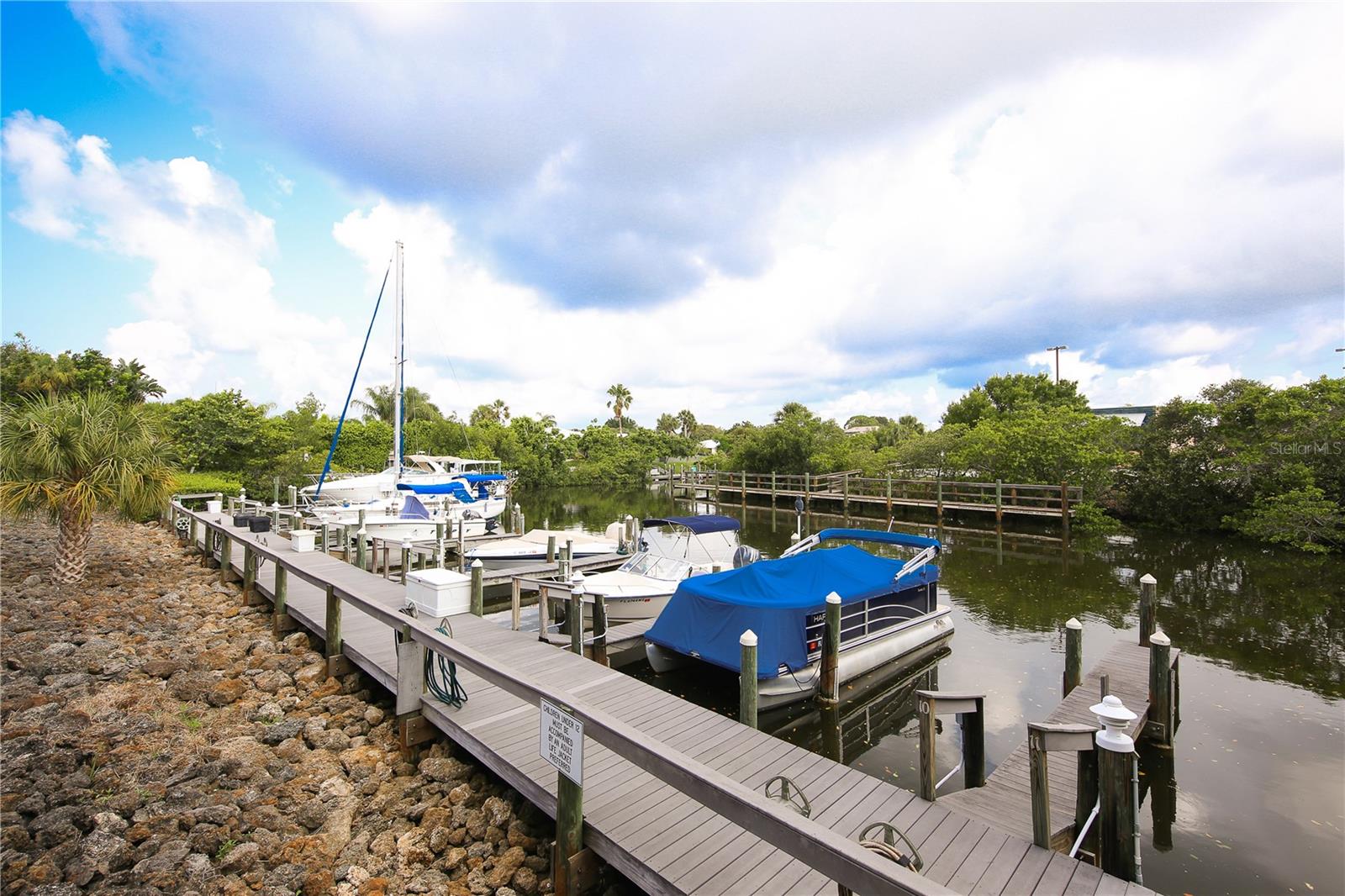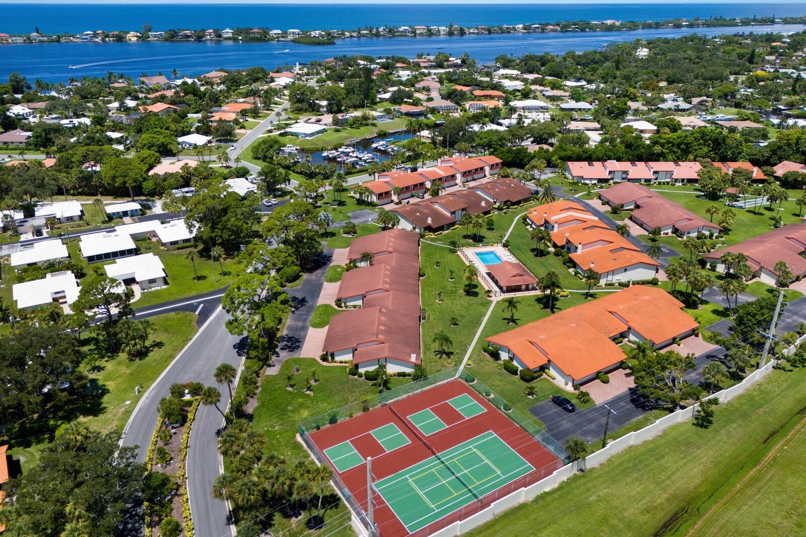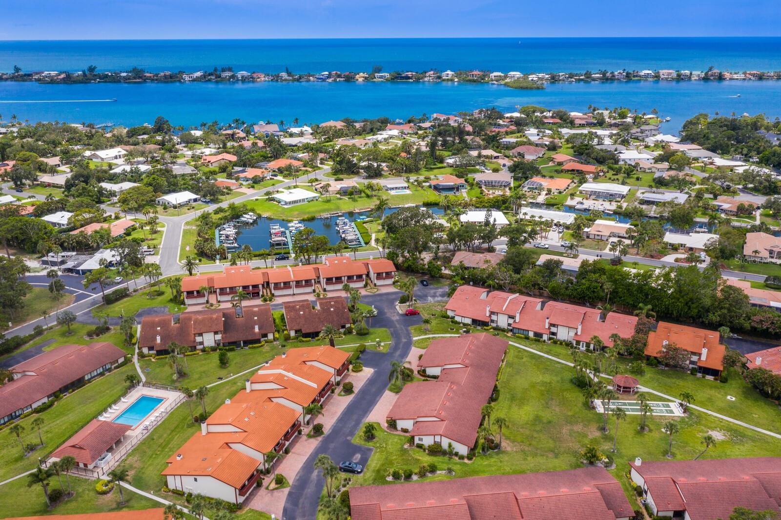 Calling boat enthusiasts! Remodeled 3 bedroom/2.5 bath condo in coveted "West of Trail" location offers direct access to ICW and Gulf of Mexico. The modern, multi-level design includes a two-car garage and separate laundry on the ground floor. Up a few steps discover a cleverly redesigned kitchen with white wood cabinets, glass pendants, new appliances, lazy Susan organizers, a spice drawer, and quartz breakfast bar that flows into the dining room, with picturesque views through a large window. Grays and whites effortlessly blend into the expansive great room, enhanced by soaring shiplap-beamed vaulted ceilings and solid strand bamboo flooring. An office/sunroom tucked off the back overlooks the peaceful courtyard - perfect for home office, craft space, or exercise. Up a few stairs are two bedrooms that share a fully renovated bathroom and balcony. A few more steps lead to the master suite, with 2 separate closets and a completely redone ensuite bath with spacious walk-in dual head shower, marble tile and dual sink vanity. Roof new 2023. Fees include community pool, building maintenance, roof, lawn care, wind/flood/hazard insurance, tennis courts and common areas. Slips at dock are first come basis. Boat sold separately. Highly rated schools including Laurel Nokomis, Pineview and Venice HS.