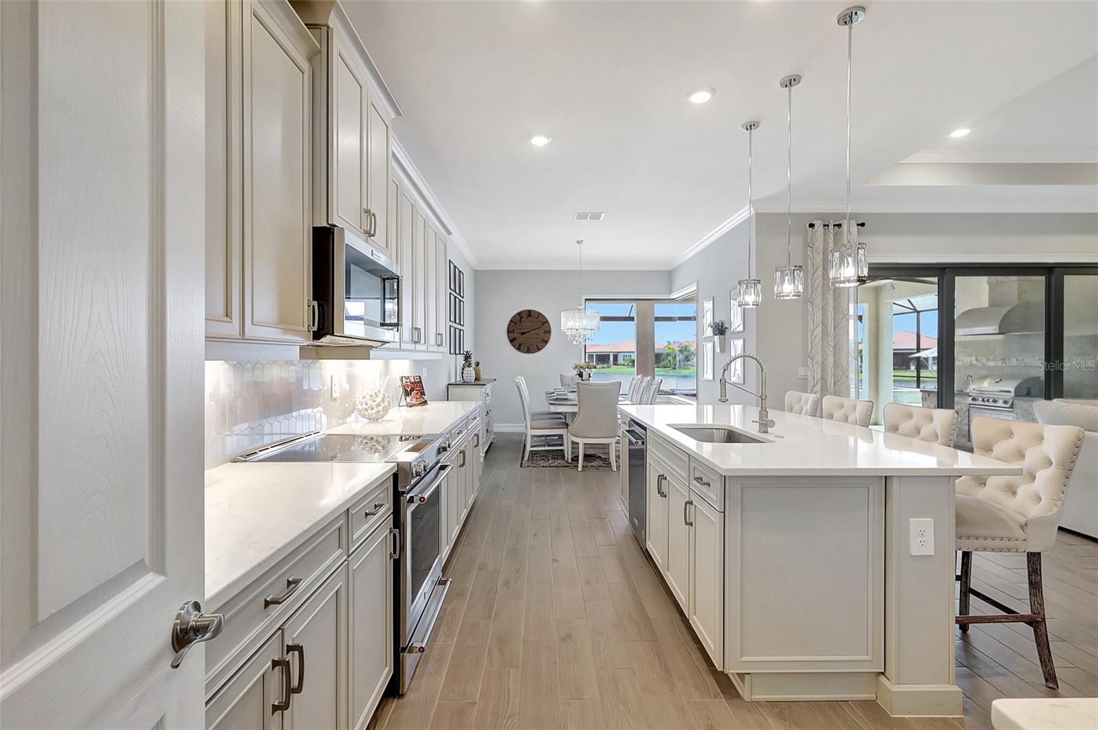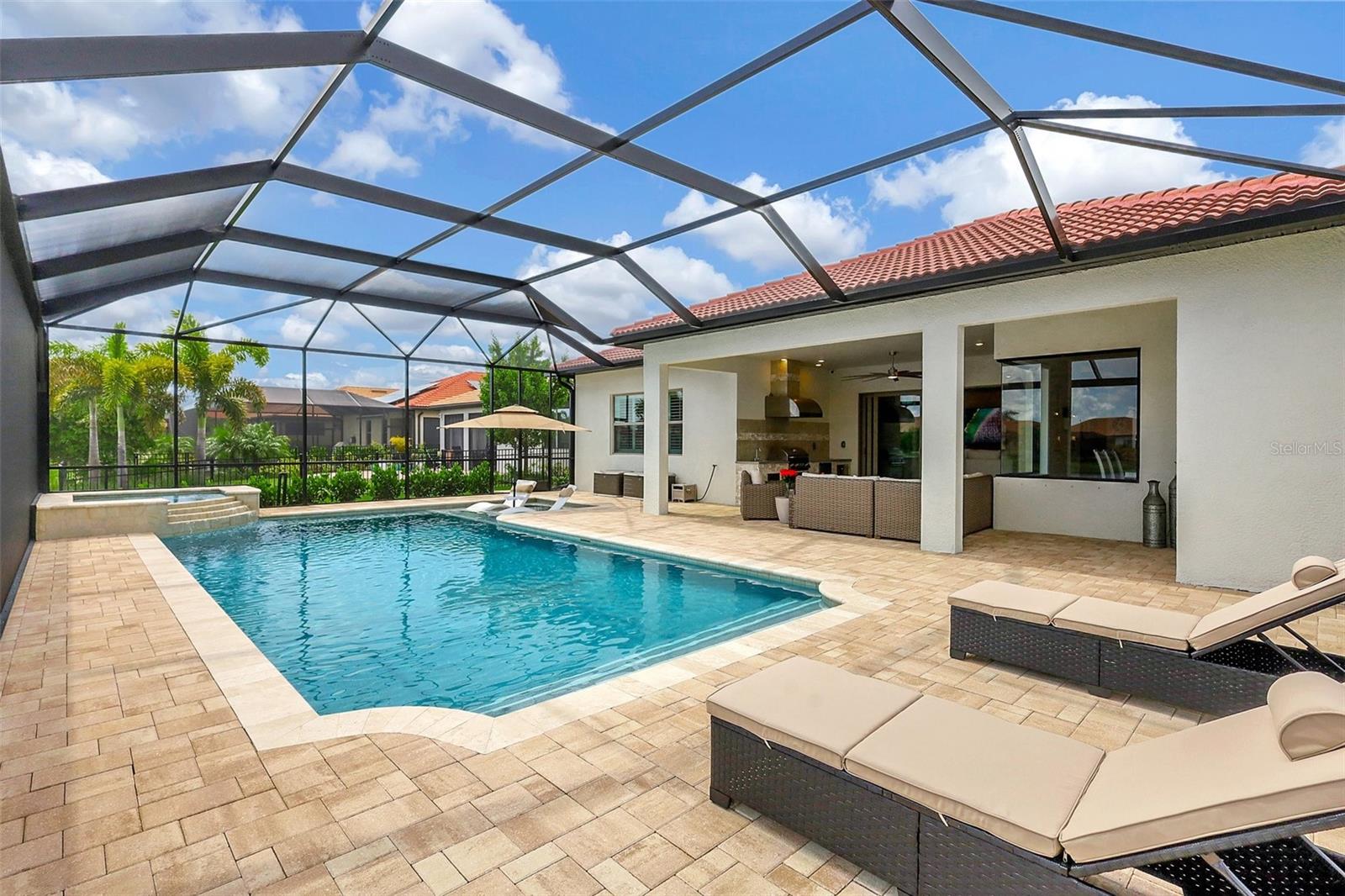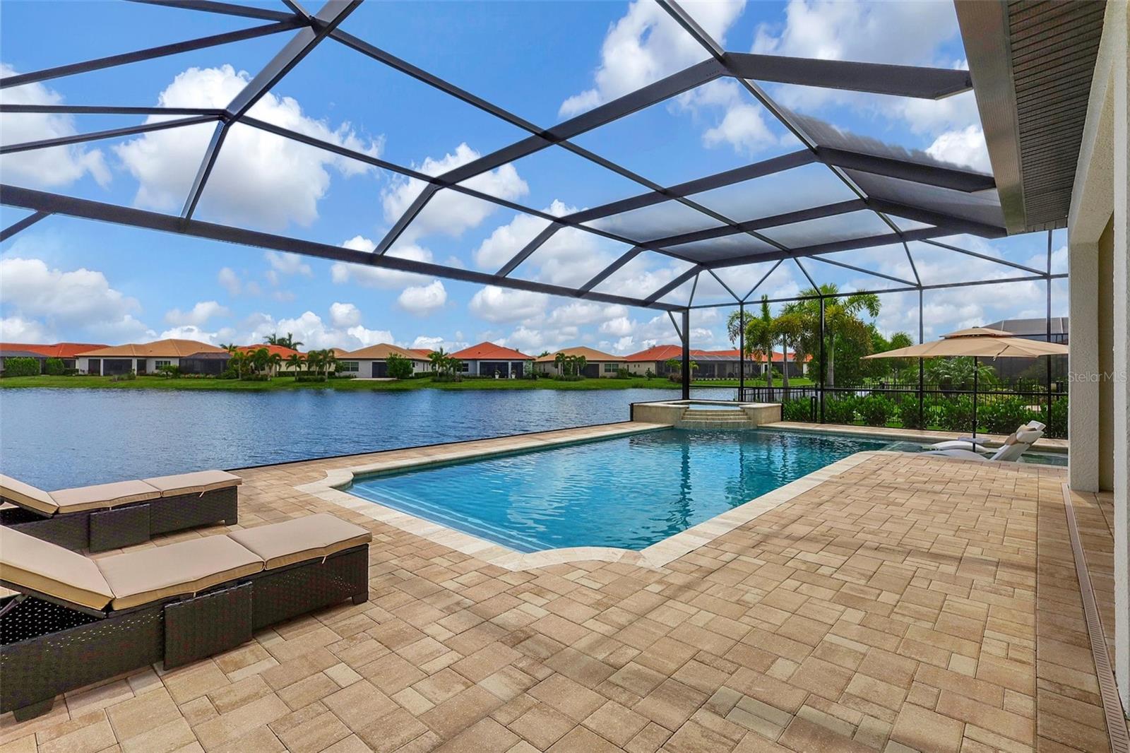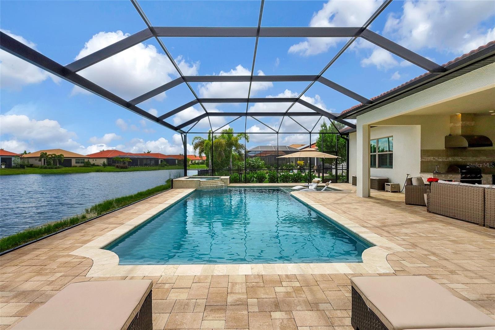 Indulge in luxury living in this exquisite three-bedroom, three-bathroom home featuring an additional two half-bathrooms. This meticulously designed residence boasts a spacious den, a three-car garage, and breathtaking panoramic views of a serene pond. Unwind in your private oasis, complete with a sparkling saltwater pool, rejuvenating hot tub, and a clear view screened-in enclosure offering seamless indoor-outdoor living. This home is complete with impact resistant windows and doors. Step inside from the covered paver entryway to discover a world of elegance with gleaming quartz countertops, rich wood-look ceramic tile flooring throughout, crown molding and an open floor plan perfect for entertaining. Foray is a wonderful long view thru to the lanai pool. Directly to the left is a hallway having a second bedroom facing the front of the home, a lovely shared full bath and an additional third bedroom. Each bedroom has a ceiling fan with light. Further, on the left is a spacious glass double door entry to a spacious den with window. Across the hallway is one of two half baths, the mud space to the three-car garage. Further, down this hallway is you'll find the laundry room with many cabinets, sink and quartz counter space for folding. Onward, the third bedroom with wonderful full bath, with long counter and glass door walk-in tiled shower. Entering the spacious open heart of the home with large tray ceiling, views of the lanai, pool and pond. The fabulous kitchen has a large, long counter for hosting, tiled backsplash, soft-close and top of the line SS Kitchen Aid appliances. The pantry is larger and is wood shelved for the highest use. Adjoining the kitchen is a delightful long dining area with seamless window views to lanai, pool and pond. To the back of the home the master suite with four windows, two California closet walk in's, double-sink master bath and ceiling to floor walk-in shower. In the back, an amazing, covered area on the lanai, with outdoor tile/stone kitchen with grill, vent-out hood, sink and refrigerator. The pool area is paver, a sun shelf, raised hot tub and grand view of large pond behind home. Toscana Isles has amenities for all, a grand infinity edge pool, hot tub, looking over one of 200 acres of connected lakes for the members of this neighborhood to kayak/canoe, fish and board. With 8,000 sq ft clubhouse holding a fitness center, gathering game room, kitchen/bar billiard room and ballroom. The grounds having tennis, pickleball, bocce courts, playground and dog parks. Some of the best beaches on the Gulf of Mexico within minutes, the Legacy Trail for biking and running/walking, downtown Venice and Sarasota and just a mile from Sarasota Memorial Hospital Venice at the US 75 highway.