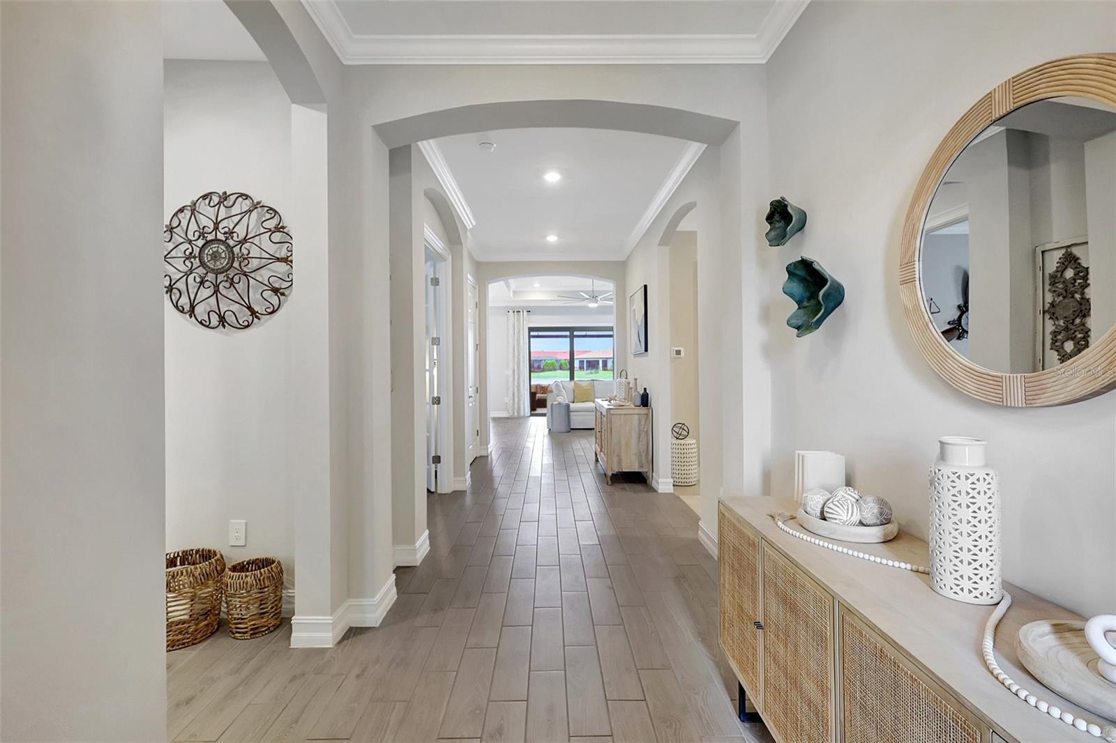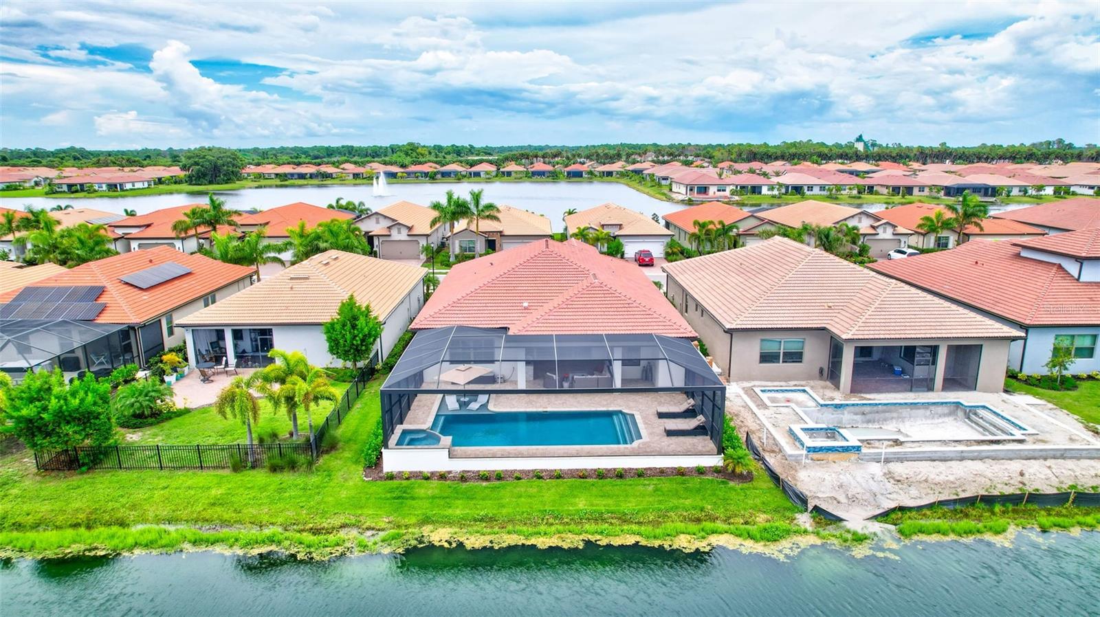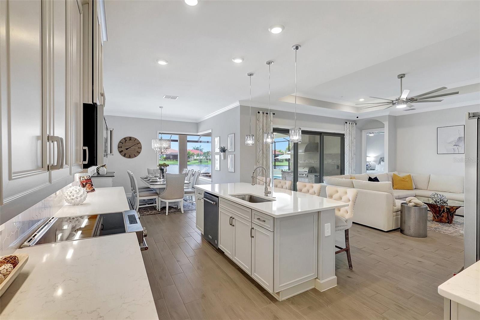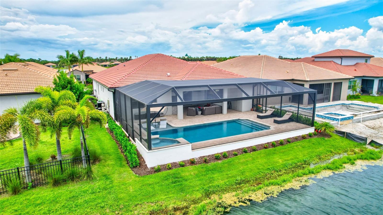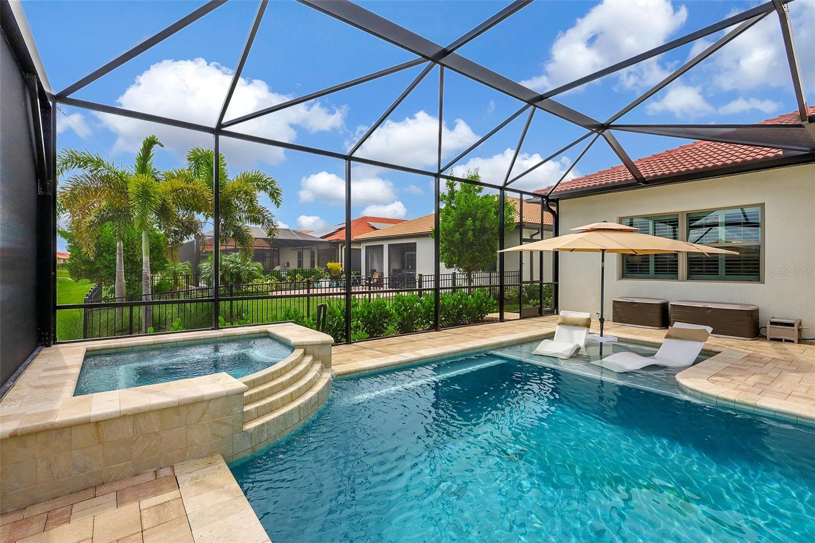 Indulge in luxury living in this exquisite three-bedroom, three-bathroom home featuring an additional two half-bathrooms. This meticulously designed residence boasts a spacious den, a three-car garage, and breathtaking panoramic views of a serene pond. Unwind in your private oasis, complete with a sparkling saltwater pool, rejuvenating hot tub, and a clear view screened-in enclosure offering seamless indoor-outdoor living. This home is complete with impact resistant windows and doors. Step inside from the covered paver entryway to discover a world of elegance with gleaming quartz countertops, rich wood-look ceramic tile flooring throughout, crown molding and an open floor plan perfect for entertaining. Foray is a wonderful long view thru to the lanai pool. Directly to the left is a hallway having a second bedroom facing the front of the home, a lovely shared full bath and an additional third bedroom. Each bedroom has a ceiling fan with light. Further, on the left is a spacious glass double door entry to a spacious den with window. Across the hallway is one of two half baths, the mud space to the three-car garage. Further, down this hallway is you'll find the laundry room with many cabinets, sink and quartz counter space for folding. Onward, the third bedroom with wonderful full bath, with long counter and glass door walk-in tiled shower. Entering the spacious open heart of the home with large tray ceiling, views of the lanai, pool and pond. The fabulous kitchen has a large, long counter for hosting, tiled backsplash, soft-close and top of the line SS Kitchen Aid appliances. The pantry is larger and is wood shelved for the highest use. Adjoining the kitchen is a delightful long dining area with seamless window views to lanai, pool and pond. To the back of the home the master suite with four windows, two California closet walk in's, double-sink master bath and ceiling to floor walk-in shower. In the back, an amazing, covered area on the lanai, with outdoor tile/stone kitchen with grill, vent-out hood, sink and refrigerator. The pool area is paver, a sun shelf, raised hot tub and grand view of large pond behind home. Toscana Isles has amenities for all, a grand infinity edge pool, hot tub, looking over one of 200 acres of connected lakes for the members of this neighborhood to kayak/canoe, fish and board. With 8,000 sq ft clubhouse holding a fitness center, gathering game room, kitchen/bar billiard room and ballroom. The grounds having tennis, pickleball, bocce courts, playground and dog parks. Some of the best beaches on the Gulf of Mexico within minutes, the Legacy Trail for biking and running/walking, downtown Venice and Sarasota and just a mile from Sarasota Memorial Hospital Venice at the US 75 highway.