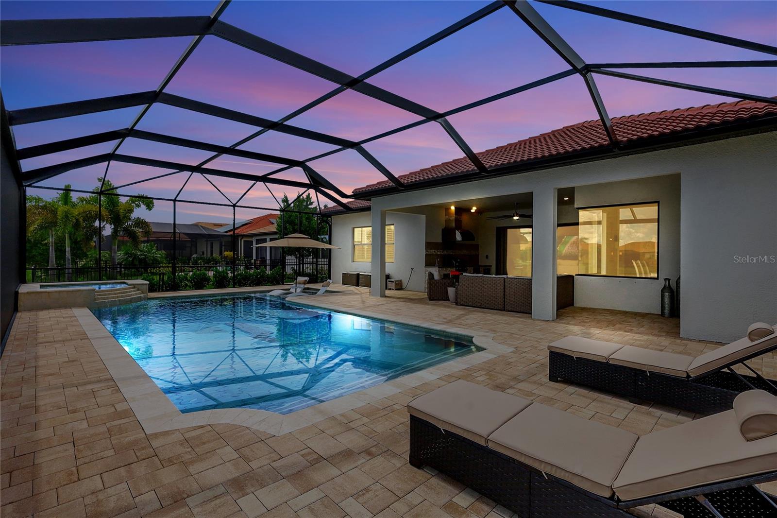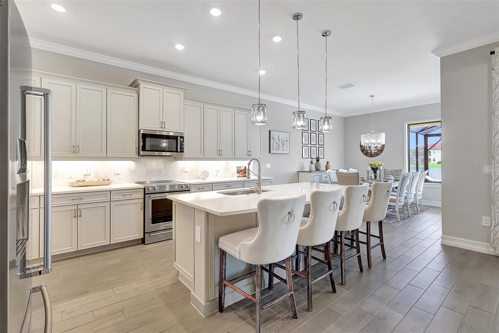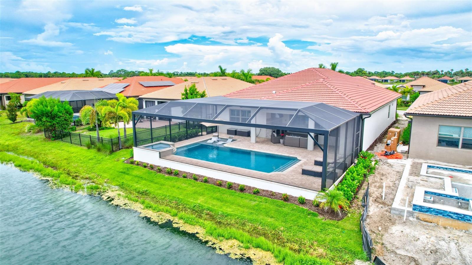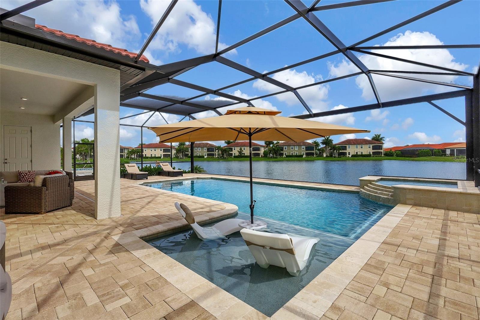 Indulge in luxury living in this exquisite three-bedroom, three-bathroom home featuring an additional two half-bathrooms. This meticulously designed residence boasts a spacious den, a three-car garage, and breathtaking panoramic views of a serene pond. Unwind in your private oasis, complete with a sparkling saltwater pool, rejuvenating hot tub, and a clear view screened-in enclosure offering seamless indoor-outdoor living. This home is complete with impact resistant windows and doors. Step inside from the covered paver entryway to discover a world of elegance with gleaming quartz countertops, rich wood-look ceramic tile flooring throughout, crown molding and an open floor plan perfect for entertaining. Foray is a wonderful long view thru to the lanai pool. Directly to the left is a hallway having a second bedroom facing the front of the home, a lovely shared full bath and an additional third bedroom. Each bedroom has a ceiling fan with light. Further, on the left is a spacious glass double door entry to a spacious den with window. Across the hallway is one of two half baths, the mud space to the three-car garage. Further, down this hallway is you'll find the laundry room with many cabinets, sink and quartz counter space for folding. Onward, the third bedroom with wonderful full bath, with long counter and glass door walk-in tiled shower. Entering the spacious open heart of the home with large tray ceiling, views of the lanai, pool and pond. The fabulous kitchen has a large, long counter for hosting, tiled backsplash, soft-close and top of the line SS Kitchen Aid appliances. The pantry is larger and is wood shelved for the highest use. Adjoining the kitchen is a delightful long dining area with seamless window views to lanai, pool and pond. To the back of the home the master suite with four windows, two California closet walk in's, double-sink master bath and ceiling to floor walk-in shower. In the back, an amazing, covered area on the lanai, with outdoor tile/stone kitchen with grill, vent-out hood, sink and refrigerator. The pool area is paver, a sun shelf, raised hot tub and grand view of large pond behind home. Toscana Isles has amenities for all, a grand infinity edge pool, hot tub, looking over one of 200 acres of connected lakes for the members of this neighborhood to kayak/canoe, fish and board. With 8,000 sq ft clubhouse holding a fitness center, gathering game room, kitchen/bar billiard room and ballroom. The grounds having tennis, pickleball, bocce courts, playground and dog parks. Some of the best beaches on the Gulf of Mexico within minutes, the Legacy Trail for biking and running/walking, downtown Venice and Sarasota and just a mile from Sarasota Memorial Hospital Venice at the US 75 highway.
