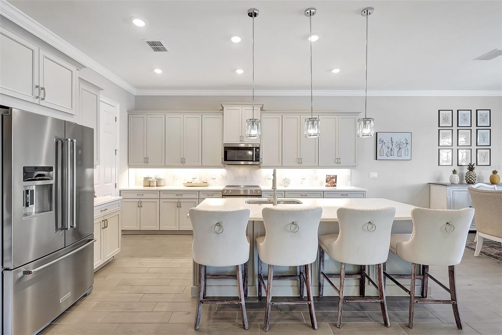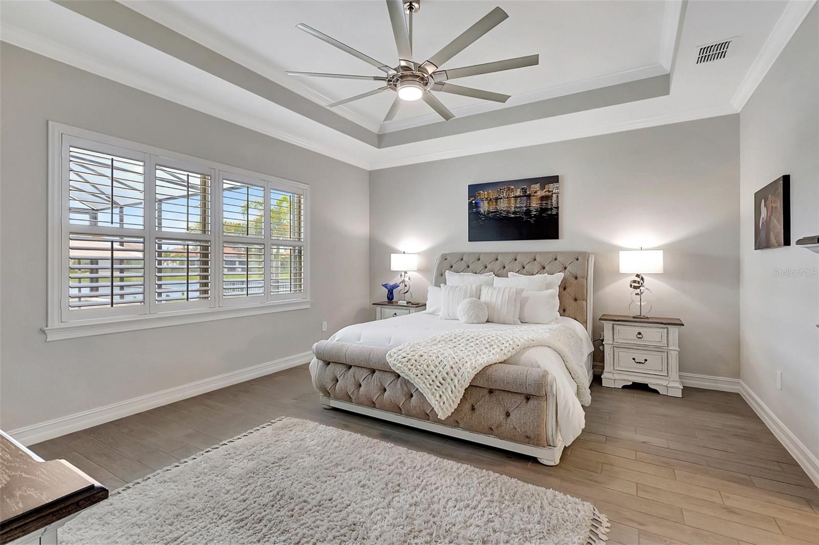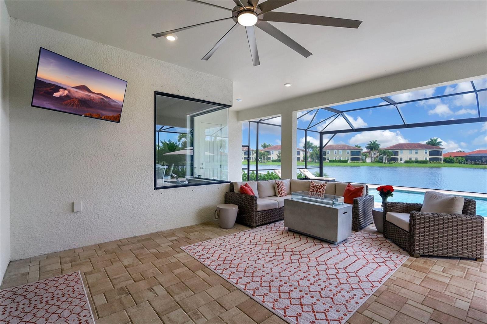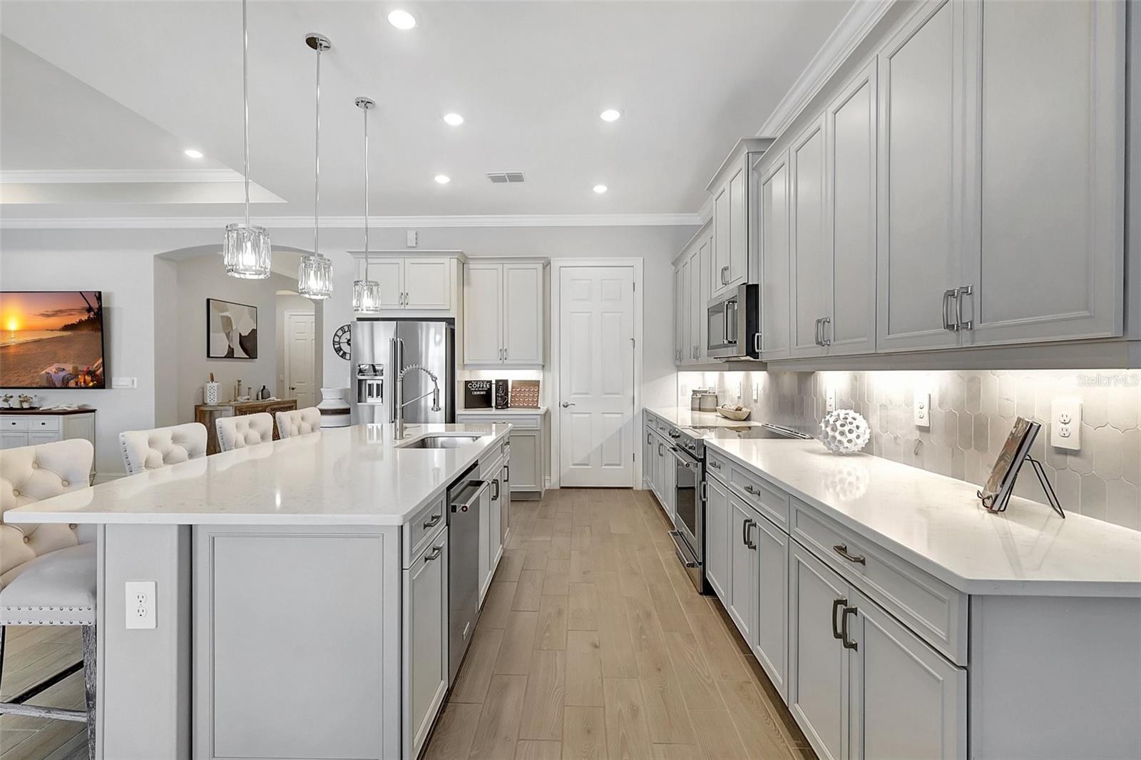 Indulge in luxury living in this exquisite three-bedroom, three-bathroom home featuring an additional two half-bathrooms. This meticulously designed residence boasts a spacious den, a three-car garage, and breathtaking panoramic views of a serene pond. Unwind in your private oasis, complete with a sparkling saltwater pool, rejuvenating hot tub, and a clear view screened-in enclosure offering seamless indoor-outdoor living. This home is complete with impact resistant windows and doors. Step inside from the covered paver entryway to discover a world of elegance with gleaming quartz countertops, rich wood-look ceramic tile flooring throughout, crown molding and an open floor plan perfect for entertaining. Foray is a wonderful long view thru to the lanai pool. Directly to the left is a hallway having a second bedroom facing the front of the home, a lovely shared full bath and an additional third bedroom. Each bedroom has a ceiling fan with light. Further, on the left is a spacious glass double door entry to a spacious den with window. Across the hallway is one of two half baths, the mud space to the three-car garage. Further, down this hallway is you'll find the laundry room with many cabinets, sink and quartz counter space for folding. Onward, the third bedroom with wonderful full bath, with long counter and glass door walk-in tiled shower. Entering the spacious open heart of the home with large tray ceiling, views of the lanai, pool and pond. The fabulous kitchen has a large, long counter for hosting, tiled backsplash, soft-close and top of the line SS Kitchen Aid appliances. The pantry is larger and is wood shelved for the highest use. Adjoining the kitchen is a delightful long dining area with seamless window views to lanai, pool and pond. To the back of the home the master suite with four windows, two California closet walk in's, double-sink master bath and ceiling to floor walk-in shower. In the back, an amazing, covered area on the lanai, with outdoor tile/stone kitchen with grill, vent-out hood, sink and refrigerator. The pool area is paver, a sun shelf, raised hot tub and grand view of large pond behind home. Toscana Isles has amenities for all, a grand infinity edge pool, hot tub, looking over one of 200 acres of connected lakes for the members of this neighborhood to kayak/canoe, fish and board. With 8,000 sq ft clubhouse holding a fitness center, gathering game room, kitchen/bar billiard room and ballroom. The grounds having tennis, pickleball, bocce courts, playground and dog parks. Some of the best beaches on the Gulf of Mexico within minutes, the Legacy Trail for biking and running/walking, downtown Venice and Sarasota and just a mile from Sarasota Memorial Hospital Venice at the US 75 highway.