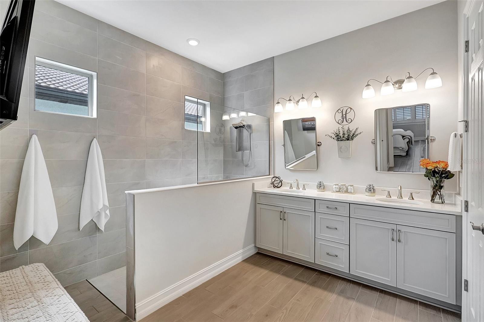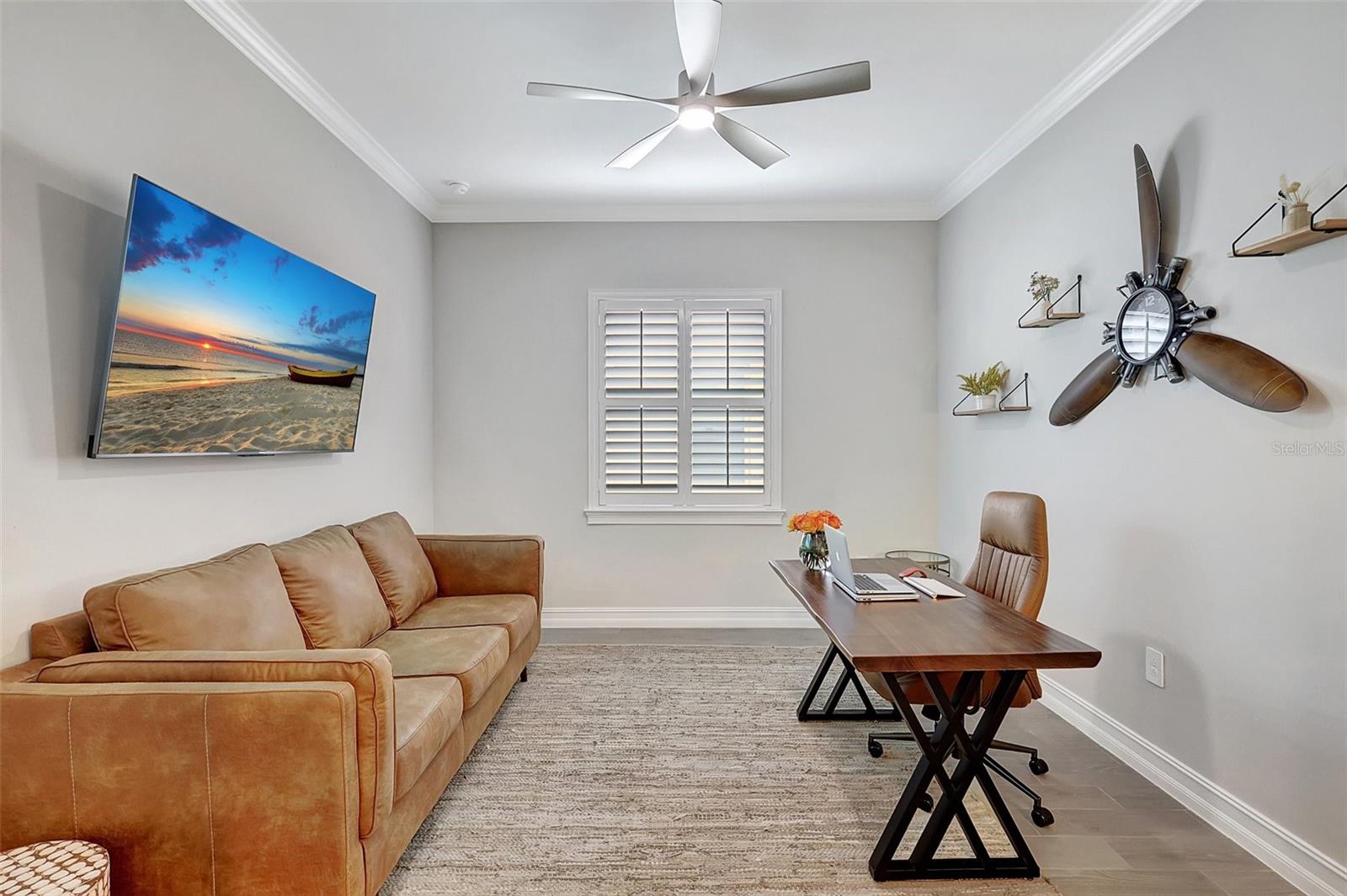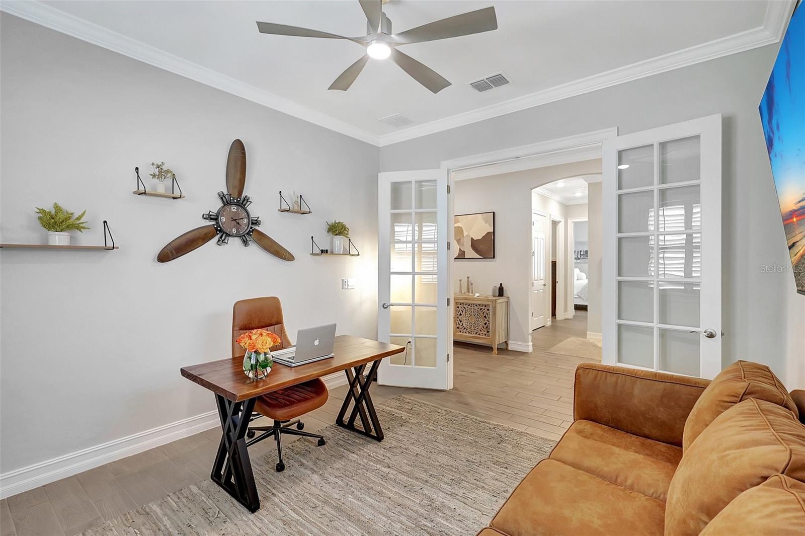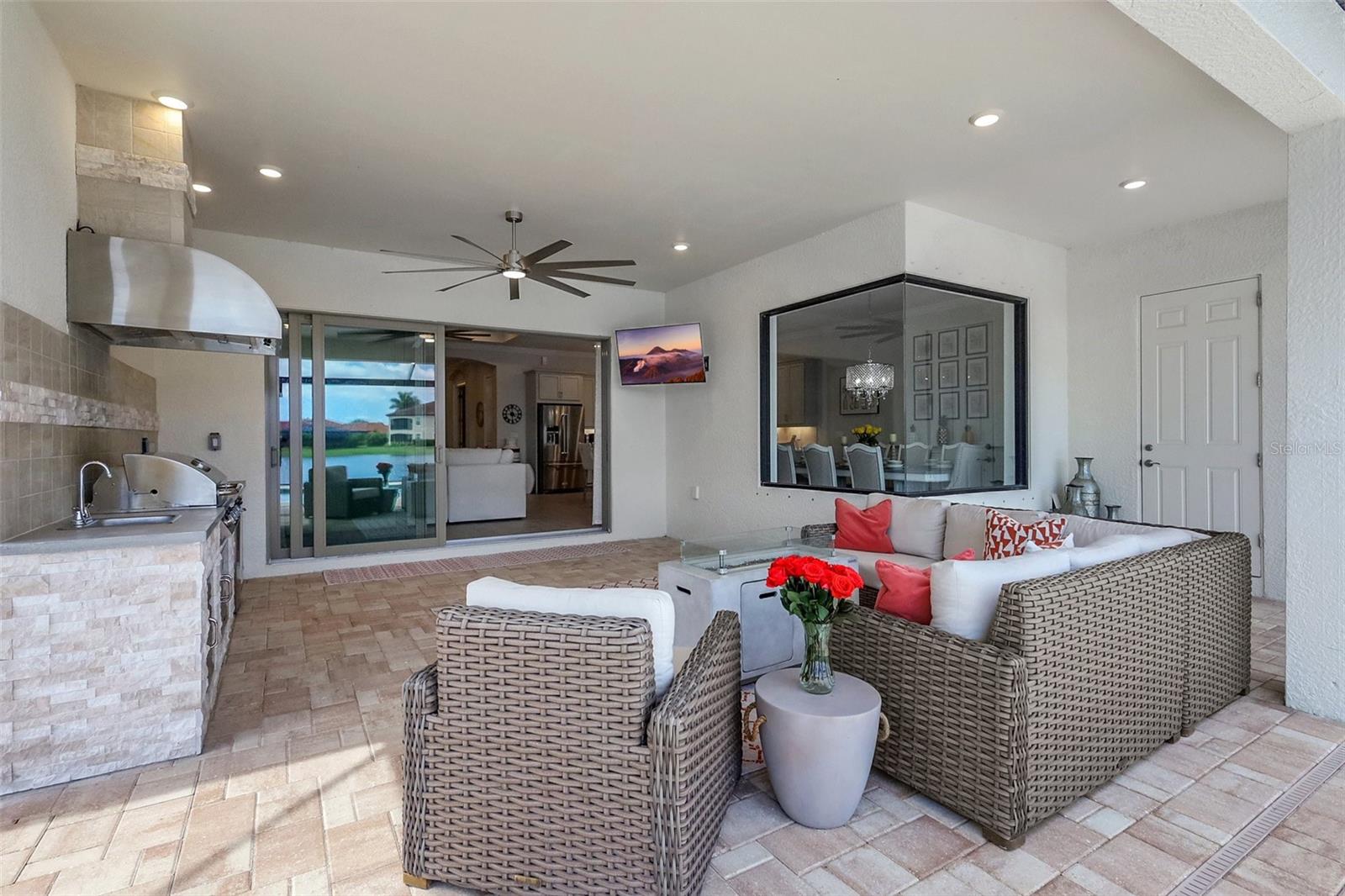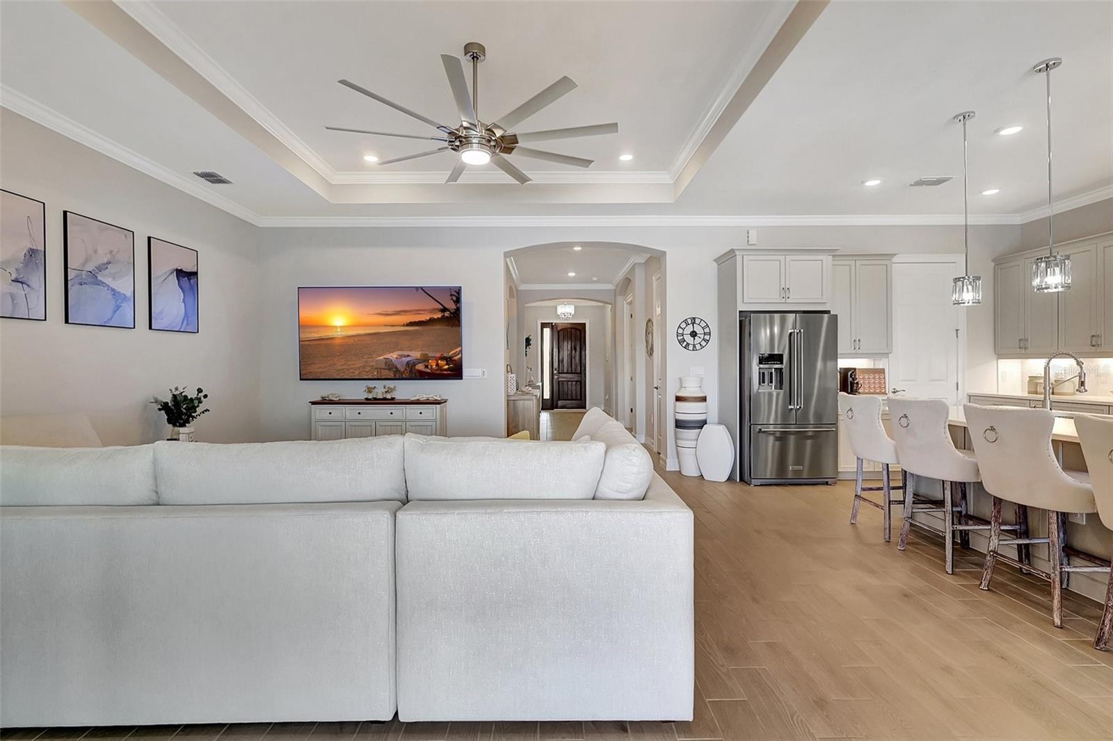 Indulge in luxury living in this exquisite three-bedroom, three-bathroom home featuring an additional two half-bathrooms. This meticulously designed residence boasts a spacious den, a three-car garage, and breathtaking panoramic views of a serene pond. Unwind in your private oasis, complete with a sparkling saltwater pool, rejuvenating hot tub, and a clear view screened-in enclosure offering seamless indoor-outdoor living. This home is complete with impact resistant windows and doors. Step inside from the covered paver entryway to discover a world of elegance with gleaming quartz countertops, rich wood-look ceramic tile flooring throughout, crown molding and an open floor plan perfect for entertaining. Foray is a wonderful long view thru to the lanai pool. Directly to the left is a hallway having a second bedroom facing the front of the home, a lovely shared full bath and an additional third bedroom. Each bedroom has a ceiling fan with light. Further, on the left is a spacious glass double door entry to a spacious den with window. Across the hallway is one of two half baths, the mud space to the three-car garage. Further, down this hallway is you'll find the laundry room with many cabinets, sink and quartz counter space for folding. Onward, the third bedroom with wonderful full bath, with long counter and glass door walk-in tiled shower. Entering the spacious open heart of the home with large tray ceiling, views of the lanai, pool and pond. The fabulous kitchen has a large, long counter for hosting, tiled backsplash, soft-close and top of the line SS Kitchen Aid appliances. The pantry is larger and is wood shelved for the highest use. Adjoining the kitchen is a delightful long dining area with seamless window views to lanai, pool and pond. To the back of the home the master suite with four windows, two California closet walk in's, double-sink master bath and ceiling to floor walk-in shower. In the back, an amazing, covered area on the lanai, with outdoor tile/stone kitchen with grill, vent-out hood, sink and refrigerator. The pool area is paver, a sun shelf, raised hot tub and grand view of large pond behind home. Toscana Isles has amenities for all, a grand infinity edge pool, hot tub, looking over one of 200 acres of connected lakes for the members of this neighborhood to kayak/canoe, fish and board. With 8,000 sq ft clubhouse holding a fitness center, gathering game room, kitchen/bar billiard room and ballroom. The grounds having tennis, pickleball, bocce courts, playground and dog parks. Some of the best beaches on the Gulf of Mexico within minutes, the Legacy Trail for biking and running/walking, downtown Venice and Sarasota and just a mile from Sarasota Memorial Hospital Venice at the US 75 highway.