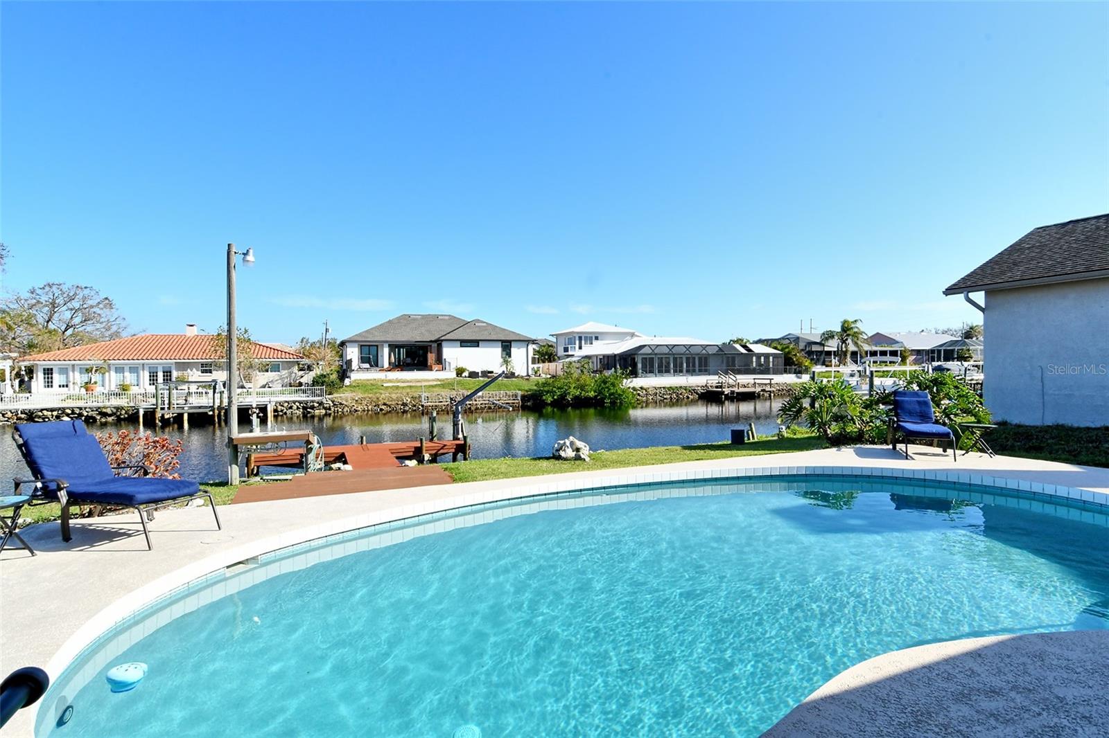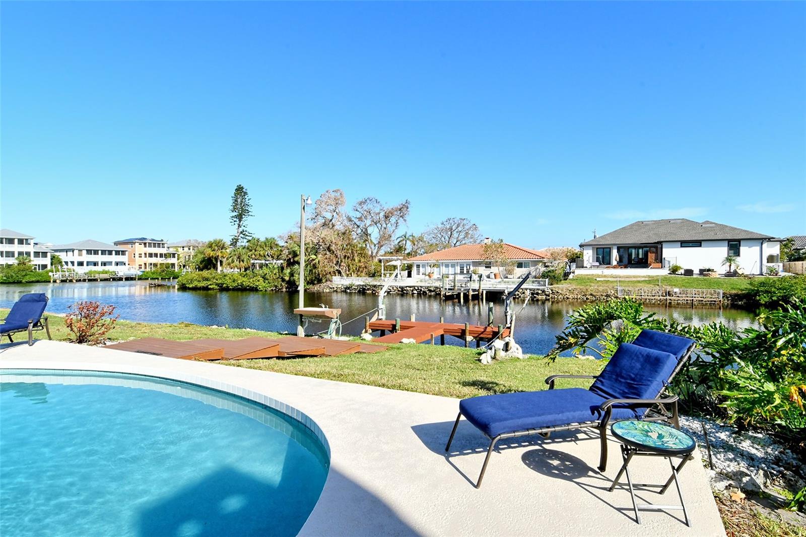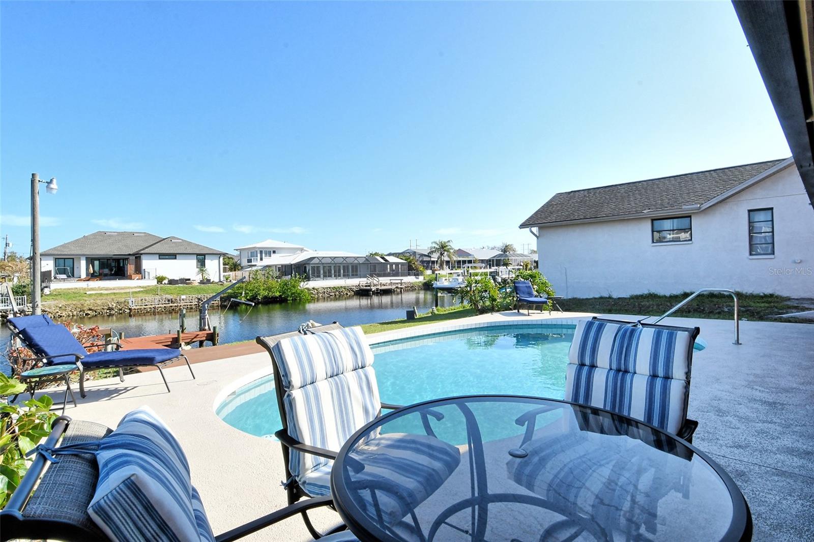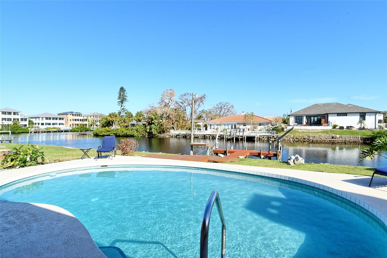 HUGE price reduction. Seller says…SELL!! Buyer’s choice – FURNISHED or UNFURNISHED. HIGH AND DRY…NO WATER DAMAGE!! This lovely home lives much larger than its size. As you enter from the front door you are greeted with the stunning open views of the pool, backyard, dock and canal. The home’s aura is one of calm, peacefulness and vacation all inclusive. It is a true split plan - two bedrooms and 2 baths on either side of the home along with a family room, dining room, kitchen and breakfast area. Need an office?? Make one of the TWO dining areas an office! The roof was completely replaced in June 2024 and has a transferable warranty. Other recent updates include both bathrooms, refrigerator, washer and dryer, sofa, garage door, pool heater and the septic system was cleaned in 2024. All that is left is for the new owner to move in, relax and enjoy this bit of paradise!