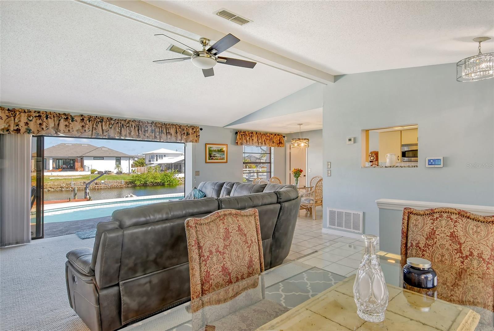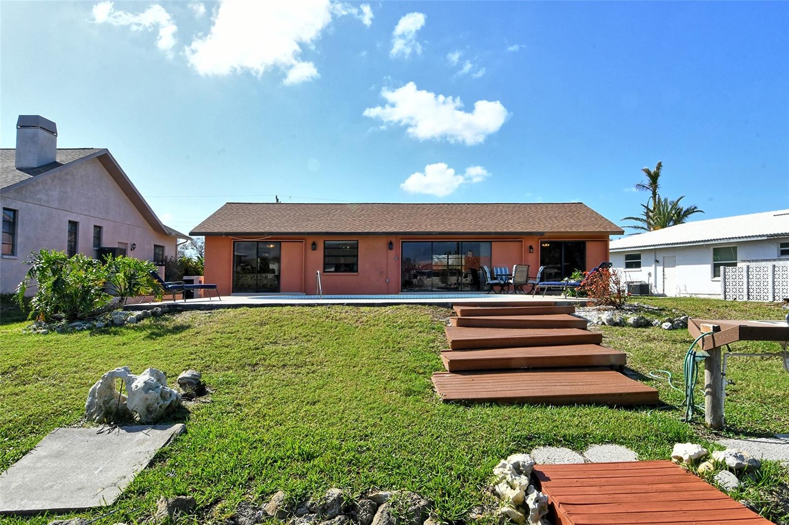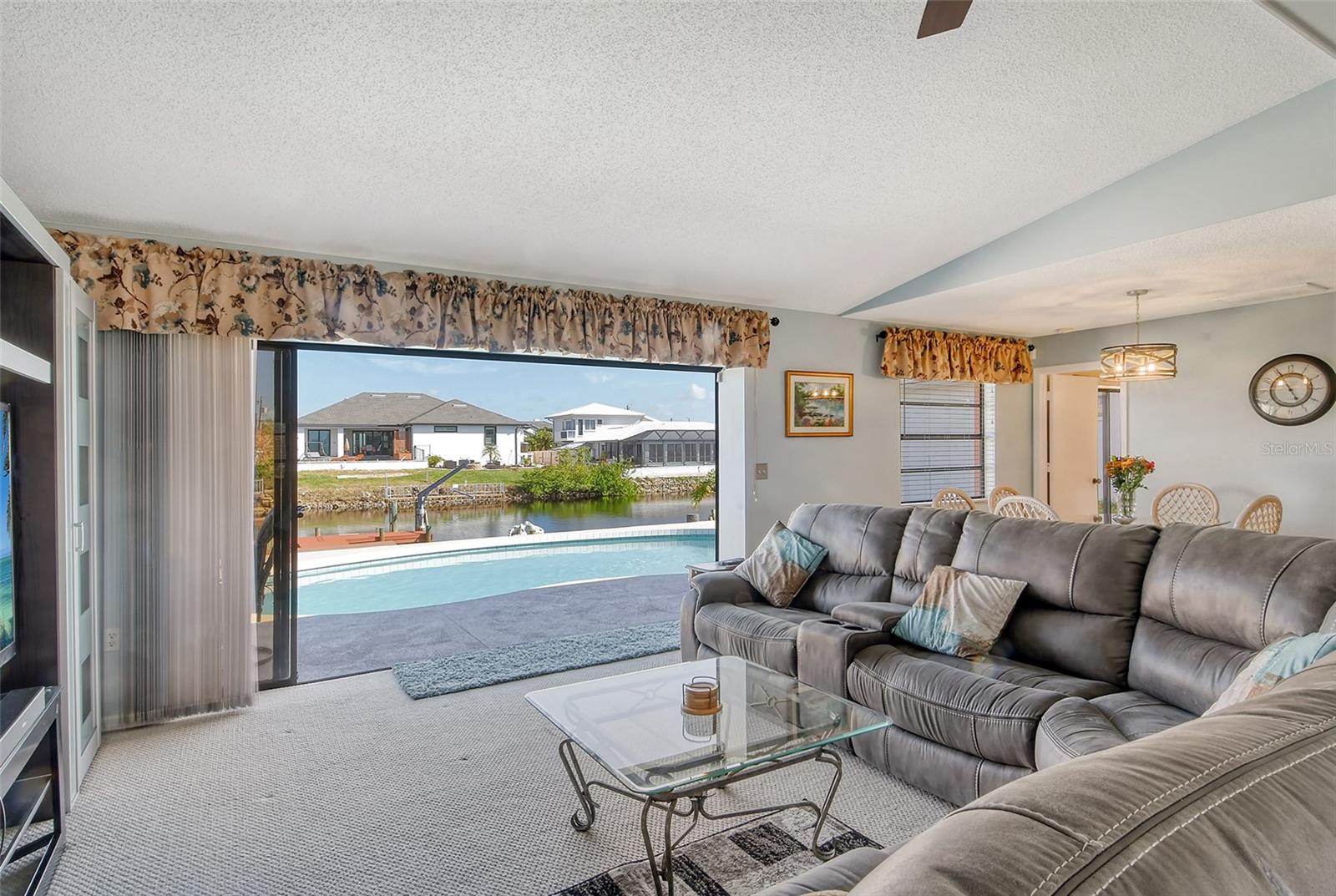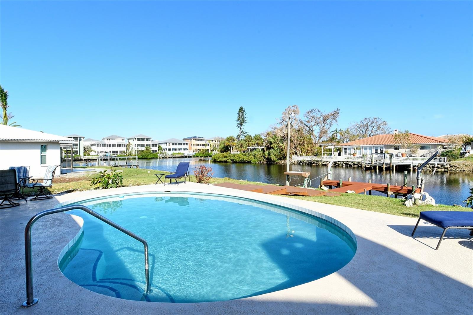 HUGE price reduction. Seller says…SELL!! Buyer’s choice – FURNISHED or UNFURNISHED. HIGH AND DRY…NO WATER DAMAGE!! This lovely home lives much larger than its size. As you enter from the front door you are greeted with the stunning open views of the pool, backyard, dock and canal. The home’s aura is one of calm, peacefulness and vacation all inclusive. It is a true split plan - two bedrooms and 2 baths on either side of the home along with a family room, dining room, kitchen and breakfast area. Need an office?? Make one of the TWO dining areas an office! The roof was completely replaced in June 2024 and has a transferable warranty. Other recent updates include both bathrooms, refrigerator, washer and dryer, sofa, garage door, pool heater and the septic system was cleaned in 2024. All that is left is for the new owner to move in, relax and enjoy this bit of paradise!