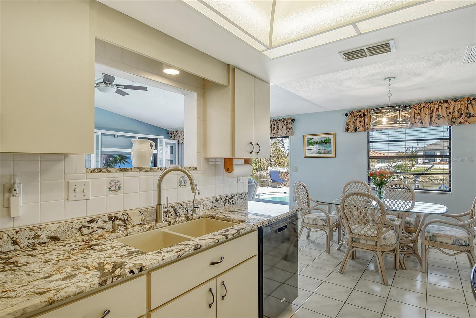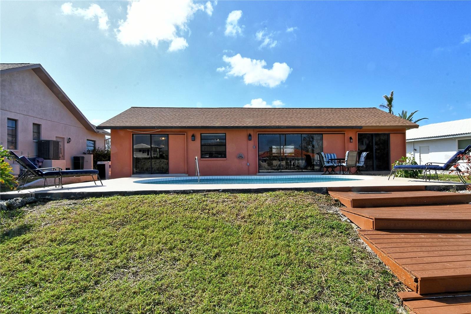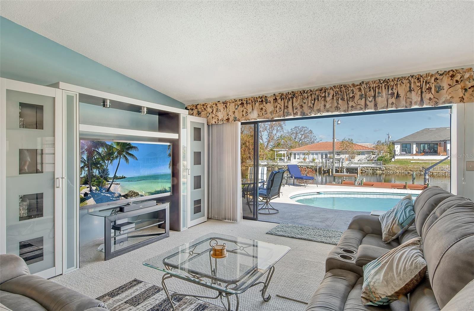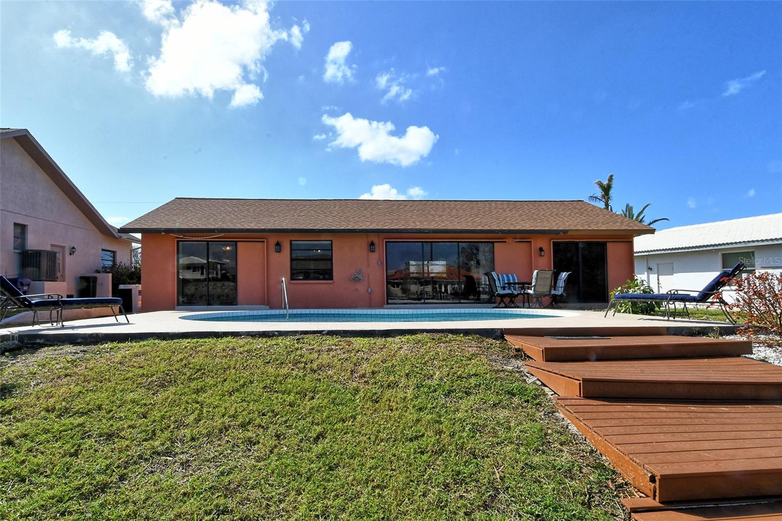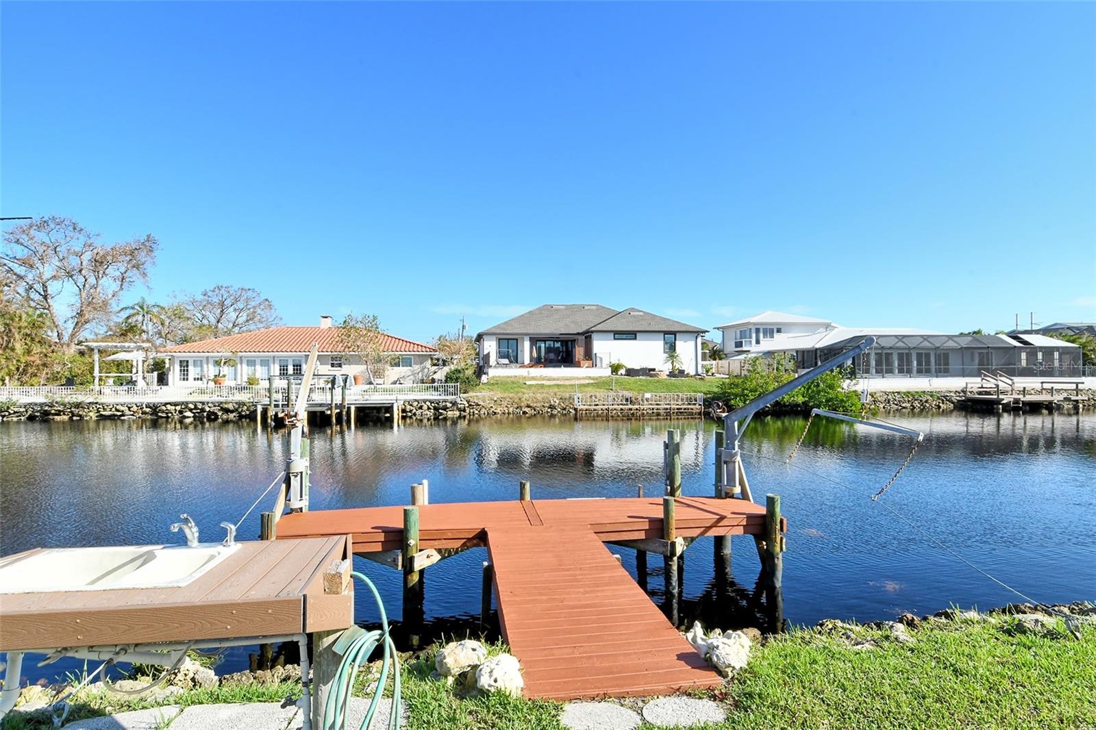 HUGE price reduction. Seller says…SELL!! Buyer’s choice – FURNISHED or UNFURNISHED. HIGH AND DRY…NO WATER DAMAGE!! This lovely home lives much larger than its size. As you enter from the front door you are greeted with the stunning open views of the pool, backyard, dock and canal. The home’s aura is one of calm, peacefulness and vacation all inclusive. It is a true split plan - two bedrooms and 2 baths on either side of the home along with a family room, dining room, kitchen and breakfast area. Need an office?? Make one of the TWO dining areas an office! The roof was completely replaced in June 2024 and has a transferable warranty. Other recent updates include both bathrooms, refrigerator, washer and dryer, sofa, garage door, pool heater and the septic system was cleaned in 2024. All that is left is for the new owner to move in, relax and enjoy this bit of paradise!