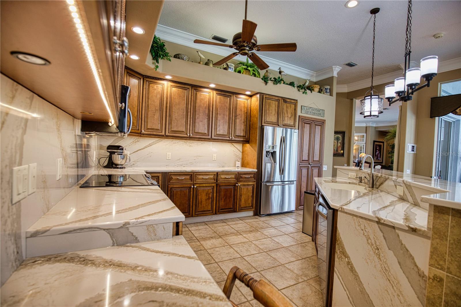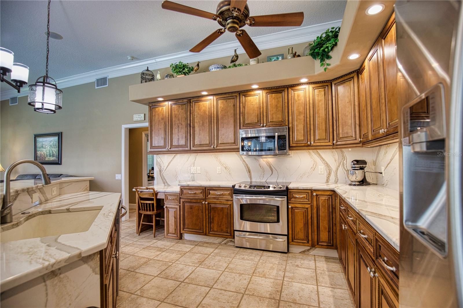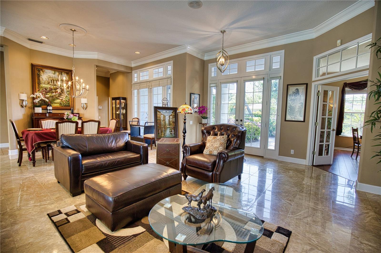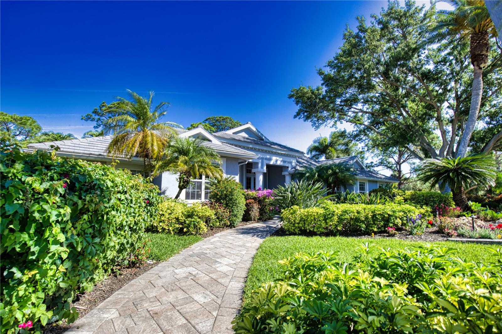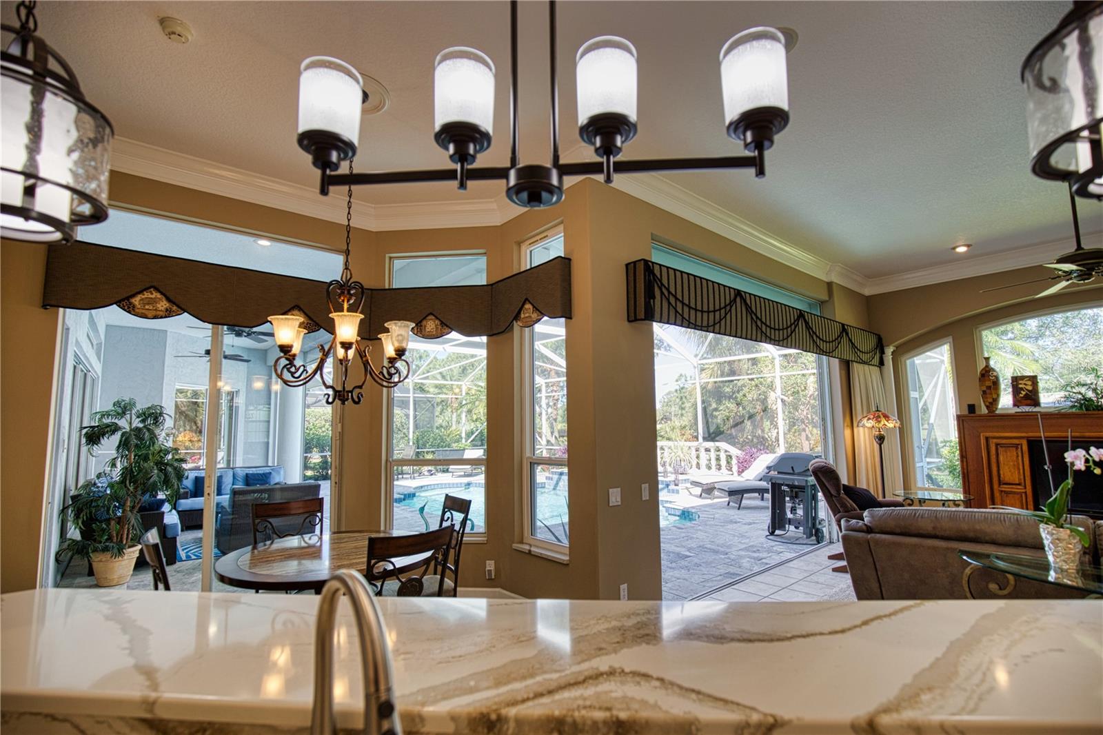 LOOK NO FURTHER FOR THE PERFECTLY UPDATED HOME IN CALUSA LAKES! Located in Flood Zone X, no historical flooding to this property has occurred. Meticulously updated former Nisley model has an open floor concept, private setting and is great for entertaining. 3 BR/2.5 BA, plus a library/den with closet could be 4th bedroom. Office/exercise room could be converted back to a 3rd stall garage. 12' high ceilings with crown molding, Italian marble floors, warm kitchen with expansive quartz countertops and backsplash, numerous soft-close cabinets/drawers and a closet pantry. Spacious owners suite with large walk-in closets, and updated ensuite bathroom/spa. Bedrooms 2 & 3 with a separate full bathroom in their wing. Hurricane impact windows are mostly throughout and motorized shutters in the pool/patio area. 2 zone HVAC heating/cooling replaced 2024 and AC mini spit replaced in 2025. This gated community offers mature landscaping, large lots, golf, and tennis. Easy access and drive to I-75 as well as SMH Venice on Laurel Rd. Only two traffic lights to Nokomis Beach and an easy ride to the Legacy Trail. Come see this jewel of a home in Calusa Lakes! Note: Sellers are licensed REALTORS. Note: the home has audio/video security throughout the property.