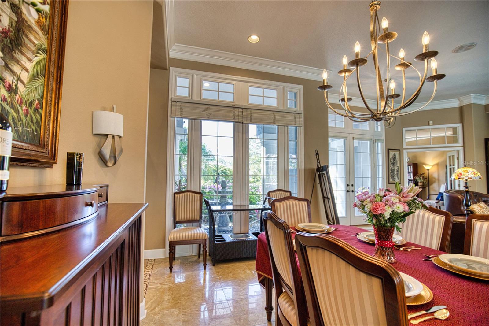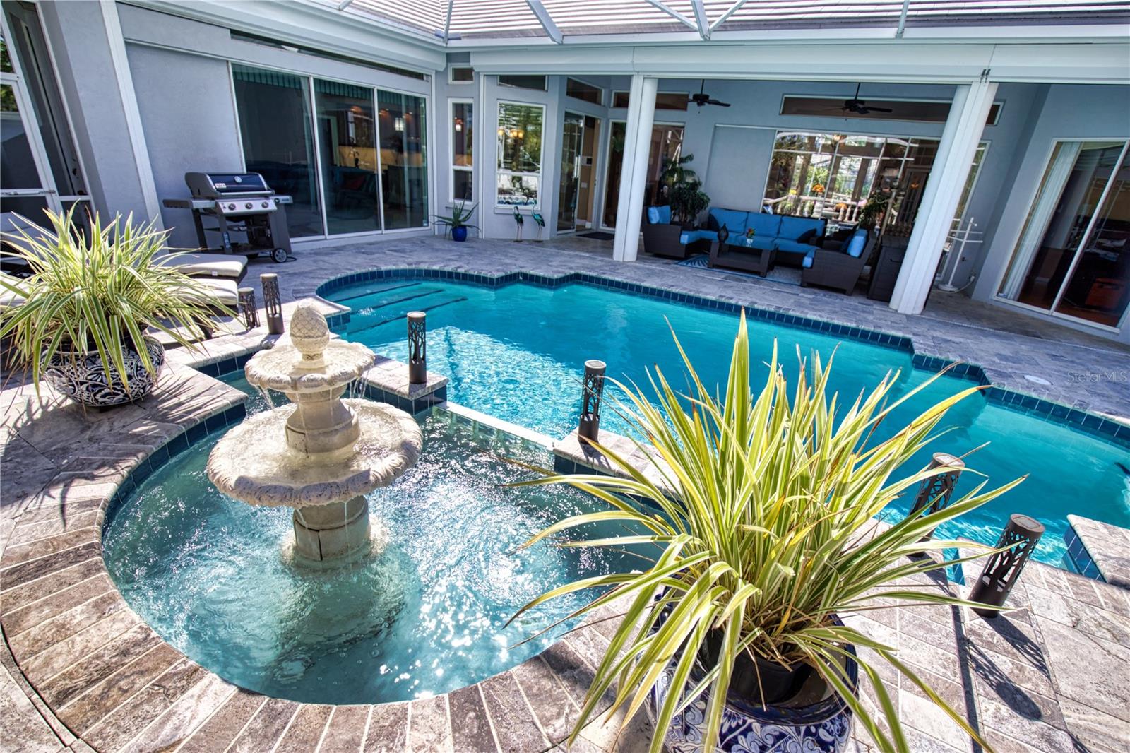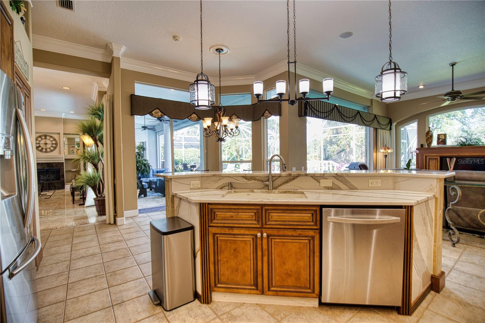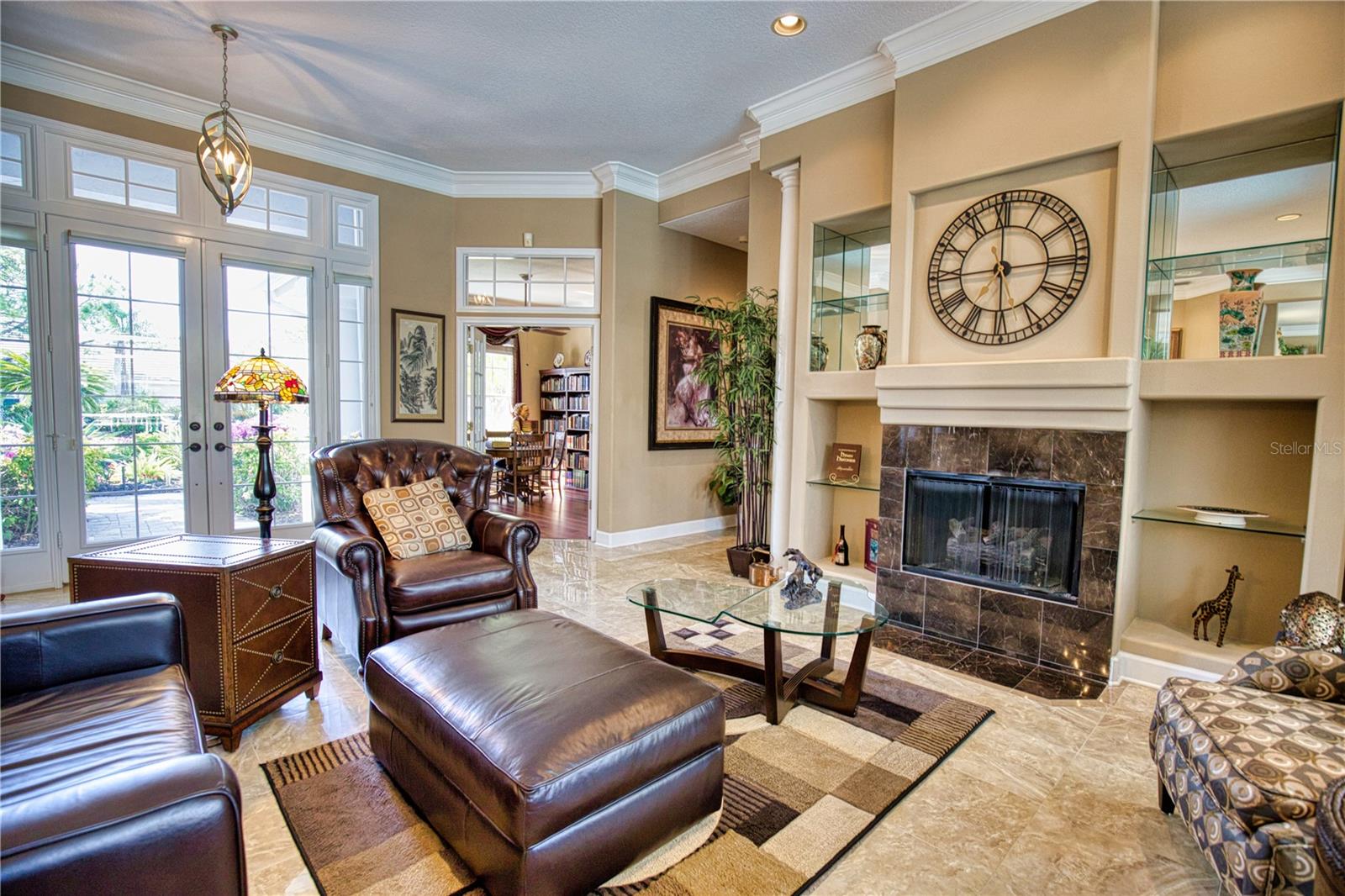 LOOK NO FURTHER FOR THE PERFECTLY UPDATED HOME IN CALUSA LAKES! Located in Flood Zone X, no historical flooding to this property has occurred. Meticulously updated former Nisley model has an open floor concept, private setting and is great for entertaining. 3 BR/2.5 BA, plus a library/den with closet could be 4th bedroom. Office/exercise room could be converted back to a 3rd stall garage. 12' high ceilings with crown molding, Italian marble floors, warm kitchen with expansive quartz countertops and backsplash, numerous soft-close cabinets/drawers and a closet pantry. Spacious owners suite with large walk-in closets, and updated ensuite bathroom/spa. Bedrooms 2 & 3 with a separate full bathroom in their wing. Hurricane impact windows are mostly throughout and motorized shutters in the pool/patio area. 2 zone HVAC heating/cooling replaced 2024 and AC mini spit replaced in 2025. This gated community offers mature landscaping, large lots, golf, and tennis. Easy access and drive to I-75 as well as SMH Venice on Laurel Rd. Only two traffic lights to Nokomis Beach and an easy ride to the Legacy Trail. Come see this jewel of a home in Calusa Lakes! Note: Sellers are licensed REALTORS. Note: the home has audio/video security throughout the property.