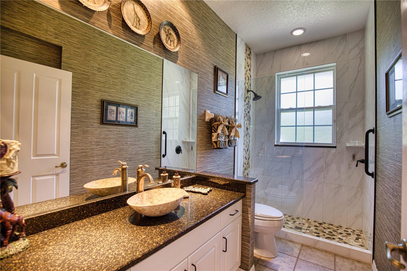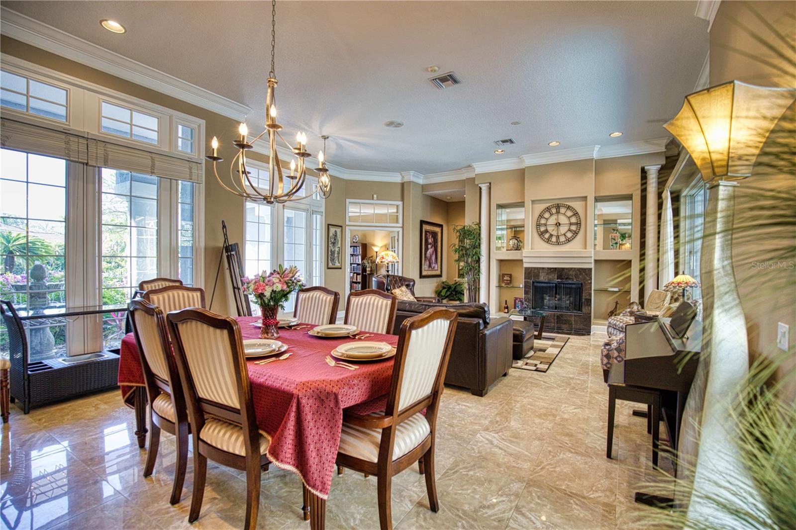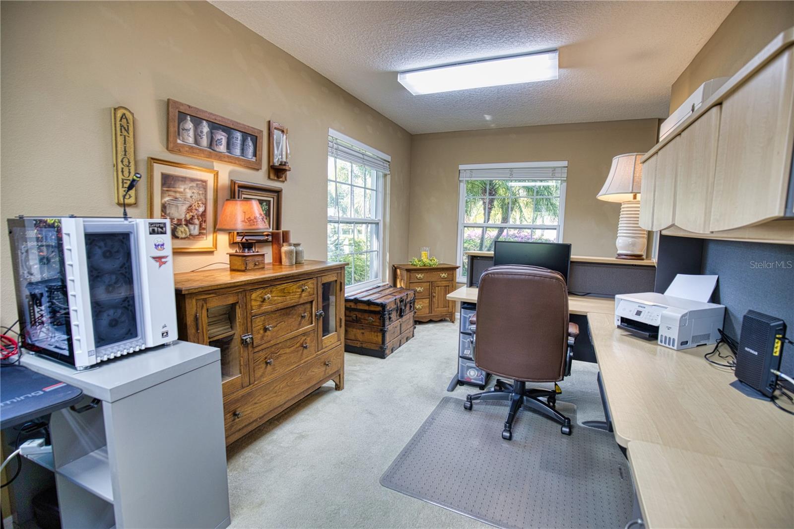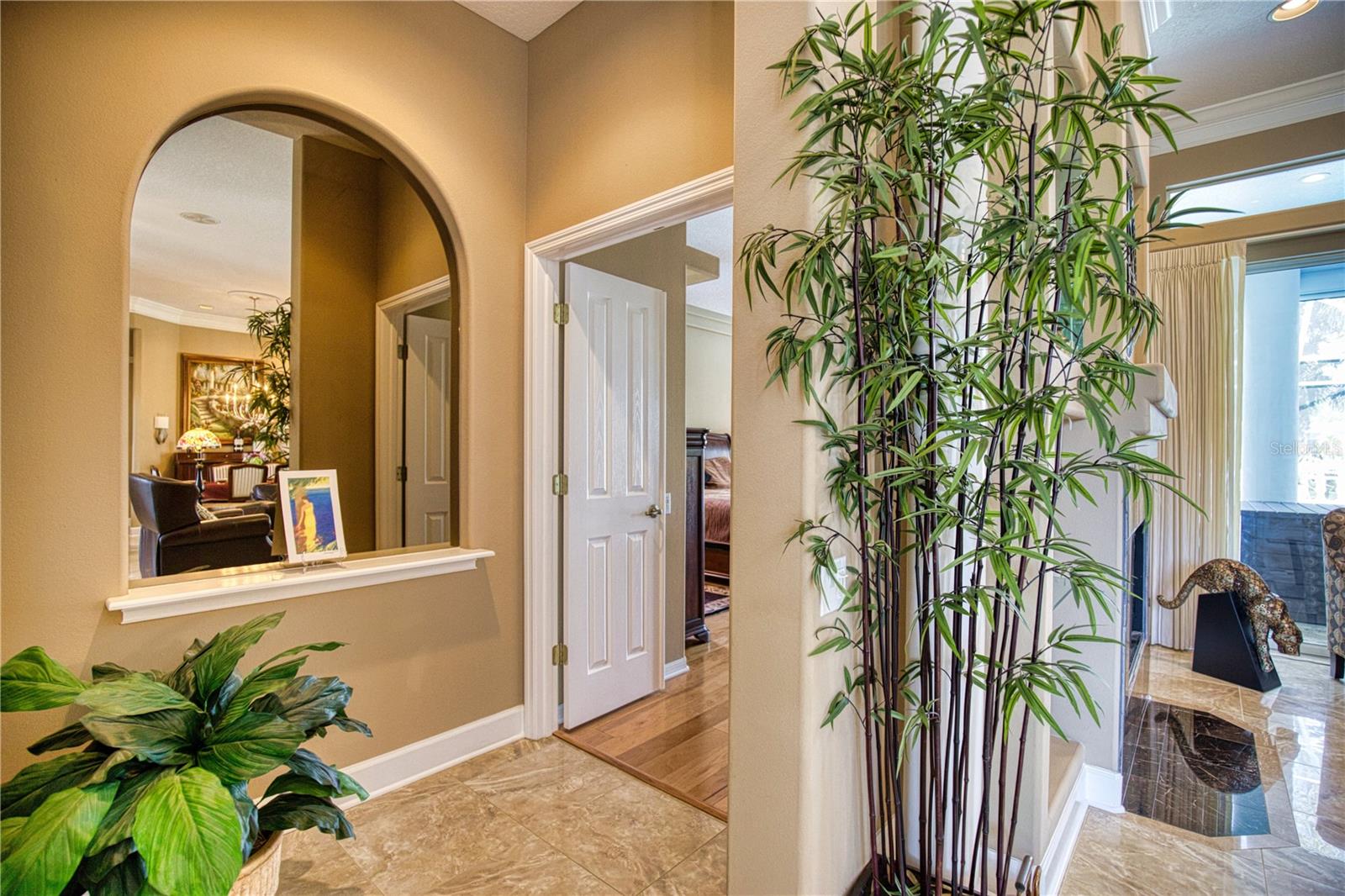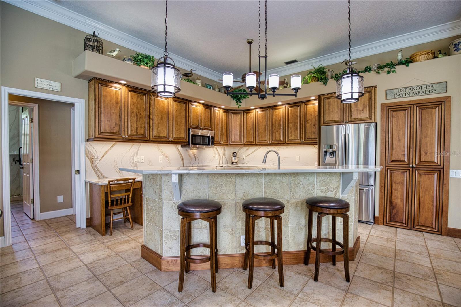 LOOK NO FURTHER FOR THE PERFECTLY UPDATED HOME IN CALUSA LAKES! Located in Flood Zone X, no historical flooding to this property has occurred. Meticulously updated former Nisley model has an open floor concept, private setting and is great for entertaining. 3 BR/2.5 BA, plus a library/den with closet could be 4th bedroom. Office/exercise room could be converted back to a 3rd stall garage. 12' high ceilings with crown molding, Italian marble floors, warm kitchen with expansive quartz countertops and backsplash, numerous soft-close cabinets/drawers and a closet pantry. Spacious owners suite with large walk-in closets, and updated ensuite bathroom/spa. Bedrooms 2 & 3 with a separate full bathroom in their wing. Hurricane impact windows are mostly throughout and motorized shutters in the pool/patio area. 2 zone HVAC heating/cooling replaced 2024 and AC mini spit replaced in 2025. This gated community offers mature landscaping, large lots, golf, and tennis. Easy access and drive to I-75 as well as SMH Venice on Laurel Rd. Only two traffic lights to Nokomis Beach and an easy ride to the Legacy Trail. Come see this jewel of a home in Calusa Lakes! Note: Sellers are licensed REALTORS. Note: the home has audio/video security throughout the property.