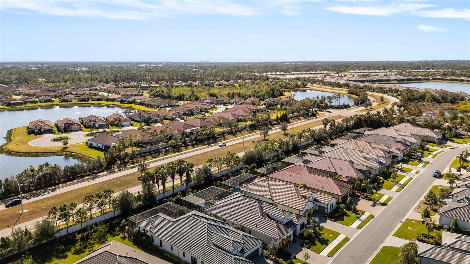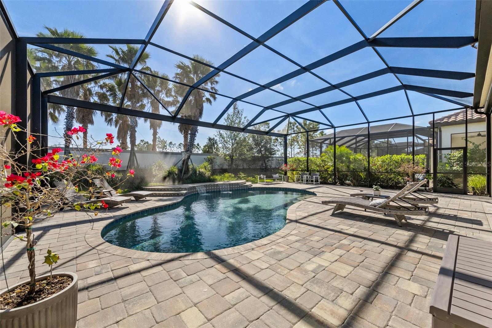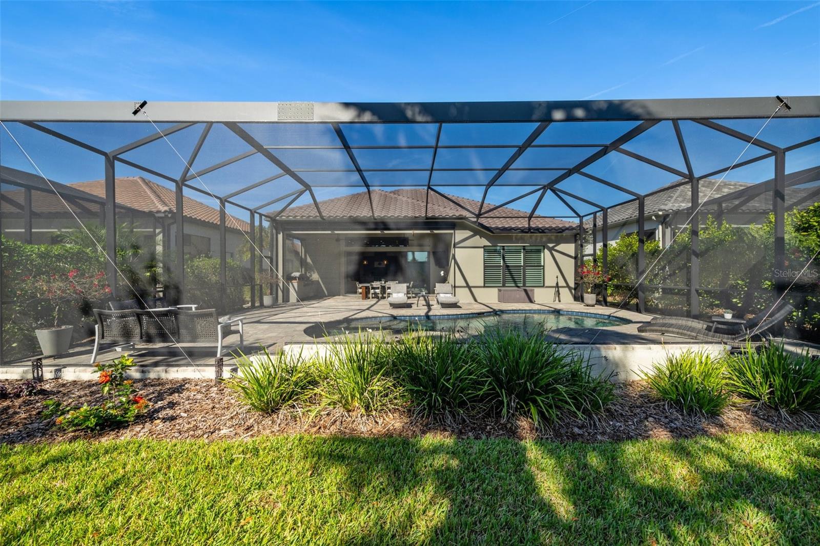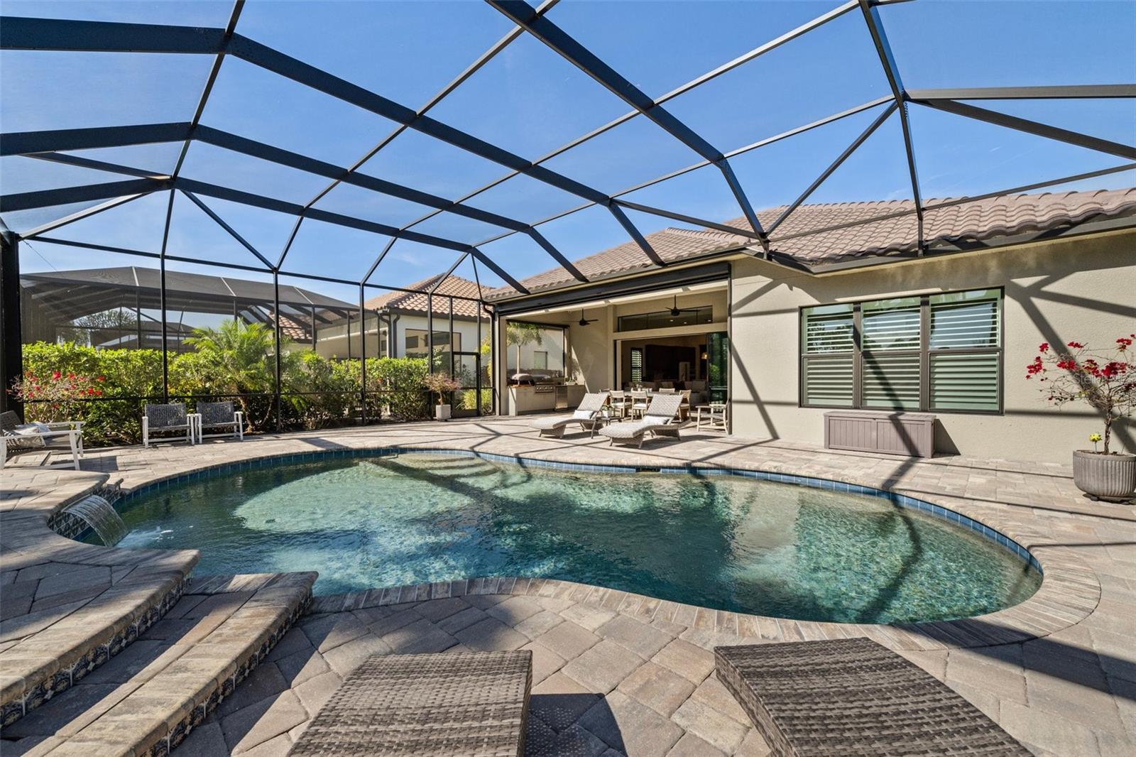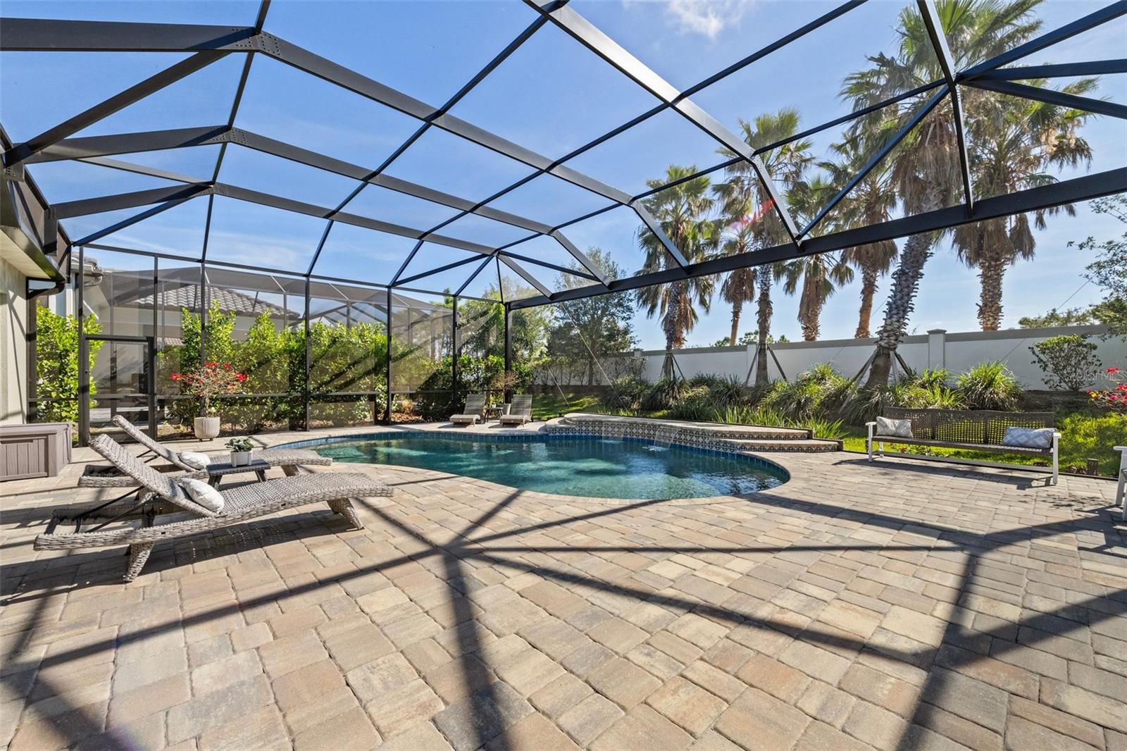Luxurious Living at Its Finest – come see this Veneto Model by Aria Signature Homes, where elegance and comfort harmoniously combine to create the perfect sanctuary. This beautifully designed 3-bedroom, 3-bathroom residence, featuring a versatile flex room and a spacious 2-car garage, spans 2,647 square feet of meticulously crafted living space. From the moment you step through the grand double door entry, the warm and inviting ambiance draws you in. Stunning Shaw wood flooring in majestic pecan runs throughout, complemented by custom wide crown and base moldings. The 14-foot ceiling in the great room, along with tray ceilings in key areas, enhances the sense of openness and sophistication. The gourmet kitchen is a culinary dream. Outfitted with GE Café white matte stainless steel appliances, including a 6-burner commercial oven with a matching hood, this space is designed for both style and functionality. City Oak wood cabinets with soft-close drawers and roll-out shelves provide ample storage, while the quartz kitchen island in Valente pearl, Level 6 stone backsplash, and Kohler Neoroc taupe sink add a luxurious touch. A butler’s pantry, wine cooler, and brushed brass hardware complete the space, ensuring it meets every need. The master suite is a private retreat with designer carpeting and a spa-inspired ensuite bath. This tranquil space features an oversized glass walk-in shower with a built-in bench and niche, double sinks with Moen Deco faucets, and built-in linen storage. Two additional bedrooms also feature designer carpeting and are served by two beautifully appointed guest bathrooms with upgraded mosaic finishes. The home effortlessly blends indoor and outdoor living. Triple-wide glass sliders in the living room open to an oversized clear view screened lanai framed by a bronze cage, offering stunning views of a tropical garden with eight large palms. The lanai features an electric privacy screen and houses a saltwater pool with two waterfalls. A built-in outdoor kitchen with granite countertops, an Artisan grill, a gas-powered pizza oven, and a stainless steel refrigerator elevates entertaining to an art form. Modern living is enhanced by the ClareVue Smart Home system with automation, alarm features, and outdoor cameras, as well as a Sonos sound system with built-in speakers and subwoofers for seamless indoor and outdoor audio. Plantation shutters add timeless style and privacy throughout the home. Located in the exclusive Aria community, this home offers more than just a place to live. Aria is a luxury enclave by Neal Communities featuring a state-of-the-art fitness center, an active clubhouse, a resort-style pool and spa, and pickleball courts, all surrounded by beautifully maintained green spaces. This home is a rare gem, offering a lifestyle of luxury and convenience. Schedule your private showing today and discover why this Veneto model is a must-see.