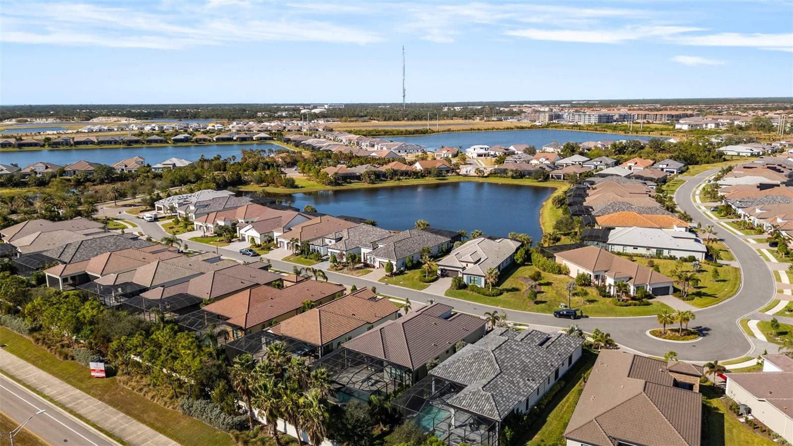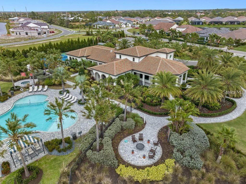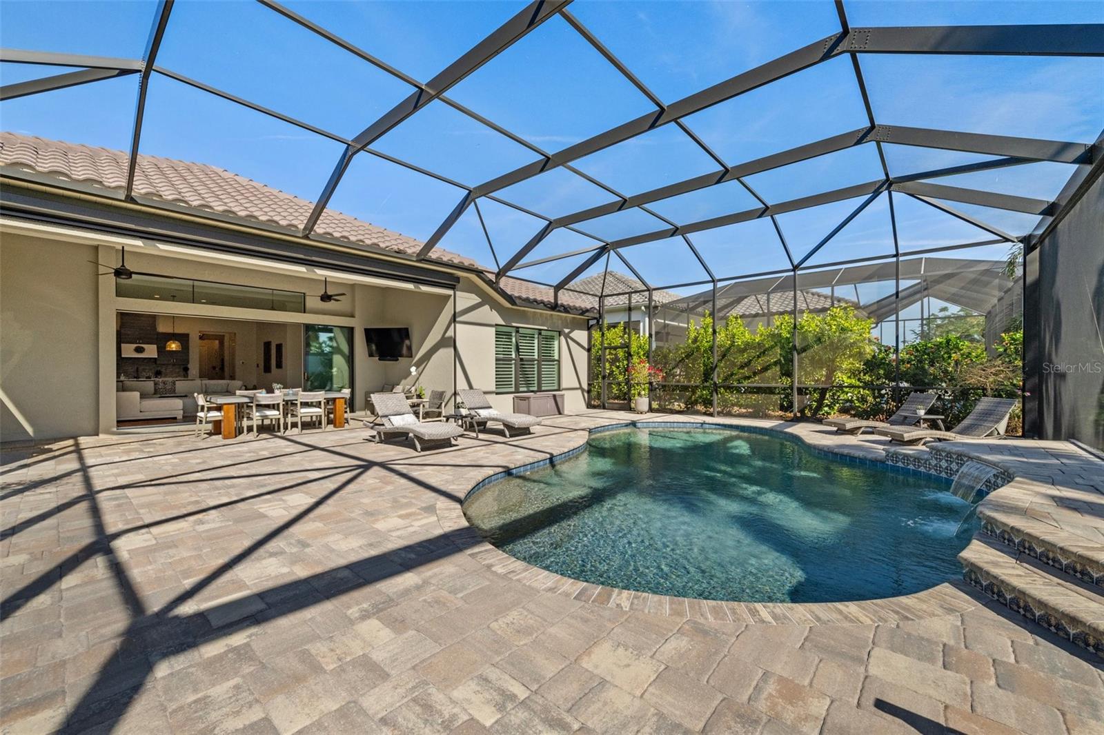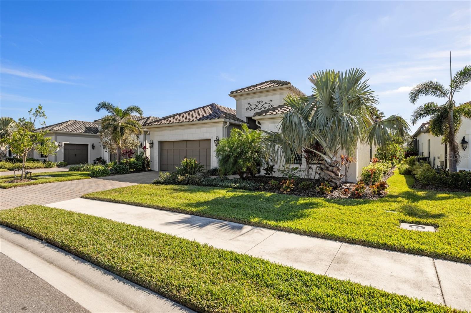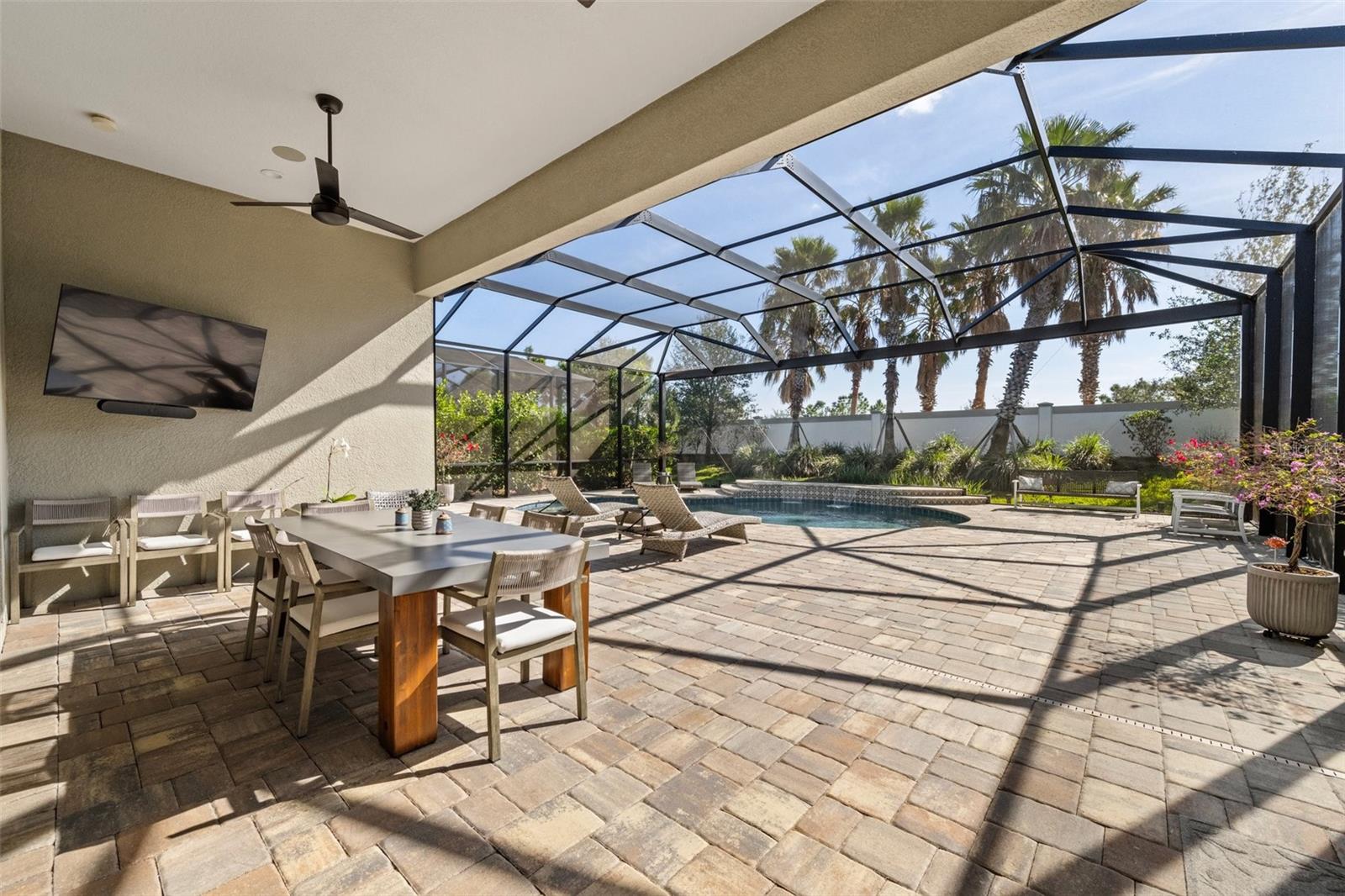 Luxurious Living at Its Finest – come see this Veneto Model by Aria Signature Homes, where elegance and comfort harmoniously combine to create the perfect sanctuary. This beautifully designed 3-bedroom, 3-bathroom residence, featuring a versatile flex room and a spacious 2-car garage, spans 2,647 square feet of meticulously crafted living space. From the moment you step through the grand double door entry, the warm and inviting ambiance draws you in. Stunning Shaw wood flooring in majestic pecan runs throughout, complemented by custom wide crown and base moldings. The 14-foot ceiling in the great room, along with tray ceilings in key areas, enhances the sense of openness and sophistication. The gourmet kitchen is a culinary dream. Outfitted with GE Café white matte stainless steel appliances, including a 6-burner commercial oven with a matching hood, this space is designed for both style and functionality. City Oak wood cabinets with soft-close drawers and roll-out shelves provide ample storage, while the quartz kitchen island in Valente pearl, Level 6 stone backsplash, and Kohler Neoroc taupe sink add a luxurious touch. A butler’s pantry, wine cooler, and brushed brass hardware complete the space, ensuring it meets every need. The master suite is a private retreat with designer carpeting and a spa-inspired ensuite bath. This tranquil space features an oversized glass walk-in shower with a built-in bench and niche, double sinks with Moen Deco faucets, and built-in linen storage. Two additional bedrooms also feature designer carpeting and are served by two beautifully appointed guest bathrooms with upgraded mosaic finishes. The home effortlessly blends indoor and outdoor living. Triple-wide glass sliders in the living room open to an oversized clear view screened lanai framed by a bronze cage, offering stunning views of a tropical garden with eight large palms. The lanai features an electric privacy screen and houses a saltwater pool with two waterfalls. A built-in outdoor kitchen with granite countertops, an Artisan grill, a gas-powered pizza oven, and a stainless steel refrigerator elevates entertaining to an art form. Modern living is enhanced by the ClareVue Smart Home system with automation, alarm features, and outdoor cameras, as well as a Sonos sound system with built-in speakers and subwoofers for seamless indoor and outdoor audio. Plantation shutters add timeless style and privacy throughout the home. Located in the exclusive Aria community, this home offers more than just a place to live. Aria is a luxury enclave by Neal Communities featuring a state-of-the-art fitness center, an active clubhouse, a resort-style pool and spa, and pickleball courts, all surrounded by beautifully maintained green spaces. This home is a rare gem, offering a lifestyle of luxury and convenience. Schedule your private showing today and discover why this Veneto model is a must-see.