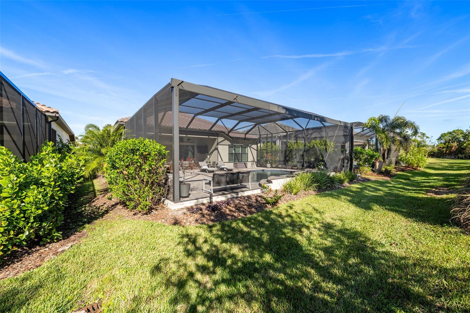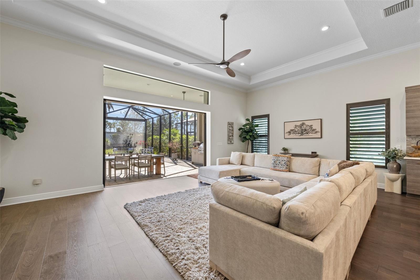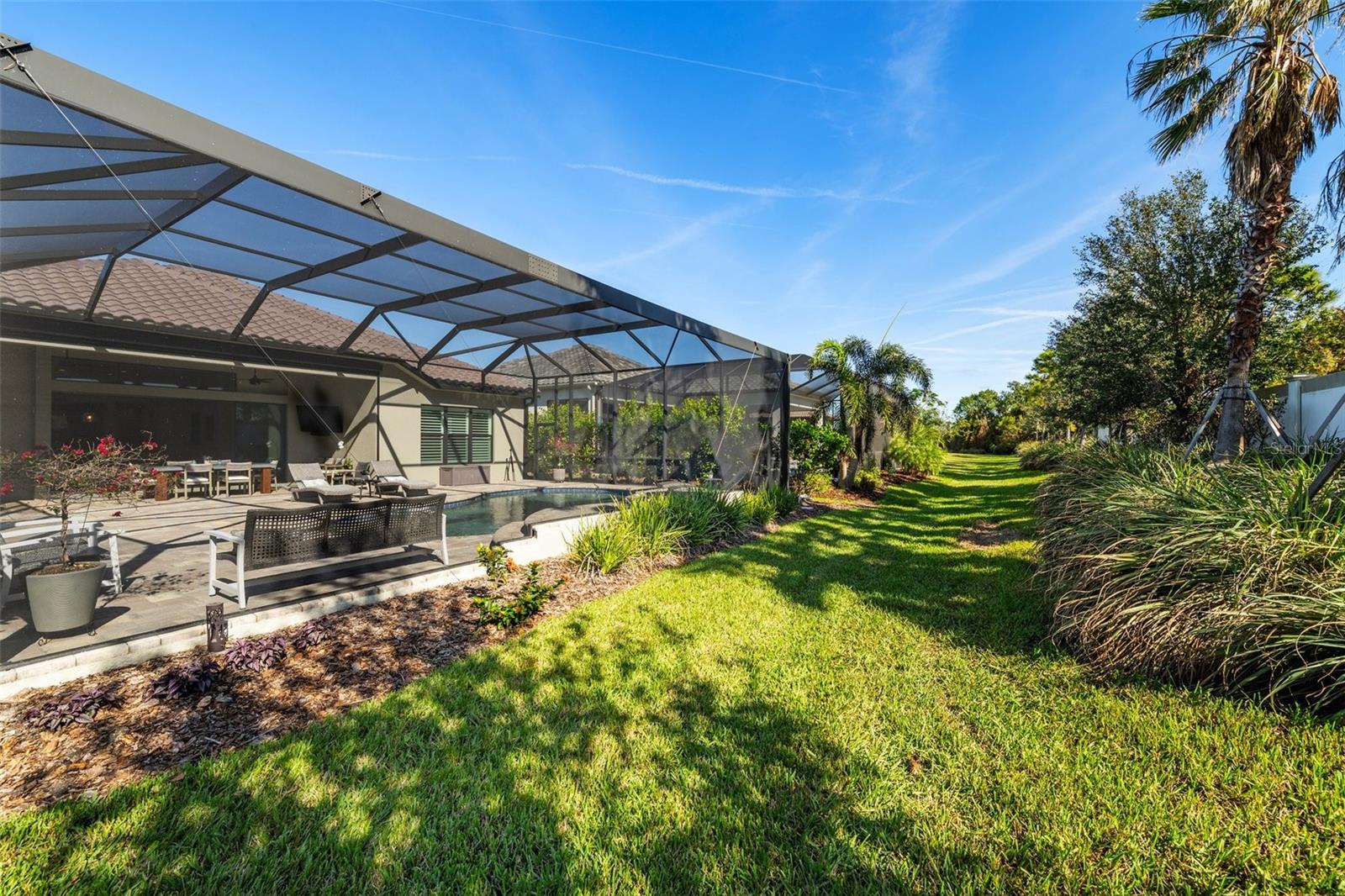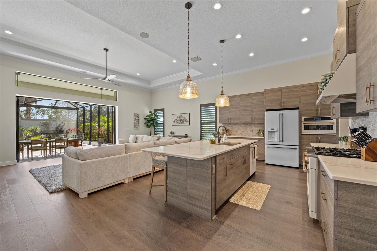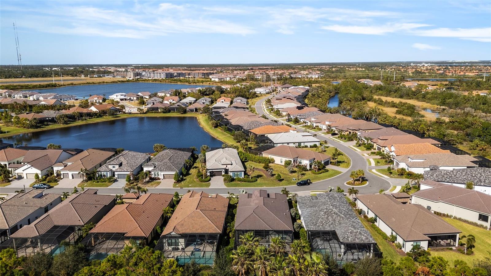 Luxurious Living at Its Finest – come see this Veneto Model by Aria Signature Homes, where elegance and comfort harmoniously combine to create the perfect sanctuary. This beautifully designed 3-bedroom, 3-bathroom residence, featuring a versatile flex room and a spacious 2-car garage, spans 2,647 square feet of meticulously crafted living space. From the moment you step through the grand double door entry, the warm and inviting ambiance draws you in. Stunning Shaw wood flooring in majestic pecan runs throughout, complemented by custom wide crown and base moldings. The 14-foot ceiling in the great room, along with tray ceilings in key areas, enhances the sense of openness and sophistication. The gourmet kitchen is a culinary dream. Outfitted with GE Café white matte stainless steel appliances, including a 6-burner commercial oven with a matching hood, this space is designed for both style and functionality. City Oak wood cabinets with soft-close drawers and roll-out shelves provide ample storage, while the quartz kitchen island in Valente pearl, Level 6 stone backsplash, and Kohler Neoroc taupe sink add a luxurious touch. A butler’s pantry, wine cooler, and brushed brass hardware complete the space, ensuring it meets every need. The master suite is a private retreat with designer carpeting and a spa-inspired ensuite bath. This tranquil space features an oversized glass walk-in shower with a built-in bench and niche, double sinks with Moen Deco faucets, and built-in linen storage. Two additional bedrooms also feature designer carpeting and are served by two beautifully appointed guest bathrooms with upgraded mosaic finishes. The home effortlessly blends indoor and outdoor living. Triple-wide glass sliders in the living room open to an oversized clear view screened lanai framed by a bronze cage, offering stunning views of a tropical garden with eight large palms. The lanai features an electric privacy screen and houses a saltwater pool with two waterfalls. A built-in outdoor kitchen with granite countertops, an Artisan grill, a gas-powered pizza oven, and a stainless steel refrigerator elevates entertaining to an art form. Modern living is enhanced by the ClareVue Smart Home system with automation, alarm features, and outdoor cameras, as well as a Sonos sound system with built-in speakers and subwoofers for seamless indoor and outdoor audio. Plantation shutters add timeless style and privacy throughout the home. Located in the exclusive Aria community, this home offers more than just a place to live. Aria is a luxury enclave by Neal Communities featuring a state-of-the-art fitness center, an active clubhouse, a resort-style pool and spa, and pickleball courts, all surrounded by beautifully maintained green spaces. This home is a rare gem, offering a lifestyle of luxury and convenience. Schedule your private showing today and discover why this Veneto model is a must-see.