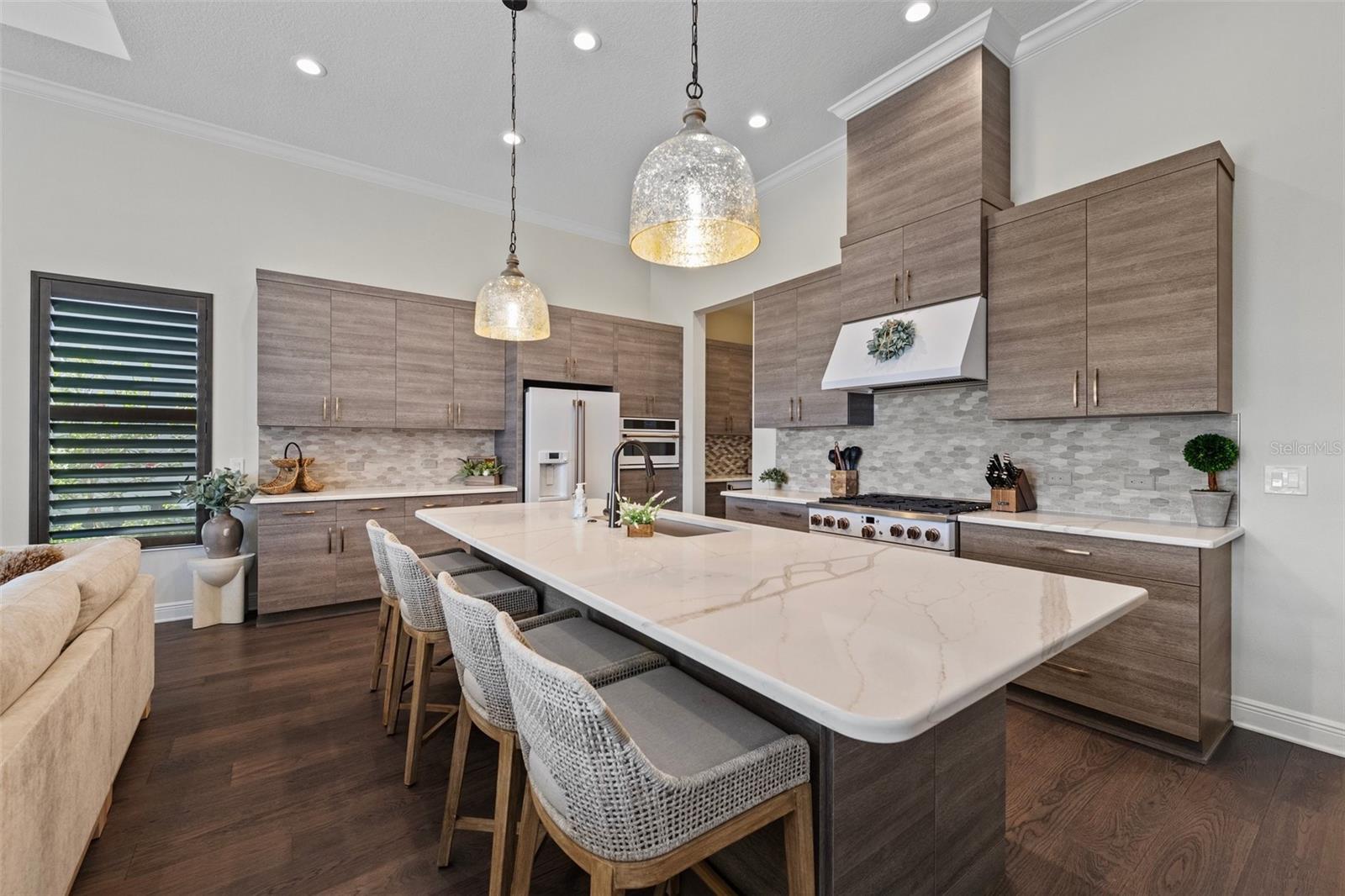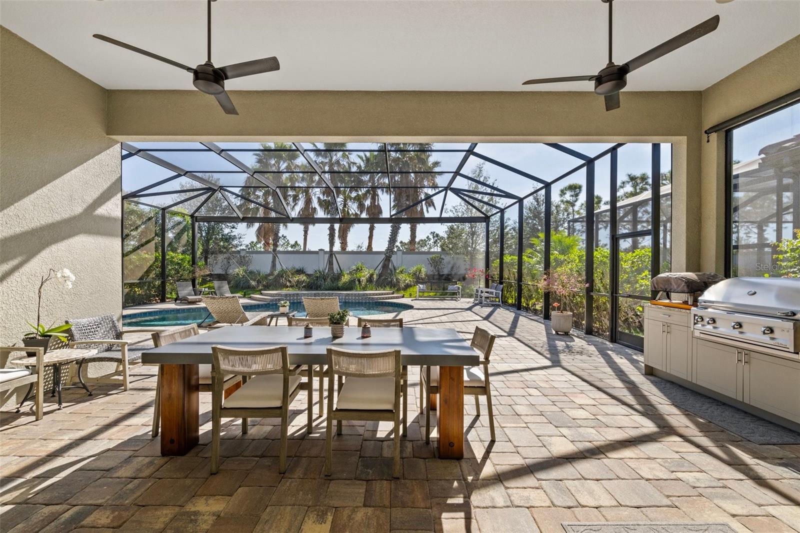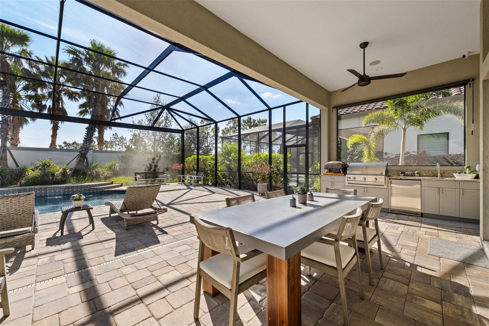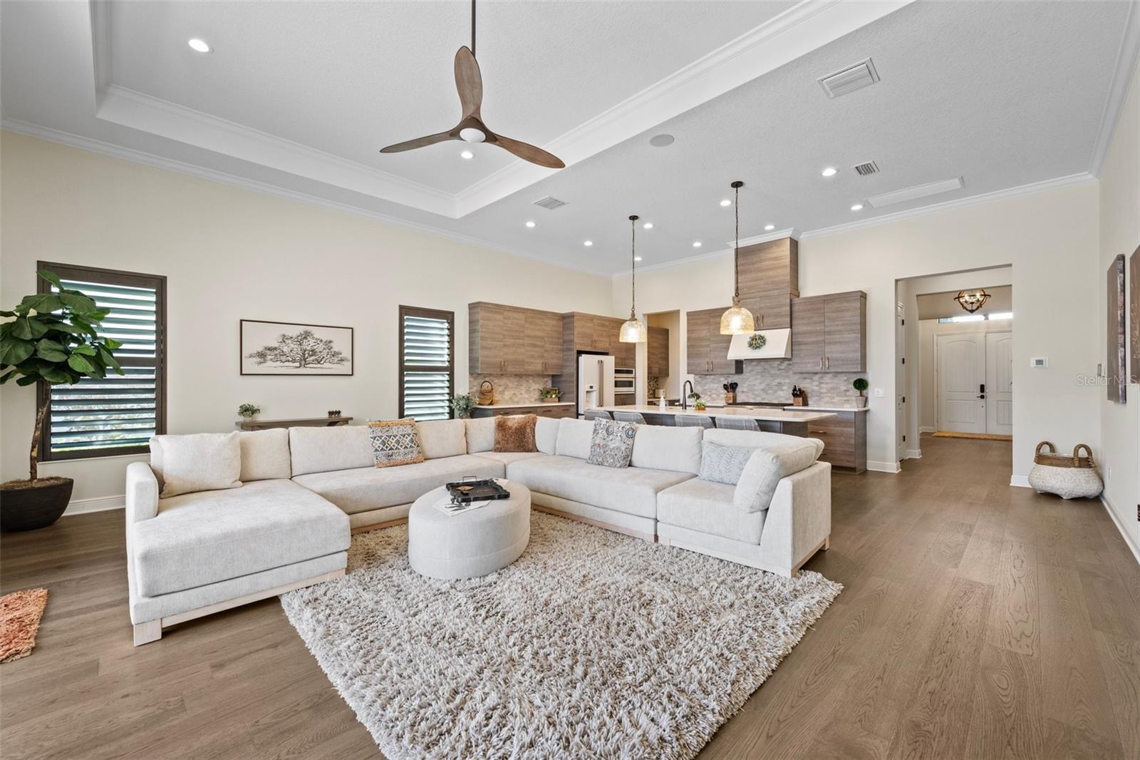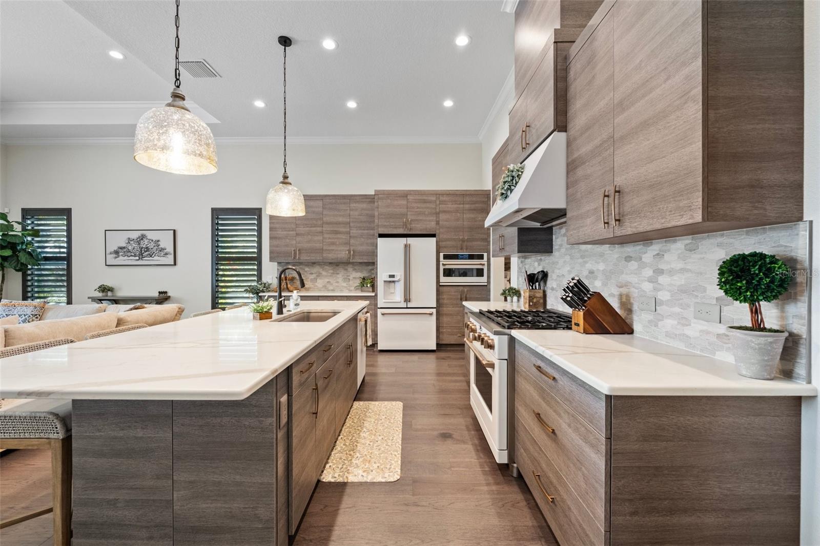 Luxurious Living at Its Finest – come see this Veneto Model by Aria Signature Homes, where elegance and comfort harmoniously combine to create the perfect sanctuary. This beautifully designed 3-bedroom, 3-bathroom residence, featuring a versatile flex room and a spacious 2-car garage, spans 2,647 square feet of meticulously crafted living space. From the moment you step through the grand double door entry, the warm and inviting ambiance draws you in. Stunning Shaw wood flooring in majestic pecan runs throughout, complemented by custom wide crown and base moldings. The 14-foot ceiling in the great room, along with tray ceilings in key areas, enhances the sense of openness and sophistication. The gourmet kitchen is a culinary dream. Outfitted with GE Café white matte stainless steel appliances, including a 6-burner commercial oven with a matching hood, this space is designed for both style and functionality. City Oak wood cabinets with soft-close drawers and roll-out shelves provide ample storage, while the quartz kitchen island in Valente pearl, Level 6 stone backsplash, and Kohler Neoroc taupe sink add a luxurious touch. A butler’s pantry, wine cooler, and brushed brass hardware complete the space, ensuring it meets every need. The master suite is a private retreat with designer carpeting and a spa-inspired ensuite bath. This tranquil space features an oversized glass walk-in shower with a built-in bench and niche, double sinks with Moen Deco faucets, and built-in linen storage. Two additional bedrooms also feature designer carpeting and are served by two beautifully appointed guest bathrooms with upgraded mosaic finishes. The home effortlessly blends indoor and outdoor living. Triple-wide glass sliders in the living room open to an oversized clear view screened lanai framed by a bronze cage, offering stunning views of a tropical garden with eight large palms. The lanai features an electric privacy screen and houses a saltwater pool with two waterfalls. A built-in outdoor kitchen with granite countertops, an Artisan grill, a gas-powered pizza oven, and a stainless steel refrigerator elevates entertaining to an art form. Modern living is enhanced by the ClareVue Smart Home system with automation, alarm features, and outdoor cameras, as well as a Sonos sound system with built-in speakers and subwoofers for seamless indoor and outdoor audio. Plantation shutters add timeless style and privacy throughout the home. Located in the exclusive Aria community, this home offers more than just a place to live. Aria is a luxury enclave by Neal Communities featuring a state-of-the-art fitness center, an active clubhouse, a resort-style pool and spa, and pickleball courts, all surrounded by beautifully maintained green spaces. This home is a rare gem, offering a lifestyle of luxury and convenience. Schedule your private showing today and discover why this Veneto model is a must-see.