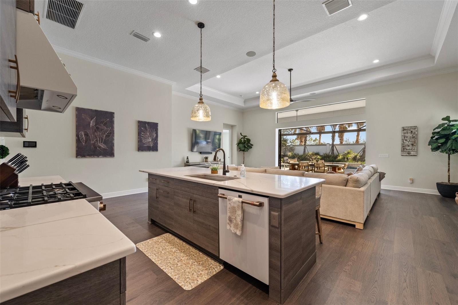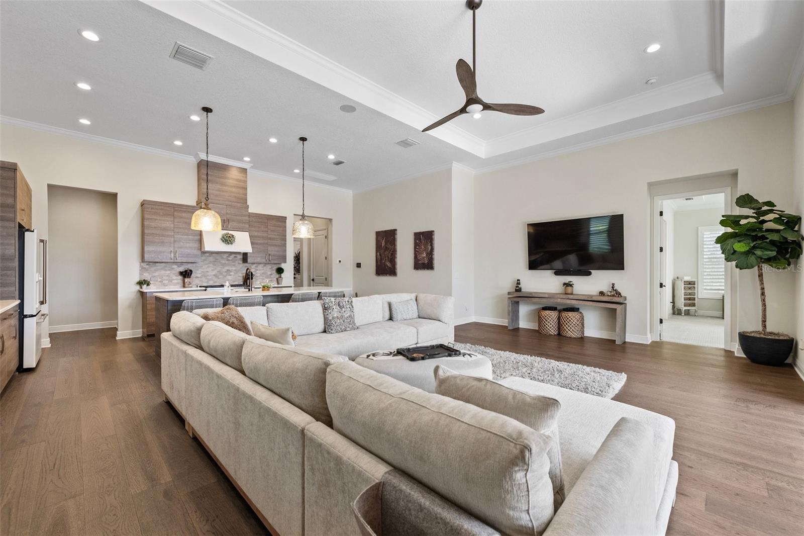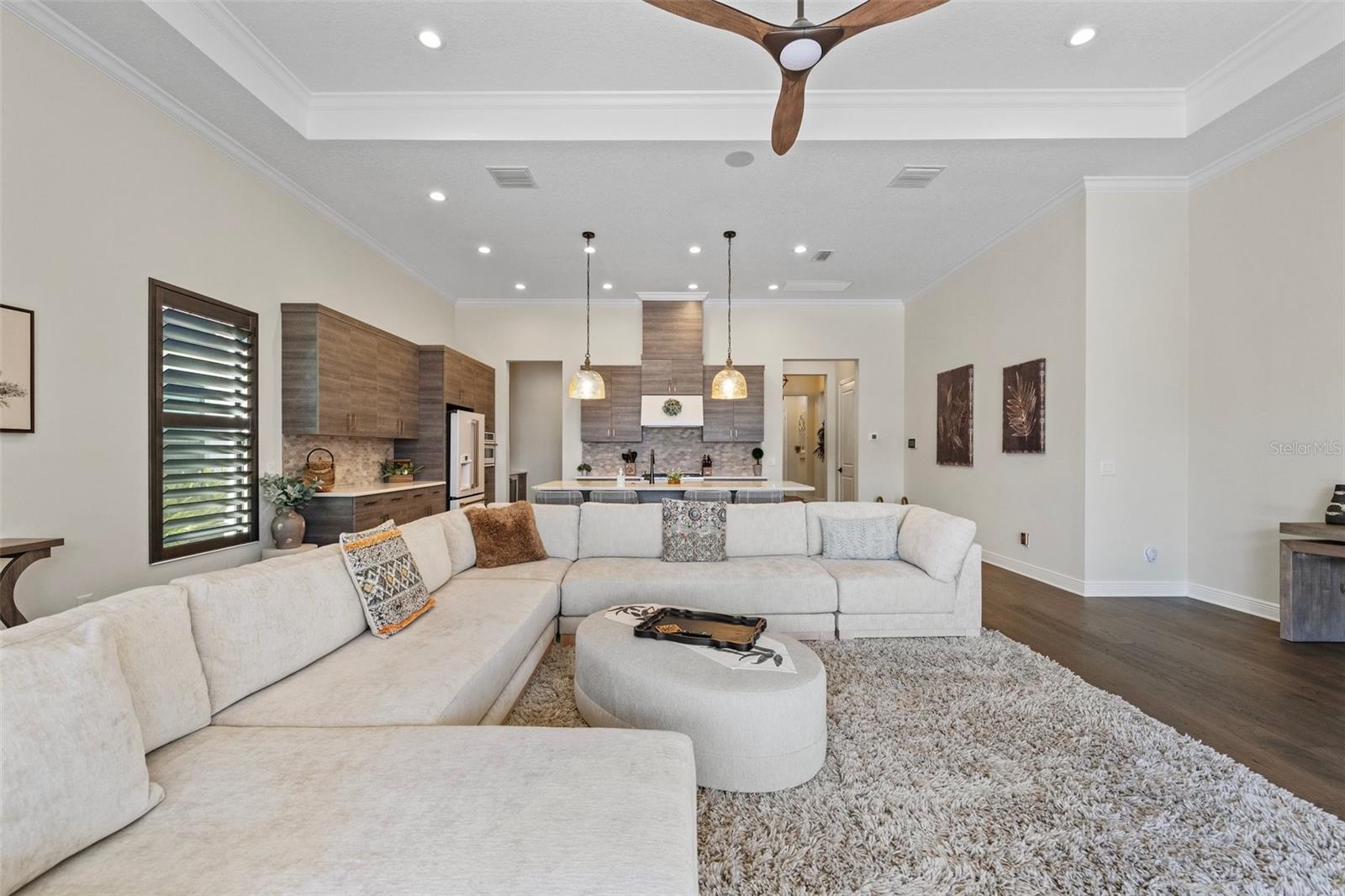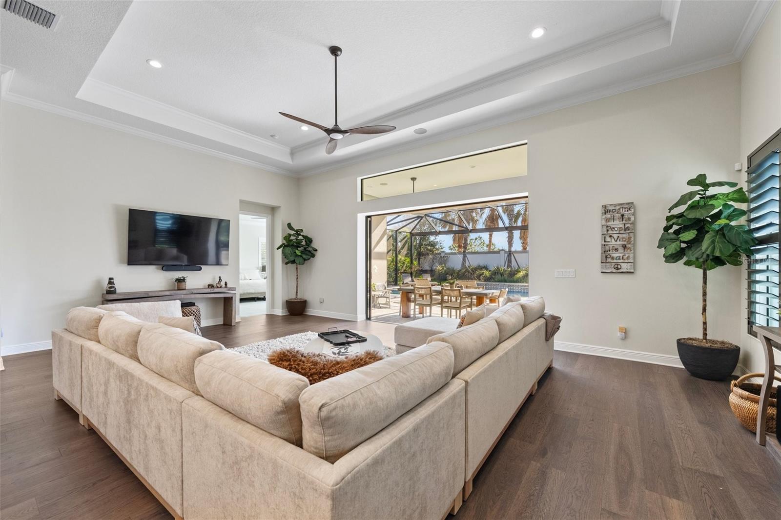 Luxurious Living at Its Finest – come see this Veneto Model by Aria Signature Homes, where elegance and comfort harmoniously combine to create the perfect sanctuary. This beautifully designed 3-bedroom, 3-bathroom residence, featuring a versatile flex room and a spacious 2-car garage, spans 2,647 square feet of meticulously crafted living space. From the moment you step through the grand double door entry, the warm and inviting ambiance draws you in. Stunning Shaw wood flooring in majestic pecan runs throughout, complemented by custom wide crown and base moldings. The 14-foot ceiling in the great room, along with tray ceilings in key areas, enhances the sense of openness and sophistication. The gourmet kitchen is a culinary dream. Outfitted with GE Café white matte stainless steel appliances, including a 6-burner commercial oven with a matching hood, this space is designed for both style and functionality. City Oak wood cabinets with soft-close drawers and roll-out shelves provide ample storage, while the quartz kitchen island in Valente pearl, Level 6 stone backsplash, and Kohler Neoroc taupe sink add a luxurious touch. A butler’s pantry, wine cooler, and brushed brass hardware complete the space, ensuring it meets every need. The master suite is a private retreat with designer carpeting and a spa-inspired ensuite bath. This tranquil space features an oversized glass walk-in shower with a built-in bench and niche, double sinks with Moen Deco faucets, and built-in linen storage. Two additional bedrooms also feature designer carpeting and are served by two beautifully appointed guest bathrooms with upgraded mosaic finishes. The home effortlessly blends indoor and outdoor living. Triple-wide glass sliders in the living room open to an oversized clear view screened lanai framed by a bronze cage, offering stunning views of a tropical garden with eight large palms. The lanai features an electric privacy screen and houses a saltwater pool with two waterfalls. A built-in outdoor kitchen with granite countertops, an Artisan grill, a gas-powered pizza oven, and a stainless steel refrigerator elevates entertaining to an art form. Modern living is enhanced by the ClareVue Smart Home system with automation, alarm features, and outdoor cameras, as well as a Sonos sound system with built-in speakers and subwoofers for seamless indoor and outdoor audio. Plantation shutters add timeless style and privacy throughout the home. Located in the exclusive Aria community, this home offers more than just a place to live. Aria is a luxury enclave by Neal Communities featuring a state-of-the-art fitness center, an active clubhouse, a resort-style pool and spa, and pickleball courts, all surrounded by beautifully maintained green spaces. This home is a rare gem, offering a lifestyle of luxury and convenience. Schedule your private showing today and discover why this Veneto model is a must-see.