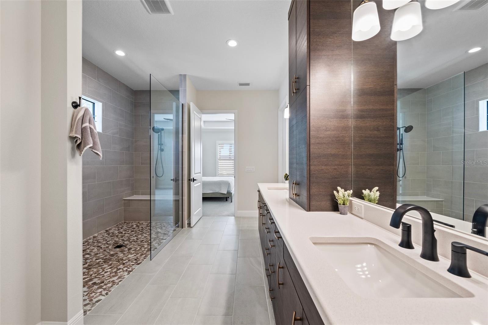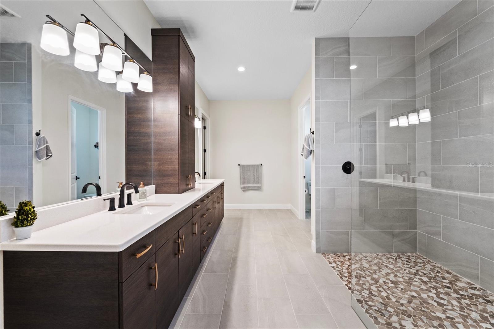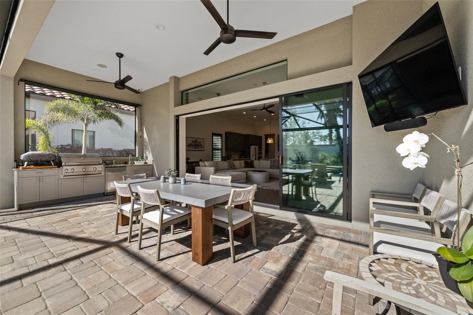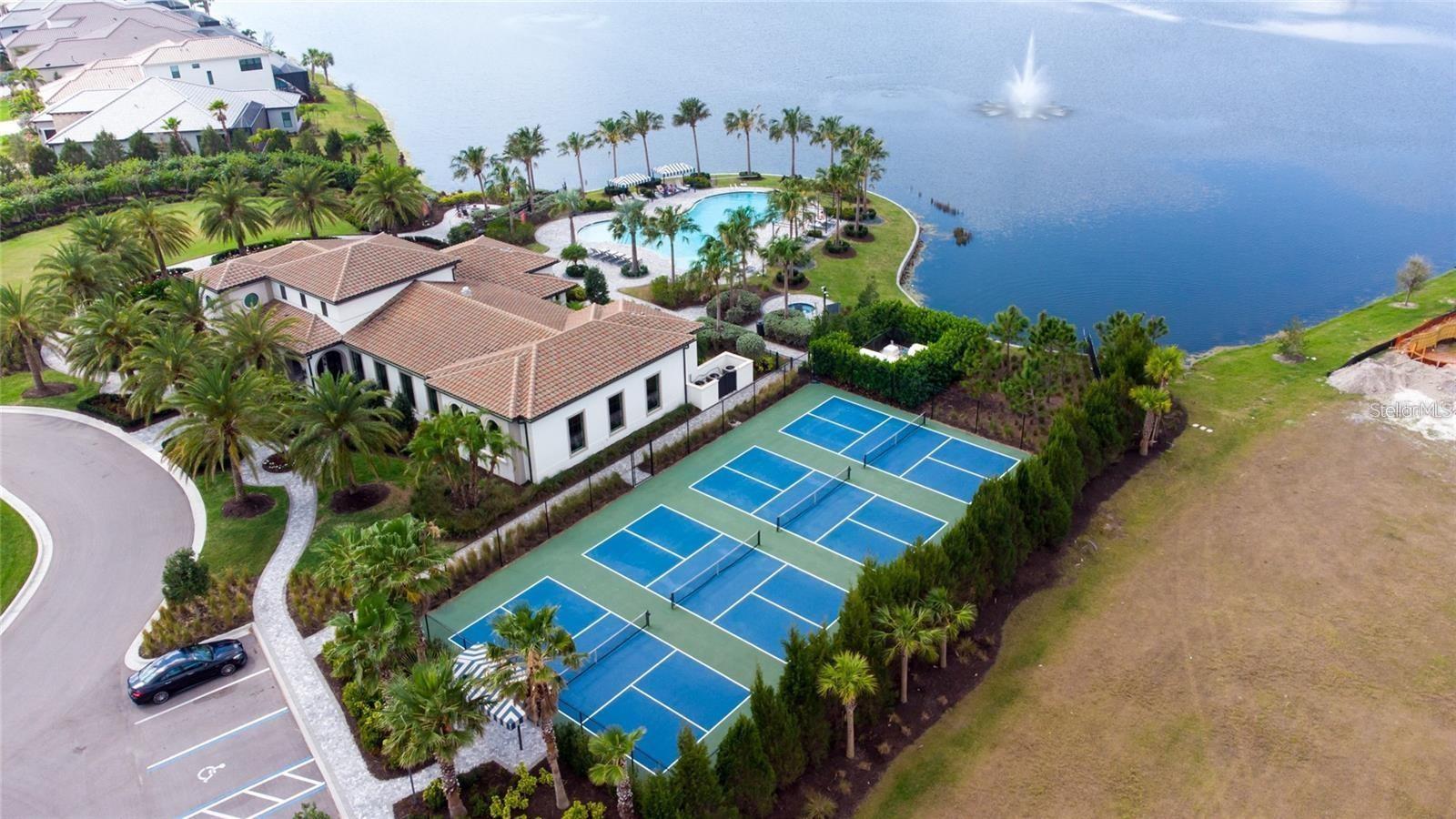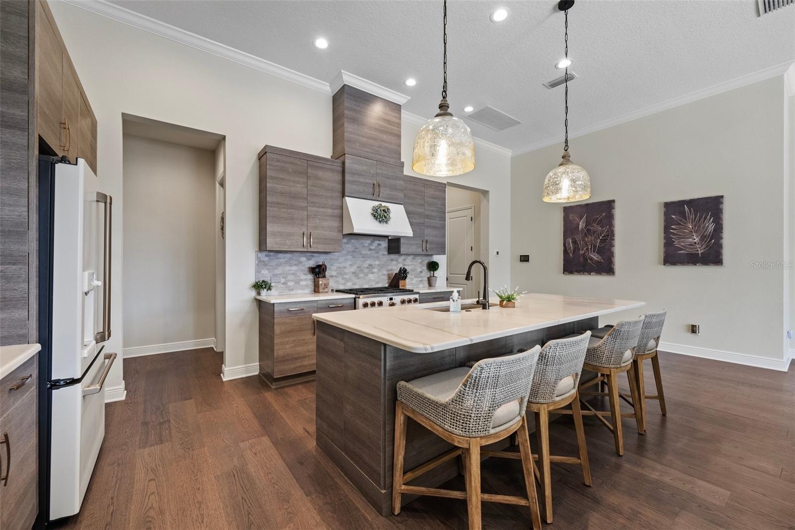Luxurious Living at Its Finest – come see this Veneto Model by Aria Signature Homes, where elegance and comfort harmoniously combine to create the perfect sanctuary. This beautifully designed 3-bedroom, 3-bathroom residence, featuring a versatile flex room and a spacious 2-car garage, spans 2,647 square feet of meticulously crafted living space. From the moment you step through the grand double door entry, the warm and inviting ambiance draws you in. Stunning Shaw wood flooring in majestic pecan runs throughout, complemented by custom wide crown and base moldings. The 14-foot ceiling in the great room, along with tray ceilings in key areas, enhances the sense of openness and sophistication. The gourmet kitchen is a culinary dream. Outfitted with GE Café white matte stainless steel appliances, including a 6-burner commercial oven with a matching hood, this space is designed for both style and functionality. City Oak wood cabinets with soft-close drawers and roll-out shelves provide ample storage, while the quartz kitchen island in Valente pearl, Level 6 stone backsplash, and Kohler Neoroc taupe sink add a luxurious touch. A butler’s pantry, wine cooler, and brushed brass hardware complete the space, ensuring it meets every need. The master suite is a private retreat with designer carpeting and a spa-inspired ensuite bath. This tranquil space features an oversized glass walk-in shower with a built-in bench and niche, double sinks with Moen Deco faucets, and built-in linen storage. Two additional bedrooms also feature designer carpeting and are served by two beautifully appointed guest bathrooms with upgraded mosaic finishes. The home effortlessly blends indoor and outdoor living. Triple-wide glass sliders in the living room open to an oversized clear view screened lanai framed by a bronze cage, offering stunning views of a tropical garden with eight large palms. The lanai features an electric privacy screen and houses a saltwater pool with two waterfalls. A built-in outdoor kitchen with granite countertops, an Artisan grill, a gas-powered pizza oven, and a stainless steel refrigerator elevates entertaining to an art form. Modern living is enhanced by the ClareVue Smart Home system with automation, alarm features, and outdoor cameras, as well as a Sonos sound system with built-in speakers and subwoofers for seamless indoor and outdoor audio. Plantation shutters add timeless style and privacy throughout the home. Located in the exclusive Aria community, this home offers more than just a place to live. Aria is a luxury enclave by Neal Communities featuring a state-of-the-art fitness center, an active clubhouse, a resort-style pool and spa, and pickleball courts, all surrounded by beautifully maintained green spaces. This home is a rare gem, offering a lifestyle of luxury and convenience. Schedule your private showing today and discover why this Veneto model is a must-see.