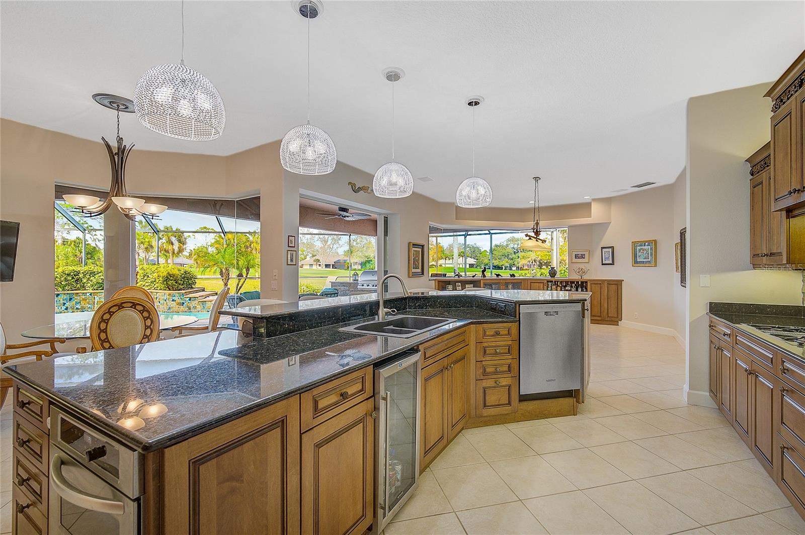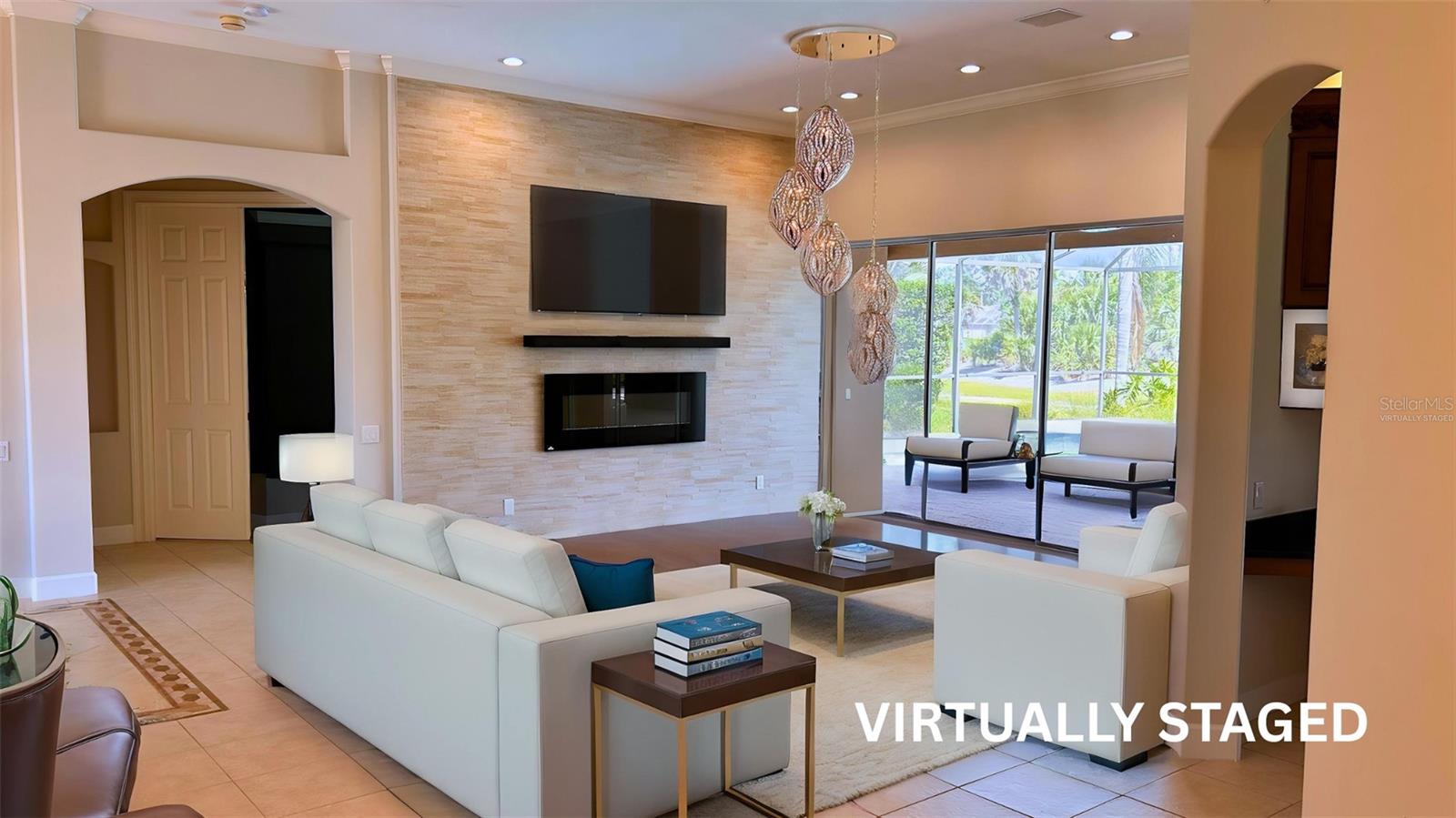 One or more photo(s) has been virtually staged. Luxury, comfort, and breathtaking lakefront views converge in this captivating home located in the highly desirable golf community of Calusa Lakes. This expansive 4,255 sq ft two-story residence with a 3-car garage offers a blend of refined design and everyday comfort. The grand foyer opens to a bright living room featuring a striking stone-accented fireplace and an open formal dining area. Elegant finishes include crown molding, plantation shutters, recessed lighting, and custom wood cabinetry throughout. The gourmet kitchen is designed for the culinary enthusiast with a gas cooktop, built-in ovens, granite countertops, and an oversized island with microwave and beverage cooler. An aquarium window brings in natural light and seamlessly connects to the spacious family room with tray ceilings, perfect for gathering and entertaining. With four bedrooms in total, three are ensuite. One ensuite bedroom is located on the second floor, ideal as a private guest retreat, media room, or potential in-law suite, complete with a private balcony offering scenic views of the tranquil pond, manicured grounds, and the 16th green. The main level features a dedicated office, along with a flexible media room that can also serve as a gym or second workspace. The luxurious primary suite boasts two walk-in closets and a spa-like ensuite bathroom with dual sinks, a jetted tub, marble finishes, and a walk-in shower. Direct access from the primary suite to the lanai enhances the resort-style living experience. The lanai itself is a showstopper, with a newly resurfaced (2021) heated pool, spa, and cascading water features. Entertain effortlessly with a built-in outdoor kitchen and granite bar seating on the expansive brick-paved patio. This home has been recently updated with brand new carpeting in all bedrooms and a freshly painted exterior. The interior features a tasteful, neutral palette and four zoned air-conditioning systems for optimal comfort throughout. With no CDD fee, a low HOA of just $327/quarter, and no mandatory golf membership, this community offers both luxury and value. Conveniently located near world-renowned beaches, boutique shopping, fine dining, cultural venues, I-75, the new Sarasota Memorial Hospital, and international airports, this home is a true lakeside paradise. Be sure to view the 3-D and aerial tours.