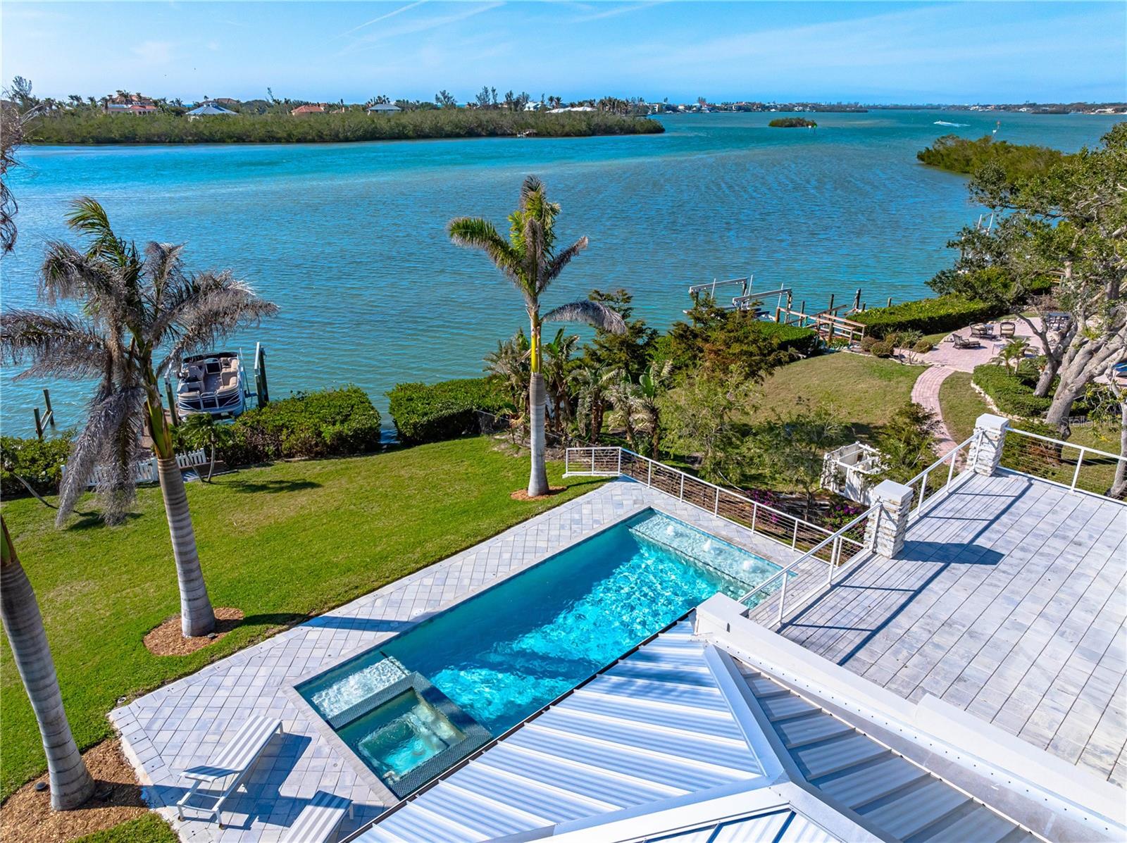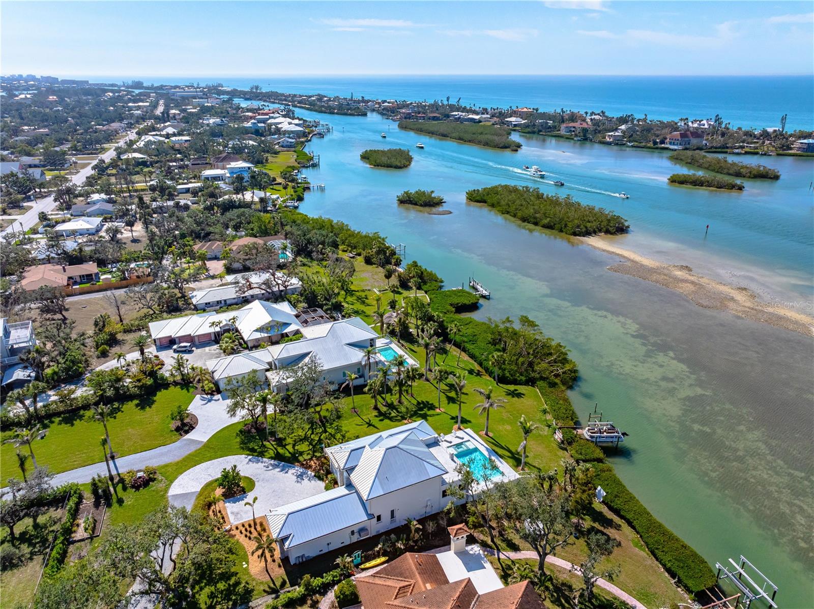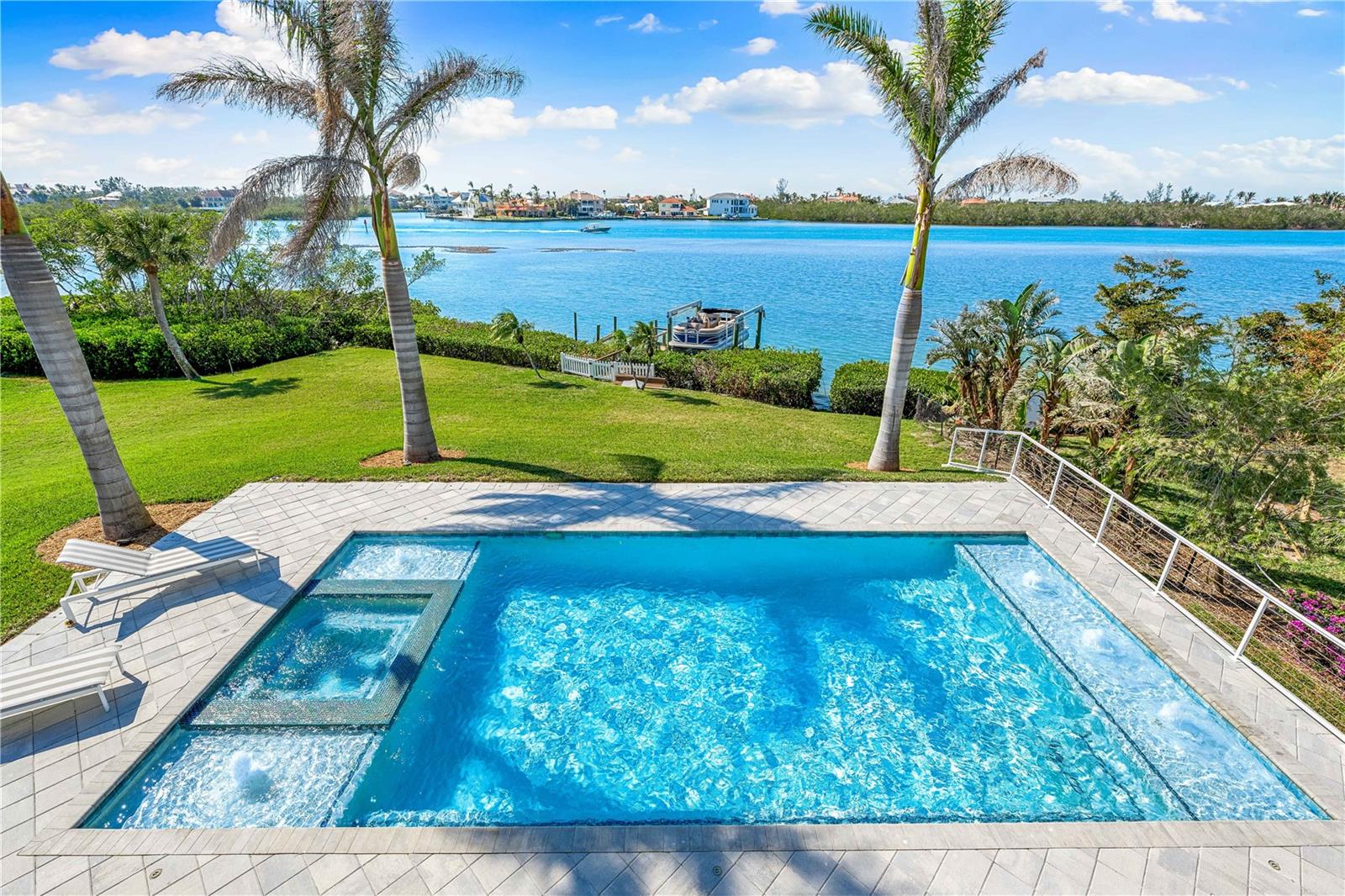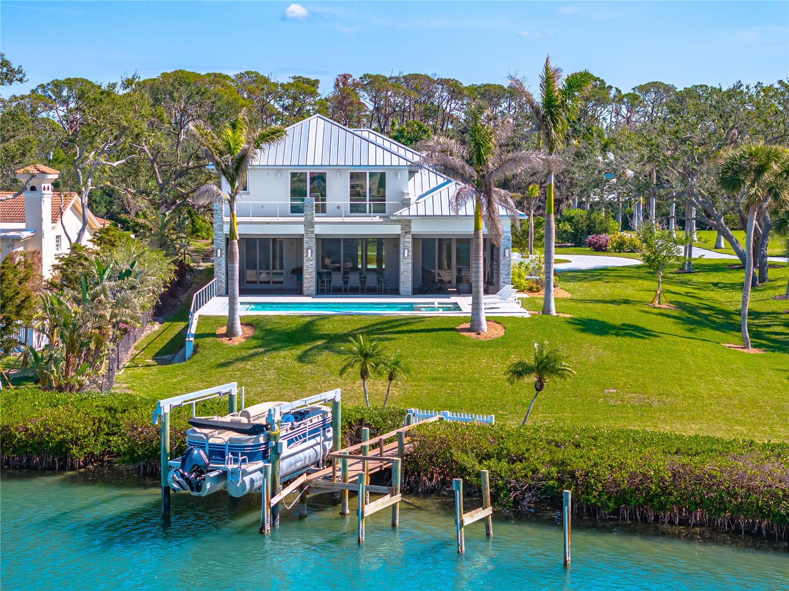 This stunning coastal waterfront estate is a fishing and boaters' dream. This property promises the sought-after Florida sunsets night after night! This private oasis sits on .65 acre and establishes security with a private solar powered gate. Walking into the foyer you experience the open floor plan with a linear gas fireplace in the great room, and high end finishes throughout. Pocket sliders line the great room, kitchen, and owner’s suite, with breathtaking views of the intracoastal that provides an abundance of natural light! The flow from the kitchen to the great room provides functionality for everyday living or entertaining. The kitchen provides stainless steel Thermador wifi-compatible appliances, a convection double oven, glass induction cooktop, microwave drawer, and an oversized refrigerator with two ice makers! It is also fitted with Italian tile backsplash! The Owners' suite is conveniently located on the first floor with the same beautiful views, a large shower, and a favorable walk-in closet. Other features of this spectacular home include a Sonos sound system, and an elevator to the 2nd floor. The elevator opens up to a loft and three additional bedrooms. Two of the three bedrooms include ensuites with a private patio and breathtaking views to the North and South of the intracoastal waterway. The 3rd bedroom shares the public bathroom. Once outside there is a spacious lanai with a fully equipped outdoor kitchen, including seating versatility for dining, watching your favorite tv programs, and entertaining. The lanai is also equipped with a linear gas fireplace, powered sun and storm shades, and a Sonos sound system. After a short walk down to the dock you will find easy access to a 10,000 lb boat lift with remote control operation. There is electric and a fresh water source for convenient fish and boat cleaning. Just 1.1 miles from Nokomis Beach, this estate allows for a quiet and private lifestyle and is within a short drive to vibrant downtown Venice and Sarasota. Don’t miss out on your chance for Coastal living! *Dont forget to click the virtual link* *This is turnkey optional*