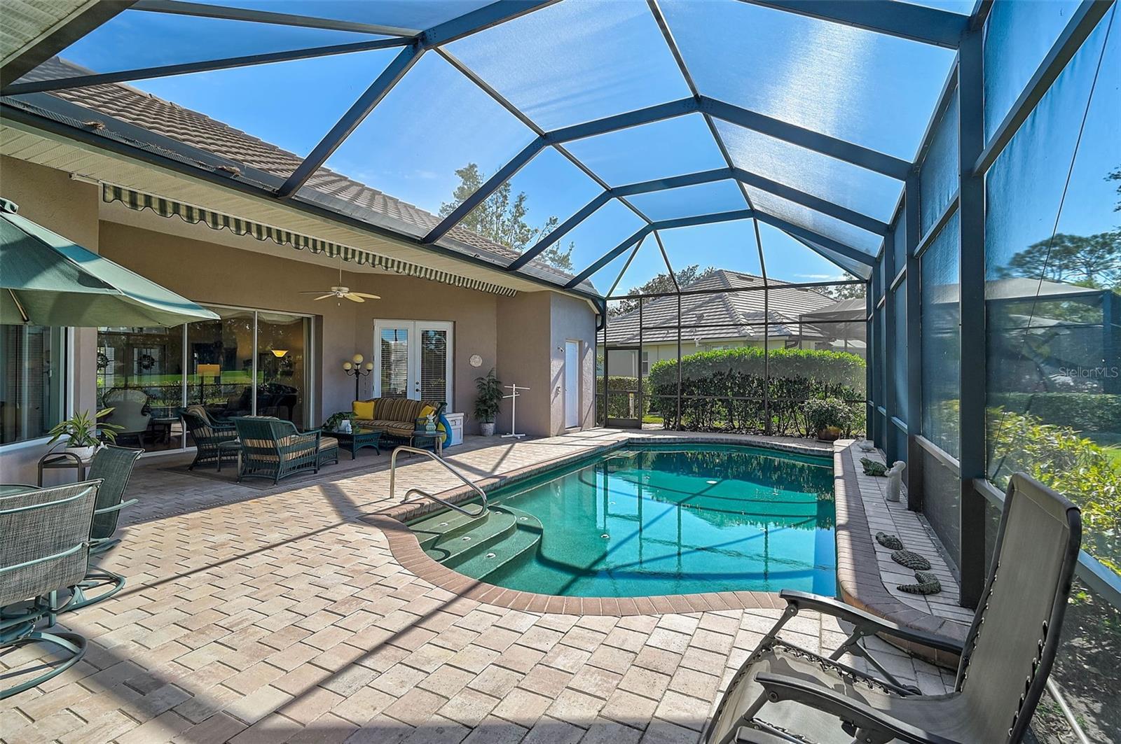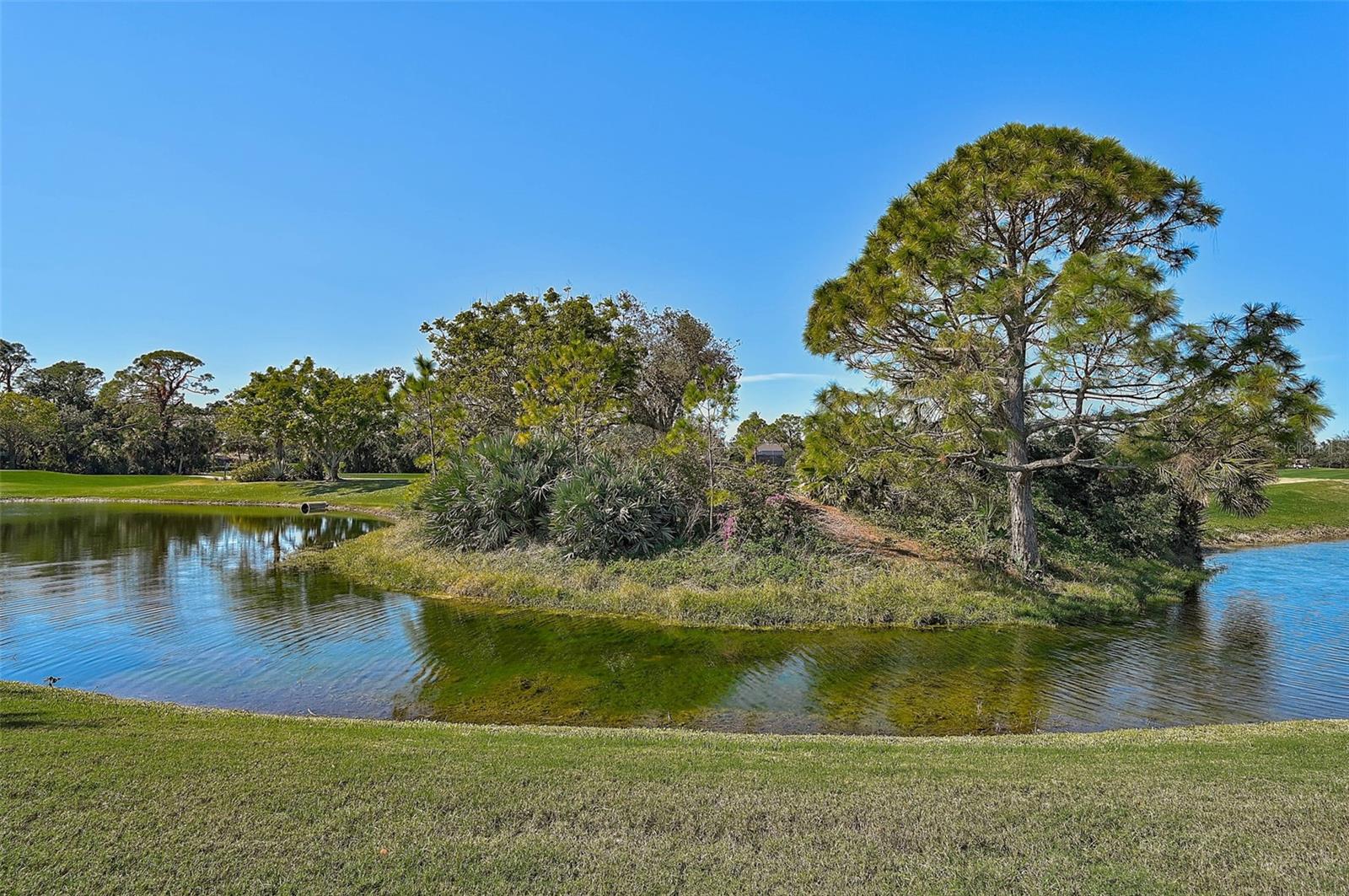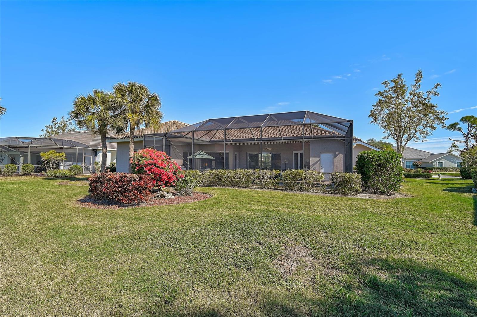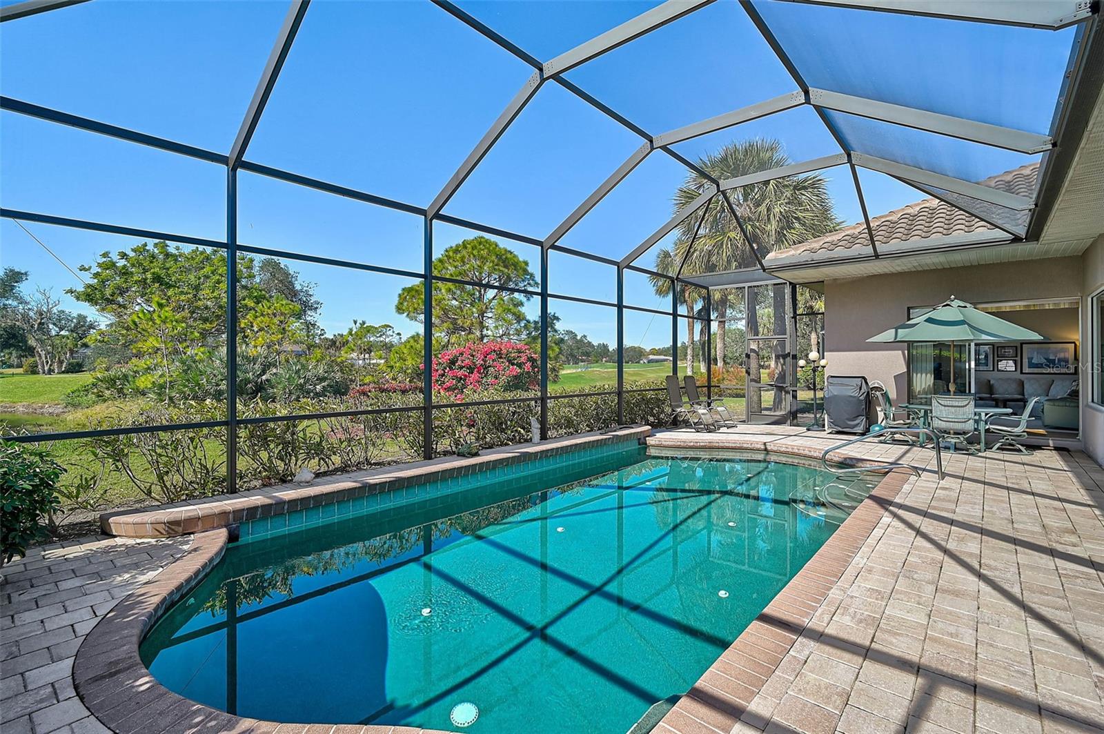 Presenting an exceptional residence with a serene and expansive POND VIEW, offering a private sanctuary that is available turnkey-furnished (with the exception of a few personal items). This meticulously maintained home features three bedrooms plus an office, along with a family room adorned with a large picture window framing the tranquil view. The updated kitchen boasts refaced cabinetry, stainless-steel appliances, which all seamlessly open to the family room, ideal for both everyday living and entertaining. The primary suite is a true retreat, complete with spacious walk-in closet and a beautifully renovated primary bath with granite countertops and walk-in shower. Recent updates include a NEW ROOF (2018), brand-new washer and dryer (2025), new HVAC system (March 2025), and hot water heater (2022). Enjoy the outdoors by opening the lanai doors, which pocket into the wall, creating a grand, open space that effortlessly connects the indoor and outdoor areas. Step onto the brick-paved lanai and unwind under the electric awning, all while enjoying a refreshing beverage and watching golfers pass by in the distance. The heated, resurfaced pool offers a perfect spot to relax, with stunning sunsets visible to the west. For added convenience, an outdoor half bath and shower are available, making it easy to rinse off after a round of golf or tennis. The home has been RE-PLUMBED, further enhancing its move-in readiness. Located just a short 10-minute drive to Nokomis Beach and downtown Venice, where you can explore unique shops, restaurants, and cultural activities, this home provides an ideal balance of privacy and accessibility. Residents of Calusa Lakes enjoy exclusive access to a community gate leading to Honore Road, providing quick access to major highways heading north and south. This Florida home has it all!