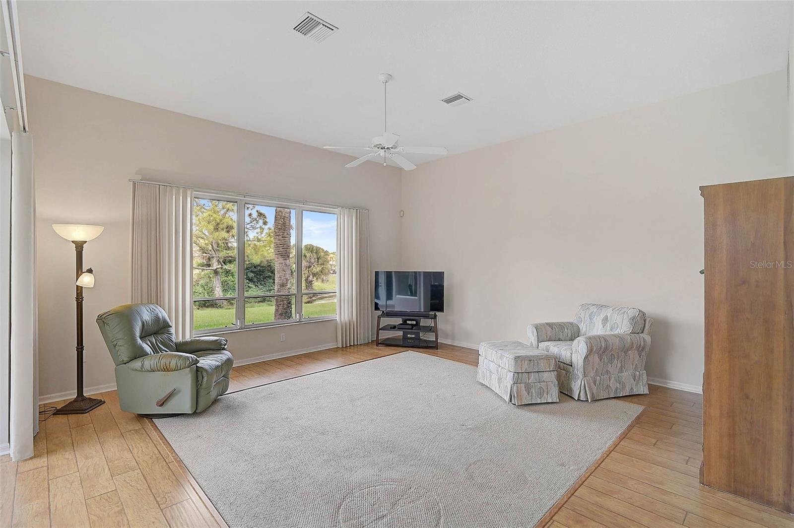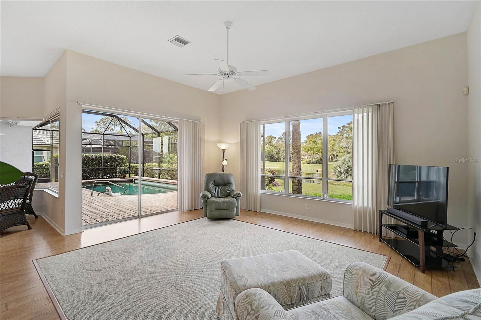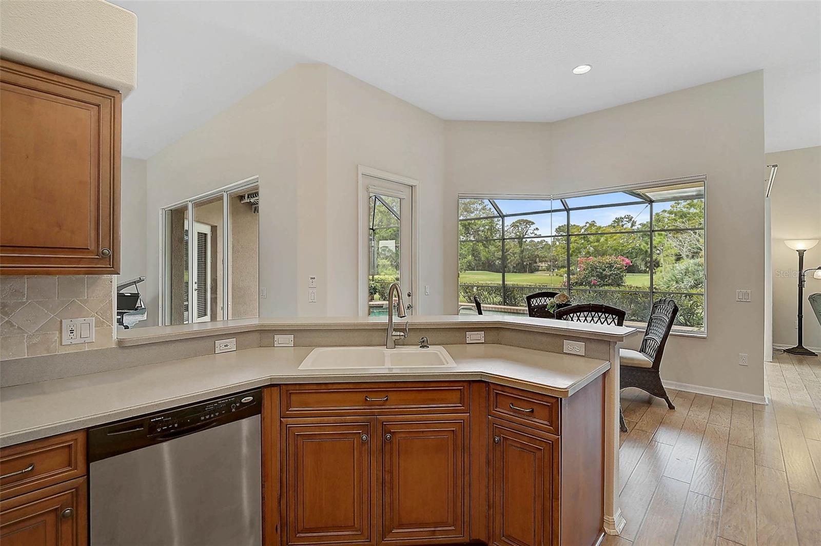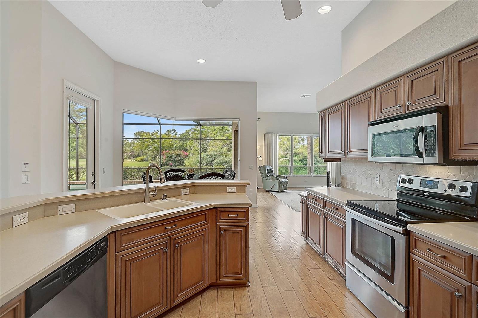 Presenting an exceptional residence with a serene and expansive POND VIEW, offering a private sanctuary that is available turnkey-furnished (with the exception of a few personal items). This meticulously maintained home features three bedrooms plus an office, along with a family room adorned with a large picture window framing the tranquil view. The updated kitchen boasts refaced cabinetry, stainless-steel appliances, which all seamlessly open to the family room, ideal for both everyday living and entertaining. The primary suite is a true retreat, complete with spacious walk-in closet and a beautifully renovated primary bath with granite countertops and walk-in shower. Recent updates include a NEW ROOF (2018), brand-new washer and dryer (2025), new HVAC system (March 2025), and hot water heater (2022). Enjoy the outdoors by opening the lanai doors, which pocket into the wall, creating a grand, open space that effortlessly connects the indoor and outdoor areas. Step onto the brick-paved lanai and unwind under the electric awning, all while enjoying a refreshing beverage and watching golfers pass by in the distance. The heated, resurfaced pool offers a perfect spot to relax, with stunning sunsets visible to the west. For added convenience, an outdoor half bath and shower are available, making it easy to rinse off after a round of golf or tennis. The home has been RE-PLUMBED, further enhancing its move-in readiness. Located just a short 10-minute drive to Nokomis Beach and downtown Venice, where you can explore unique shops, restaurants, and cultural activities, this home provides an ideal balance of privacy and accessibility. Residents of Calusa Lakes enjoy exclusive access to a community gate leading to Honore Road, providing quick access to major highways heading north and south. This Florida home has it all!