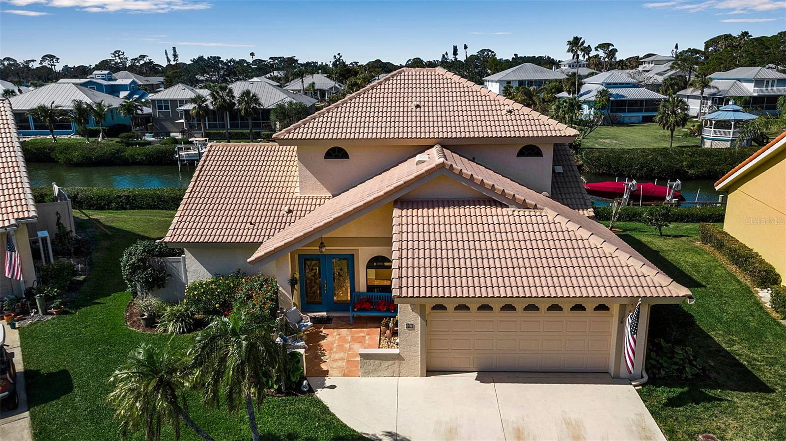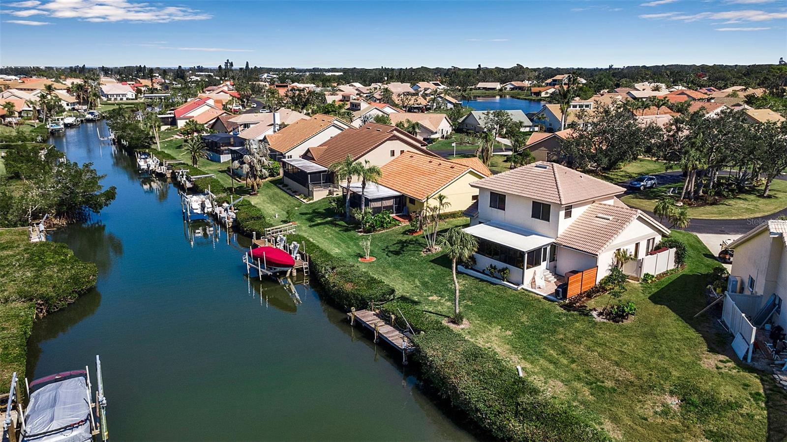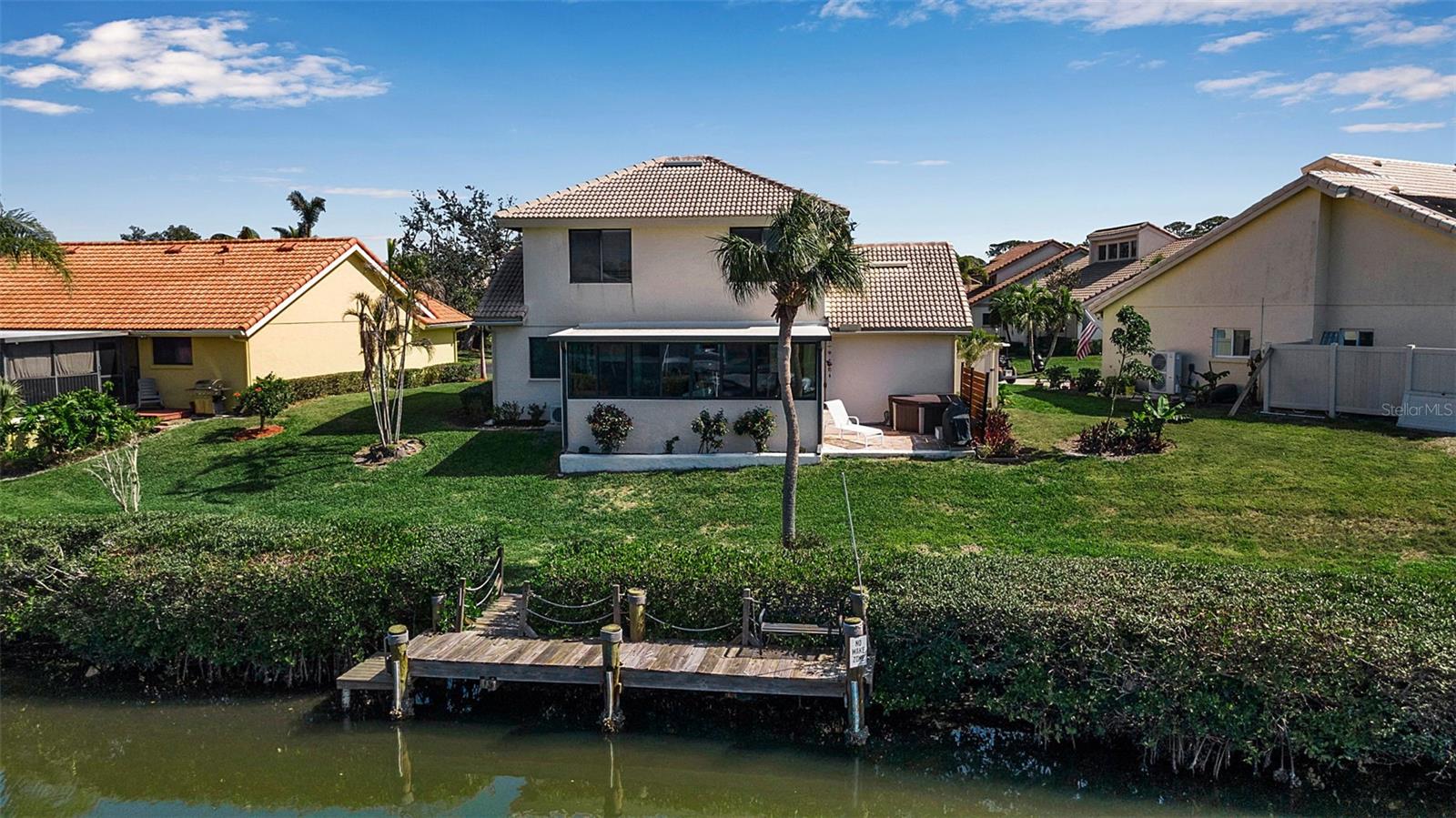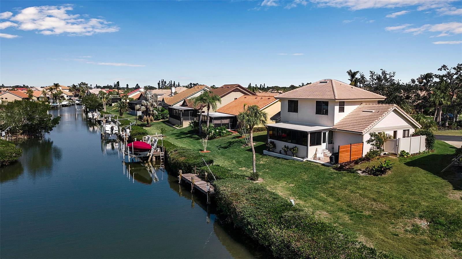 This two-story waterfront home, located on one of the widest and deepest parts of the canal and just minutes from Lyon's Bay and the Gulf, is ready for its new owner. With 3 bedrooms, 3.5 baths, and its own dock and kayak launch, this property is ideal for those who love waterfront living. The sellers have thoughtfully extended and enclosed the lanai, creating a Florida room perfect for year-round enjoyment with the hurricane windows providing peace of mind and abundant natural light. The open kitchen boasts ample counter space, ideal for entertaining, and features a cleverly concealed computer desk space behind French doors. This open great room floor plan lives large with built-in bookcases, a dining room right off the kitchen, a wet bar hidden out of the way but perfectly situated for entertaining. Also on the first floor you will find a primary bedroom which features a large walk-in closet, an attached full bathroom and Murphy bed. Sellers are now using this as a TV room. The second floor has 2 bedrooms which was an addition put on by the sellers and features another primary bedroom with a large walk-in closet and en-suite full bathroom. There is also a guest bedroom which includes an en-suite bathroom. Both of these rooms have beautiful views of the waterway. There are two patios, one is off of the Florida Room with a Hot Tub that allows you to soak while watching the boats going by. The front patio offers a charming spot to relax and enjoy the surroundings. The property is situated on a culdesac with 121 feet of water frontage. The westerly views from the back of the house are perfect for watching our magnificent sunsets. This gated, maintenance-free, resort style community offers a wealth of amenities, including a very active clubhouse, tennis and pickleball, a resort-style pool that is heated in the winter and cooled in the summer. Residents also enjoy a fitness room and library. For those with boats, RVs, and trailers, the HOA provides a secure and convenient fenced lot for storage. The HOA fee covers cable, internet, lawn maintenance, landscape care, and original structural insurance. Conveniently located about two miles from North Jetty Park, North Jetty Beach, and Nokomis Beach, this home offers easy access to shopping, dining, banking, the Legacy Trail, and historic downtown Venice.
