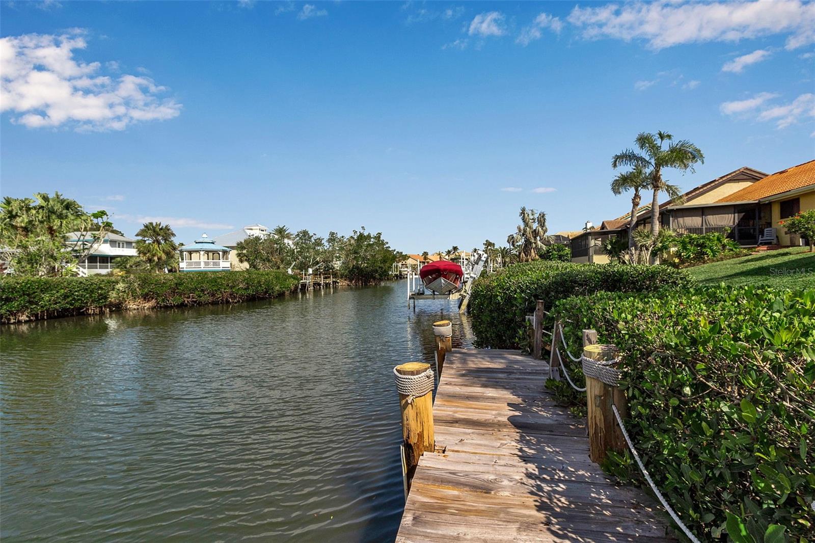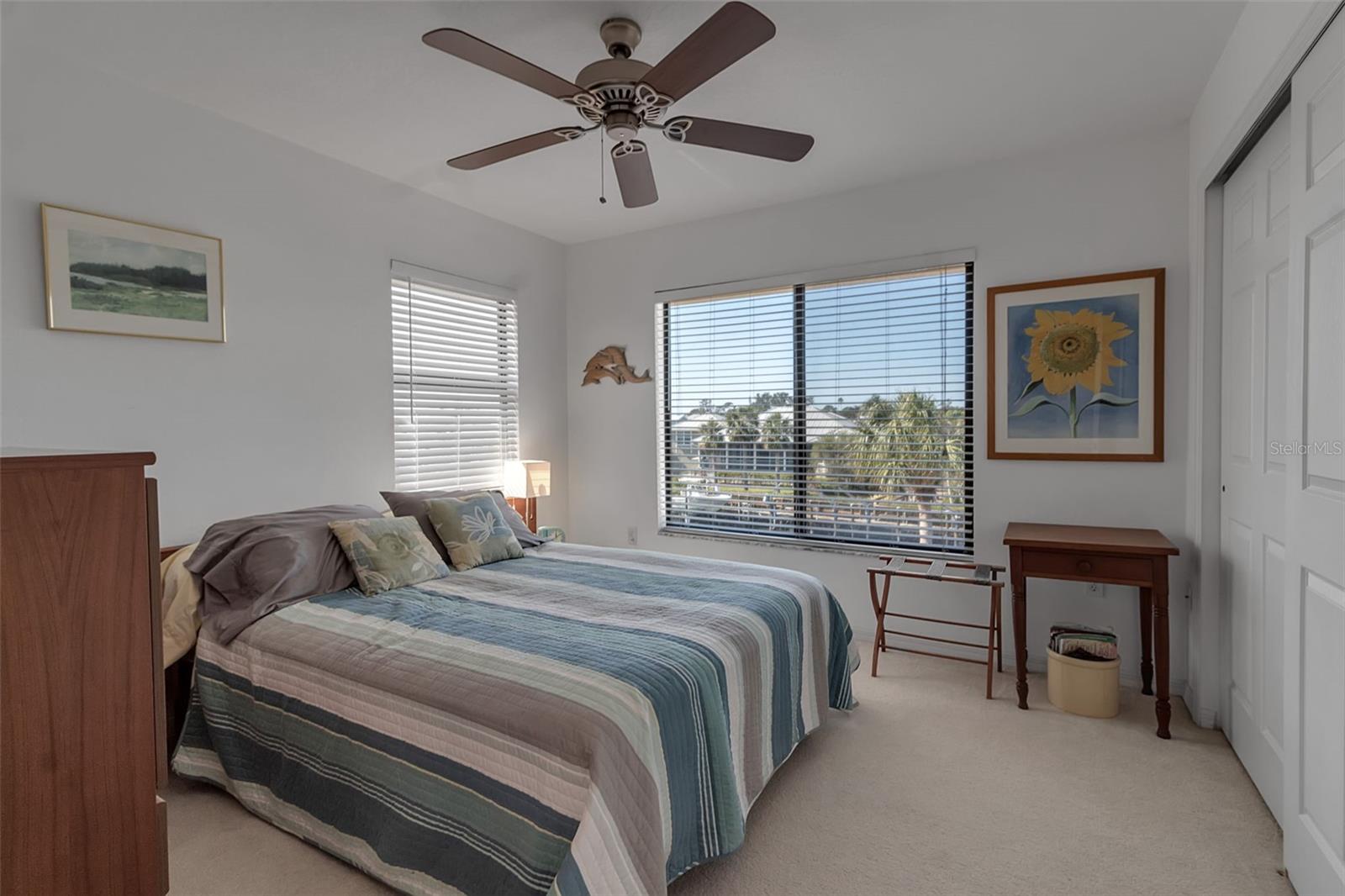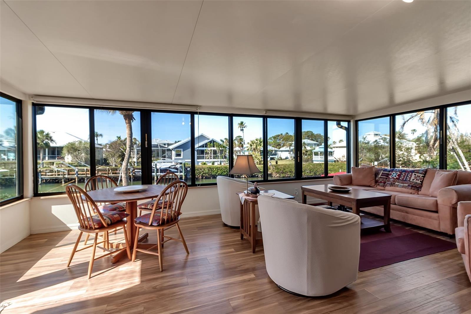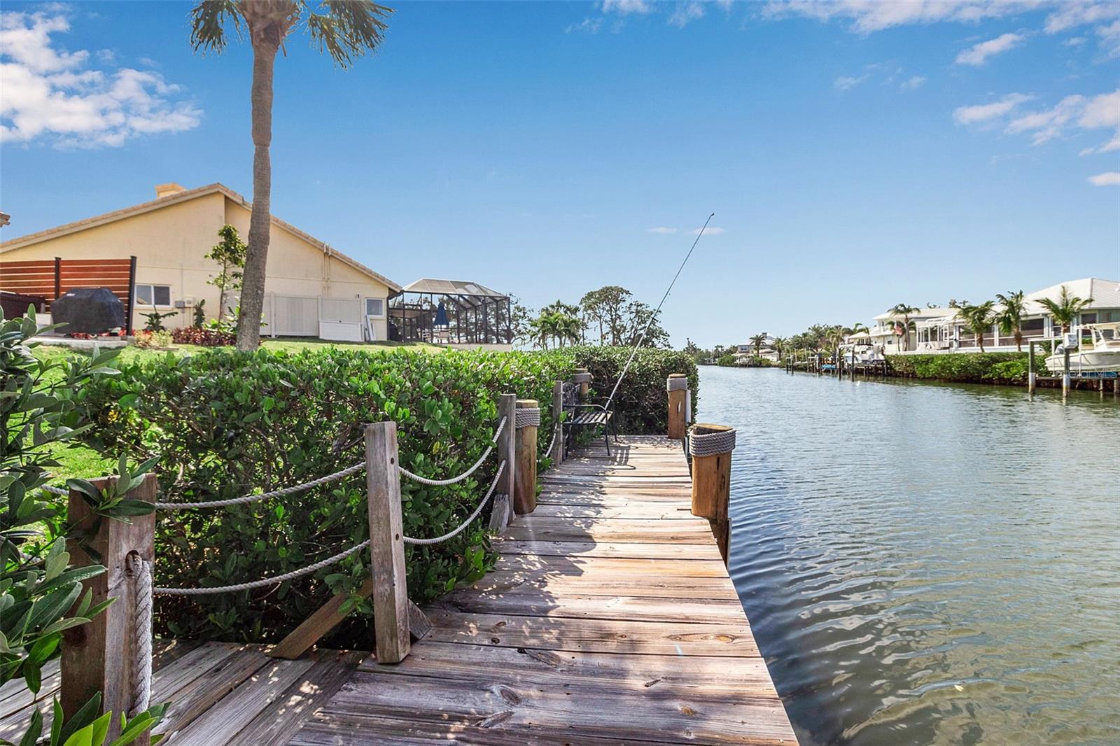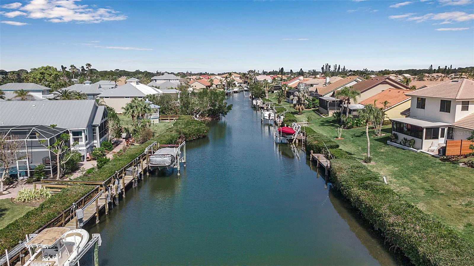 This two-story waterfront home, located on one of the widest and deepest parts of the canal and just minutes from Lyon's Bay and the Gulf, is ready for its new owner. With 3 bedrooms, 3.5 baths, and its own dock and kayak launch, this property is ideal for those who love waterfront living. The sellers have thoughtfully extended and enclosed the lanai, creating a Florida room perfect for year-round enjoyment with the hurricane windows providing peace of mind and abundant natural light. The open kitchen boasts ample counter space, ideal for entertaining, and features a cleverly concealed computer desk space behind French doors. This open great room floor plan lives large with built-in bookcases, a dining room right off the kitchen, a wet bar hidden out of the way but perfectly situated for entertaining. Also on the first floor you will find a primary bedroom which features a large walk-in closet, an attached full bathroom and Murphy bed. Sellers are now using this as a TV room. The second floor has 2 bedrooms which was an addition put on by the sellers and features another primary bedroom with a large walk-in closet and en-suite full bathroom. There is also a guest bedroom which includes an en-suite bathroom. Both of these rooms have beautiful views of the waterway. There are two patios, one is off of the Florida Room with a Hot Tub that allows you to soak while watching the boats going by. The front patio offers a charming spot to relax and enjoy the surroundings. The property is situated on a culdesac with 121 feet of water frontage. The westerly views from the back of the house are perfect for watching our magnificent sunsets. This gated, maintenance-free, resort style community offers a wealth of amenities, including a very active clubhouse, tennis and pickleball, a resort-style pool that is heated in the winter and cooled in the summer. Residents also enjoy a fitness room and library. For those with boats, RVs, and trailers, the HOA provides a secure and convenient fenced lot for storage. The HOA fee covers cable, internet, lawn maintenance, landscape care, and original structural insurance. Conveniently located about two miles from North Jetty Park, North Jetty Beach, and Nokomis Beach, this home offers easy access to shopping, dining, banking, the Legacy Trail, and historic downtown Venice.
