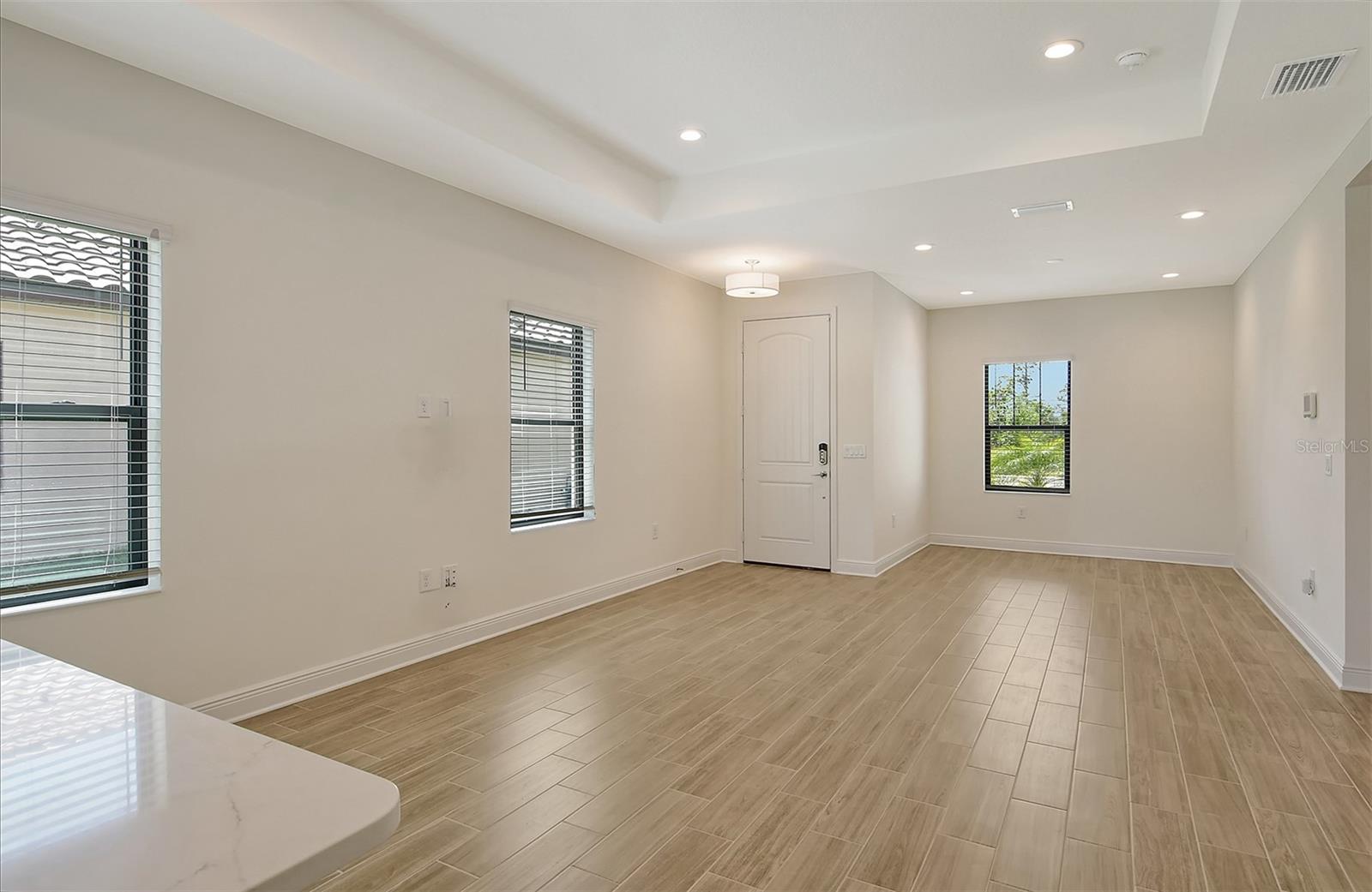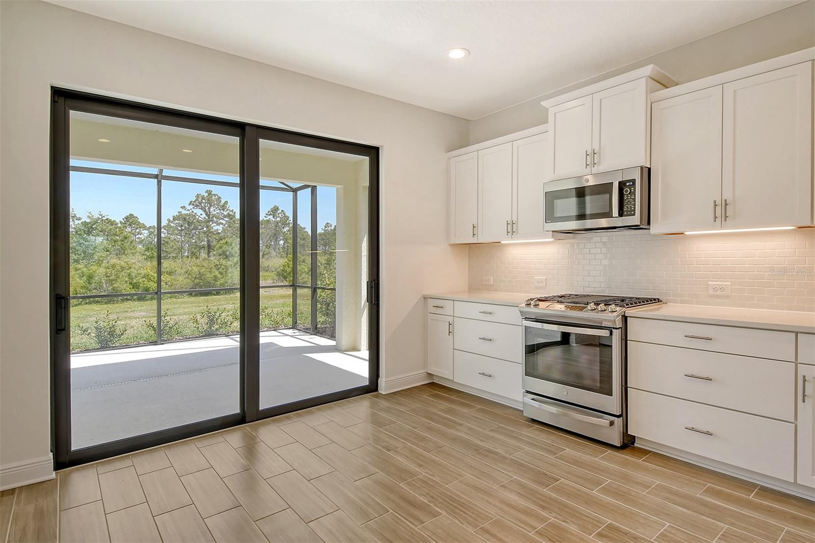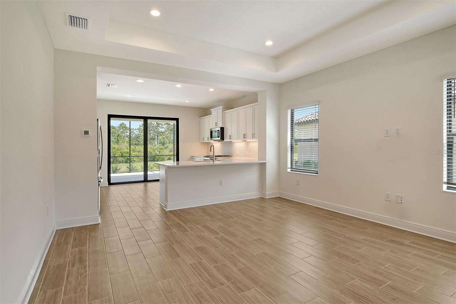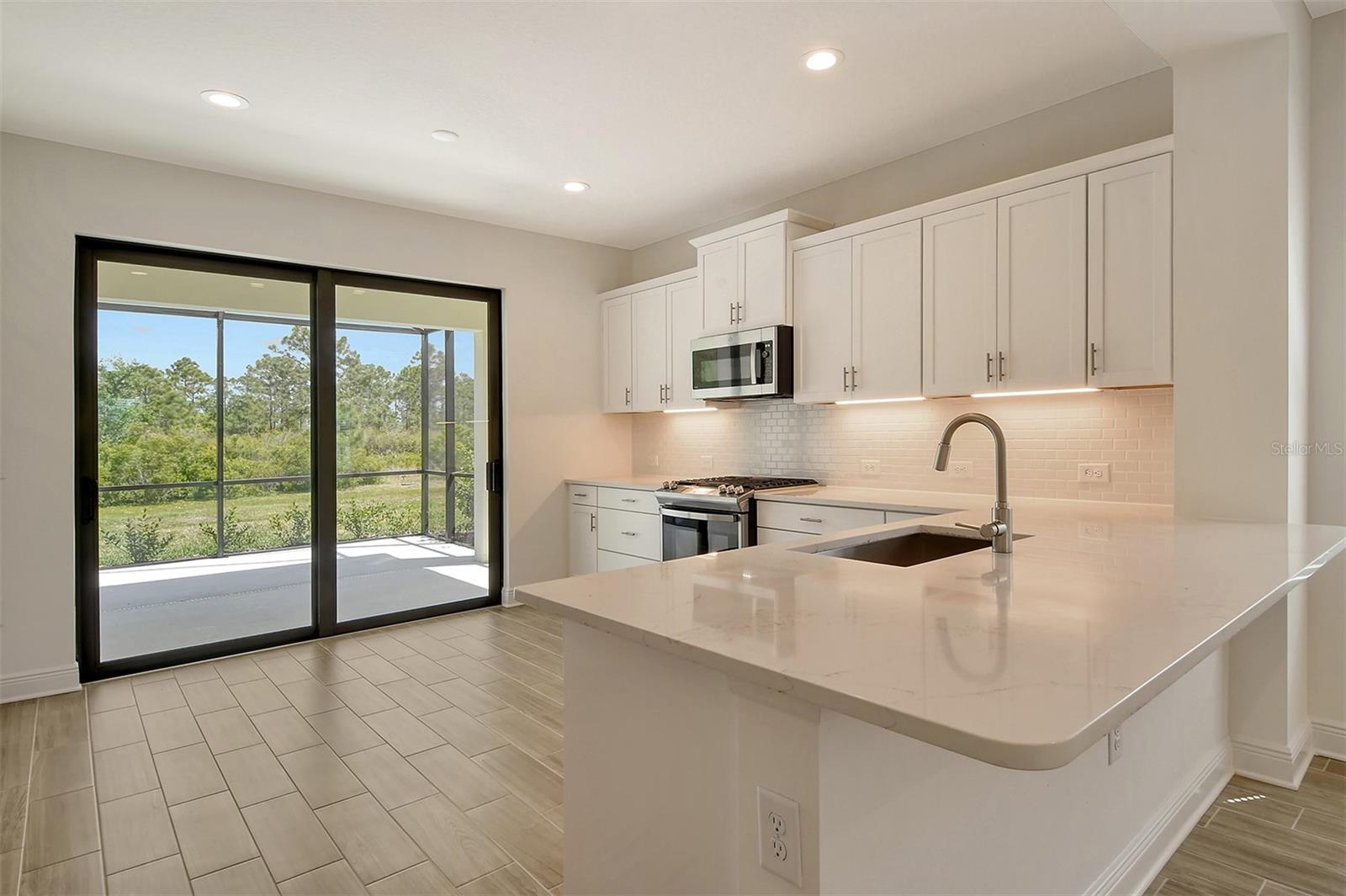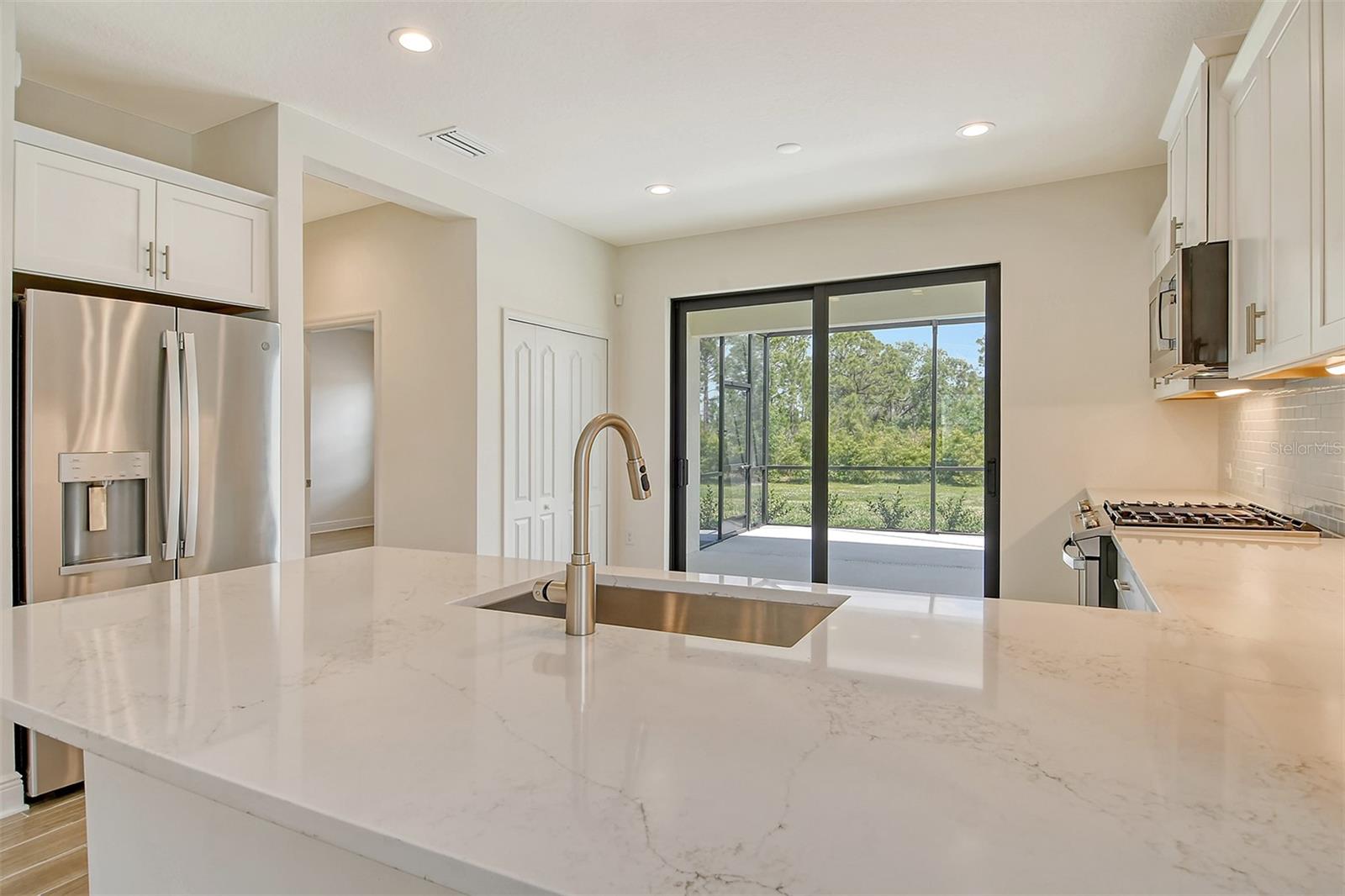 This beautifully designed 3-bedroom, 2-bath home offers modern elegance and everyday comfort. Enjoy wood-look tile flooring throughout and quartz countertops in both the kitchen and bathrooms, all set against a neutral, professionally selected color palette. The open great room features recessed ceilings, adding architectural interest and a spacious feel. Step outside to the extended lanai, already equipped with rough-ins for an outdoor kitchen, making it easy to create your perfect entertaining space. With impact glass for added peace of mind and a serene natural preserve view from the lanai, this home offers both privacy and style in one beautiful package.