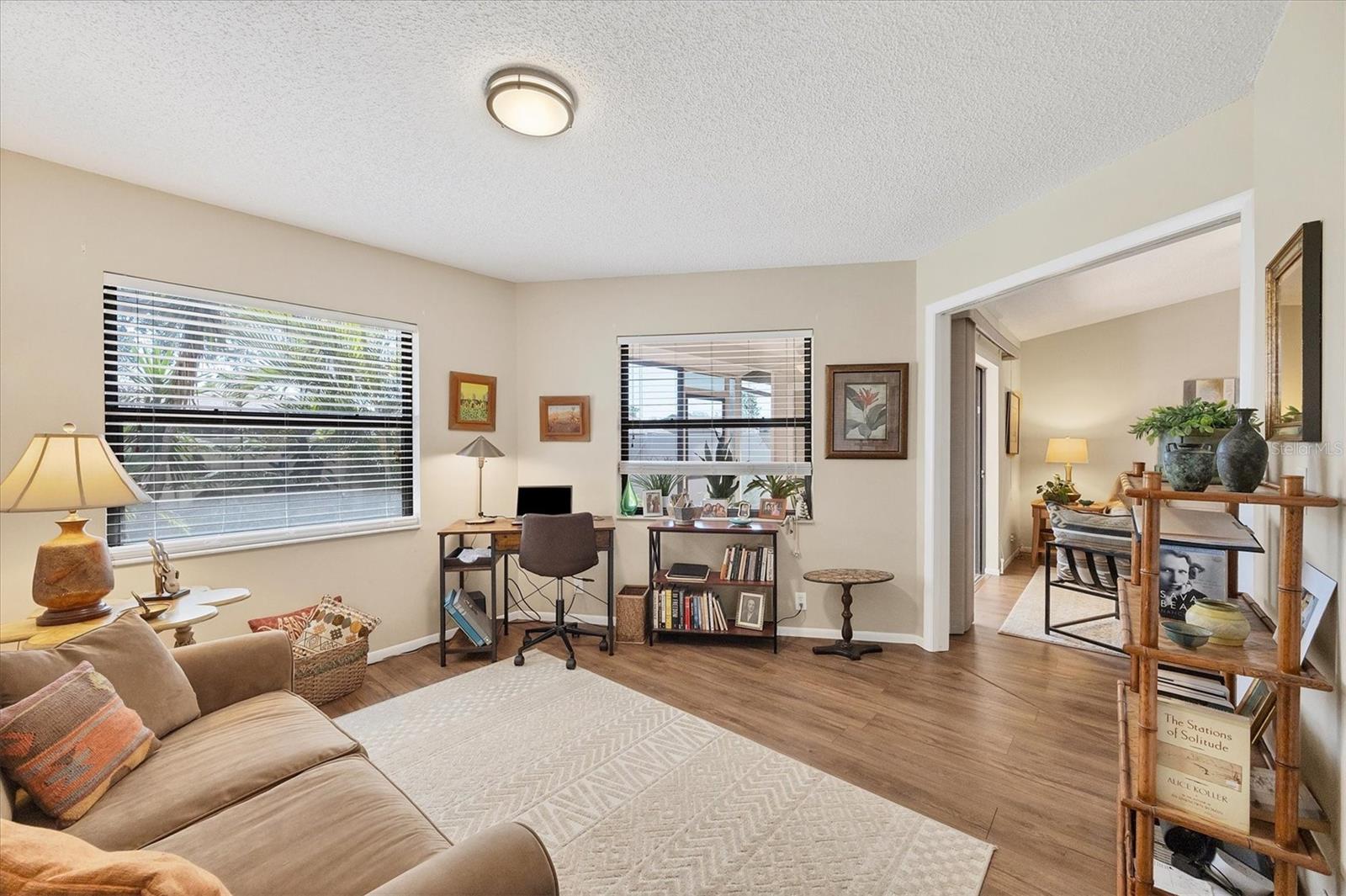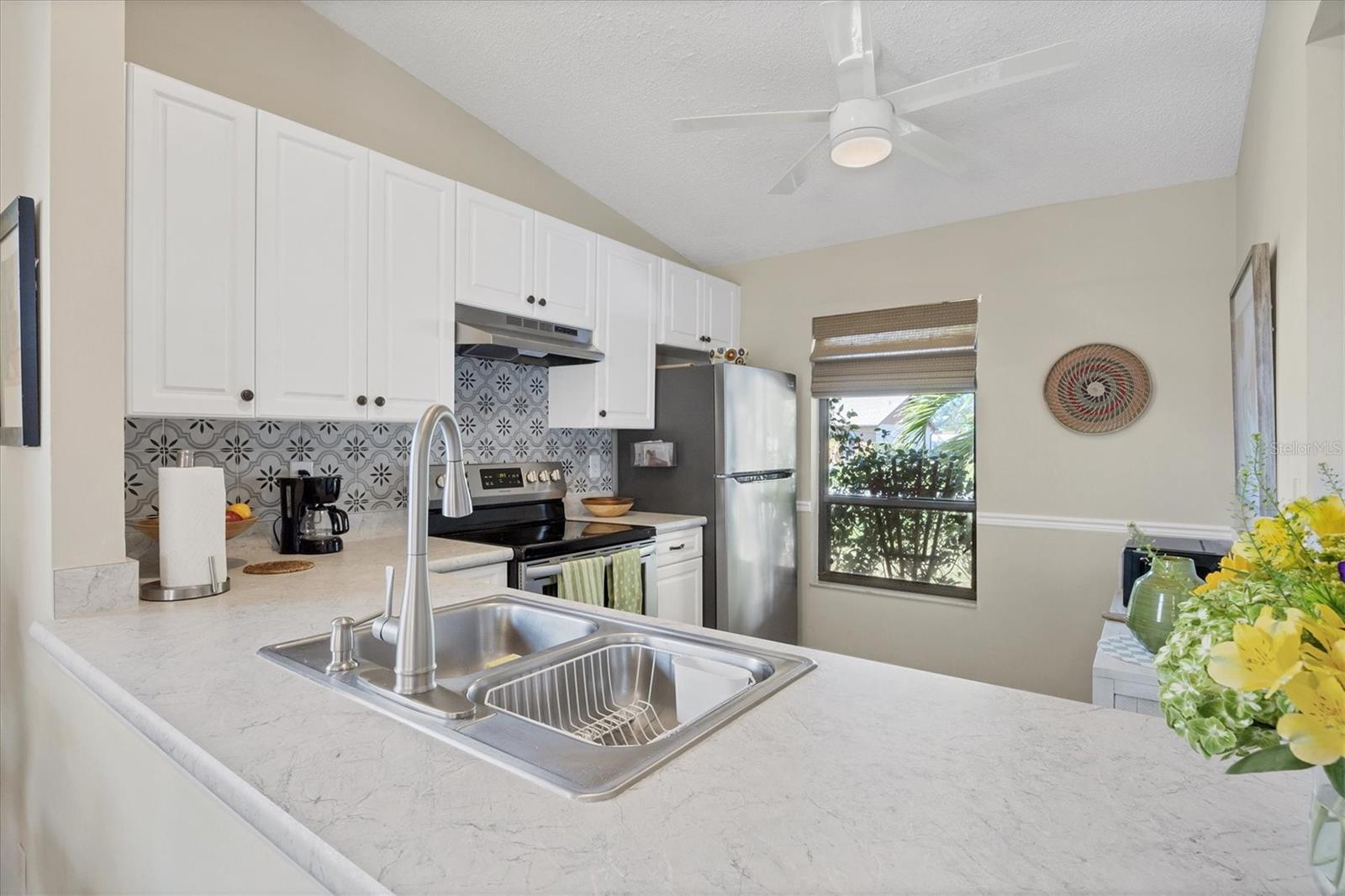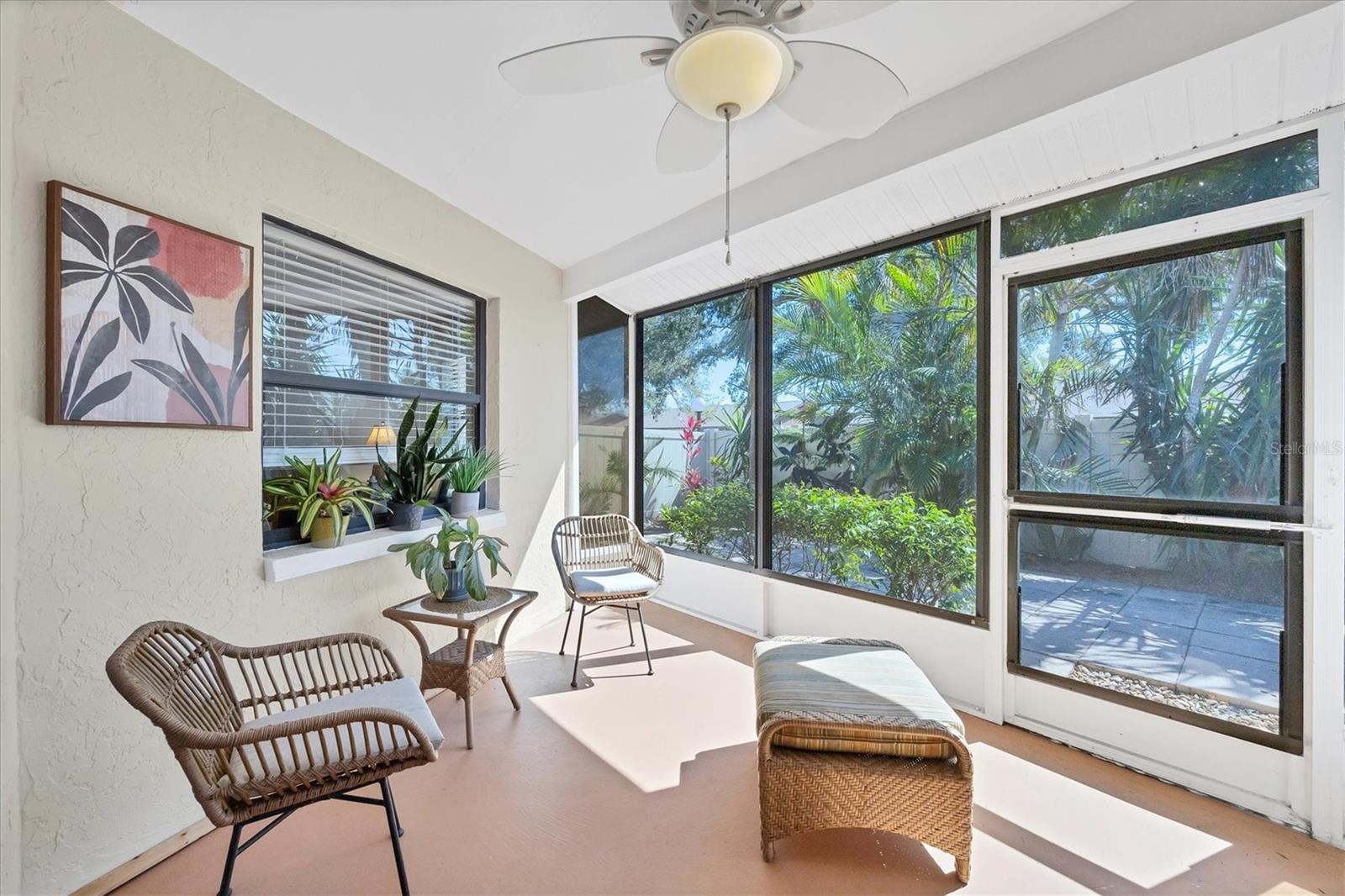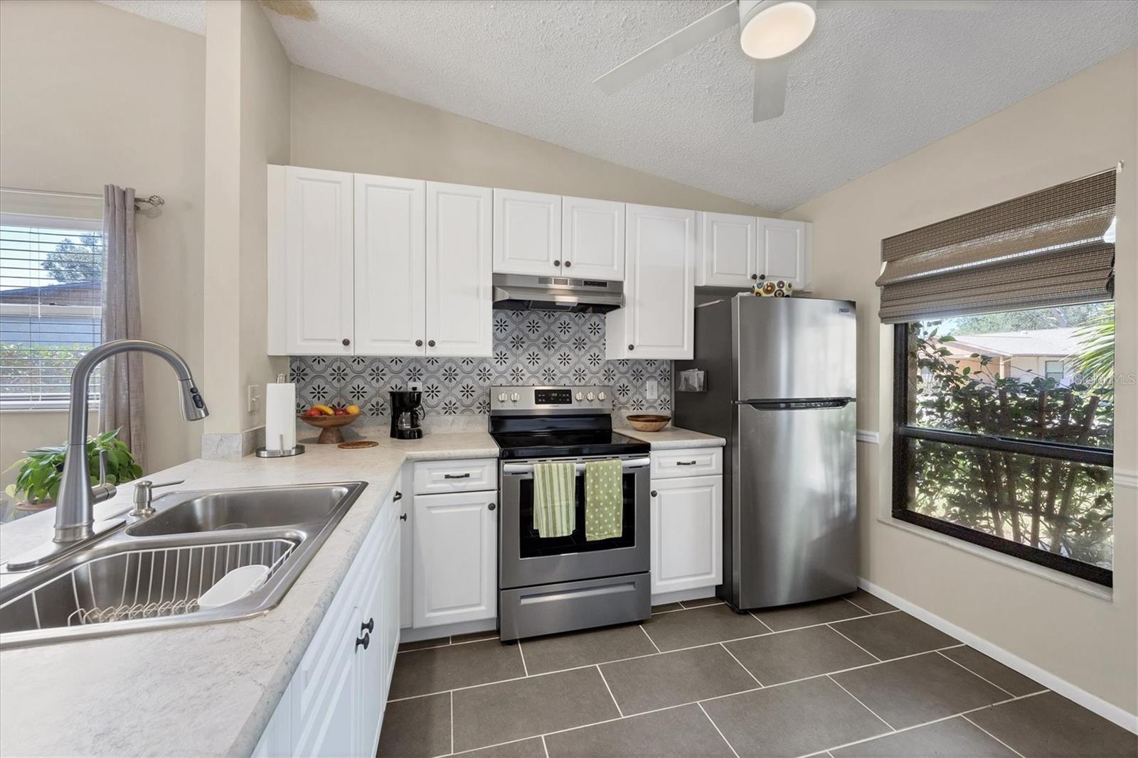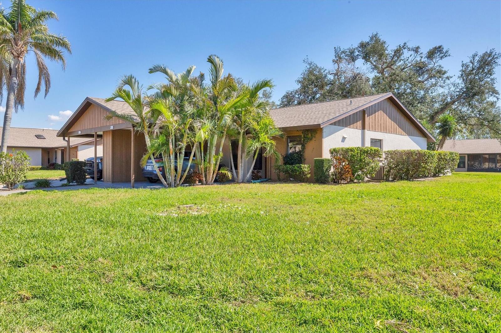 Newly reduced price. Great value on this charming, fully updated villa...an exceptional property that truly is a "must-see." Nestled in a peaceful cul-de-sac, this move-in ready home offers the perfect blend of privacy & convenience. Located in the over 55 community of Curry Cove, you will enjoy maintenance-free living with a spacious yard, lush tropical palms and private under cover parking. Enjoy the serene outdoors with a covered & screened South facing lanai that opens onto an oversized, fully fenced courtyard...ideal for gardening, relaxing or grilling with friends and family. The home was COMPLETELY RENOVATED in 2021 featuring a new open kitchen, all new cabinetry, countertops & appliances, new bath with new shower, toilet, vanity, lighting & brushed nickel fixtures, all new engineered hardwood flooring throughout w/tile in wet areas, newer AC system, and NEW ROOF in 2023. This inviting villa is light & bright featuring a welcoming entry foyer, lots of windows for maximum sunlight, a stylish design, vaulted ceilings, fans in main living areas and on patio, laundry room, and also comes with plenty of storage space. Enjoy the Florida lifestyle, as this villa is located just a few miles from Nokomis Beach and historical downtown Venice, offering easy access to shopping, dining, recreation & medical facilities. The community is complete with a heated pool and clubhouse. Whether you’re seeking a cozy winter retreat or a full-time residence, this villa offers the perfect combination of comfort, convenience, and privacy in one of Florida's most desirable locations. No flooding or damage from recent storms, FLOOD ZONE X (no flood zone) and pet friendly community. Truly a gem of a property with reasonable fees and a coveted location.