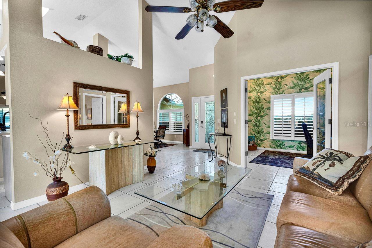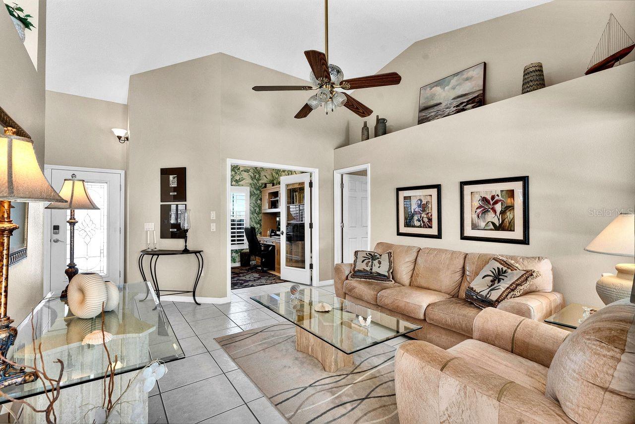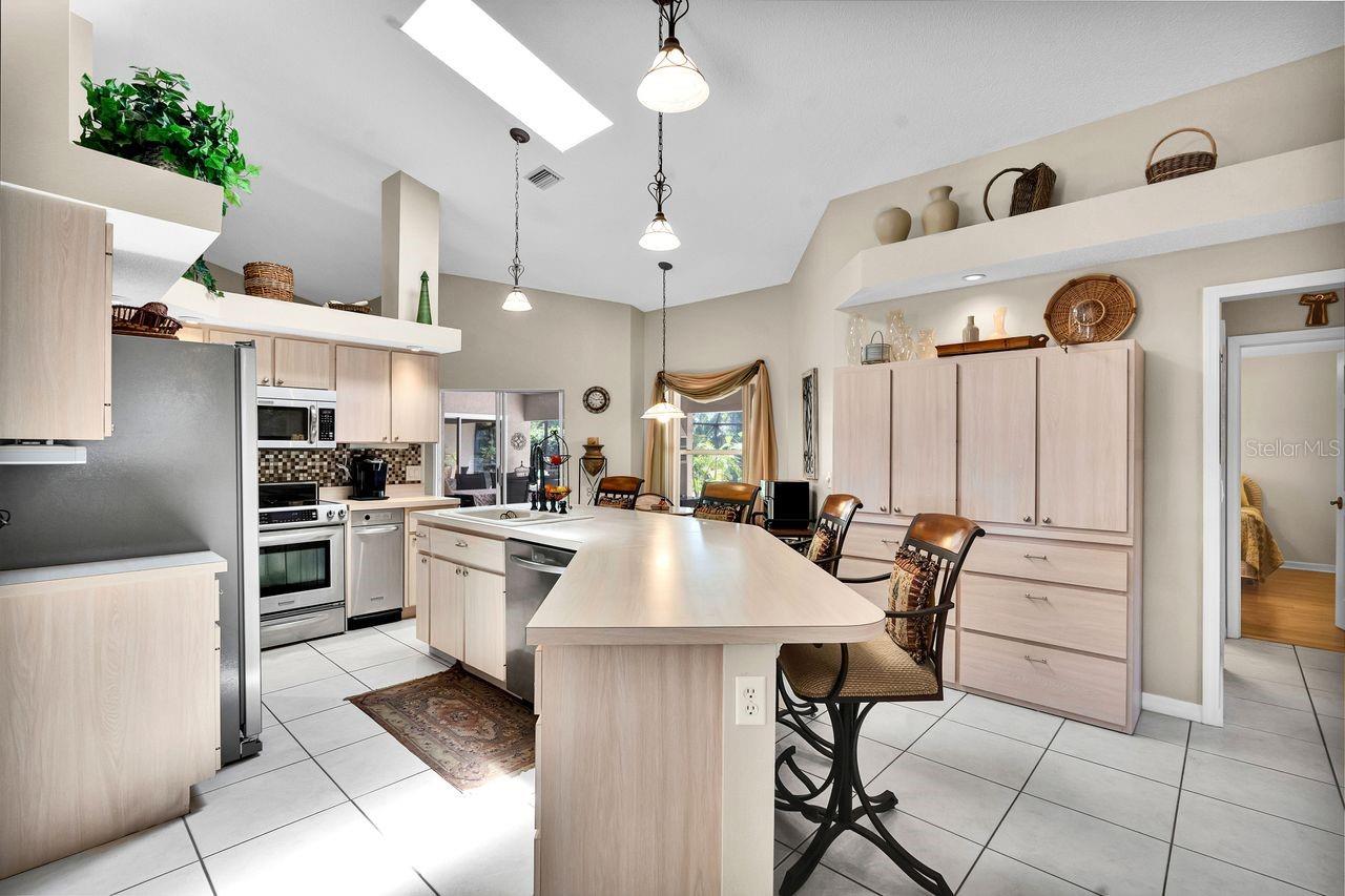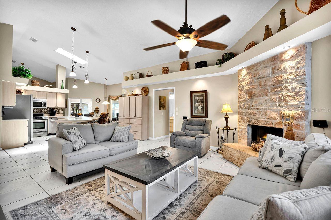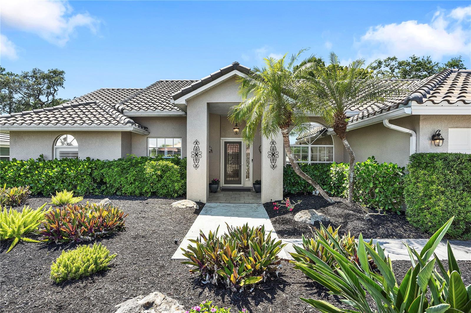 Now available in the desirable community of Laurel Woodlands is a custom 3-bedroom, 2-bathroom furnished pool home with over 2000 square feet of beautiful living space. The pleasing curb appeal and entry welcome you into the foyer where you’ll experience an instant feeling of spaciousness with skylights and lofty cathedral ceilings. Enjoy the benefit of a flexible floor plan with multiple living and dining spaces to suit your lifestyle. The gorgeous natural stone fireplace is the highlight of the family room and within view of the large open kitchen. The generous kitchen island accommodates many and prep space and cabinetry are plentiful. Updated stainless appliances and a breakfast nook with views out to the lanai serves chefs and guests well. A formal dining room supports more upscale occasions and the separate living room provides yet another gathering space. French doors lead to a dedicated office with convenient built-ins for organized storage. An impressive primary suite not only has a bathroom with soaking tub and shower but a separate sitting area overlooking the lanai for enjoying morning coffee or quiet afternoons with a good book. There's room for guests plus privacy with the split bedroom plan and two well-appointed bedrooms both with walk in closets. Step outside to your own private and peaceful paradise with lush tropical landscaping in the sizeable backyard. The main event here is your sparkling heated pool with covered outdoor entertaining area, direct access to the hall bathroom, classic travertine pool deck and large screened lanai cage installed in 2022. Other important updates include garage door, irrigation control panel and well pump, refrigerator, AC system, pool filter and pump plus in 2022 a new tile roof. This quiet neighborhood has a fantastic location with access to several area beaches, waterfront dining, quaint downtown Venice shopping, good schools, quality medical services and I-75. Schedule a private showing to see this incredible property!