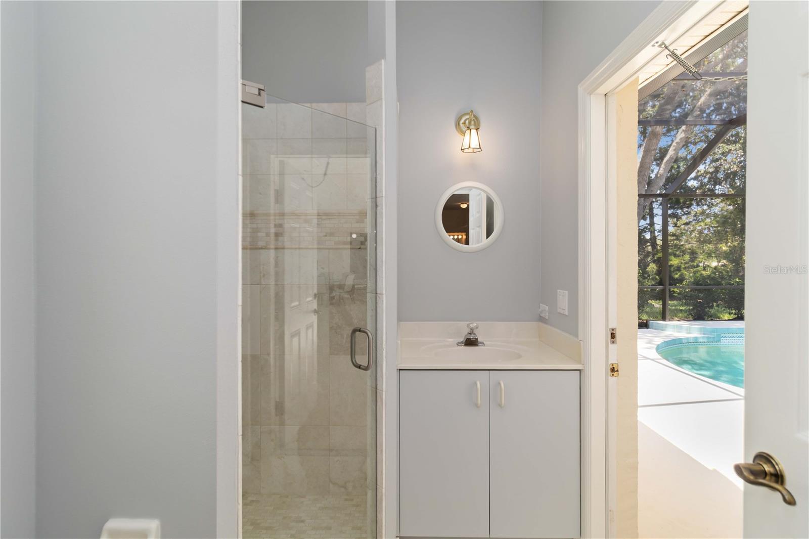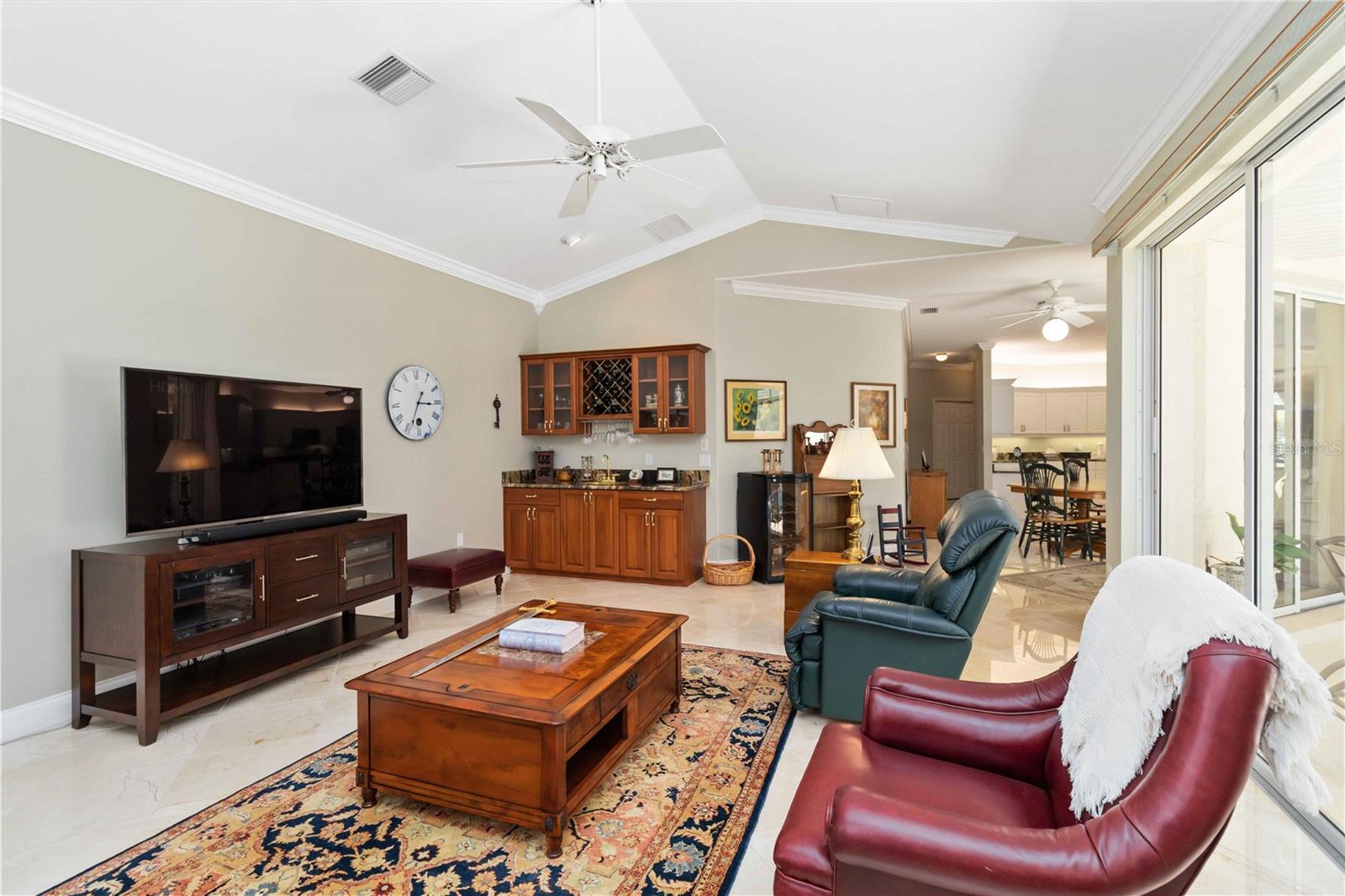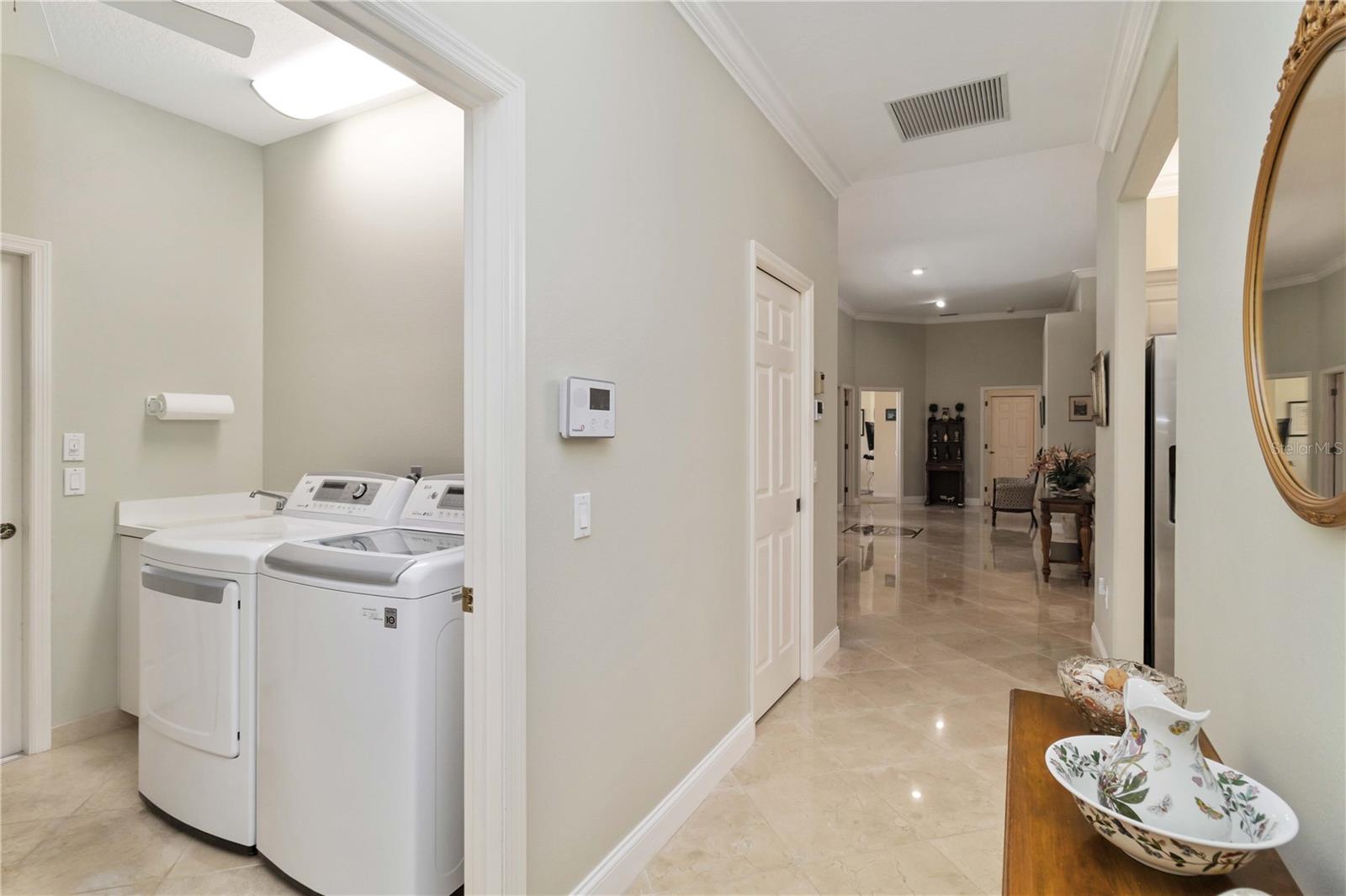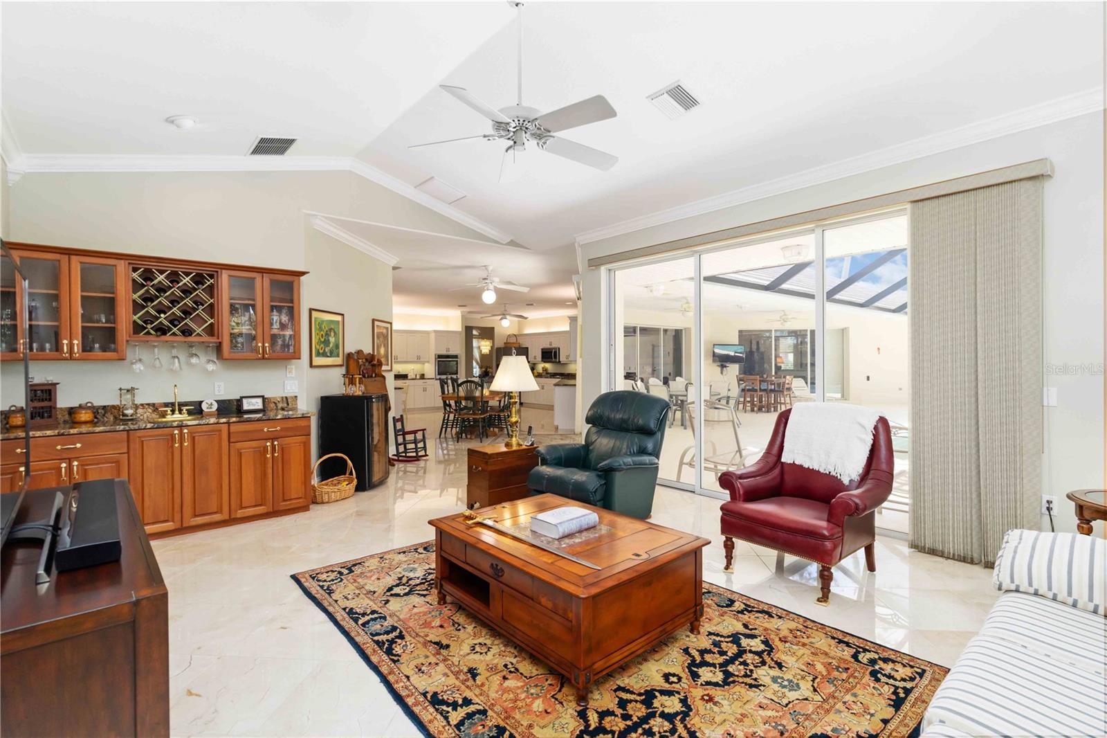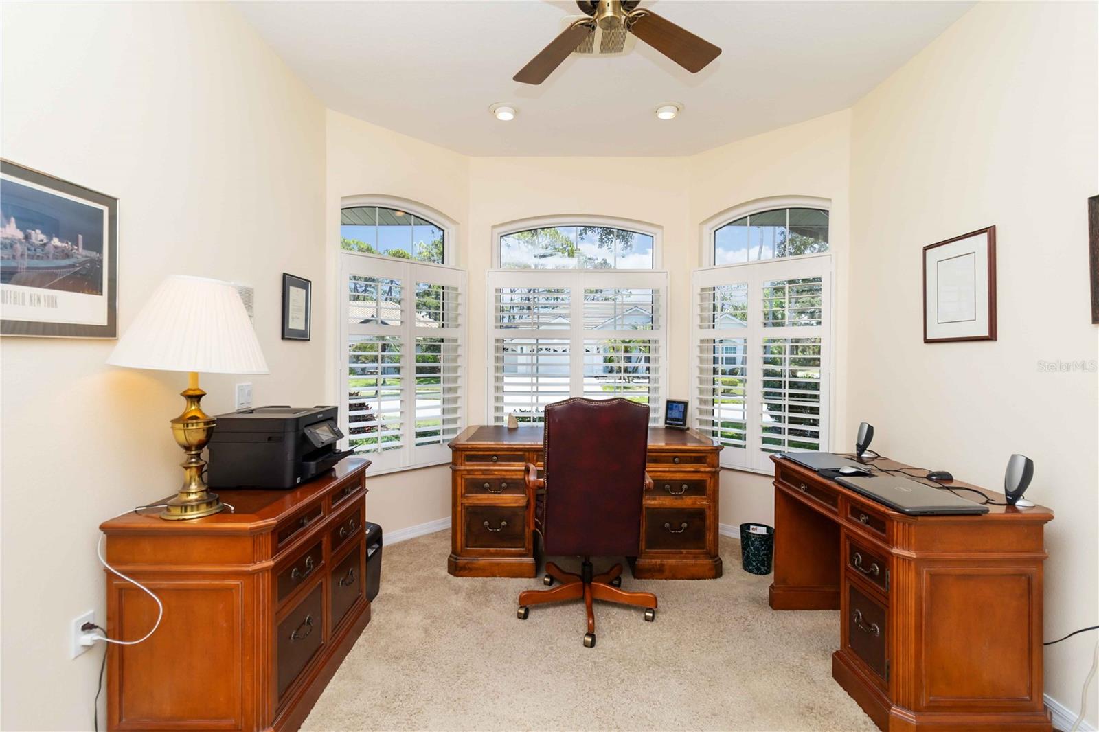 Nestled within the esteemed Calusa Lakes community, 2067 Tocobaga Lane in Nokomis is a meticulously designed and maintained 3,466-square-foot residence that seamlessly blends luxury and functionality. This expansive home features three bedrooms, an office, and 3.5 bathrooms. This magnificent, upscale home on a heavily treed lot reflects custom craftsmanship from the medallion inlaid tiled front porch with a new electronic lock and brass door hardware to the large 411 sq. ft. PebbleTec surfaced, heated saltwater pool in a new (2025) 150 mph rated cage with extra fine screening to keep out no-see-um’s. This is one of the largest lanais in Calusa Lakes. The lanai overlooks the 13th fairway of Mission Valley CC, it is well lit and has ceiling fans and outdoor speakers. Inside, the home has imported marble flooring with high baseboards and crown molding throughout the main living areas. The bedrooms and den are carpeted. The expansive kitchen/eating area is a cook’s dream with all stainless-steel appliances, a granite center island and counter tops, a five-burner propane stovetop, under and over cabinet lighting (the over cabinet is adjustable LED), abundant cabinet storage, a walk-in pantry, and a motion sensor activated Kohler faucet above the double stainless-steel sinks. The eating areas easily seat nine guests. The family room has a wet bar with a wine rack and glass storge unit above the sink. Pocket sliding doors open out onto the lanai. A large panoramic, impact resistant four window set overlooks the golf course. The formal living and dining rooms exude elegance; the living room also has pocket sliding doors opening onto the lanai. There are ceiling fans throughout the home. The large master bedroom has two walk-in closets and offers a serene private retreat with pocket sliding doors opening onto the lanai, plantation blinds (including for the pocket doors) for privacy, and two full bathrooms. One of these is a pool bathroom that opens to the lanai for entertaining convenience. The master bath includes dual vanities, a jetted tub, a large walk-in tiled shower with a handheld unit/a rainmaker shower head/and three body spray heads combination as well as a private area for the commode. One of the two guest bedrooms has a walk-in closet. The guest bathroom has a mosaic tile floor and tiled shower with both a rainmaker shower head and handheld unit. The entire guest area has plantation blinds. The bay window den overlooks the front of the home and has plantation blinds. There is also a large laundry room complete with a sink. A new roof was installed in 2019 and a new energy efficient HVAC system in 2020. The HVAC system includes three programmable thermostats for the three zones in the home as well as a high efficiency filter and UV light. The oversized garage accommodates two cars and has a large additional area (678 square feet) ideal for a workshop or extra storage. The home has a robust security system installed with a glass break detector and motion sensors as well as dual control pads; one is in the master bedroom. There is a central vacuum system as well. You will be conveniently located 8 minutes from Sarasota Memorial Hospital’s Venice campus, I-75, and US 41. Calusa Lakes is a semi-private golf course community located near beautiful beaches, shopping, churches, fine dining, and the Legacy Trail for biking and hiking. This home is the complete package – a must see.