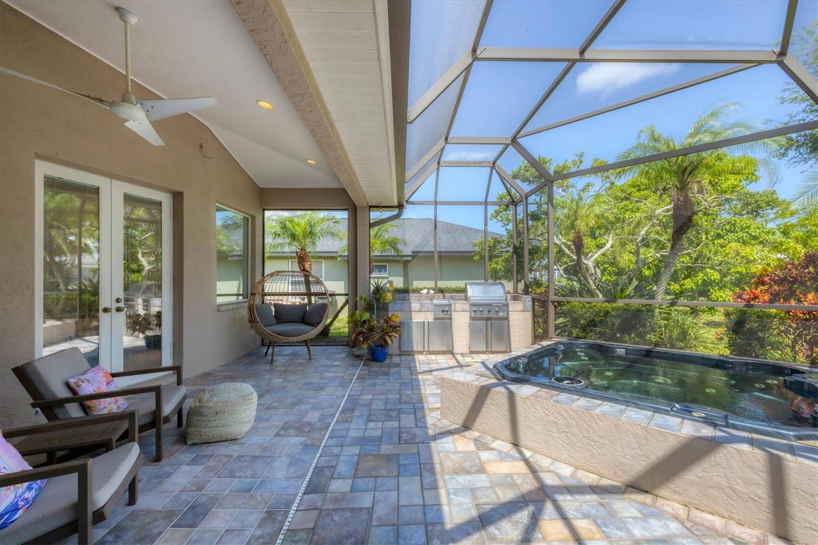 Motivated Seller! This is the one you've been waiting for! An incredible opportunity to own a stunning, contemporary ranch home with coastal accents in the desirable Sorrento Bayside community just minutes from white sandy beaches and blue gulf waters. Bursting with natural light and charm, this beautifully updated home features soaring vaulted ceilings, an open concept layout, and a split bedroom floor plan that offers a blend of space, style and privacy. The kitchen is a showstopper with a large center island ideal for everything from quick breakfasts to hosting friends and family. Recent upgrades include a sleek standing seam metal roof (2020), and HVAC system (2022), newer washer and dryer, fresh interior paint, and modern tile flooring throughout. French doors and expansive windows flood the space with sunshine, giving the home a bright, breezy feel. Go outside to your private backyard oasis featuring a huge, screened lanai, built-in hot tub, and a fully equipped outdoor kitchen ideal for entertaining or simply unwinding under the stars. Just a short distance away, you'll find Nokomis Beach and Casey Key, along with a variety of waterfront restaurants and local favorites. Whether you're seeking a year-round residence or a seasonal escape, this home delivers unparalleled access to the best of Florida's Gulf Coast lifestyle. Make this your next adventure.