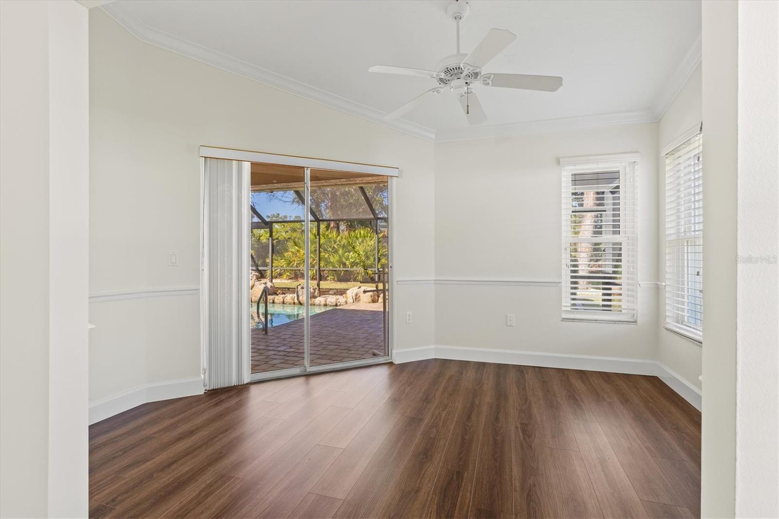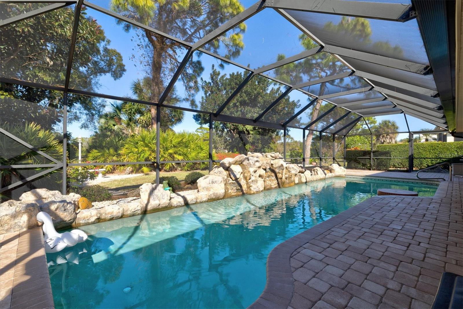 Welcome home to Calusa Lakes, a sought-after gated golf community nestled along the 5th fairway and set on a spacious 0.28-acre lot. This stunning pool home welcomes you with a circular driveway and a 3-car garage, including a dedicated third bay that’s perfect for your golf cart. Inside, you’ll find nearly 2,400 square feet of beautifully refreshed living space featuring fresh paint throughout, soaring ceilings in the great room, and stylish upgrades like brand-new crown molding and 5 ½-inch baseboards. A separate dining room adds extra charm with a shiplap accent wall, while the kitchen shines with stainless steel appliances, rich wood cabinetry, and plenty of counter space for everyday living or entertaining. Just off the kitchen, a window-lined breakfast nook overlooks the pool area, creating the perfect spot to start your morning with a view. The spacious owner’s suite is a true retreat, complete with brand-new luxury vinyl plank flooring and a separate sitting area ideal for a home office, library, or cozy lounge. Sliding glass doors lead directly to the lanai, and the ensuite bathroom offers a spa-like feel with a large soaking tub, a glass-enclosed walk-in shower, and a generous walk-in closet. The split-bedroom floor plan provides much-desired privacy, and the guest bathroom conveniently offers direct access to the pool area. You’ll also love the indoor laundry room with ample storage and a sink, making daily routines easy and organized. Step outside to your own private oasis, where a screened-in paver lanai frames a sparkling pool complete with a rock waterfall feature and a swim-up bar table for ultimate Florida living. An outdoor bar area is ready for grilling and hosting, plus there’s an outdoor shower for added convenience after a day in the sun. All of this comes with beautiful golf course views of the 5th fairway, and peace of mind knowing the AC was replaced in 2024. Calusa Lakes offers low HOA fees, no CDD fees, and a naturally beautiful setting spread across 460 acres of mature pines and oaks, with community perks including 28 lakes, a semi-private 18-hole golf course with optional membership, Har-Tru tennis courts, and a clubhouse with dining. Perfectly located in Nokomis between Sarasota and Venice, you’re just minutes from I-75, shopping, dining, boating, the Legacy Trail, and the white sands of Nokomis Beach, plus the charm of Venice Island’s boutiques and restaurants. Schedule your private showing today and come experience the lifestyle this home and community provide.