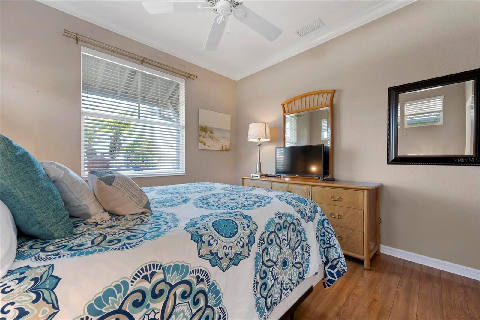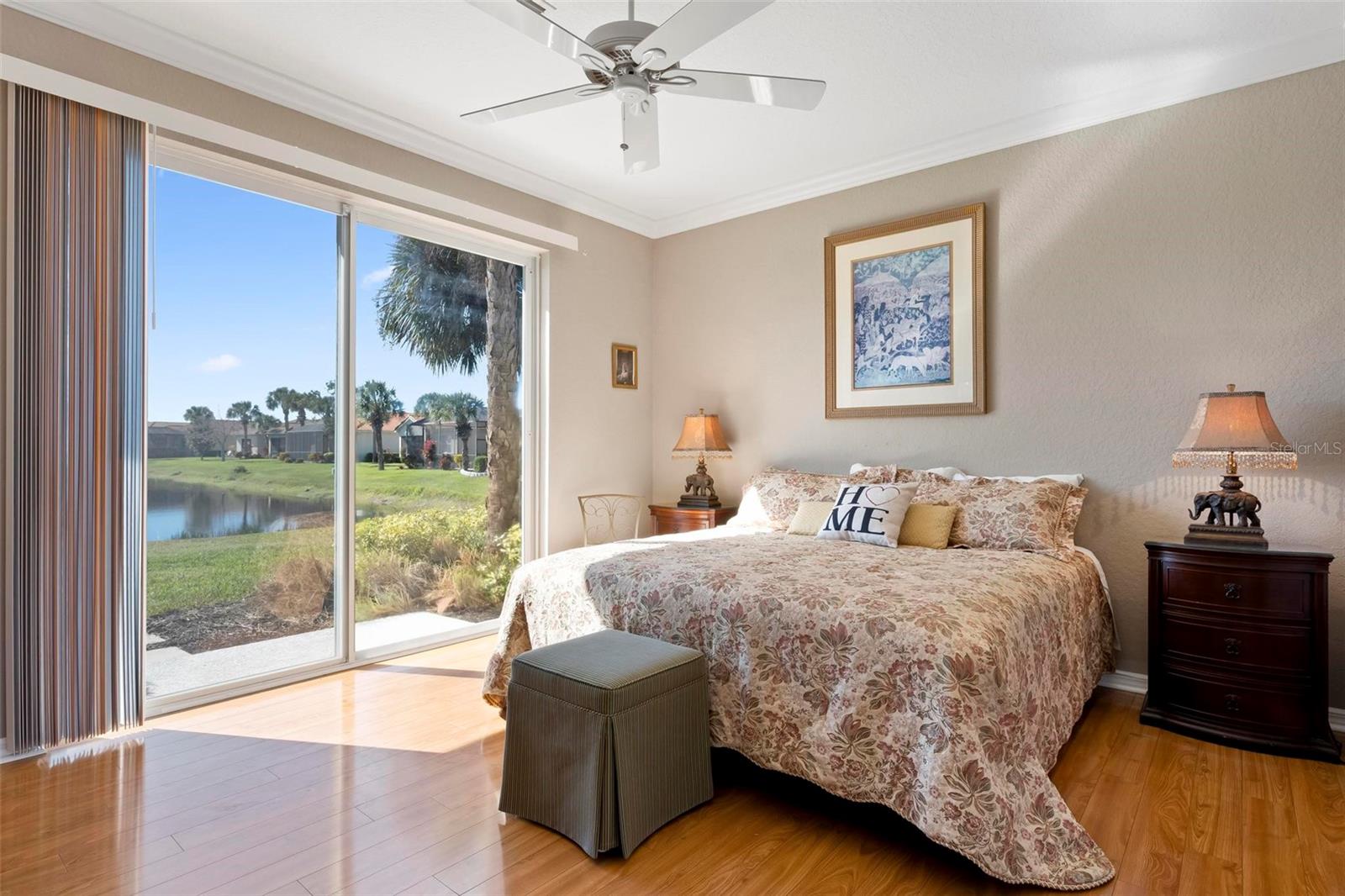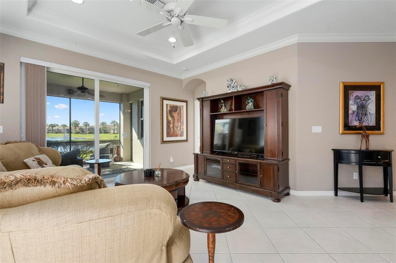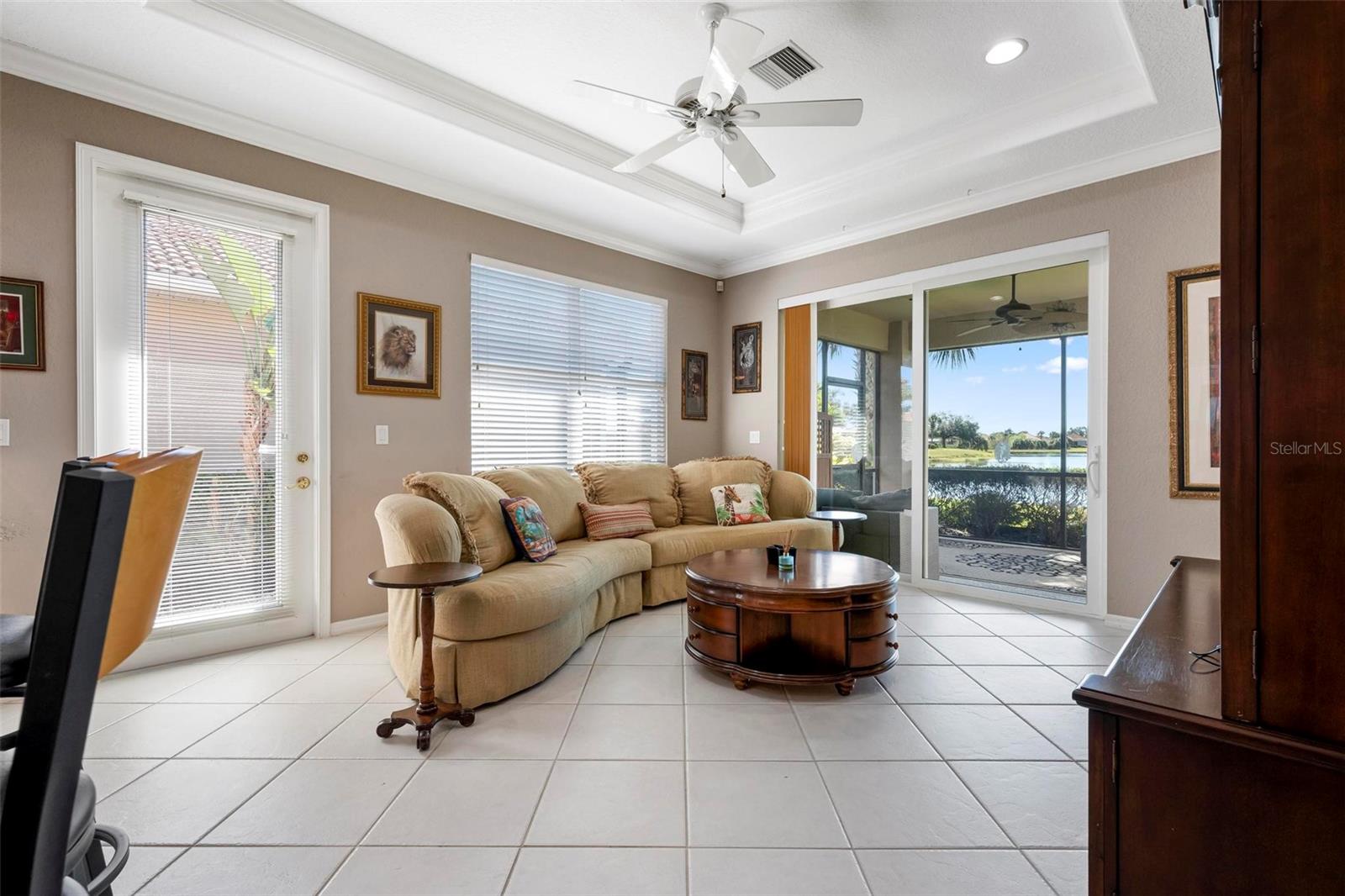 Step into this stunning, impeccably maintained home featuring an elegant open floor plan that seamlessly blends comfort and sophistication. The bright, airy interior flows effortlessly from the spacious great room and kitchen to a screened lanai with breathtaking, private deep lake views—inviting pure serenity. The great room boasts soaring coffered ceilings with rich 6-inch crown molding and abundant natural light through expansive windows, accentuating beautiful diagonal-laid tile flooring throughout the main areas. Bedrooms feature warm, newer engineered hardwood floors. Ceiling fans in living spaces, bedrooms, and lanai ensure year-round comfort. The inviting kitchen offers sleek Corian countertops, premium appliances (including a brand-new refrigerator and natural gas range), and overlooks the living area and peaceful lake. The oversized primary suite provides a peaceful retreat with generous proportions, a large walk-in closet, and large windows framing tranquil lake vistas like a living painting. Huge walk-in closets in the main bedrooms and a flexible den/office (with its own ample closet) that can serve as a third bedroom add versatility and abundant storage. Heavy duty garage door, overhead storage rack in garage, newer water heater, newer refrigerator. Every detail reflects meticulous pride of ownership. Nestled in the gated, resort-style Venetian Golf & River Club, this home delivers relaxed luxury daily. Enjoy a sparkling resort-style pool, dedicated lap pool, poolside Tiki Bar, well-equipped fitness center with classes, six Har-Tru tennis courts, dedicated pickleball areas (with lessons and group play), and a peaceful 74-acre nature park with scenic walking trails and a Myakka River boardwalk perfect for birdwatching and quiet strolls. The elegant Mediterranean-inspired River Club clubhouse offers casual lunches to fine dining with preserve and river views, plus vibrant year-round events, holiday celebrations, mixers, and a popular Sunday brunch with fresh omelets, mimosas, and abundant offerings. Optional membership is available for the championship 18-hole golf course with manicured fairways and challenging greens. Conveniently located minutes from charming downtown Venice’s historic district (boutiques, galleries, cafés, restaurants, community theater, festivals, bike paths), world-class beaches with soft sands, stunning sunsets, and fossilized shark teeth hunting, plus 24-hour guarded gate security and maintenance-free yard care—this community lets you relax and live like every day is a vacation!