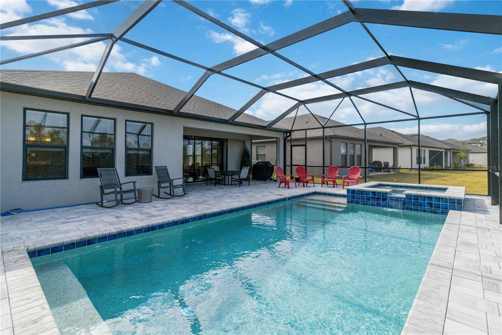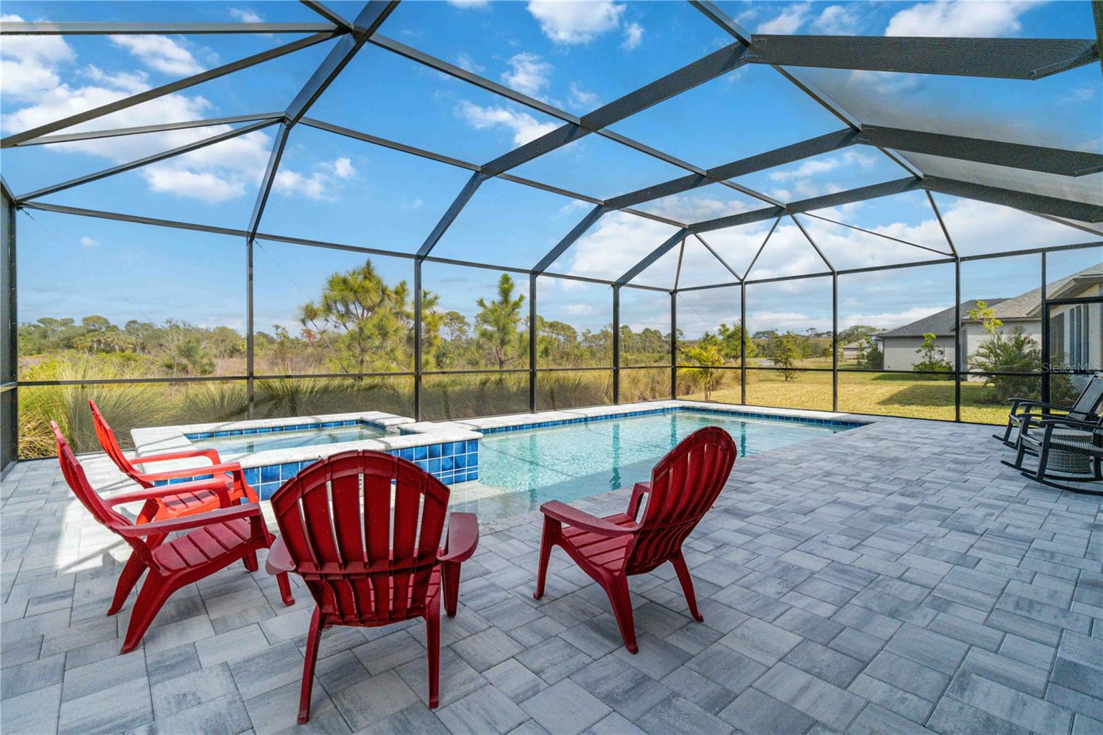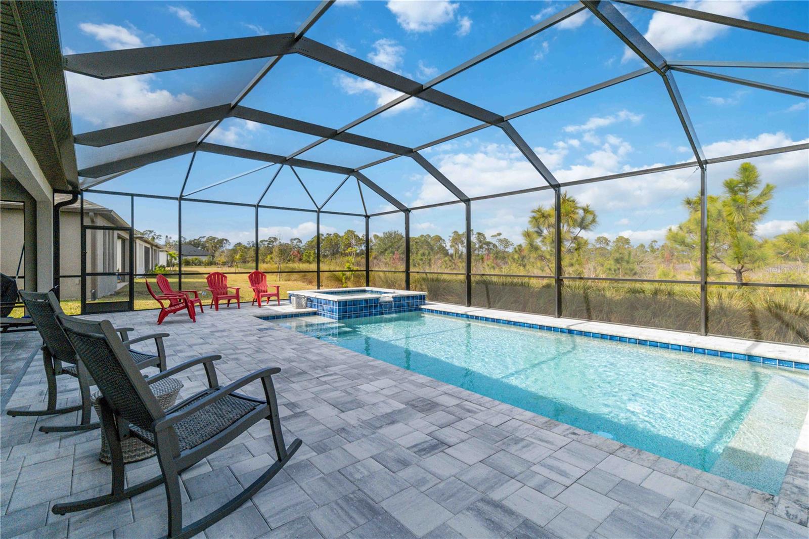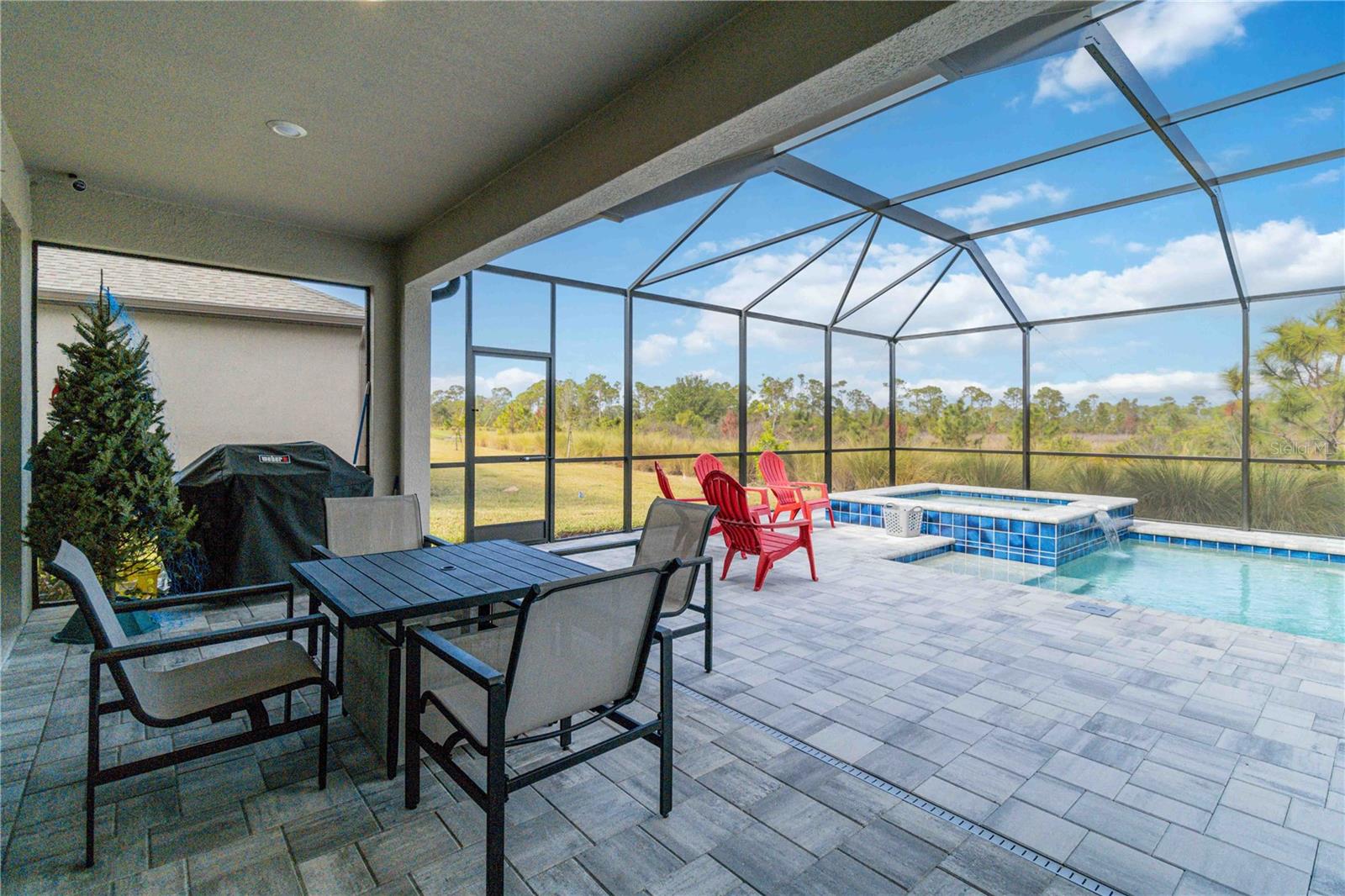 PRESERVE VIEW! HEATED CUSTOM SALT WATER POOL! 4 MILES TO THE BEACH. This stunning Antigua model by Taylor Morrison is located in the gated community of Palmero offering 2,400 sq. ft. of living space and 3,090 sq. ft. of total of luxury living with 4 bedrooms and 3 full bathrooms. The highlight of this home is the outdoor entertainment area custom designed by the seller with no expense spared. This piece of paradise features a custom 14x28 heated saltwater pool and spa, surrounded by a 28' x 40' caged paver deck and a natural preserve surrounded by Oscar Scherer Park for ultimate privacy. The pool and spa also feature a remote control system for easy control and for added enjoyment the lanai has the connections in place for an outdoor kitchen. Inside the home you will find an exceptional open floor plan accented with eight-foot doors and crown molding. A gourmet kitchen with gas stove, vent hood, upgraded refrigerator and center island. The chef in the family will love the additional coffee bar and oversized pantry room. This home also offers a flex room with French doors that is currently used as an office but also could be a wonderful hobby room or den. There are 4 bedrooms designed to promote privacy for everyone. The front bedroom serves as an ensuite with a generous bedroom and full bath, while central in the home you will find two additional guest bedrooms that share a full bath. The Master Bedroom, located at the back of the home, provides serene views of the pool and wildlife. The Master Bathroom includes dual sinks, a walk-in shower, and a deep soaking tub, with access to a custom walk-in closet and the utility room for added convenience. Built to 2023 code standards and situated in a coveted FLOOD ZONE X, the home offers full hurricane protection and peace of mind. Although it is just minutes to the Gulf beaches, this 2023 new construction sits in a high and dry neighborhood with no flooding. Palmero offers a range of amenities, including a resort-style pool, spa, volleyball and basketball courts, a playground, and fire pit, all with a LOW HOA and NO CDD fee. The pet-friendly community also has its own dog park. Close to highly-rated schools like Pine View School for the Gifted and Laurel Nokomis School, as well as the new Sarasota Memorial Hospital of Venice, this home combines luxury and convenience.