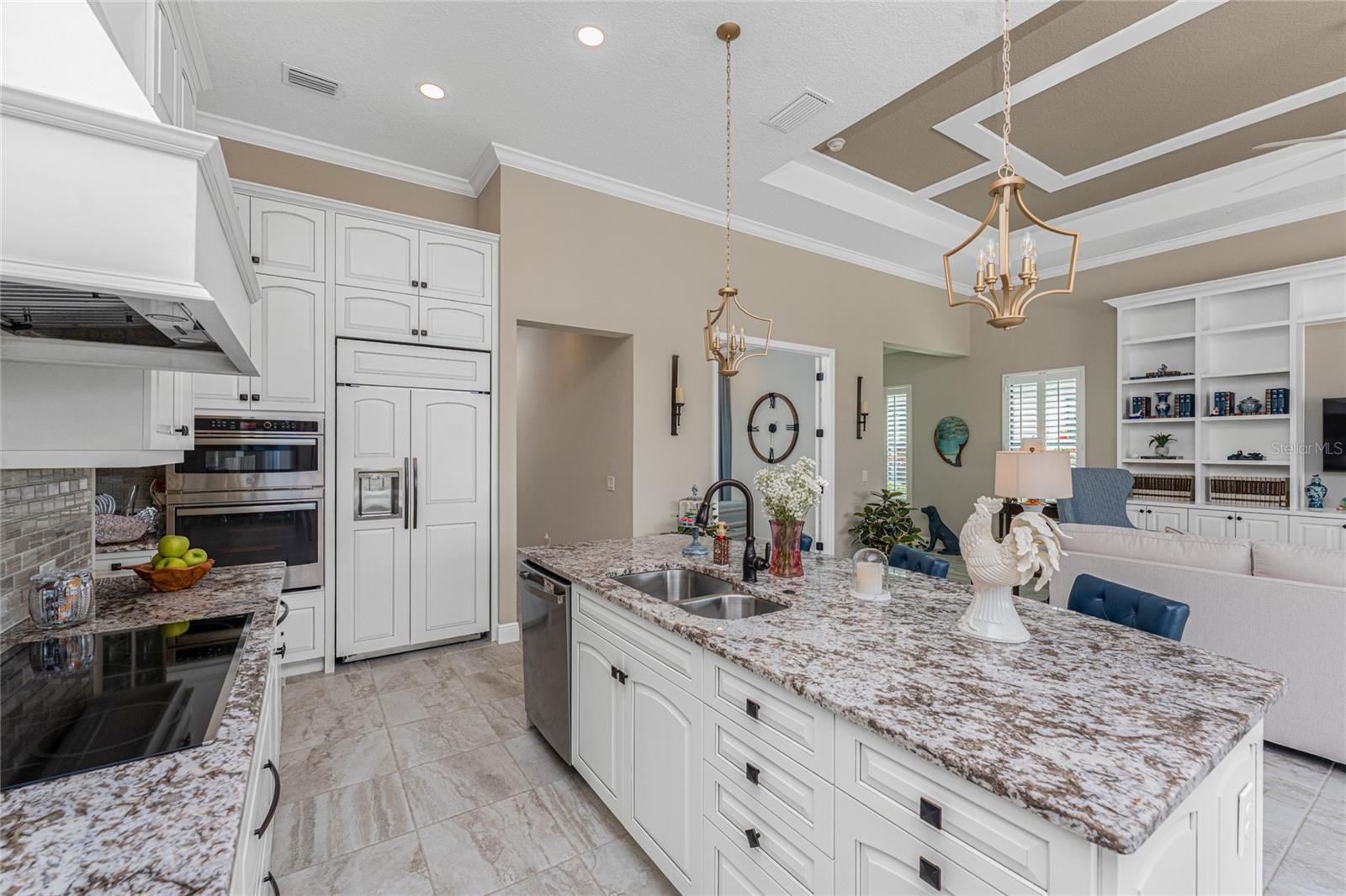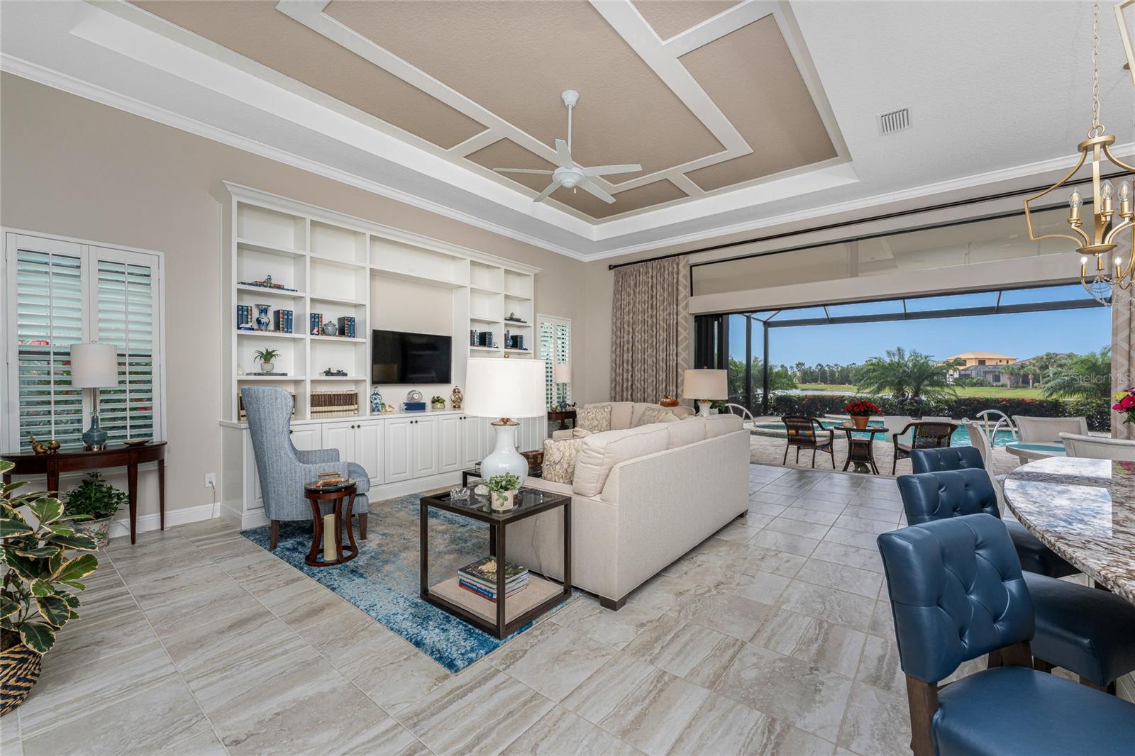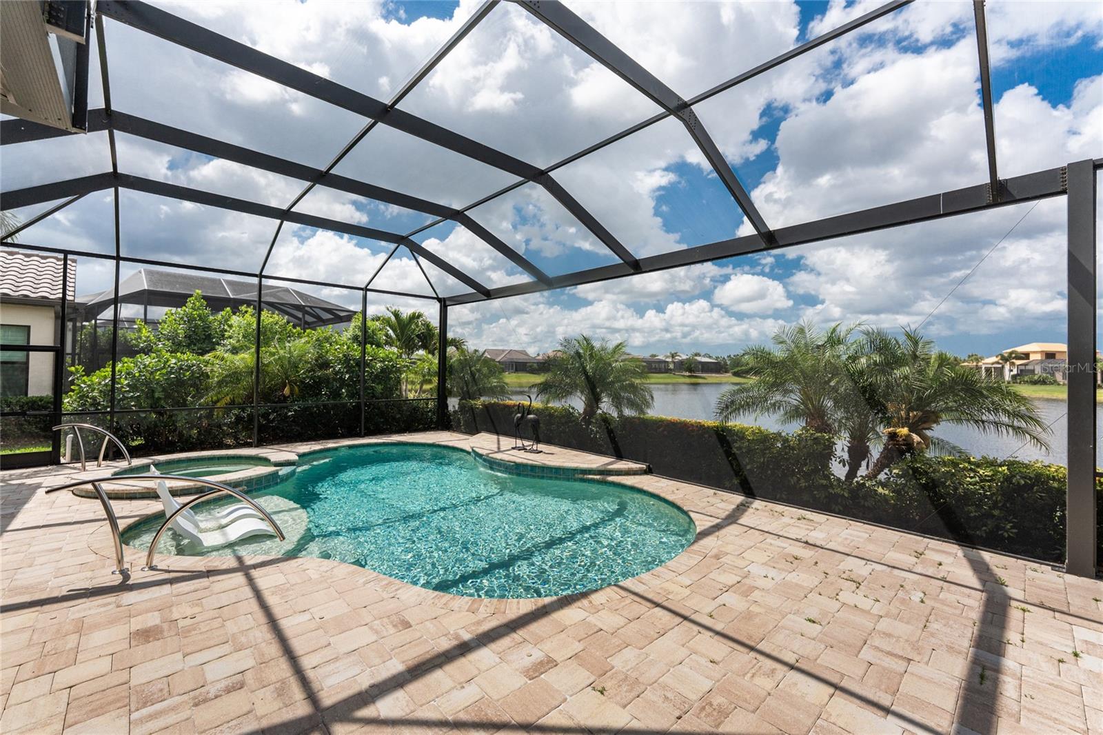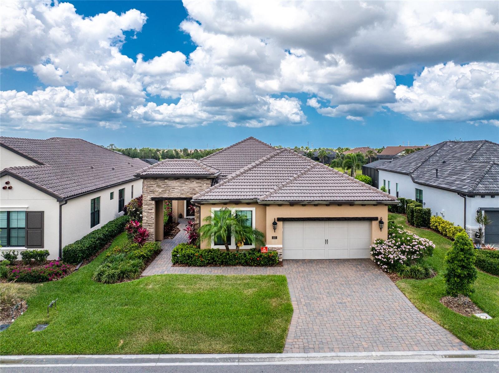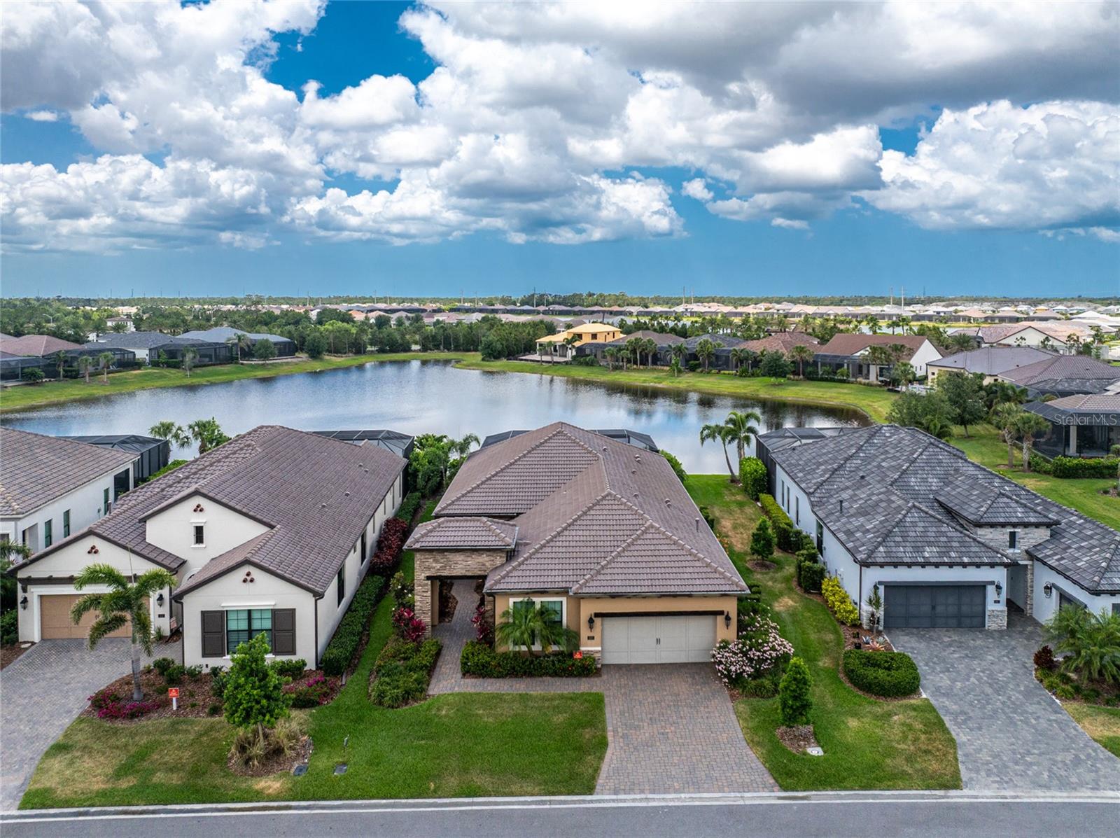 Experience unparalleled luxury in this stunning custom-built Neal Signature pool home, featuring 3 spacious bedrooms, 3.5 bathrooms—each bedroom with its own en suite—and a private in-law suite with separate entry. This thoughtfully designed residence showcases soaring 12-foot ceilings in the main living area with an elegant tray ceiling, a beautifully crafted built-in bookcase in the living room, 10-foot ceilings throughout the rest of the home, a gourmet kitchen with built-in ovens, crown molding, and upgraded solid core doors. The owner’s suite offers a serene retreat with dual walk-in closets and a spa-like bathroom featuring a huge walk-in shower. A dedicated office provides a perfect workspace, while the expansive lanai is an entertainer’s dream with an outdoor kitchen, panoramic screen enclosure, and tranquil lake views surrounding the pool and spa. Designed for durability and efficiency, the home includes hurricane impact windows for peace of mind. Located in Aria, a gated Neal Signature luxury community, residents enjoy access to a clubhouse, resort-style pool, pickleball courts, and a state-of-the-art fitness center. This immaculate home combines elegance, comfort, and versatility—don’t miss the opportunity to make it yours.