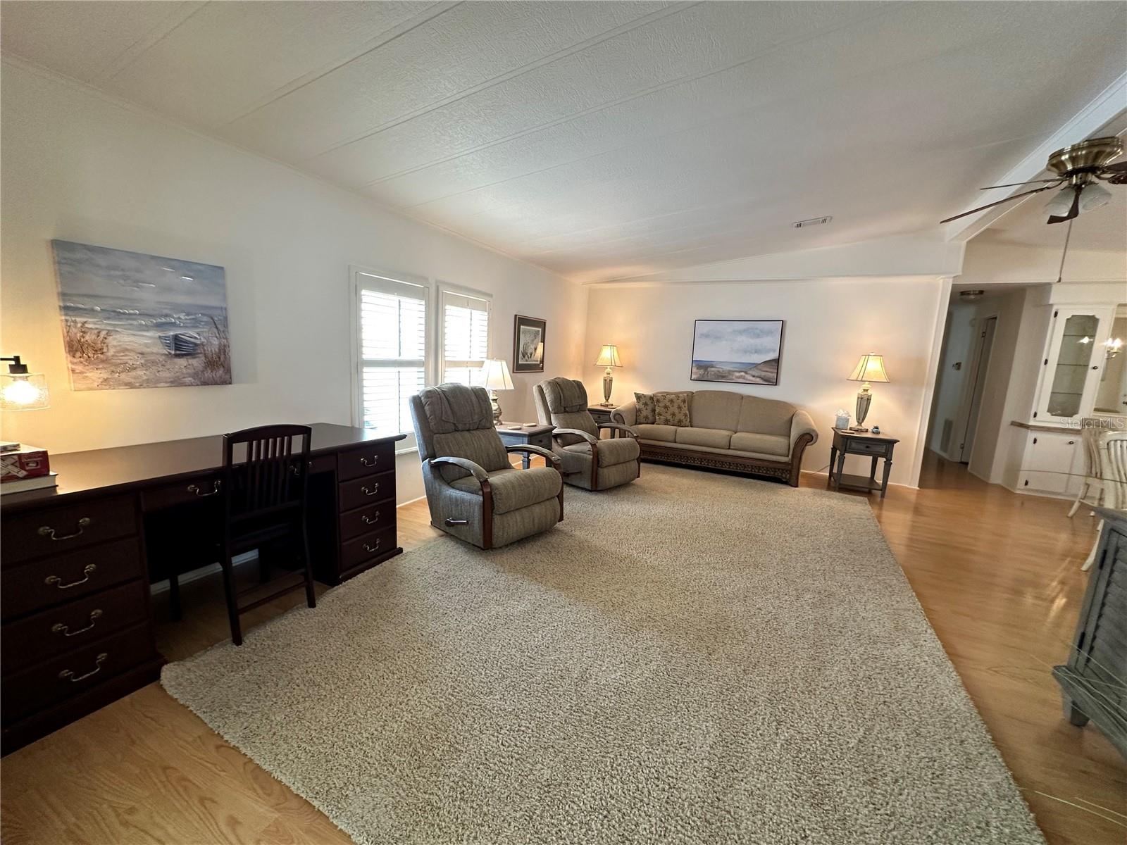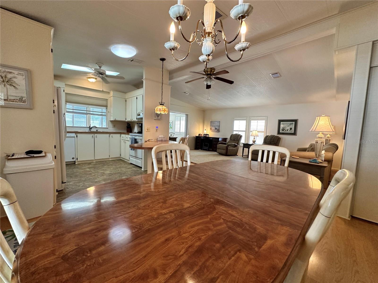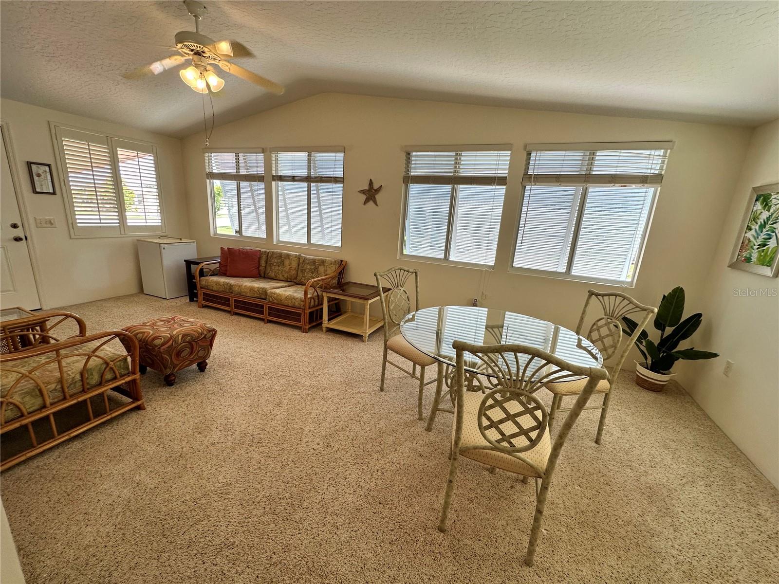 Beautifully decorated, this turnkey ready home is in a premier 55+ active, cooperatively owned community is just a hop in the car and minutes to beaches, shopping, restaurant, and I-75, yet hidden from public view! This new and completely furnished home with cathedral ceilings, skylight, laminate floors and newer carpeting in the bedrooms. Also has upgraded windows and plantation shutters in every room! The front screen room was converted to a wood framed family room with pass through window from the kitchen adding almost an additional 250 sq. feet of comfort for Florida living. Newer York A/C was installed in 2020. Metal roof over done in 2010. This home has an oversized shed divided into a spacious laundry room and large storage room with a workbench and shelving for storage. Sliding glass doors open in a screen room and a private backyard lined with trees for nesting birds. This gated community has numerous activities, all run by volunteers. The many amenities include a clubhouse, an oversized swimming pool with lap lanes, 24-hr fitness room, hot tub, game room, craft room, woodworking shop and outdoor activities like pickleball, shuffleboard and tennis. Now is the time to purchase your retirement home and start living the life you always dreamed of!