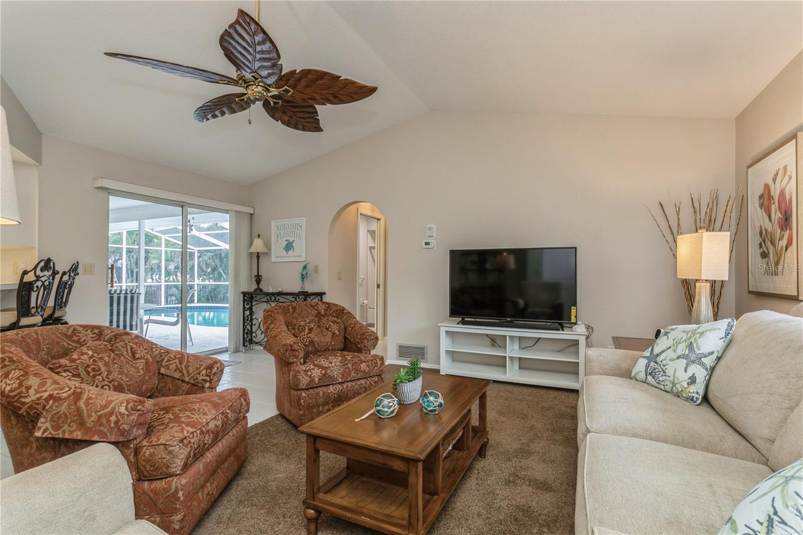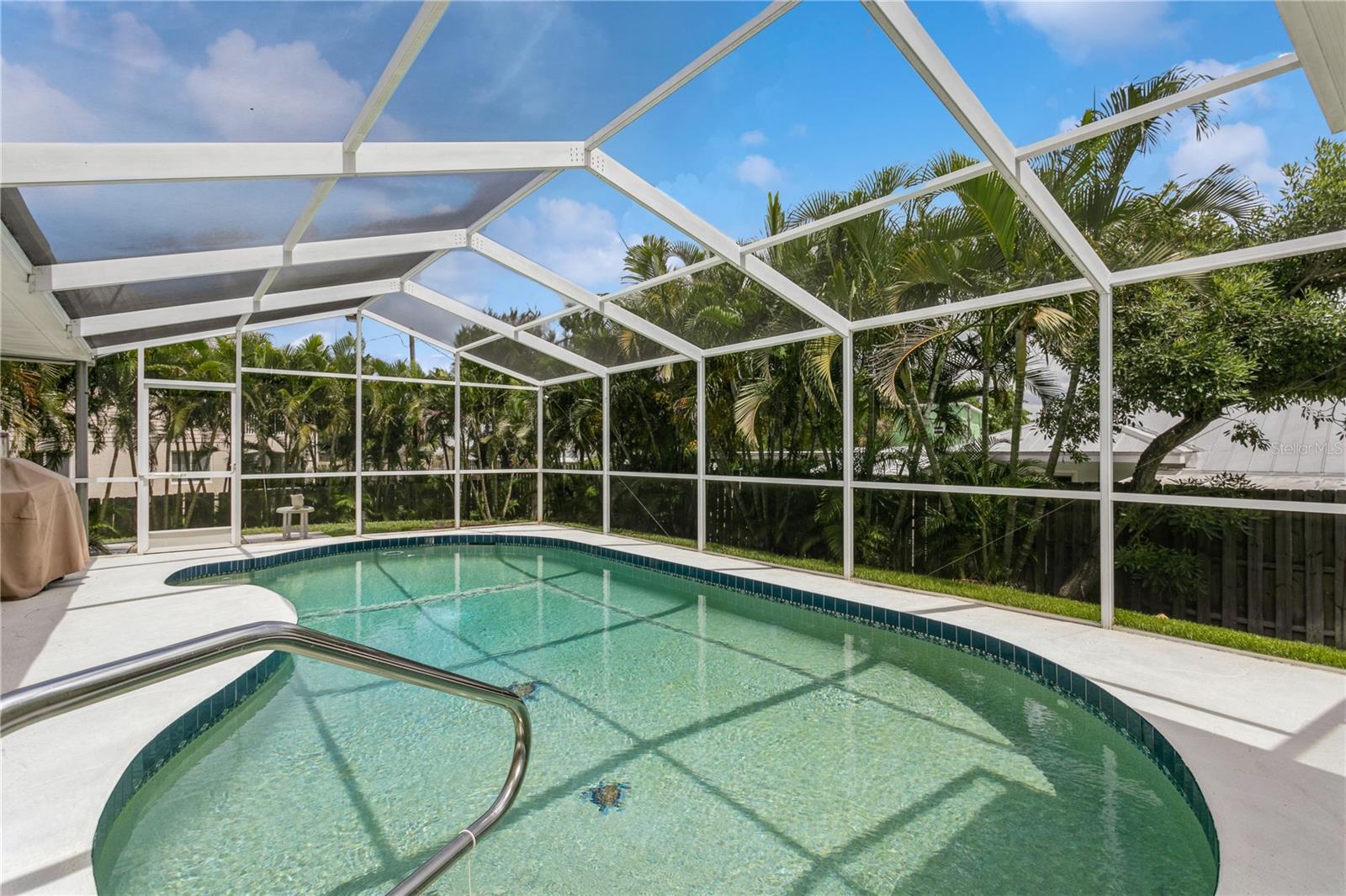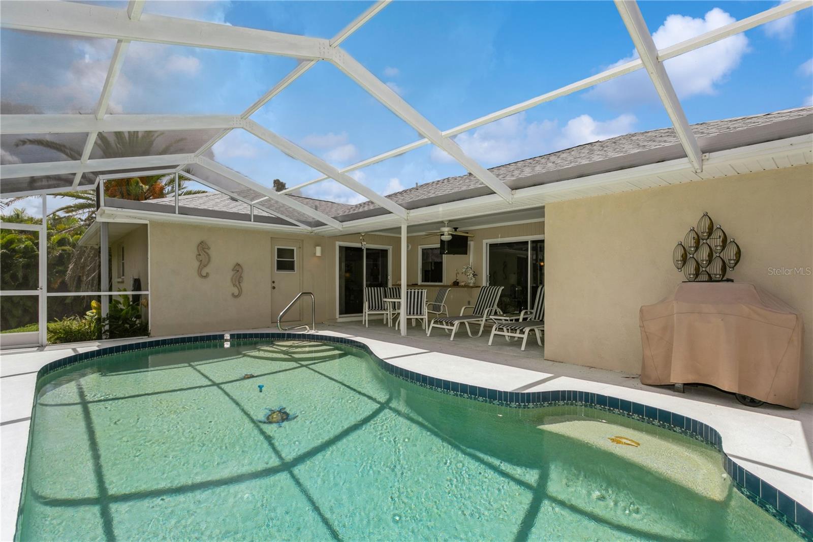 NOKOMIS BEACH IN YOUR NEIGHBORHOOD!public beach just one half (1/2) mile west on Albee Road to CASEY KEY, 2 bedroom, 2 bath home with 2 car garage, heated and caged swimming pool, built in 1990 and well maintained, some furniture and furnishings may be included, shingle roof installed September 2022, concrete block construction with stucco finish, NO NEIGHBORHOOD FEES, NO CDD, NO RULES AND REGULATIONS, single family residential use only, placed high above the street for good drainage and compliance for homes located in a designated flood zone, excellent curb appeal with attractive landscaping, Sarasota County central water service, septic tank, private well for sprinkling and irrigation, electric heat pump for swimming pool replaced March 2025, free form pool measures 14'x27', 3 sets of sliding glass doors open to the porch and pool area, kitchen is centrally located and has a pass through window to the covered porch and pool area, walk in closet in primary bedroom, "knock down finish" on the ceilings-no popcorn! This neighborhood flooded during hurricane Milton-but NOT this house because it is situated at a high elevation above sea level. located west of U.S. 41 with fast beach access, ride your bike or golf cart to the beach, plenty of free parking at NOKOMIS BEACH.