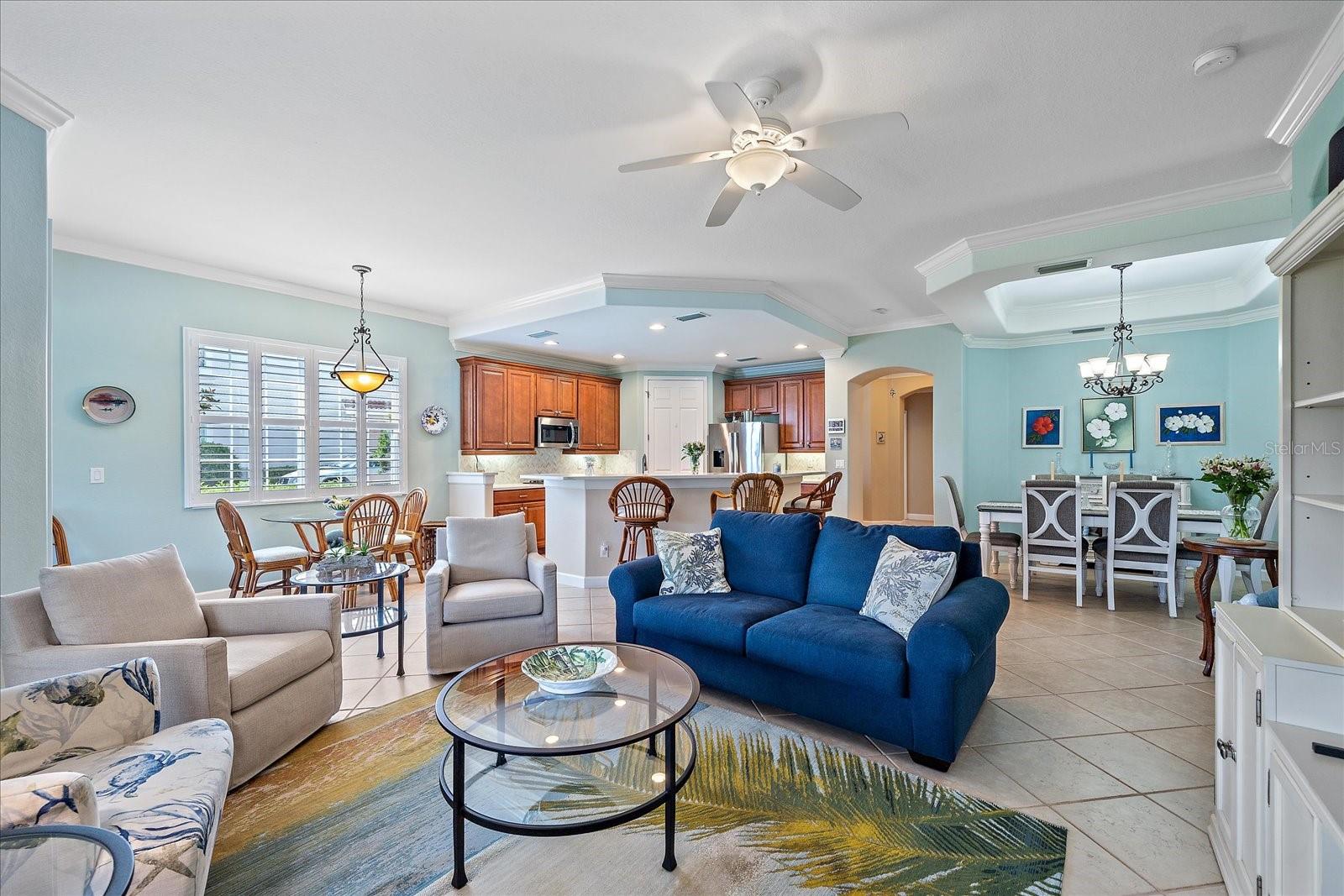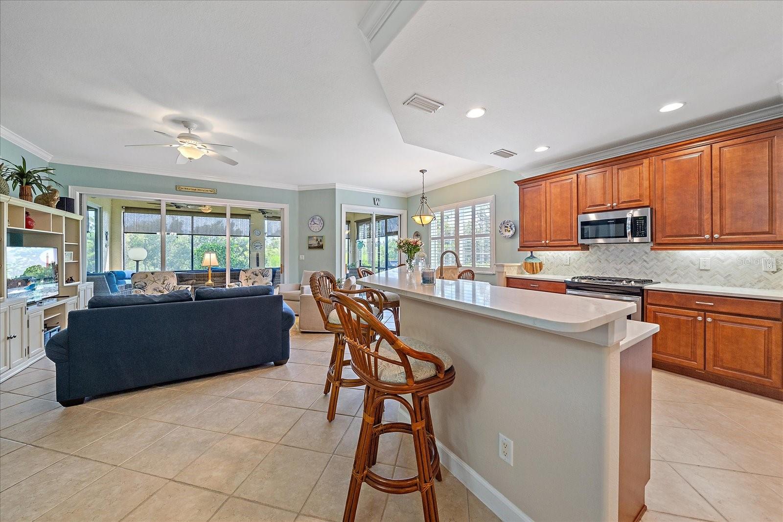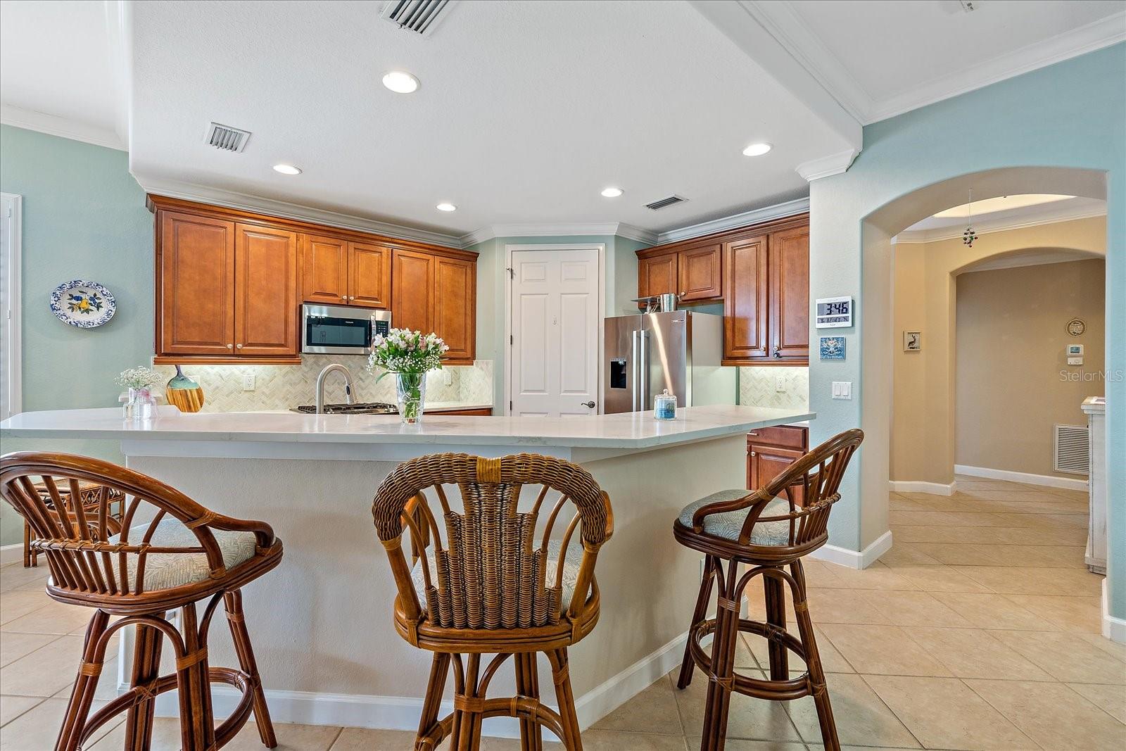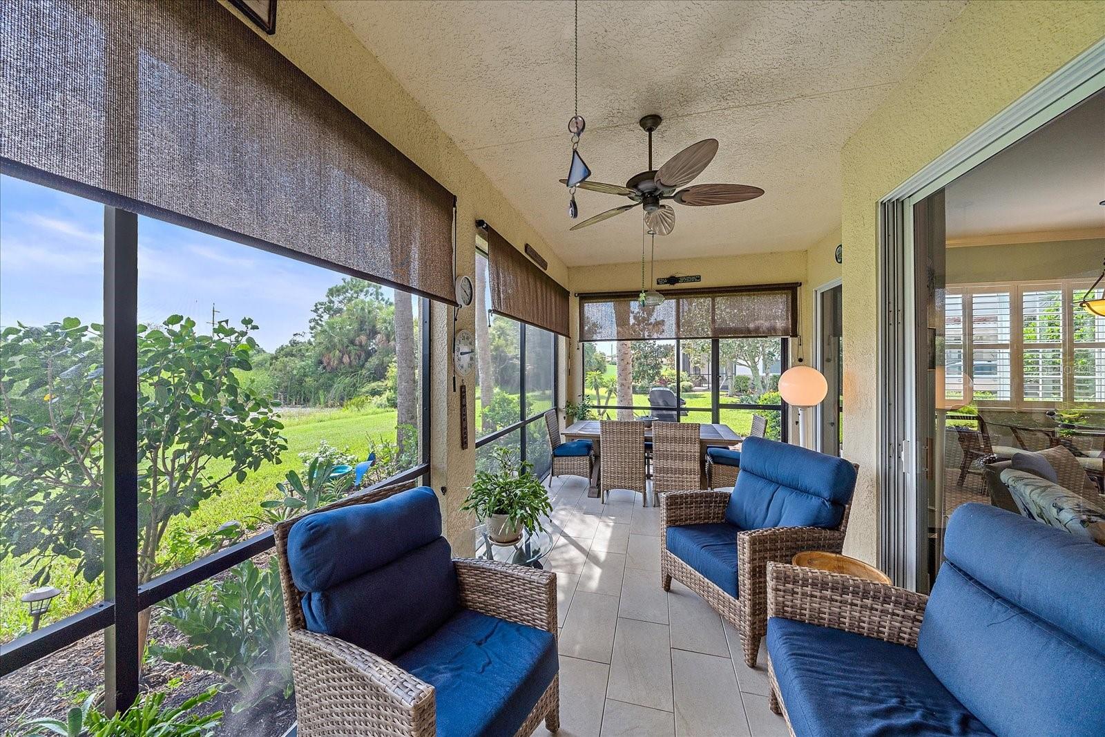 Welcome to your dream ground-floor condo where the Florida lifestyle meets comfort and luxury! This move-in ready home has been meticulously maintained and updated throughout the years. This community is filled with luxury amenities and serene landscape views. It's maintenance-free living at its finest, leaving you more time to enjoy life's pleasures. Nestled in the sought-after Venetian Golf & River Club, a 24-hour guard and gated community, in North Venice. Step inside this beautiful condo to discover a spacious Corsica floor plan spanning 1,753 square feet, featuring three cozy bedrooms and two pristine bathrooms. The living area greets you with high tray ceilings, hurricane IMPACT windows and sleek tile flooring, creating an airy and inviting atmosphere. Crown molding and plantation shutters add a touch of elegance throughout the home. The heart of this home is the kitchen, featuring soft-close cabinets with crown toppers, dazzling Quartz countertops that perfectly complement the stylish herringbone tile backsplash and a brand-new extended 20 inches quartz bar for casual dining or your morning coffee. A spacious walk-in pantry ready to hold all your gourmet ingredients and cookware. Modern appliances include a new Bosch refrigerator and a Kenmore gas cooktop ensuring your culinary exploits are both stylish and functional. The primary bedroom serves as a peaceful retreat, complete with recent updates like laminate flooring and a shade on slider for those lazy Sunday mornings. It also boasts an ensuite bathroom with a double sink vanity and a spacious walk-in shower, your own private spa day awaits every day! The additional bedrooms could be used as a den or office. They are both spacious and functional, featuring updated laminate flooring, ample closet space, and ceiling fans. Enjoy the screened-in lanai overlooking lush preserves, the perfect backdrop for your morning yoga or evening cocktails. The lanai is updated with tile flooring and roll-up shades, ensuring comfort and privacy. Living in this community means unparalleled access to resort-style amenities. Located just a short stroll from the River Club. Whether you fancy a dip in the heated pools by the tiki bar, enjoy a stroll through the 70-acre nature park, a game of tennis with friends, or a day spent on the 18-hole championship golf course, it's all available at your doorstep. Not to mention the Venetian River Club, where fitness and fun meet with facilities like a gym, Pilates classes, and more. Convenience is key, and this condo strikes the perfect balance between leisure and convenience. You'll have easy access to I-75, shopping, dining, The Legacy Trail, Venice Myakka River Park, and Sarasota Memorial Hospital - Venice Campus. Plus, you're never too far from Florida's stunning beaches and picturesque parks, providing endless opportunities for relaxation and recreation. One year home warranty included in the sale. So, if you're looking for a life of leisure and luxury, where every day feels like a vacation, make this beautiful condo your home, and invest in a Florida lifestyle where every day feels like a personalized retreat. Come find your slice of paradise here; you know you deserve it!