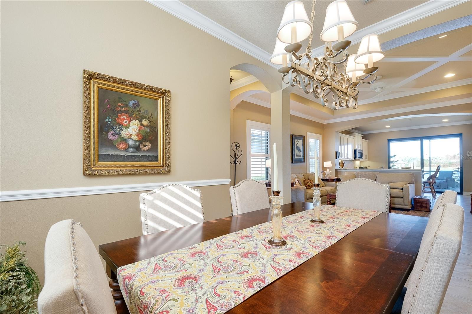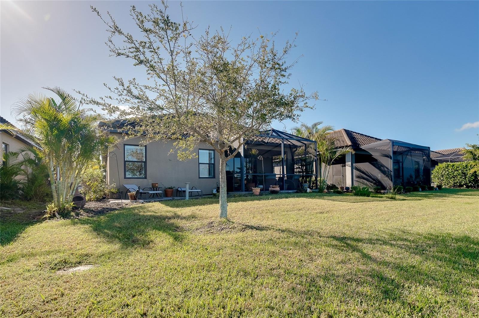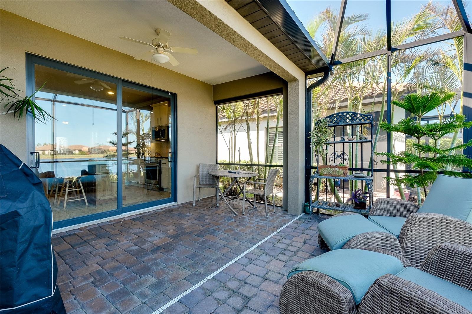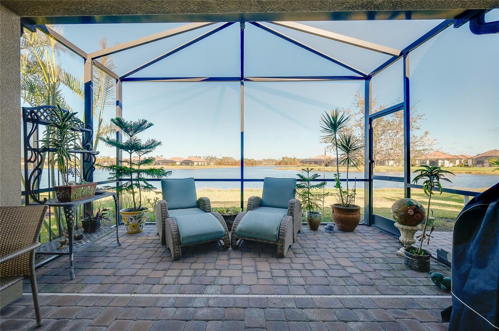 Welcome to the Milano Community, a beautiful, gated neighborhood featuring 456 homes. The amenities include pickleball courts, bocce ball, and a community center with a large pool and spa. The dog park offers shaded areas for owners to relax while watching their dogs play, keeping everyone out of the sun and rain. This tastefully furnished and immaculate 3-bedroom, 2-bathroom Liberty Model home has been beautifully upgraded with plantation shutters, hurricane windows, and crown molding throughout. The spacious living room features trey ceilings with exquisite woodwork. The dining room is also large and can be utilized as an office if desired. The layout includes two bedrooms and a bathroom that flow from the living area, providing a split design for added privacy. The kitchen is equipped with all stainless steel appliances, including a KitchenAid gas stove and refrigerator, as well as a GE dishwasher and microwave. It features an island that comfortably seats two, along with ample drawer and cabinet space, making it an ideal prep area for gourmet cooking. The primary bedroom is expansive and conveniently located off the kitchen, complete with a generous walk-in closet. The primary bathroom boasts a spacious walk-in shower, a double vanity, a linen closet, and a water closet. Built in 2017, this home encompasses 1,515 square feet and offers stunning views of the lake. The oversized screened lanai provides incredible lake views, and the additional pavered patio outside the lanai is perfect for sunbathing or setting up a grill.
