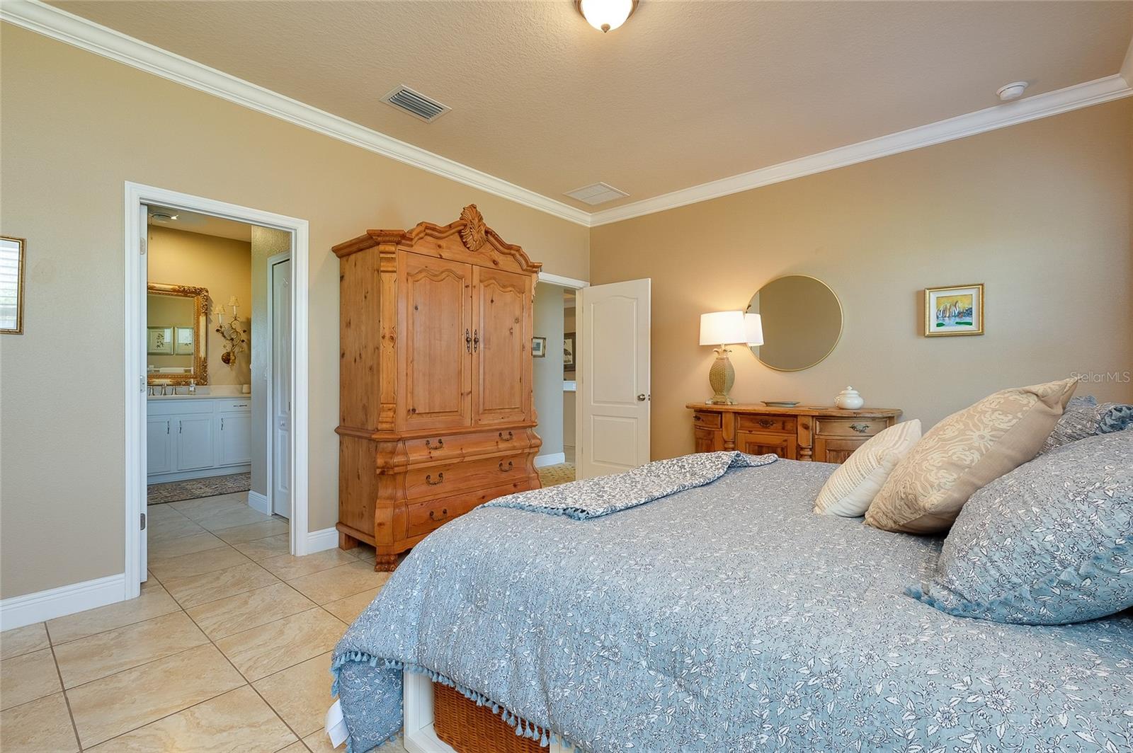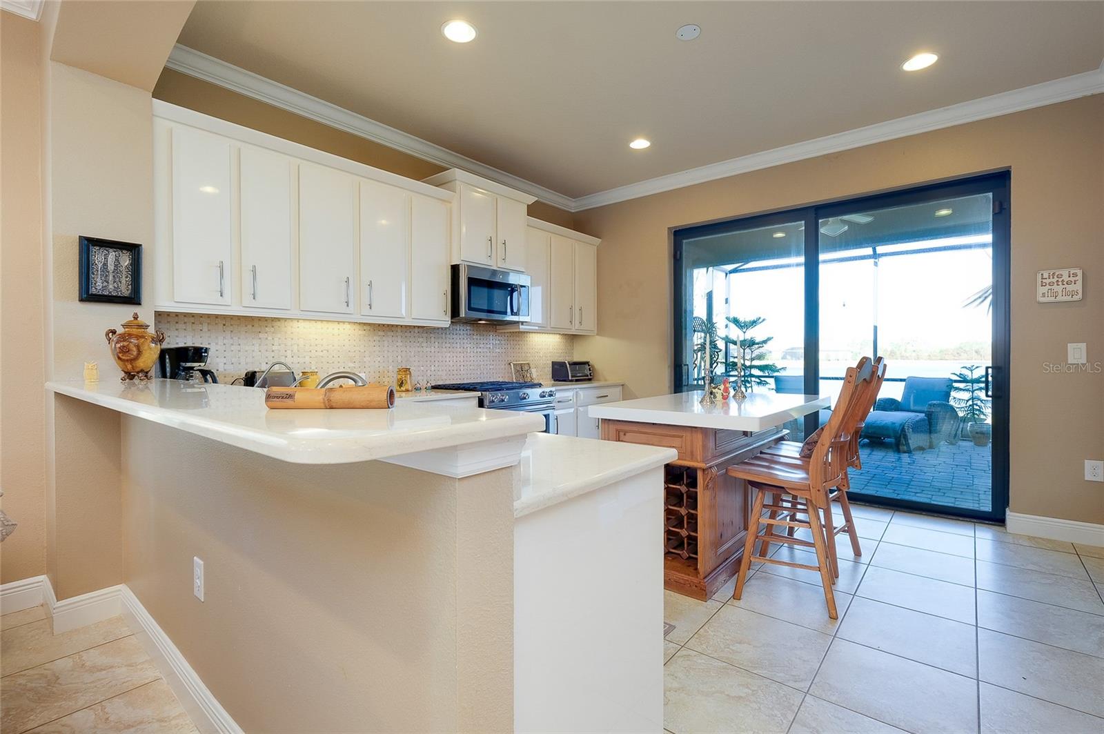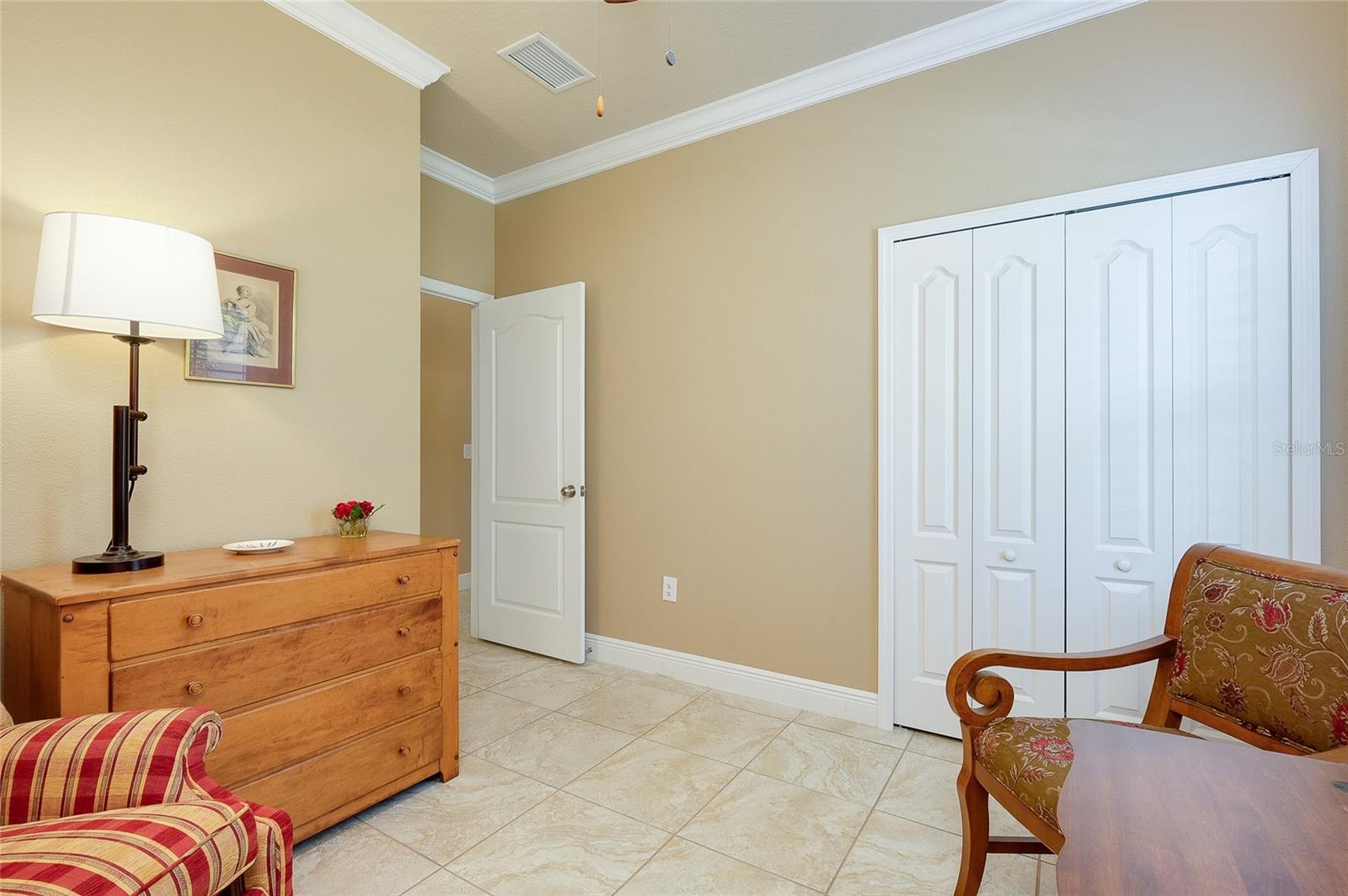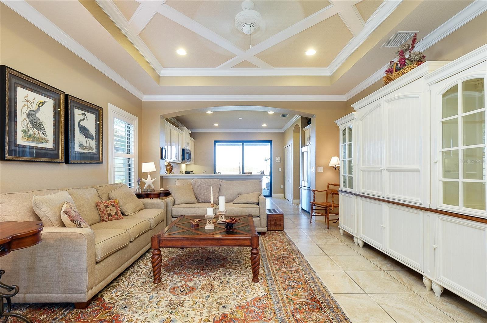 Welcome to the Milano Community, a beautiful, gated neighborhood featuring 456 homes. The amenities include pickleball courts, bocce ball, and a community center with a large pool and spa. The dog park offers shaded areas for owners to relax while watching their dogs play, keeping everyone out of the sun and rain. This tastefully furnished and immaculate 3-bedroom, 2-bathroom Liberty Model home has been beautifully upgraded with plantation shutters, hurricane windows, and crown molding throughout. The spacious living room features trey ceilings with exquisite woodwork. The dining room is also large and can be utilized as an office if desired. The layout includes two bedrooms and a bathroom that flow from the living area, providing a split design for added privacy. The kitchen is equipped with all stainless steel appliances, including a KitchenAid gas stove and refrigerator, as well as a GE dishwasher and microwave. It features an island that comfortably seats two, along with ample drawer and cabinet space, making it an ideal prep area for gourmet cooking. The primary bedroom is expansive and conveniently located off the kitchen, complete with a generous walk-in closet. The primary bathroom boasts a spacious walk-in shower, a double vanity, a linen closet, and a water closet. Built in 2017, this home encompasses 1,515 square feet and offers stunning views of the lake. The oversized screened lanai provides incredible lake views, and the additional pavered patio outside the lanai is perfect for sunbathing or setting up a grill.