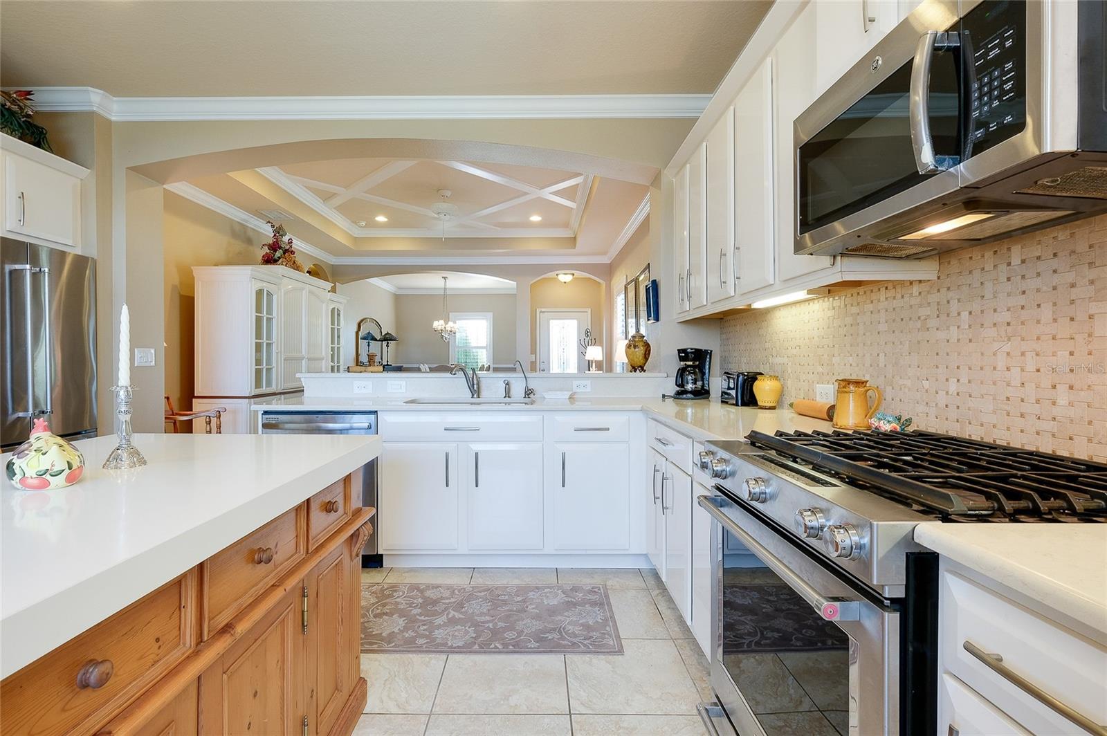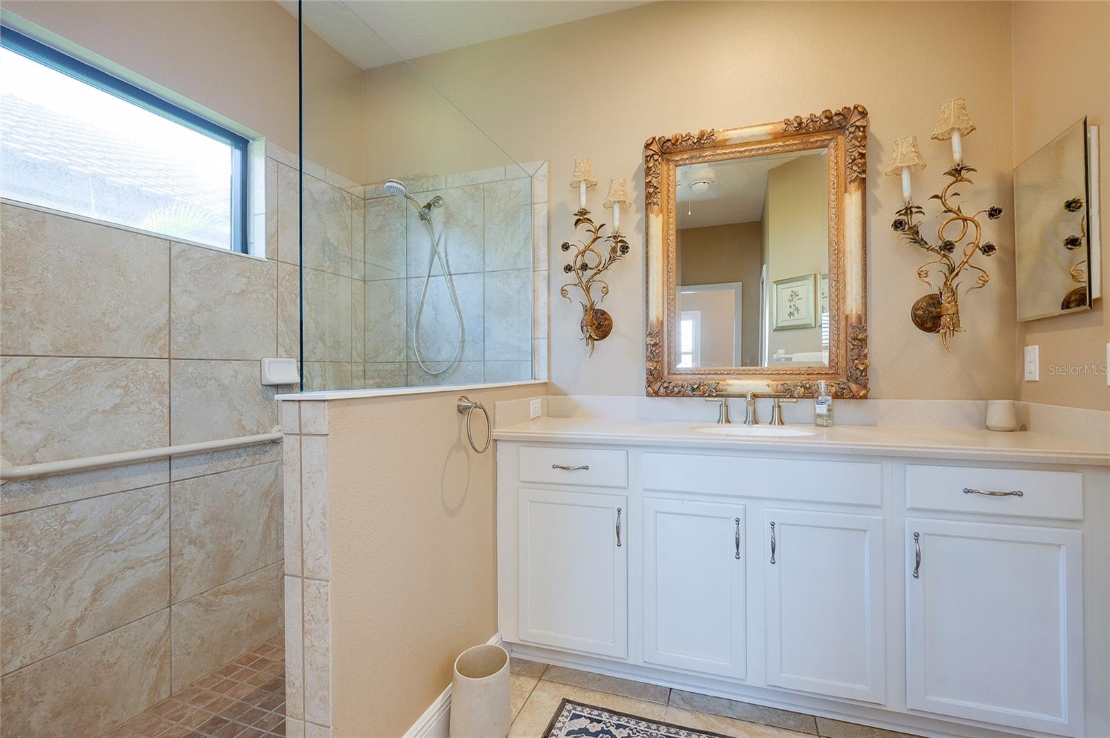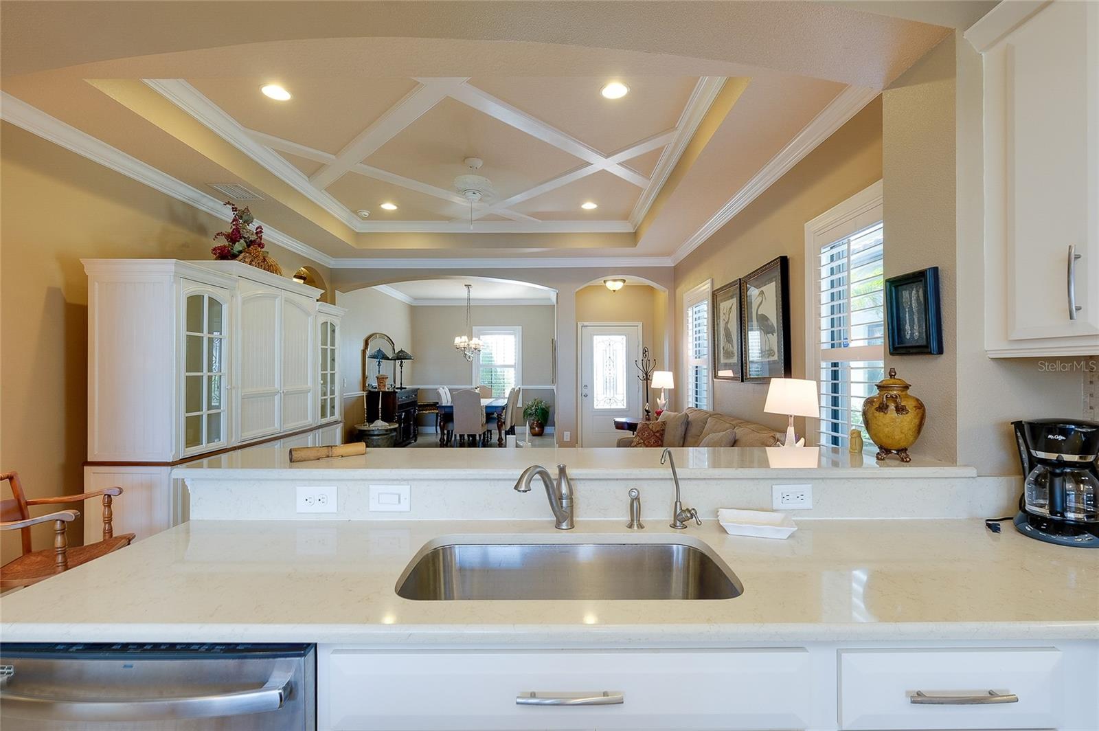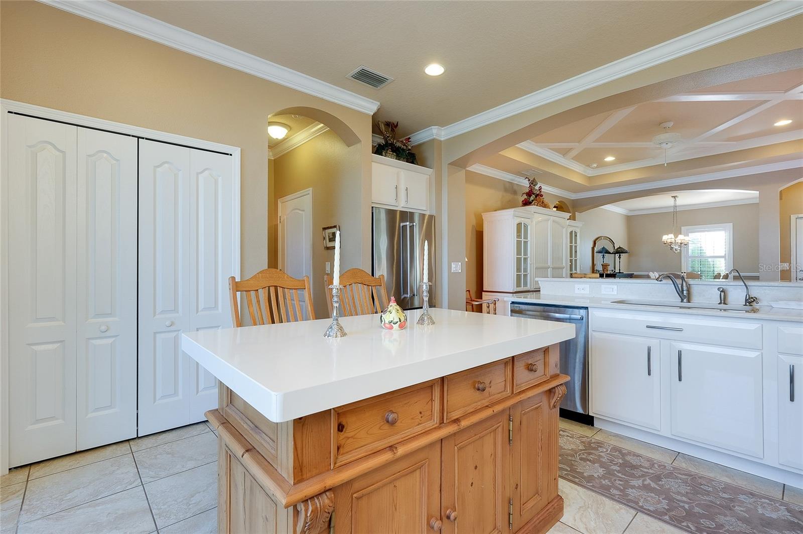 Welcome to the Milano Community, a beautiful, gated neighborhood featuring 456 homes. The amenities include pickleball courts, bocce ball, and a community center with a large pool and spa. The dog park offers shaded areas for owners to relax while watching their dogs play, keeping everyone out of the sun and rain. This tastefully furnished and immaculate 3-bedroom, 2-bathroom Liberty Model home has been beautifully upgraded with plantation shutters, hurricane windows, and crown molding throughout. The spacious living room features trey ceilings with exquisite woodwork. The dining room is also large and can be utilized as an office if desired. The layout includes two bedrooms and a bathroom that flow from the living area, providing a split design for added privacy. The kitchen is equipped with all stainless steel appliances, including a KitchenAid gas stove and refrigerator, as well as a GE dishwasher and microwave. It features an island that comfortably seats two, along with ample drawer and cabinet space, making it an ideal prep area for gourmet cooking. The primary bedroom is expansive and conveniently located off the kitchen, complete with a generous walk-in closet. The primary bathroom boasts a spacious walk-in shower, a double vanity, a linen closet, and a water closet. Built in 2017, this home encompasses 1,515 square feet and offers stunning views of the lake. The oversized screened lanai provides incredible lake views, and the additional pavered patio outside the lanai is perfect for sunbathing or setting up a grill.