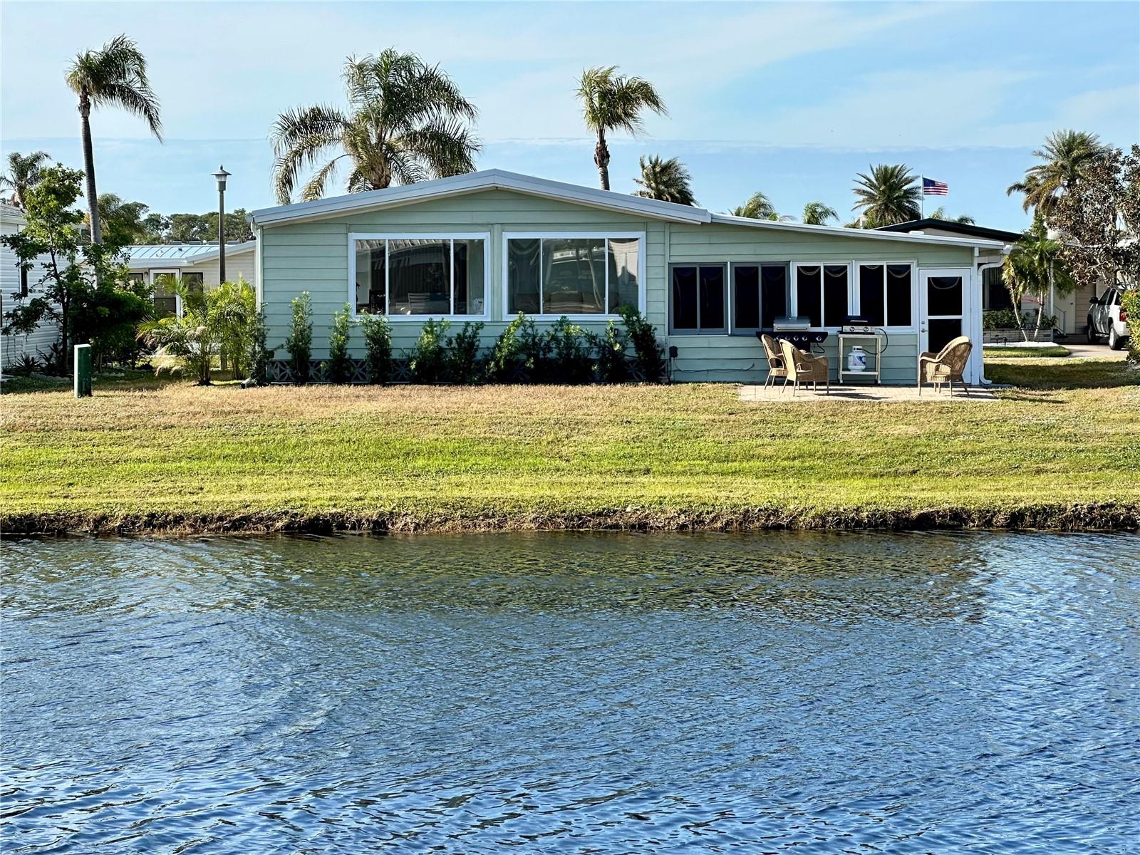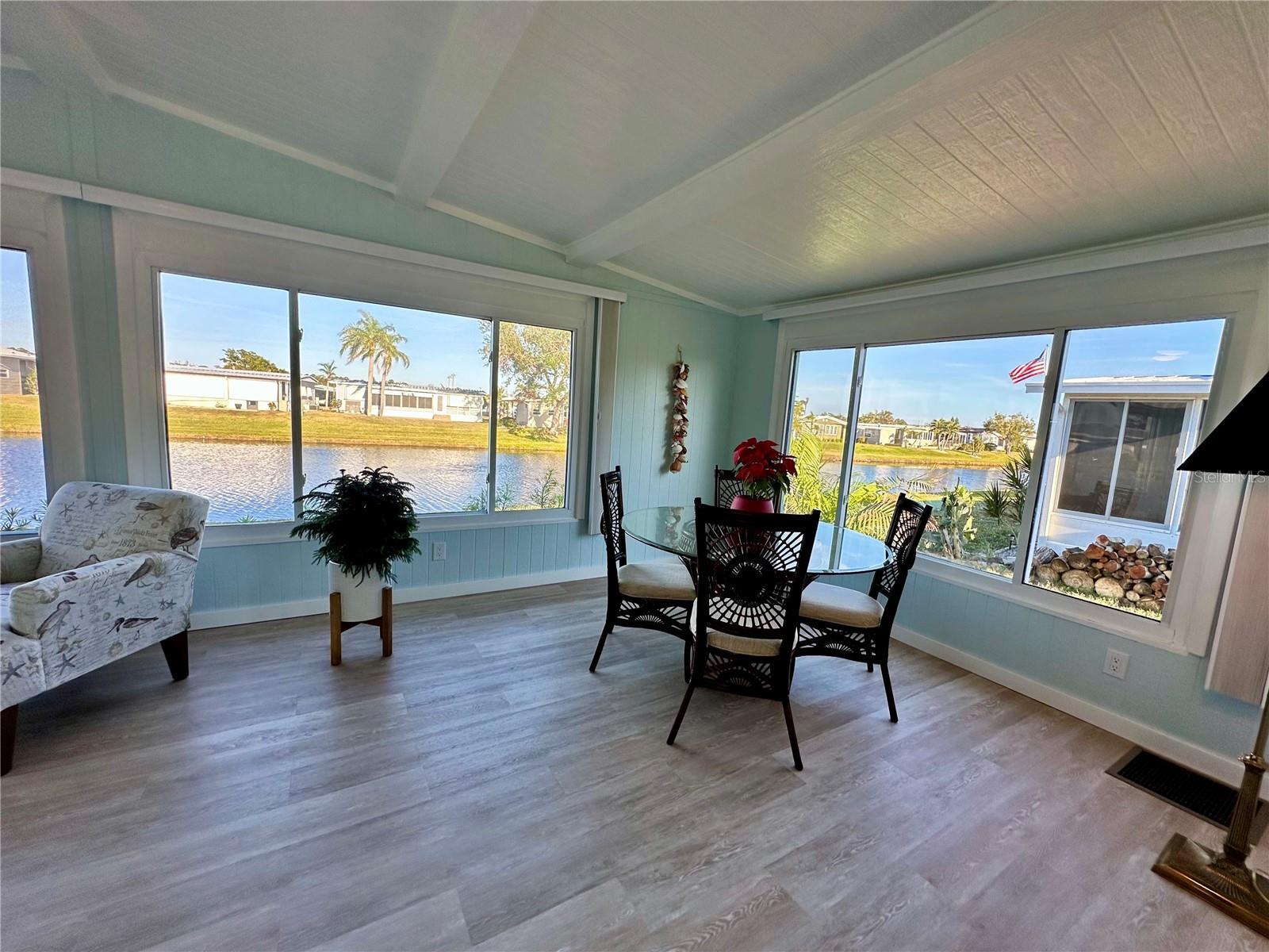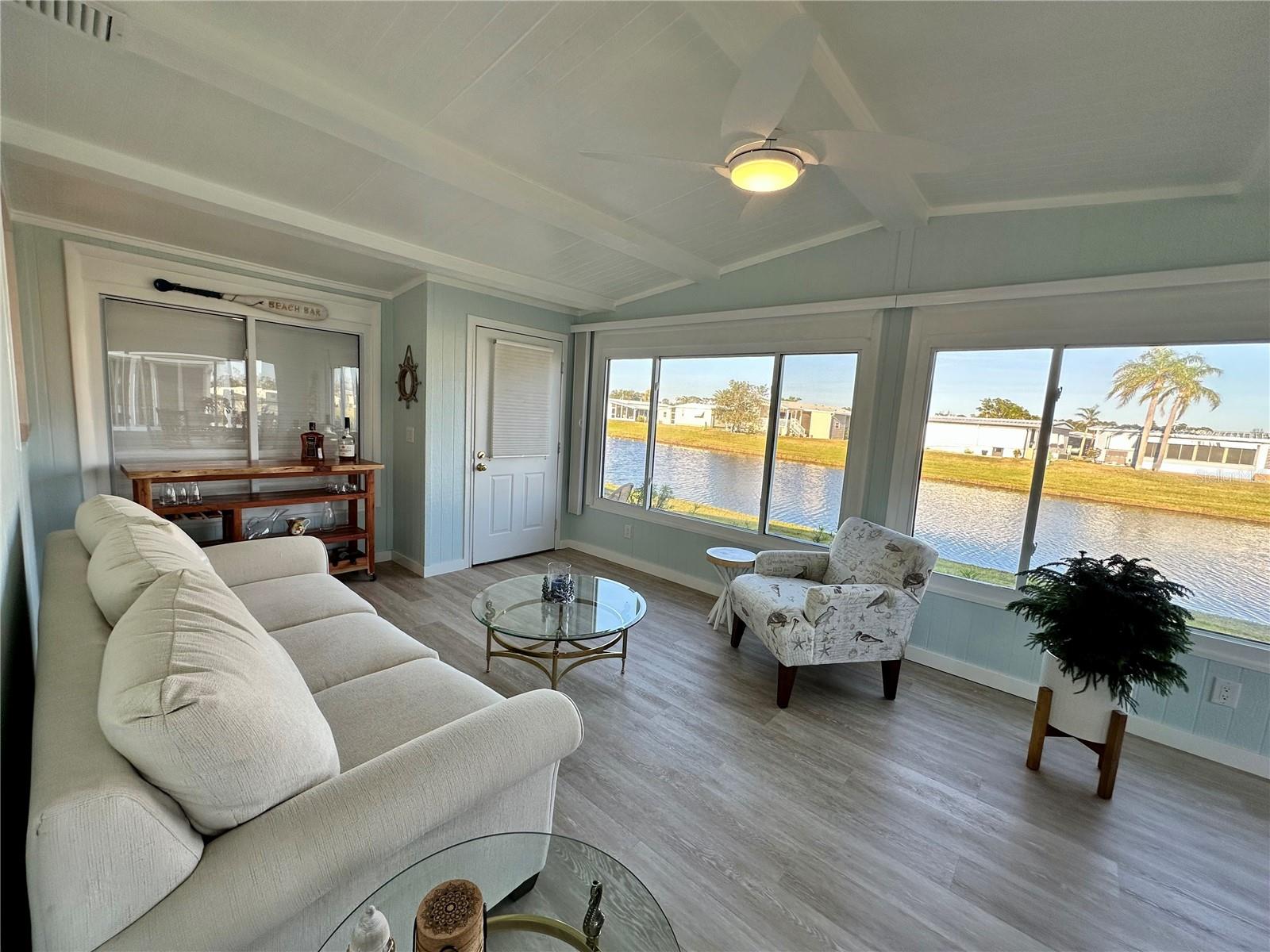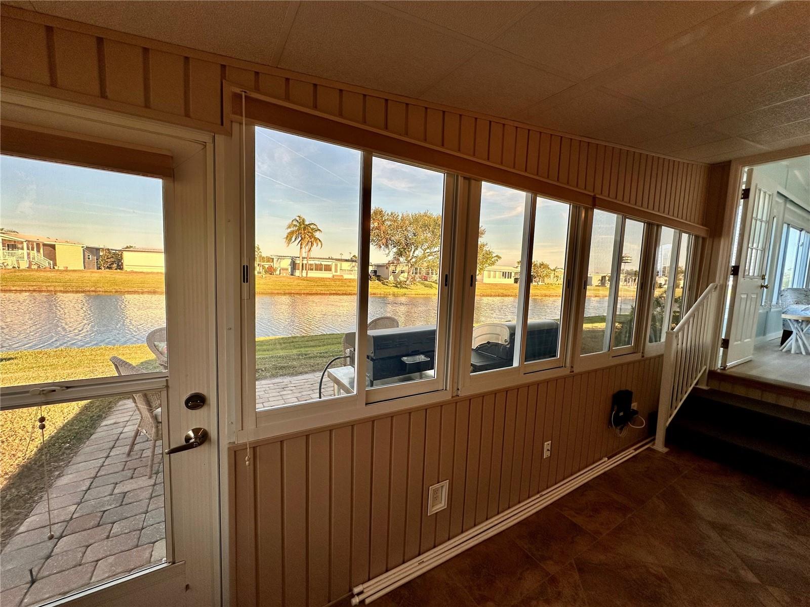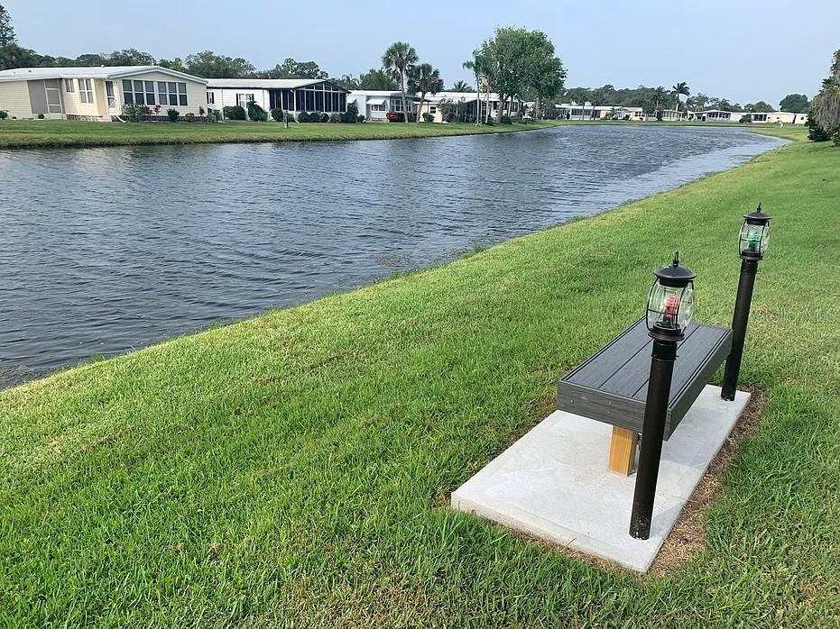 Outstanding remodeled home with many unique features on the lake for your consideration. Large kitchen with new appliances and separate dining table with striking shiplap accent wall and built-in cabinetry. The living room with a custom design accept wall and a massive entertainment area opens into a family room with an incredible view of the lake. Living with top-down bottom-up shades and family room with side sliding Hunter Douglas shades for that extra special touch. Walk down to the lower-level finished bonus room/office that is air conditioned and leads out to the back paver patio with outside seating as you enjoy living on the water and BBQ for grilling. The guest bedroom has one-of-a-kind custom built-in bunk room for visiting family with kids in addition to a walk-in closet. The primary bedroom with a rich wooden 4 pillar king bed with double closet and the ensuite bathroom has a large, tiled shower. New cathedral ceilings, sheetrock walls, luxury vinyl plank flooring, rebuilt Permaguard windows throughout and new roof. The finished laundry facility with utility sink is off the front tiled lanai. The carport will be repaired, parts on order. Start living like a royals in your very own castle right here at King’s Gate Club.