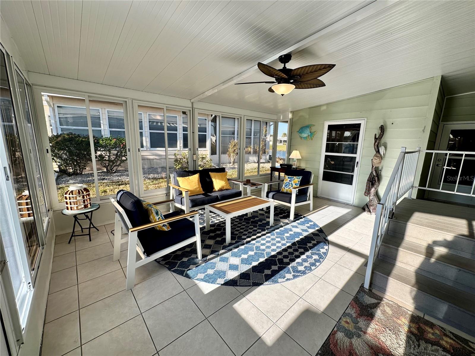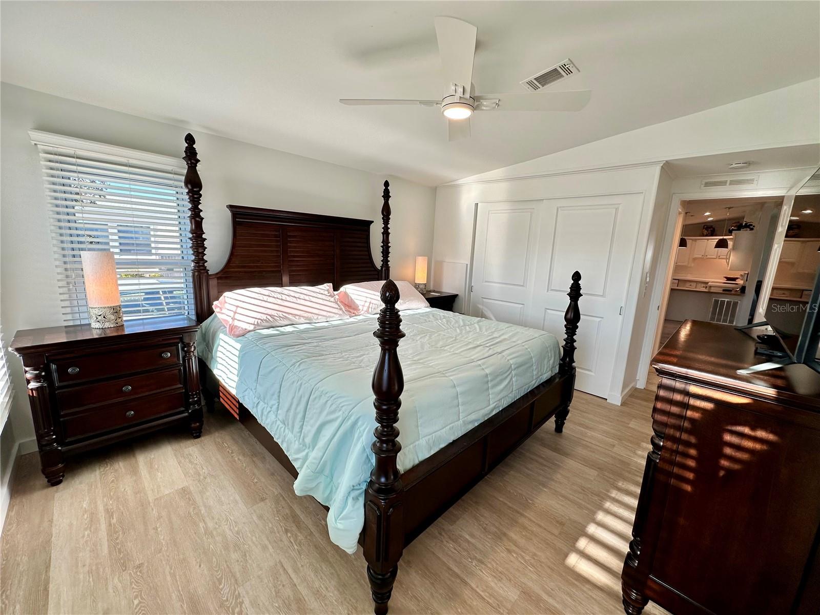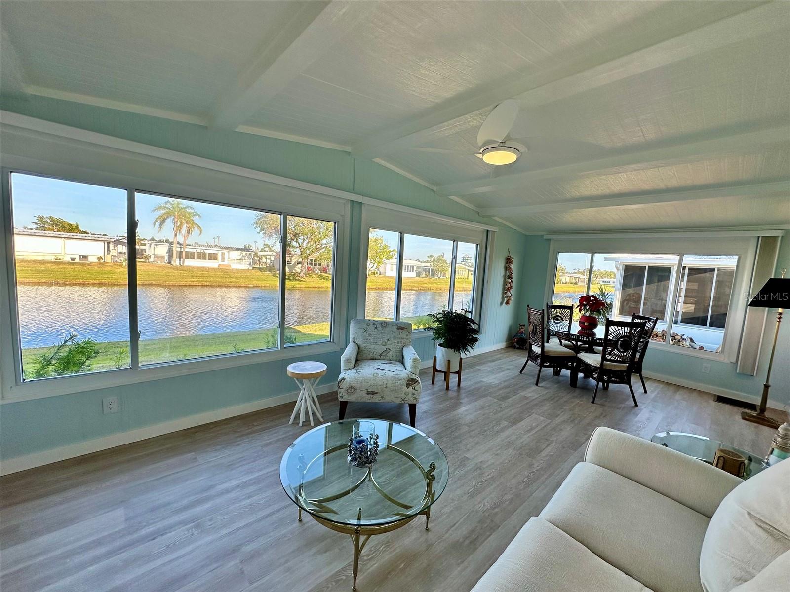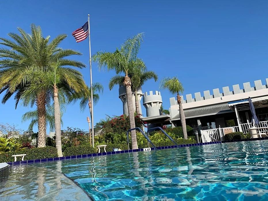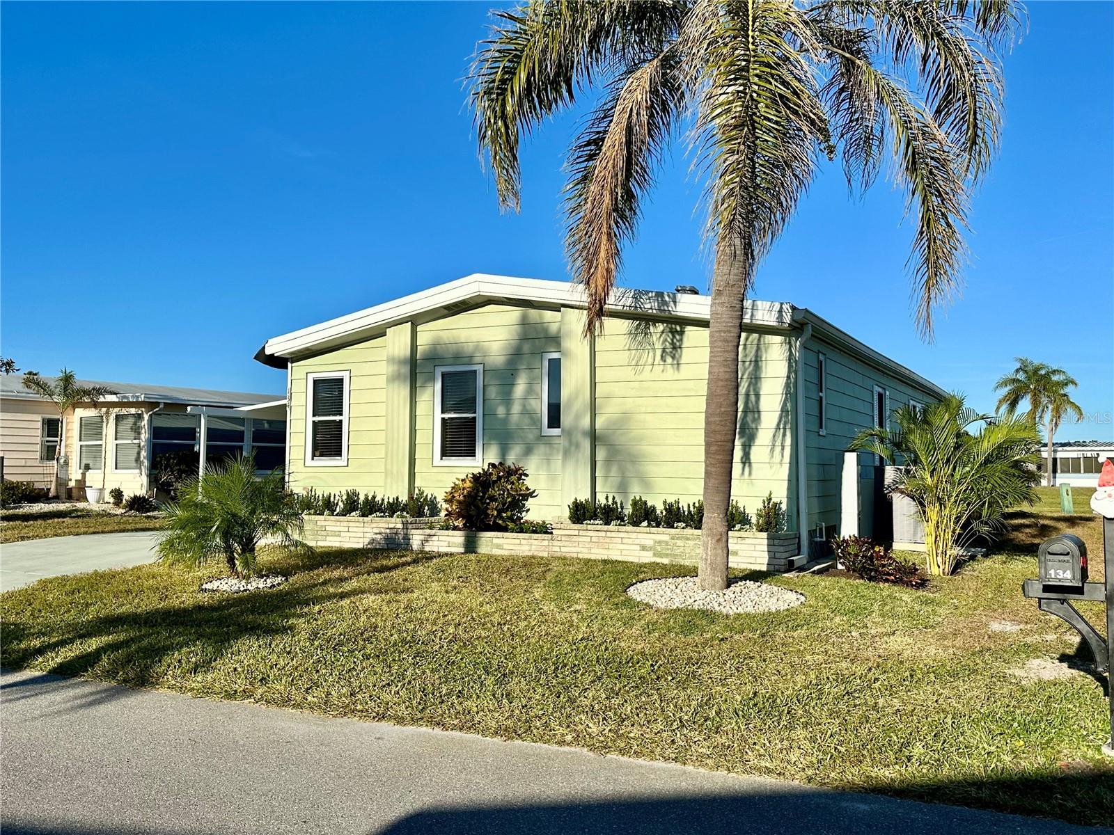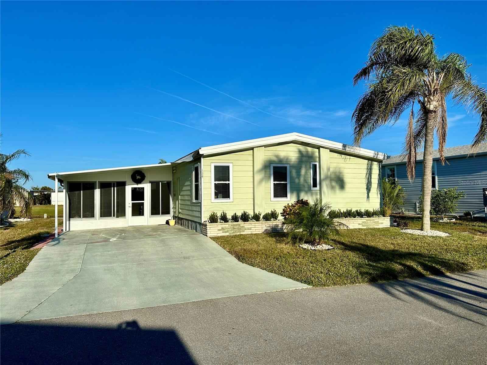 Outstanding remodeled home with many unique features on the lake for your consideration. Large kitchen with new appliances and separate dining table with striking shiplap accent wall and built-in cabinetry. The living room with a custom design accept wall and a massive entertainment area opens into a family room with an incredible view of the lake. Living with top-down bottom-up shades and family room with side sliding Hunter Douglas shades for that extra special touch. Walk down to the lower-level finished bonus room/office that is air conditioned and leads out to the back paver patio with outside seating as you enjoy living on the water and BBQ for grilling. The guest bedroom has one-of-a-kind custom built-in bunk room for visiting family with kids in addition to a walk-in closet. The primary bedroom with a rich wooden 4 pillar king bed with double closet and the ensuite bathroom has a large, tiled shower. New cathedral ceilings, sheetrock walls, luxury vinyl plank flooring, rebuilt Permaguard windows throughout and new roof. The finished laundry facility with utility sink is off the front tiled lanai. The carport will be repaired, parts on order. Start living like a royals in your very own castle right here at King’s Gate Club.
