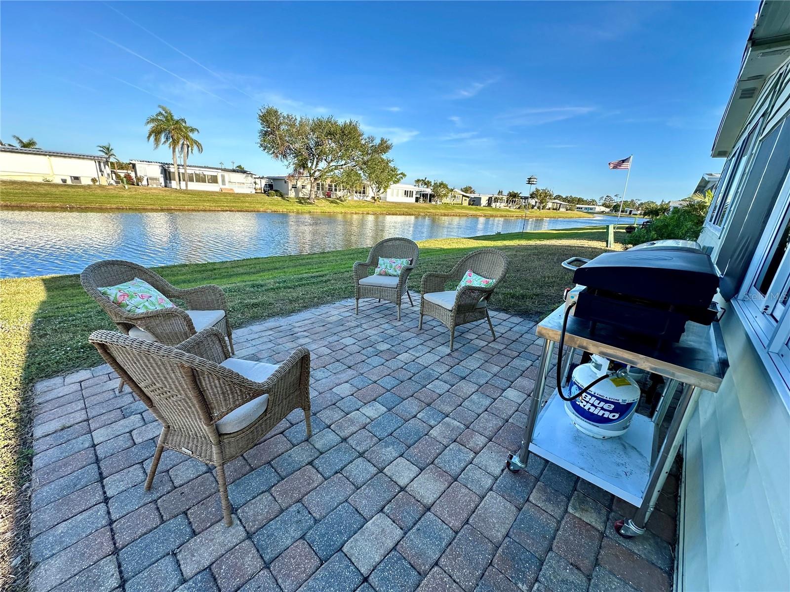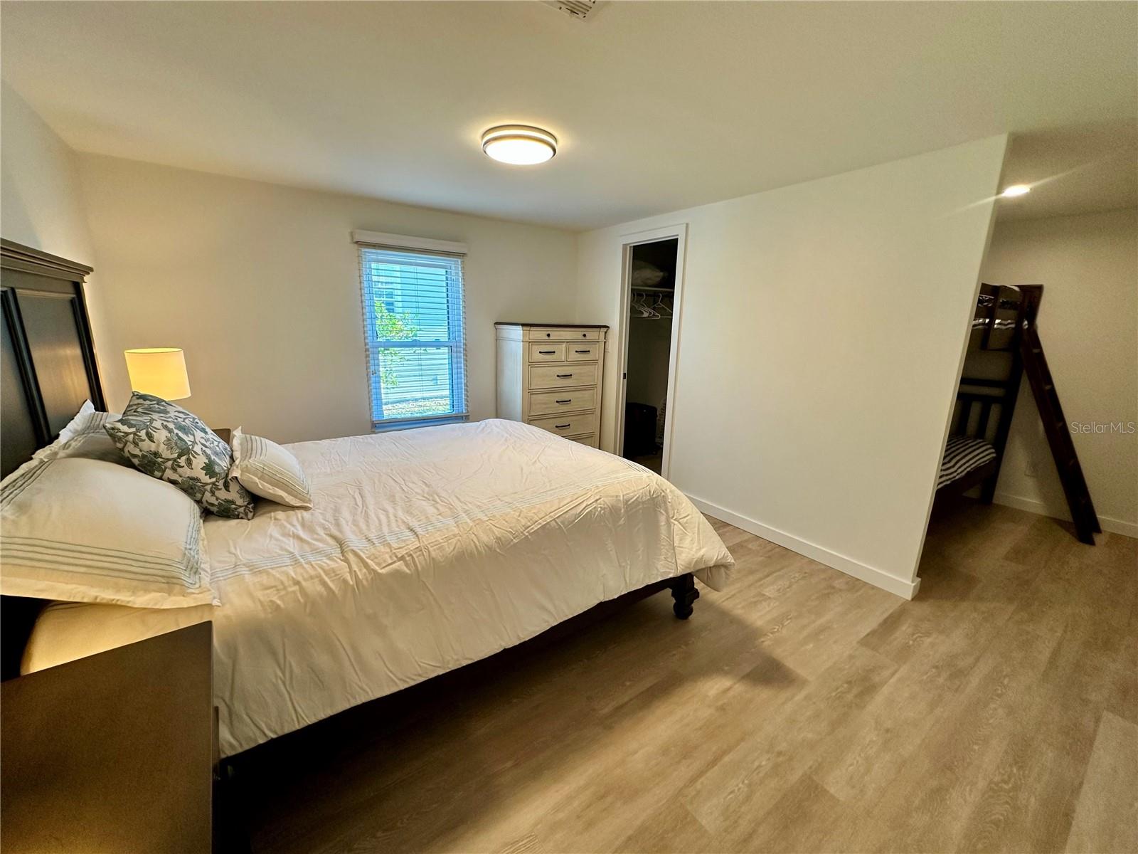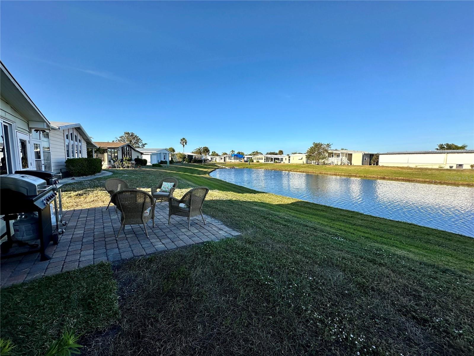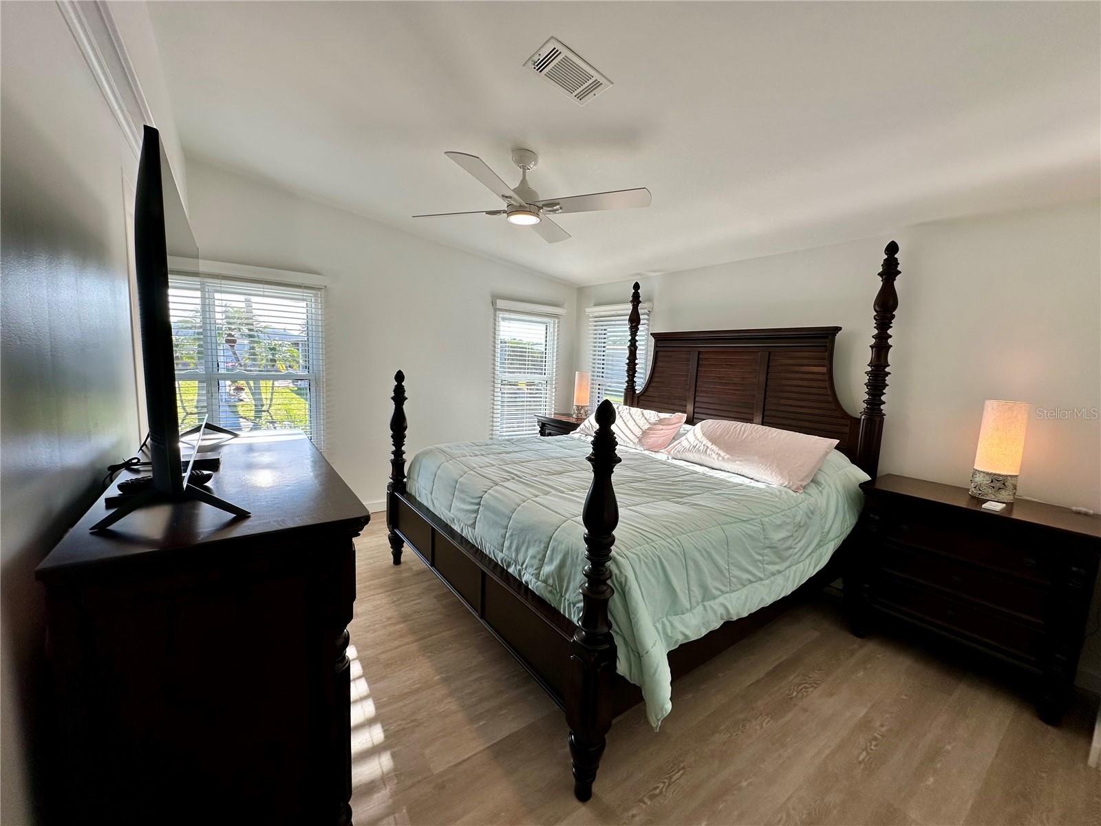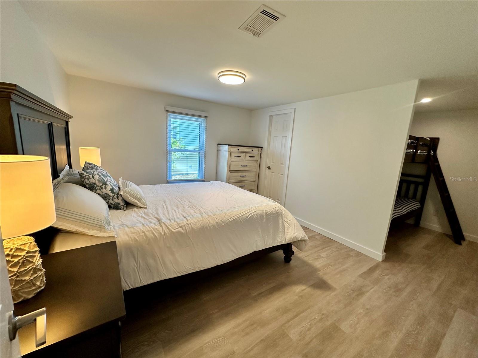 Outstanding remodeled home with many unique features on the lake for your consideration. Large kitchen with new appliances and separate dining table with striking shiplap accent wall and built-in cabinetry. The living room with a custom design accept wall and a massive entertainment area opens into a family room with an incredible view of the lake. Living with top-down bottom-up shades and family room with side sliding Hunter Douglas shades for that extra special touch. Walk down to the lower-level finished bonus room/office that is air conditioned and leads out to the back paver patio with outside seating as you enjoy living on the water and BBQ for grilling. The guest bedroom has one-of-a-kind custom built-in bunk room for visiting family with kids in addition to a walk-in closet. The primary bedroom with a rich wooden 4 pillar king bed with double closet and the ensuite bathroom has a large, tiled shower. New cathedral ceilings, sheetrock walls, luxury vinyl plank flooring, rebuilt Permaguard windows throughout and new roof. The finished laundry facility with utility sink is off the front tiled lanai. The carport will be repaired, parts on order. Start living like a royals in your very own castle right here at King’s Gate Club.