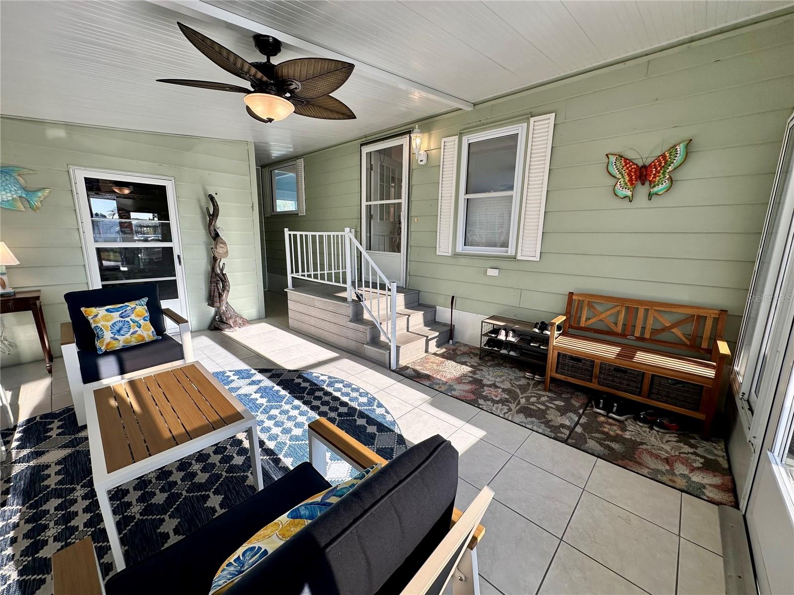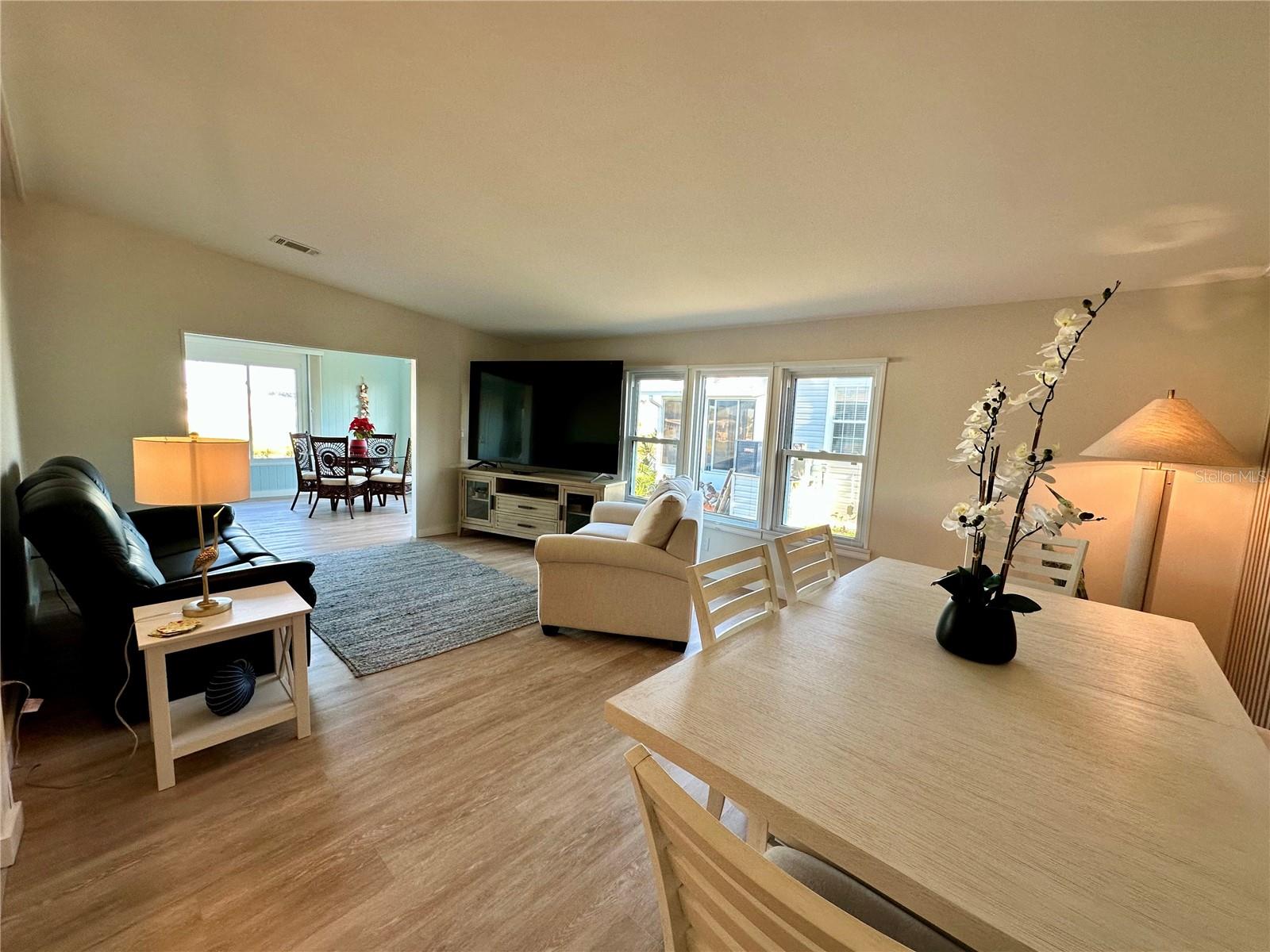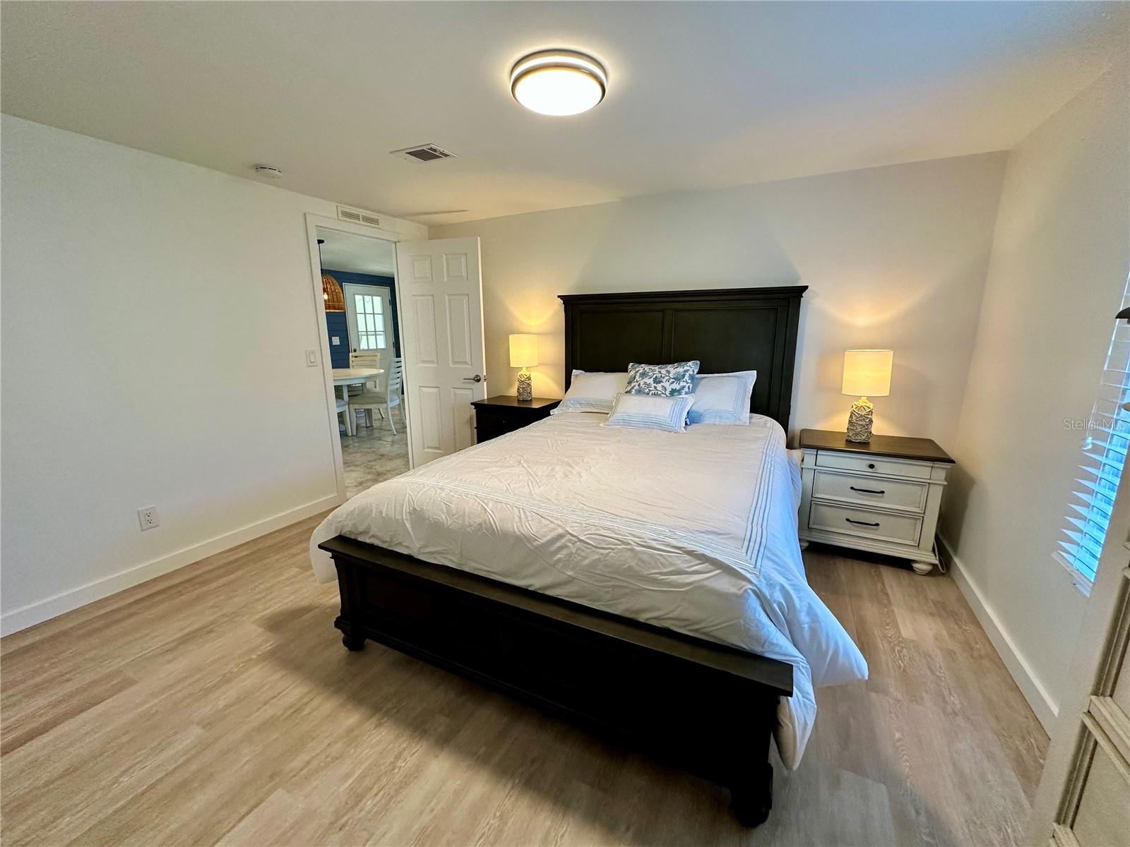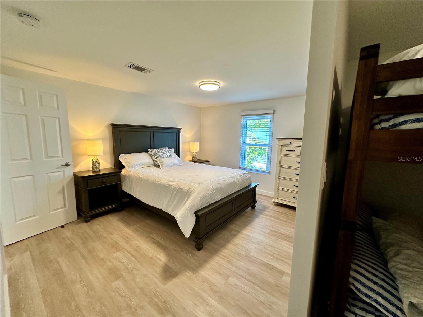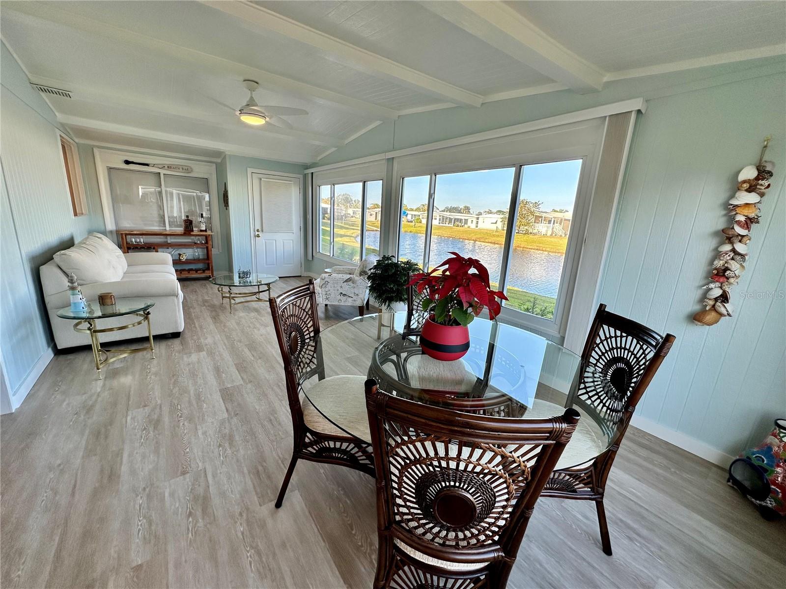 Outstanding remodeled home with many unique features on the lake for your consideration. Large kitchen with new appliances and separate dining table with striking shiplap accent wall and built-in cabinetry. The living room with a custom design accept wall and a massive entertainment area opens into a family room with an incredible view of the lake. Living with top-down bottom-up shades and family room with side sliding Hunter Douglas shades for that extra special touch. Walk down to the lower-level finished bonus room/office that is air conditioned and leads out to the back paver patio with outside seating as you enjoy living on the water and BBQ for grilling. The guest bedroom has one-of-a-kind custom built-in bunk room for visiting family with kids in addition to a walk-in closet. The primary bedroom with a rich wooden 4 pillar king bed with double closet and the ensuite bathroom has a large, tiled shower. New cathedral ceilings, sheetrock walls, luxury vinyl plank flooring, rebuilt Permaguard windows throughout and new roof. The finished laundry facility with utility sink is off the front tiled lanai. The carport will be repaired, parts on order. Start living like a royals in your very own castle right here at King’s Gate Club.