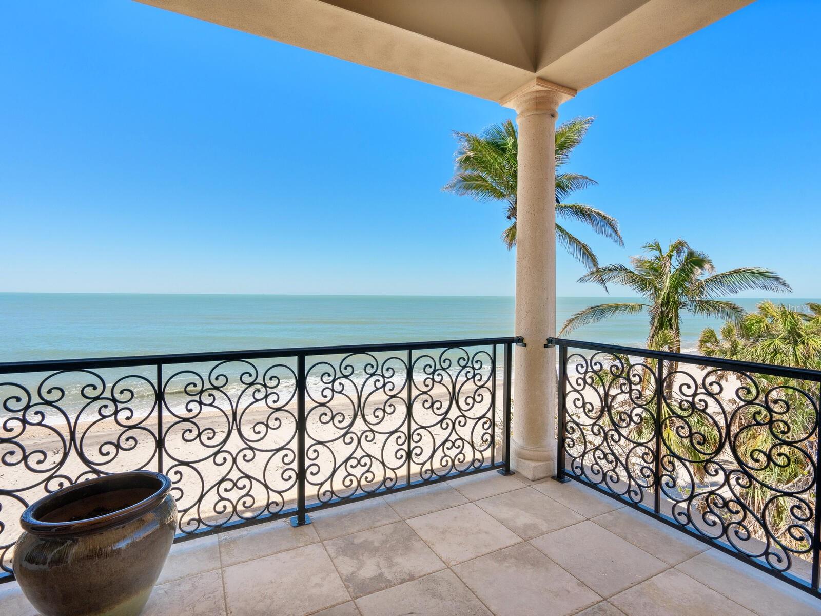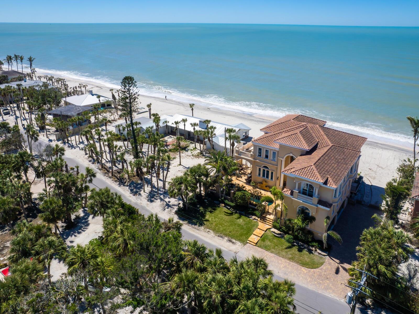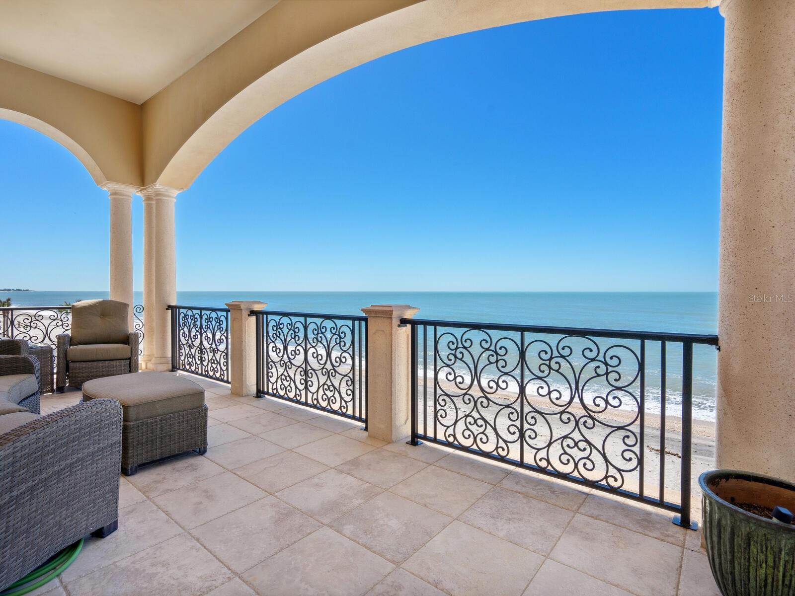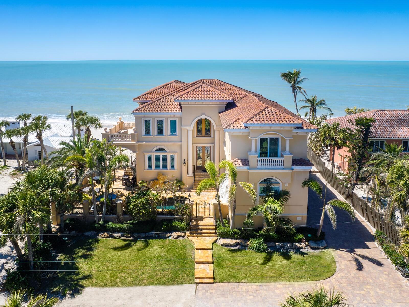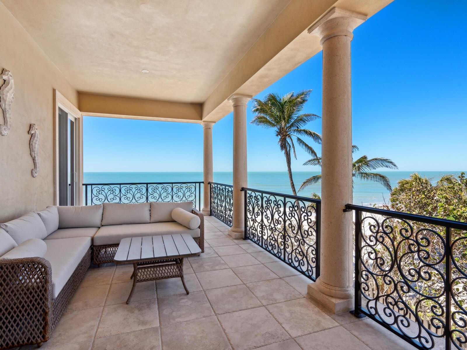 Magical sunsets illuminate the sky at this unparalleled custom-built estate on the exclusive barrier island of Casey Key, where luxury, elegance, and breathtaking Gulf views come together in harmony. This exquisite Gulf-front residence, featuring 100 feet of pristine natural sand beach, offers the epitome of coastal living. From the moment you pass through the courtyard gates, you're greeted by the tranquil sounds of the Gulf, with immediate access to serene beach views. As you enter the home, custom wood and glass hurricane entry doors lead you into the grand great room, framed by a wall of glass that showcases expansive views of the Gulf. The open-concept floor plan seamlessly connects the living areas to the chef-inspired kitchen, creating the ideal space for both intimate family gatherings and large-scale entertaining. The gourmet kitchen is a culinary masterpiece, featuring top-of-the-line Sub-Zero appliances, a Wolf cooktop with a custom copper hood, and a copper farmhouse sink, beautifully coordinated with other copper accents throughout the space. Premium appliances include a Wolf convection oven, Miele dishwasher, Fisher & Paykel dishwasher drawers, and a large walk-in pantry. Double islands in Palamino-patterned granite provide ample space for meal prep, while the wraparound bar with a vegetable sink enhances functionality and elegance. From the kitchen, dining area and great room, you can enjoy spectacular Gulf views that seamlessly flow onto a covered and open balcony porch, spanning the length of the home. The main level also features a beautifully appointed office/library and a full bath for added convenience. Upstairs, the primary suite serves as a Gulf-front sanctuary, offering sweeping views of the beach. The luxurious ensuite bath is a spa experience, complete with a whirlpool tub, multi-head shower, bidet and makeup vanity. The spacious primary closet is designed with built-ins, an island and a rotating closet carousel, offering the utmost in organization and luxury. In addition to the primary suite, the home includes three ensuite bedrooms, as well as a separate guest suite, providing private living space. Expansive balconies throughout the home provide privacy and style. The south-facing open balcony deck invites you to soak in the sun, while the north-facing covered balcony offers a serene retreat to relax with the soothing sound of the surf. Designed by the acclaimed Sarasota architect George Merlin, this home includes a five-stage wheelchair-accessible elevator, ensuring effortless access to all levels. The property also features an oversized three-car garage with ample space for a golf cart, a work area with a sink, and plenty of additional storage. Casey Key is just minutes from a variety of upscale shopping, fine dining and vibrant cultural attractions, offering a balance of privacy and convenience. With easy access to the charming downtown Venice, known for its quaint boutiques, cafes and art galleries, as well as the cultural heart of Sarasota, renowned for its theaters, museums and world-class dining, you’ll never be far from everything you need. Additionally, with nearby airports, including Sarasota-Bradenton International and private jet service at Venice Municipal Airport, travel is effortless.