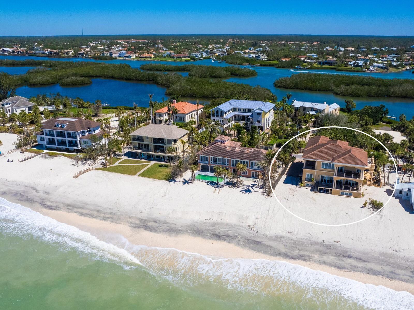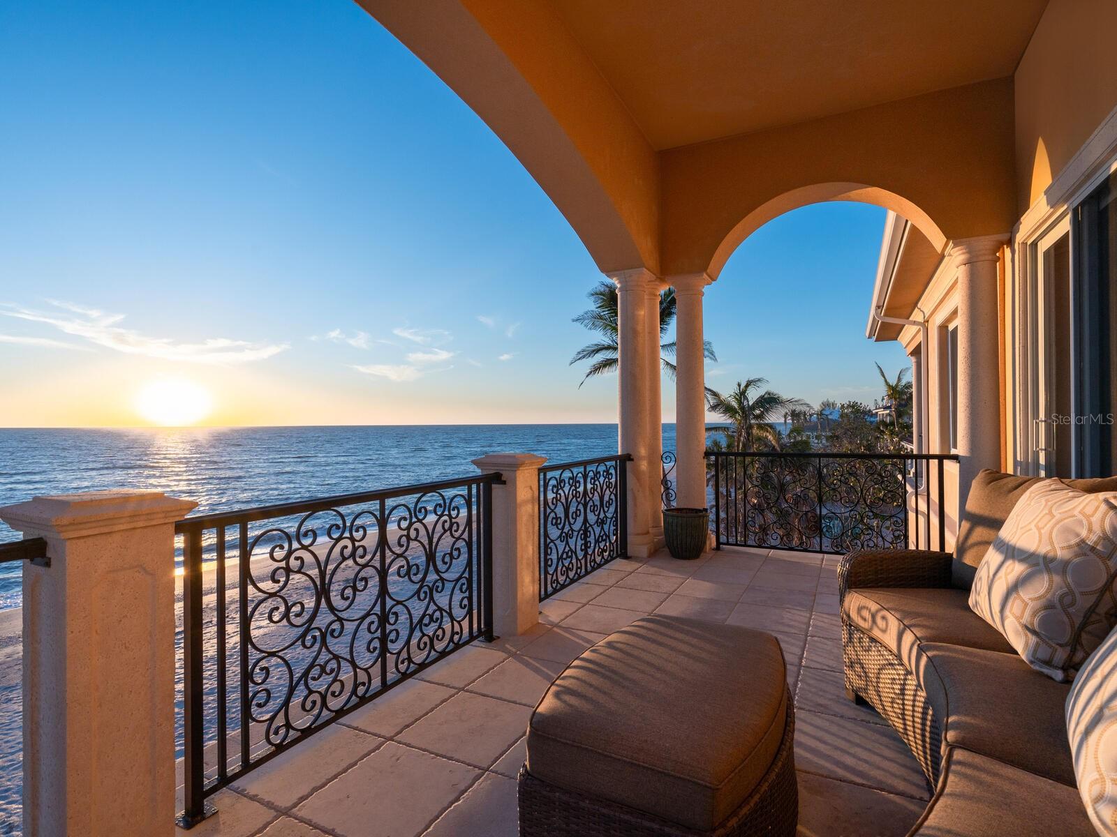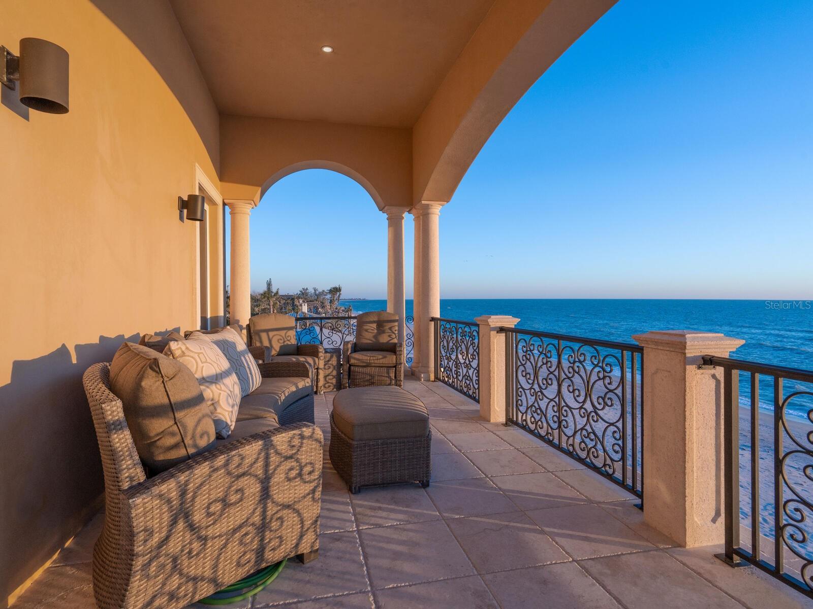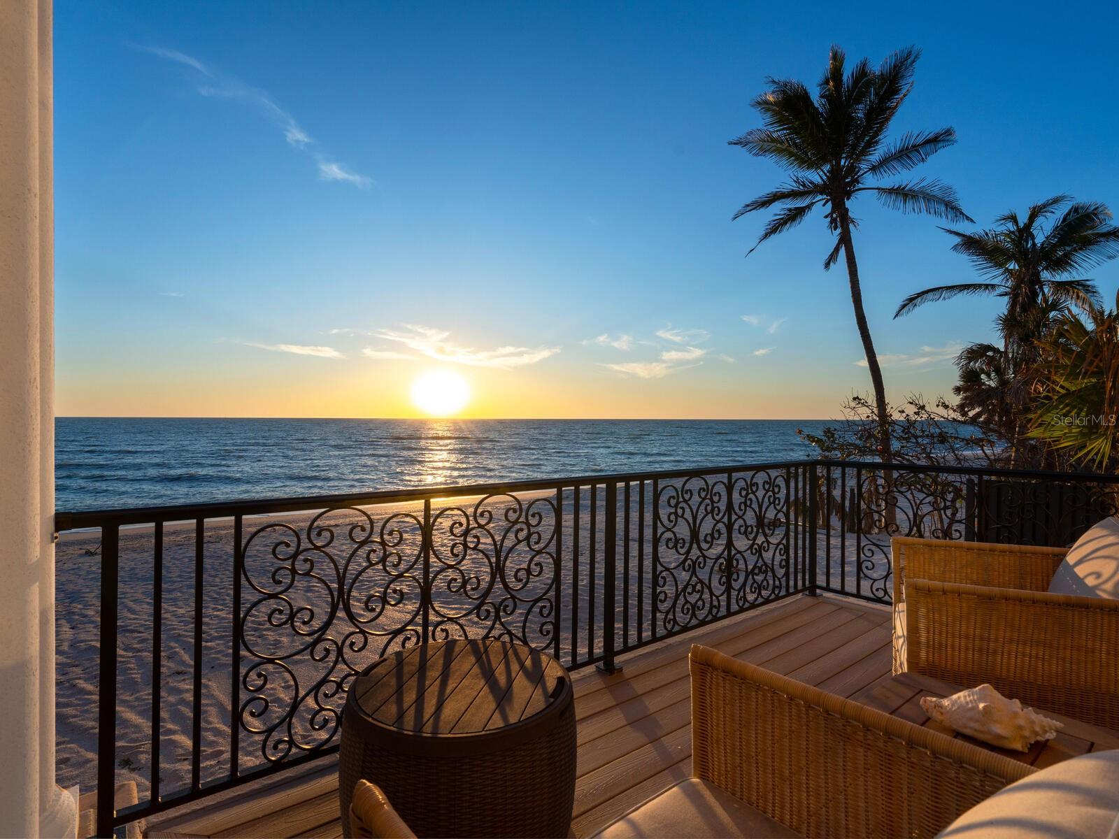 Magical sunsets illuminate the sky at this unparalleled custom-built estate on the exclusive barrier island of Casey Key, where luxury, elegance, and breathtaking Gulf views come together in harmony. This exquisite Gulf-front residence, featuring 100 feet of pristine natural sand beach, offers the epitome of coastal living. From the moment you pass through the courtyard gates, you're greeted by the tranquil sounds of the Gulf, with immediate access to serene beach views. As you enter the home, custom wood and glass hurricane entry doors lead you into the grand great room, framed by a wall of glass that showcases expansive views of the Gulf. The open-concept floor plan seamlessly connects the living areas to the chef-inspired kitchen, creating the ideal space for both intimate family gatherings and large-scale entertaining. The gourmet kitchen is a culinary masterpiece, featuring top-of-the-line Sub-Zero appliances, a Wolf cooktop with a custom copper hood, and a copper farmhouse sink, beautifully coordinated with other copper accents throughout the space. Premium appliances include a Wolf convection oven, Miele dishwasher, Fisher & Paykel dishwasher drawers, and a large walk-in pantry. Double islands in Palamino-patterned granite provide ample space for meal prep, while the wraparound bar with a vegetable sink enhances functionality and elegance. From the kitchen, dining area and great room, you can enjoy spectacular Gulf views that seamlessly flow onto a covered and open balcony porch, spanning the length of the home. The main level also features a beautifully appointed office/library and a full bath for added convenience. Upstairs, the primary suite serves as a Gulf-front sanctuary, offering sweeping views of the beach. The luxurious ensuite bath is a spa experience, complete with a whirlpool tub, multi-head shower, bidet and makeup vanity. The spacious primary closet is designed with built-ins, an island and a rotating closet carousel, offering the utmost in organization and luxury. In addition to the primary suite, the home includes three ensuite bedrooms, as well as a separate guest suite, providing private living space. Expansive balconies throughout the home provide privacy and style. The south-facing open balcony deck invites you to soak in the sun, while the north-facing covered balcony offers a serene retreat to relax with the soothing sound of the surf. Designed by the acclaimed Sarasota architect George Merlin, this home includes a five-stage wheelchair-accessible elevator, ensuring effortless access to all levels. The property also features an oversized three-car garage with ample space for a golf cart, a work area with a sink, and plenty of additional storage. Casey Key is just minutes from a variety of upscale shopping, fine dining and vibrant cultural attractions, offering a balance of privacy and convenience. With easy access to the charming downtown Venice, known for its quaint boutiques, cafes and art galleries, as well as the cultural heart of Sarasota, renowned for its theaters, museums and world-class dining, you’ll never be far from everything you need. Additionally, with nearby airports, including Sarasota-Bradenton International and private jet service at Venice Municipal Airport, travel is effortless.