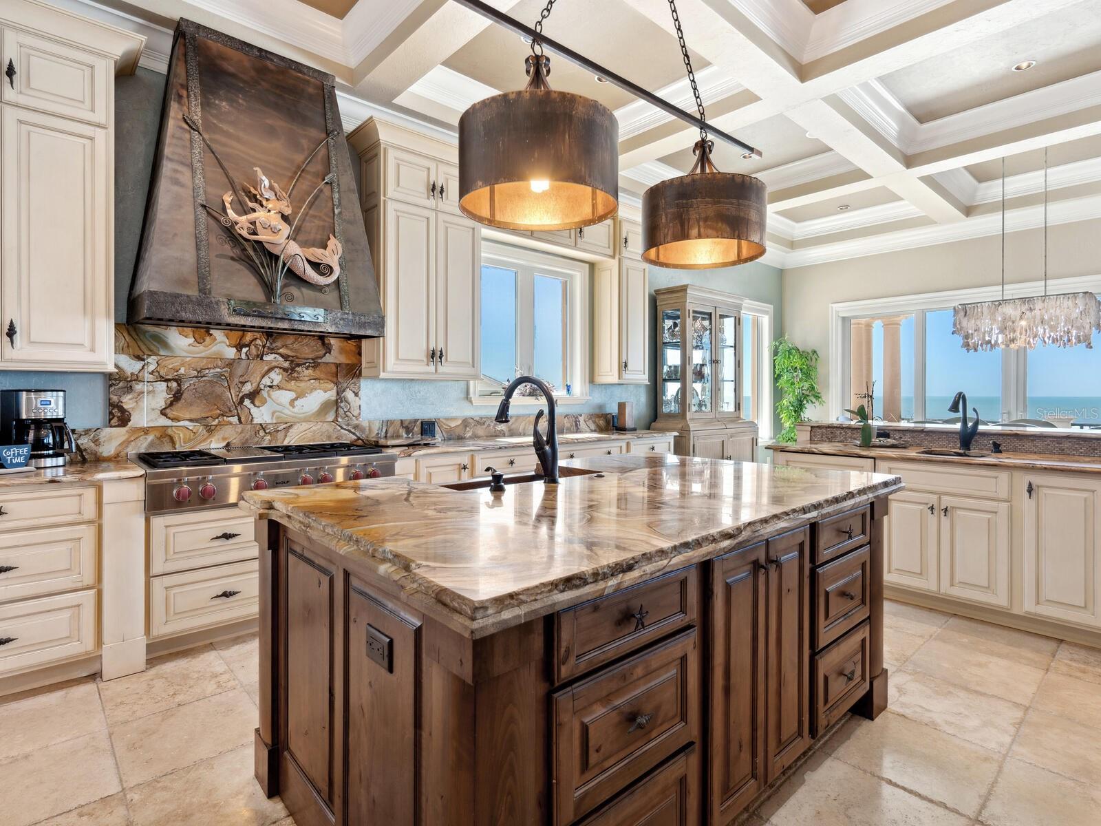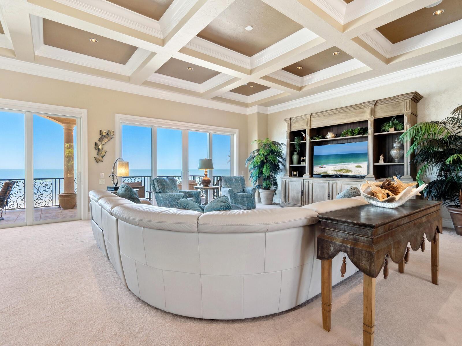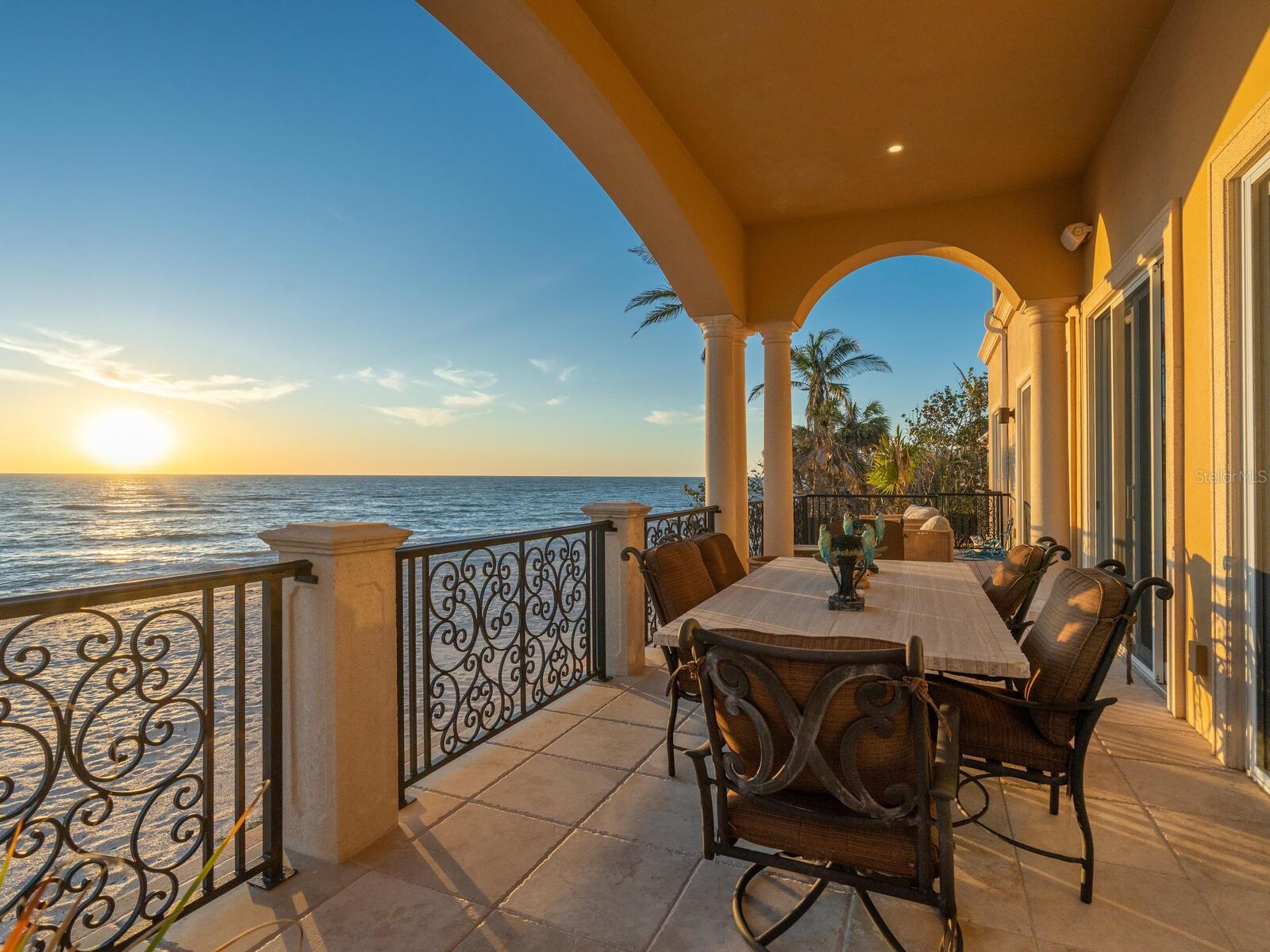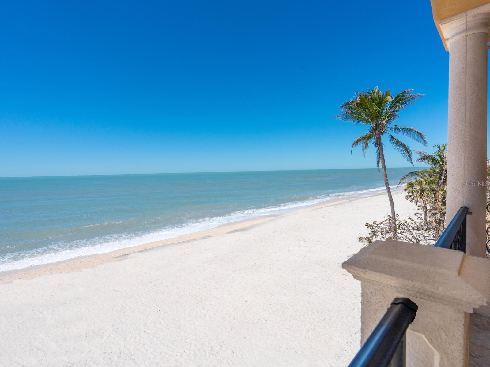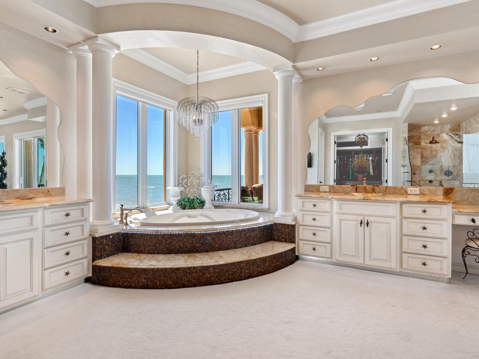Magical sunsets illuminate the sky at this unparalleled custom-built estate on the exclusive barrier island of Casey Key, where luxury, elegance, and breathtaking Gulf views come together in harmony. This exquisite Gulf-front residence, featuring 100 feet of pristine natural sand beach, offers the epitome of coastal living. From the moment you pass through the courtyard gates, you're greeted by the tranquil sounds of the Gulf, with immediate access to serene beach views. As you enter the home, custom wood and glass hurricane entry doors lead you into the grand great room, framed by a wall of glass that showcases expansive views of the Gulf. The open-concept floor plan seamlessly connects the living areas to the chef-inspired kitchen, creating the ideal space for both intimate family gatherings and large-scale entertaining. The gourmet kitchen is a culinary masterpiece, featuring top-of-the-line Sub-Zero appliances, a Wolf cooktop with a custom copper hood, and a copper farmhouse sink, beautifully coordinated with other copper accents throughout the space. Premium appliances include a Wolf convection oven, Miele dishwasher, Fisher & Paykel dishwasher drawers, and a large walk-in pantry. Double islands in Palamino-patterned granite provide ample space for meal prep, while the wraparound bar with a vegetable sink enhances functionality and elegance. From the kitchen, dining area and great room, you can enjoy spectacular Gulf views that seamlessly flow onto a covered and open balcony porch, spanning the length of the home. The main level also features a beautifully appointed office/library and a full bath for added convenience. Upstairs, the primary suite serves as a Gulf-front sanctuary, offering sweeping views of the beach. The luxurious ensuite bath is a spa experience, complete with a whirlpool tub, multi-head shower, bidet and makeup vanity. The spacious primary closet is designed with built-ins, an island and a rotating closet carousel, offering the utmost in organization and luxury. In addition to the primary suite, the home includes three ensuite bedrooms, as well as a separate guest suite, providing private living space. Expansive balconies throughout the home provide privacy and style. The south-facing open balcony deck invites you to soak in the sun, while the north-facing covered balcony offers a serene retreat to relax with the soothing sound of the surf. Designed by the acclaimed Sarasota architect George Merlin, this home includes a five-stage wheelchair-accessible elevator, ensuring effortless access to all levels. The property also features an oversized three-car garage with ample space for a golf cart, a work area with a sink, and plenty of additional storage. Casey Key is just minutes from a variety of upscale shopping, fine dining and vibrant cultural attractions, offering a balance of privacy and convenience. With easy access to the charming downtown Venice, known for its quaint boutiques, cafes and art galleries, as well as the cultural heart of Sarasota, renowned for its theaters, museums and world-class dining, you’ll never be far from everything you need. Additionally, with nearby airports, including Sarasota-Bradenton International and private jet service at Venice Municipal Airport, travel is effortless.