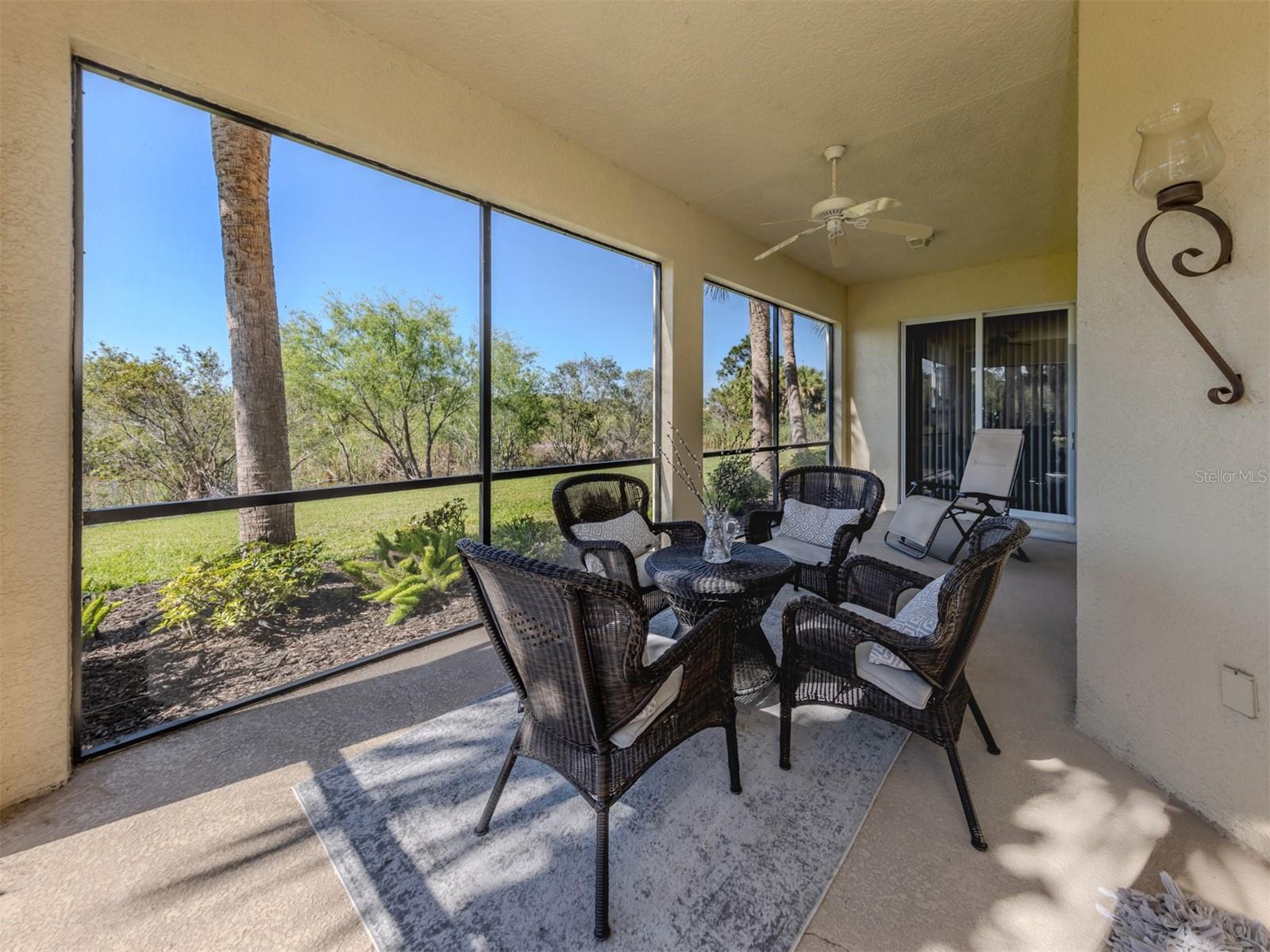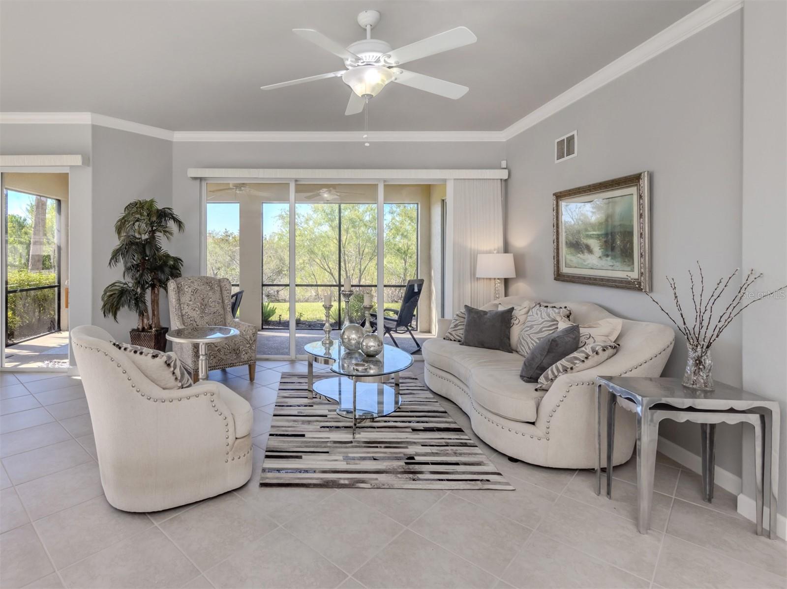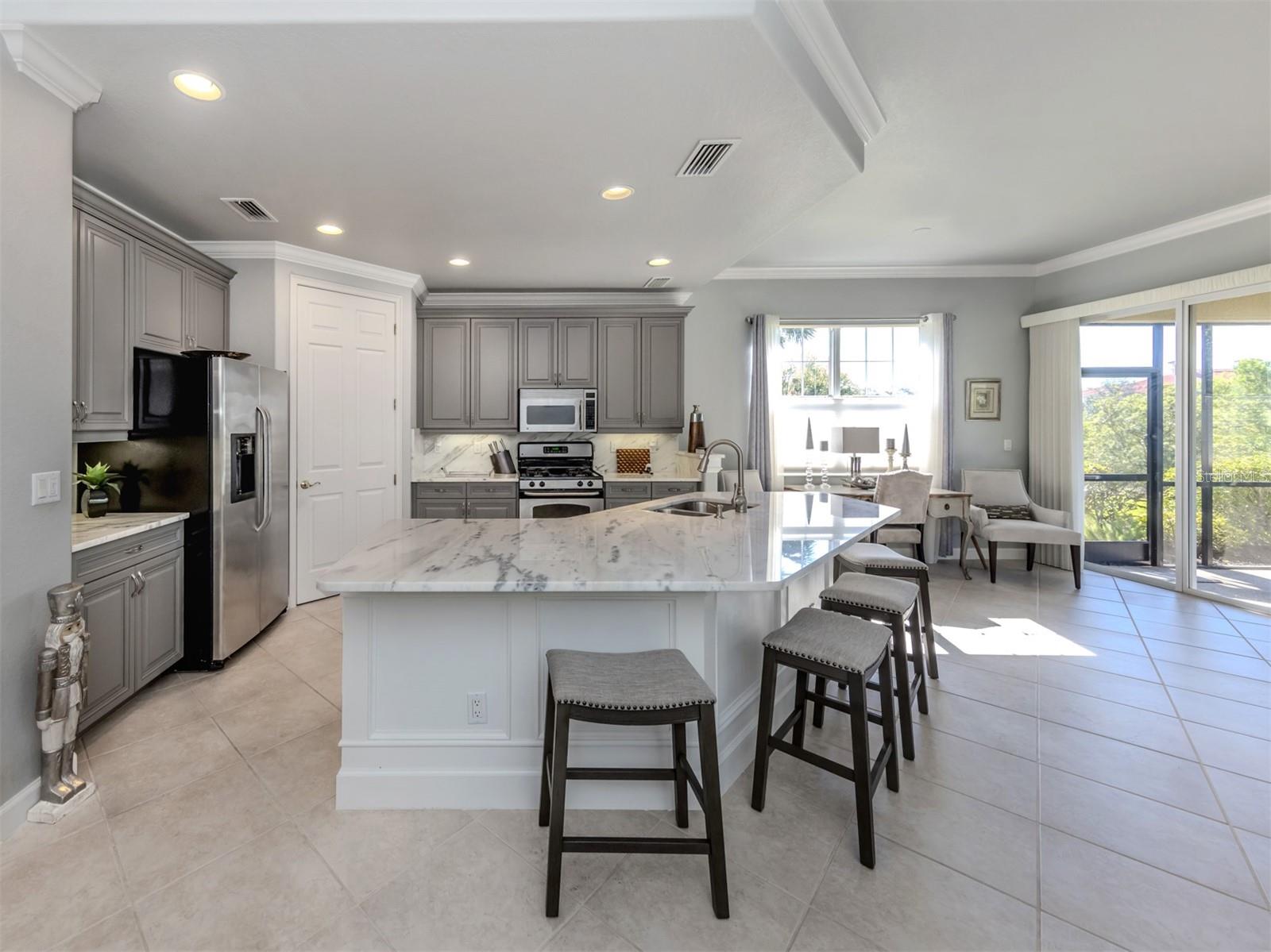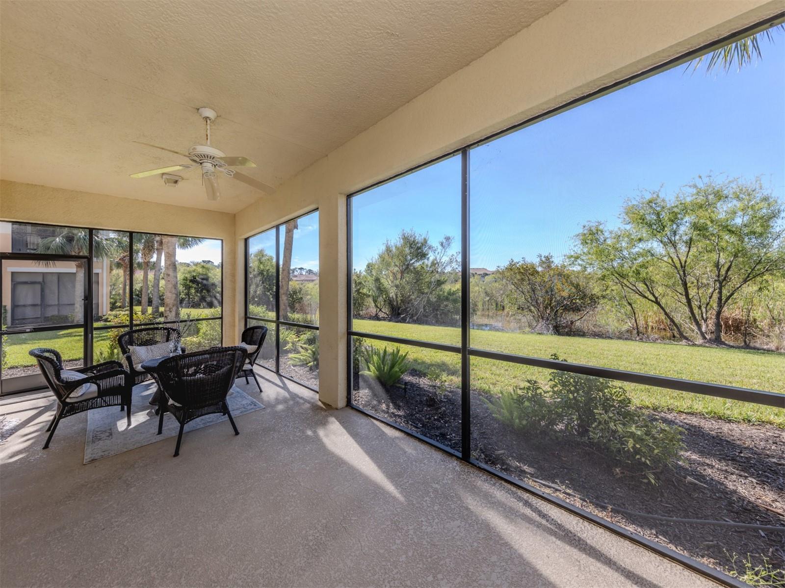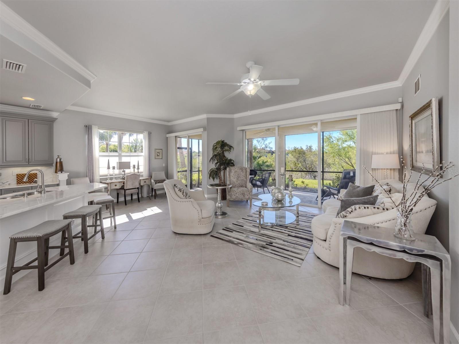 Puttin' on the Ritz! You can move right into this luxurious and elegant first-floor condominium today. This newly redone kitchen makes entertaining a breeze. The bright open great room includes multiple sliders to lanai, large living room area, dining room, sitting area and large kitchen with new granite stainless appliances, walk-in pantry and gas range. This split floor plan offers two bedrooms, one with a walk-in closet, hall bath, and laundry room leading to two-car attached garage. The primary is on the other side with sliders to lanai, en-suite bath with dual sinks, large walk-in shower and nearby walk-in closet and two linen closets. Enjoy sunsets from your private lanai with private marshy preserve views and all the visiting wildlife. Turnkey furnished. Just move in and enjoy your new resort living with private restaurant with wonderful chef, featuring special dinners, dances, events, hamburger night, fish fry Fridays, buffets, Sunday breakfast and recently added pizza oven. Yum! No waiting or traffic in season. Other offerings in this wonderful and popular neighborhood are six Har-Tru tennis courts, three pickleball courts, large resort pool with spa, tiki bar for drinks and food, and occasional entertainment and karaoke, lap pool, gym, aerobics room, many games groups and last but far from least, a ½-mile boardwalk through the jungle down to the Myakka River. All this and so conveniently near the highway, hospital, fire station, many beaches and beautiful downtown Venice. Enjoy today!